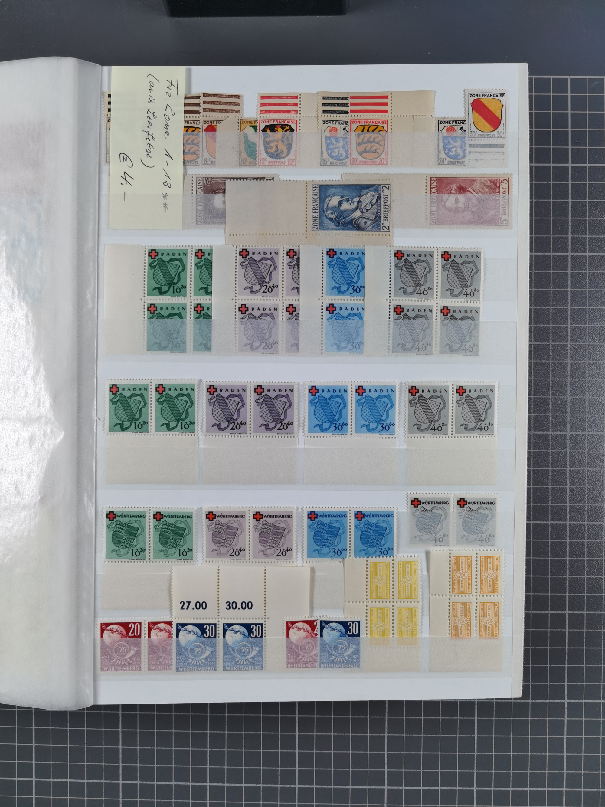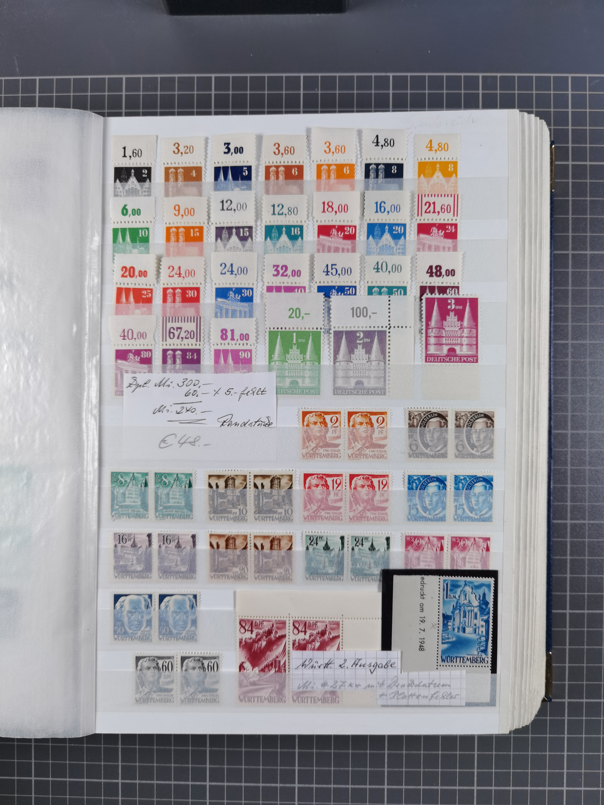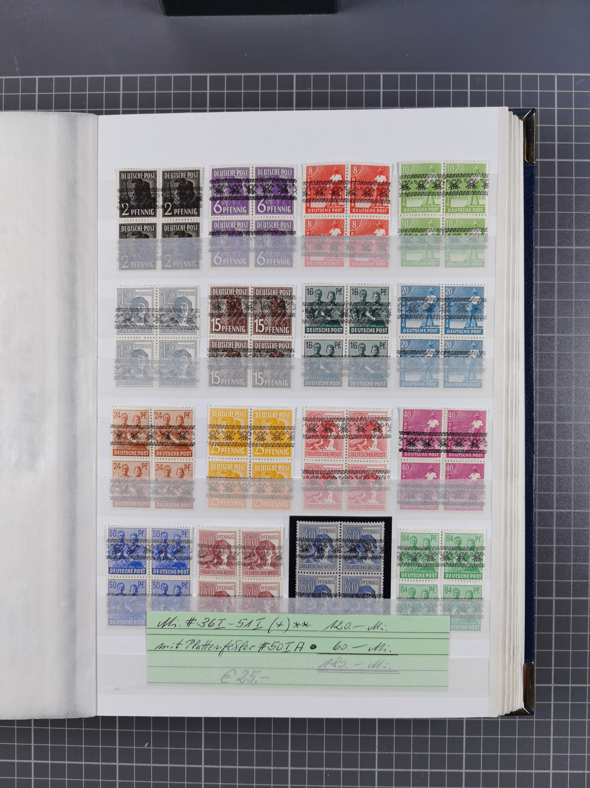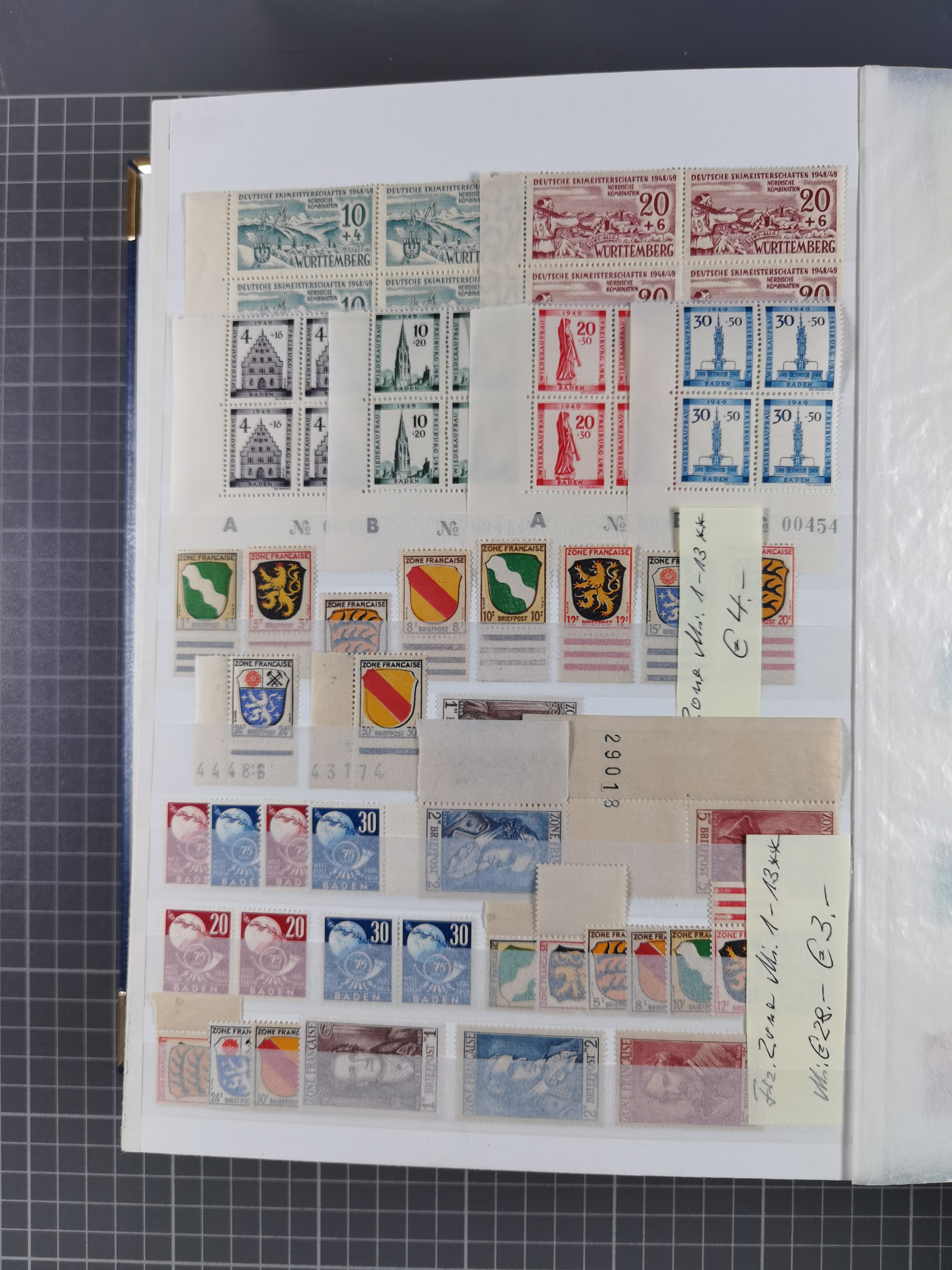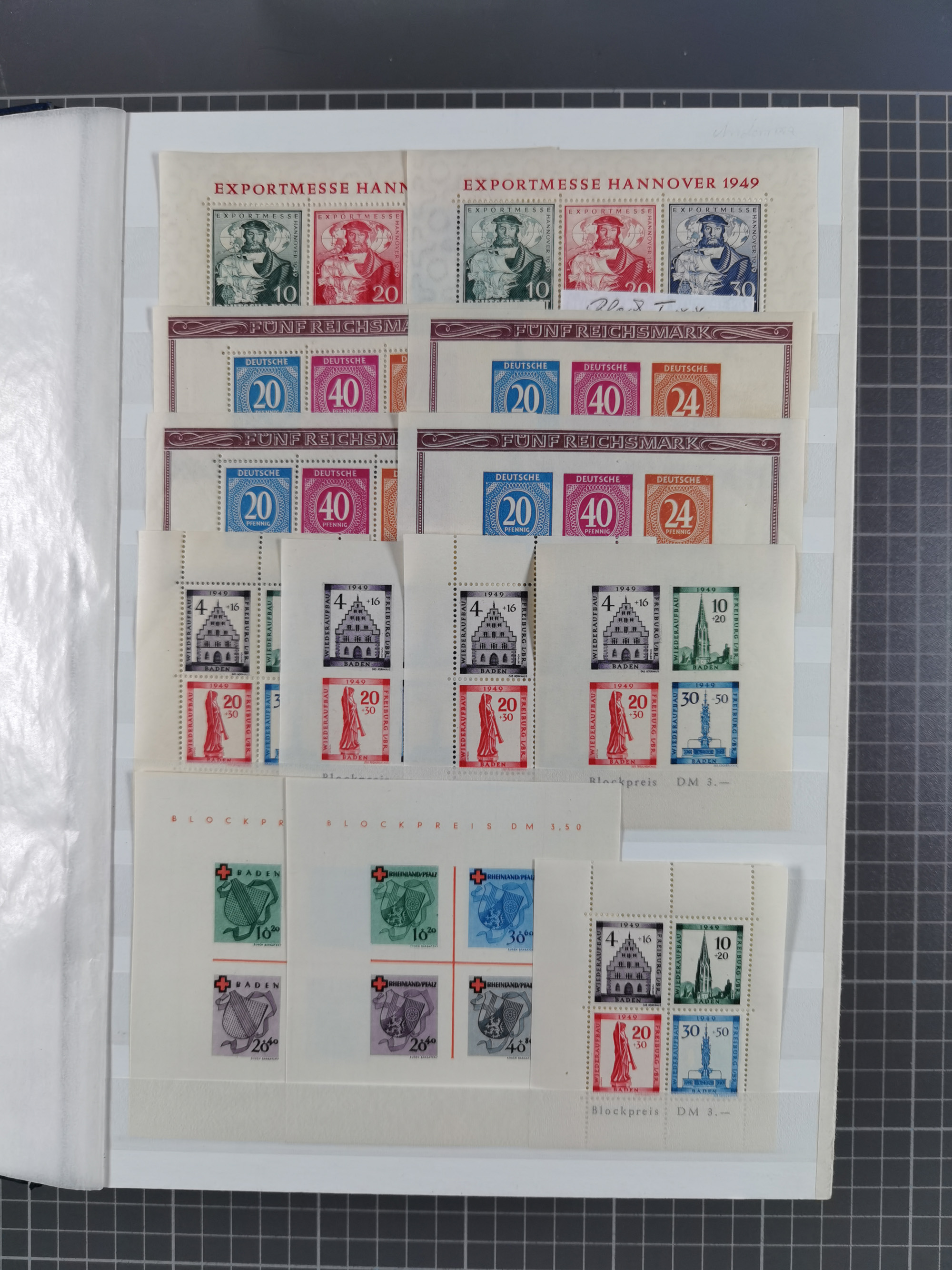 1940/2014(ca.), vorwiegend postfrische Sammlungen, dabei Französische Zone inkl. Mi.-Nr. 46II postfrisch, Bizone Mi.-Nr. 52-68I und 52-68II sowie I-IX/I, Bauten Mi.-Nr. 73-97eg, je postfrisch, Saarland ohne Bl. 1-2, SBZ mit einigen besseren wie Mi.-Nr. 41, Block 1, Block 4-6, DDR, etwas Berlin sowie Bund mit Nominale bis 2014, dazu Dubletten, einiges mit Fotoattest BPP