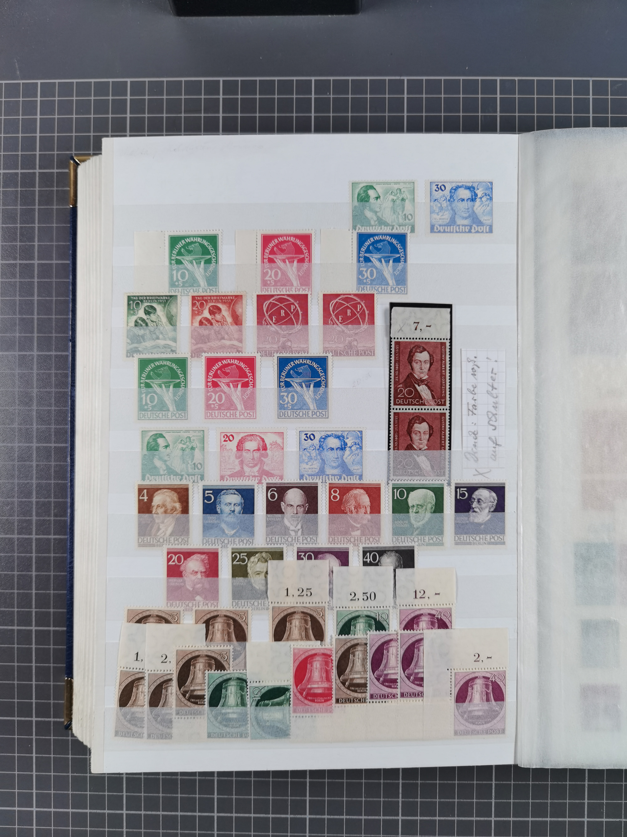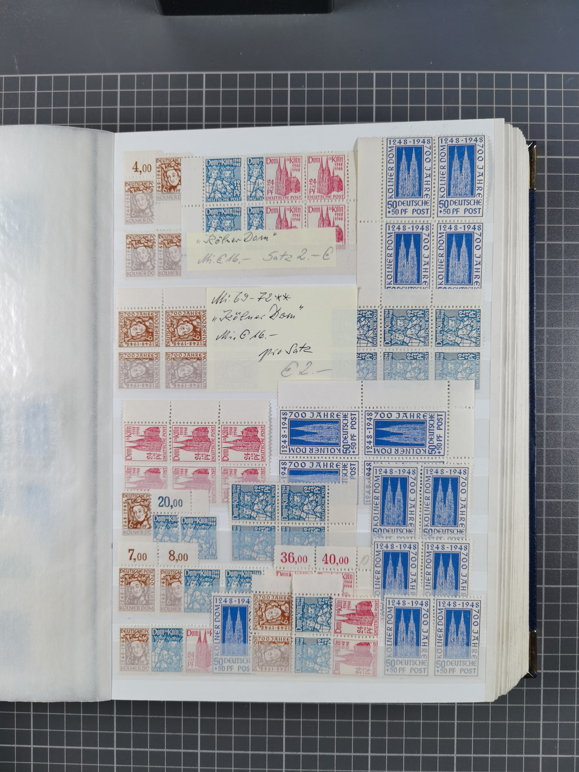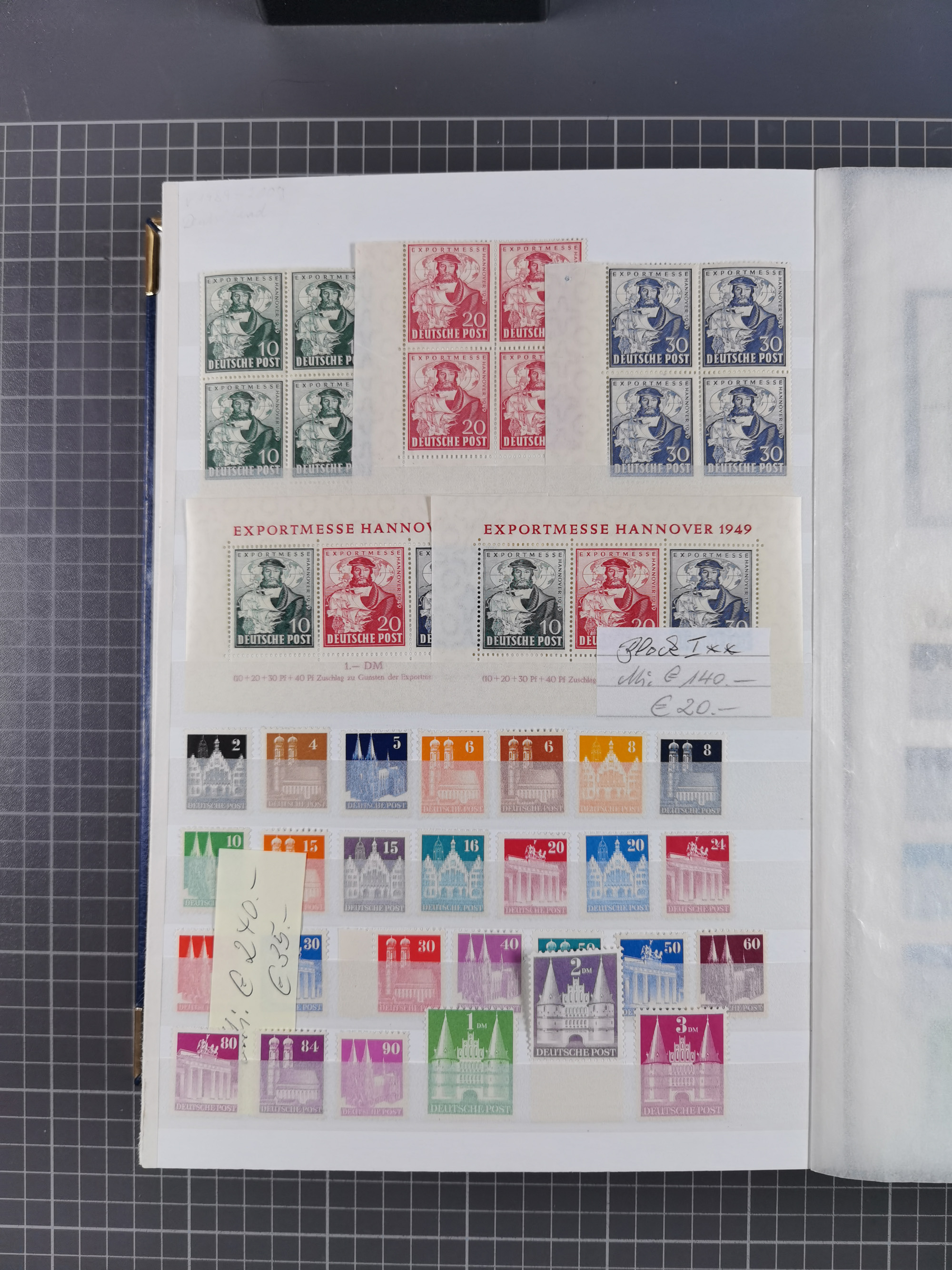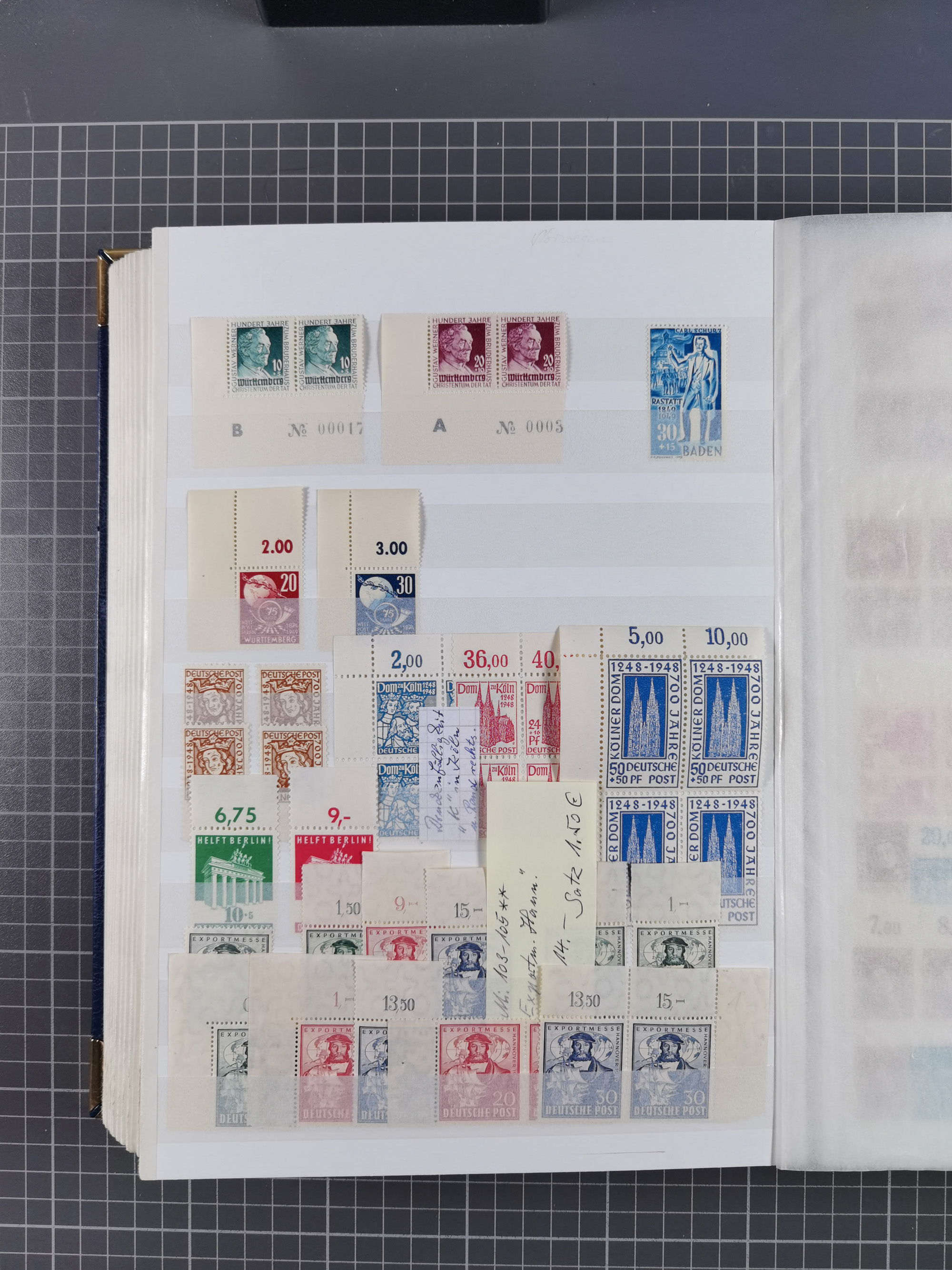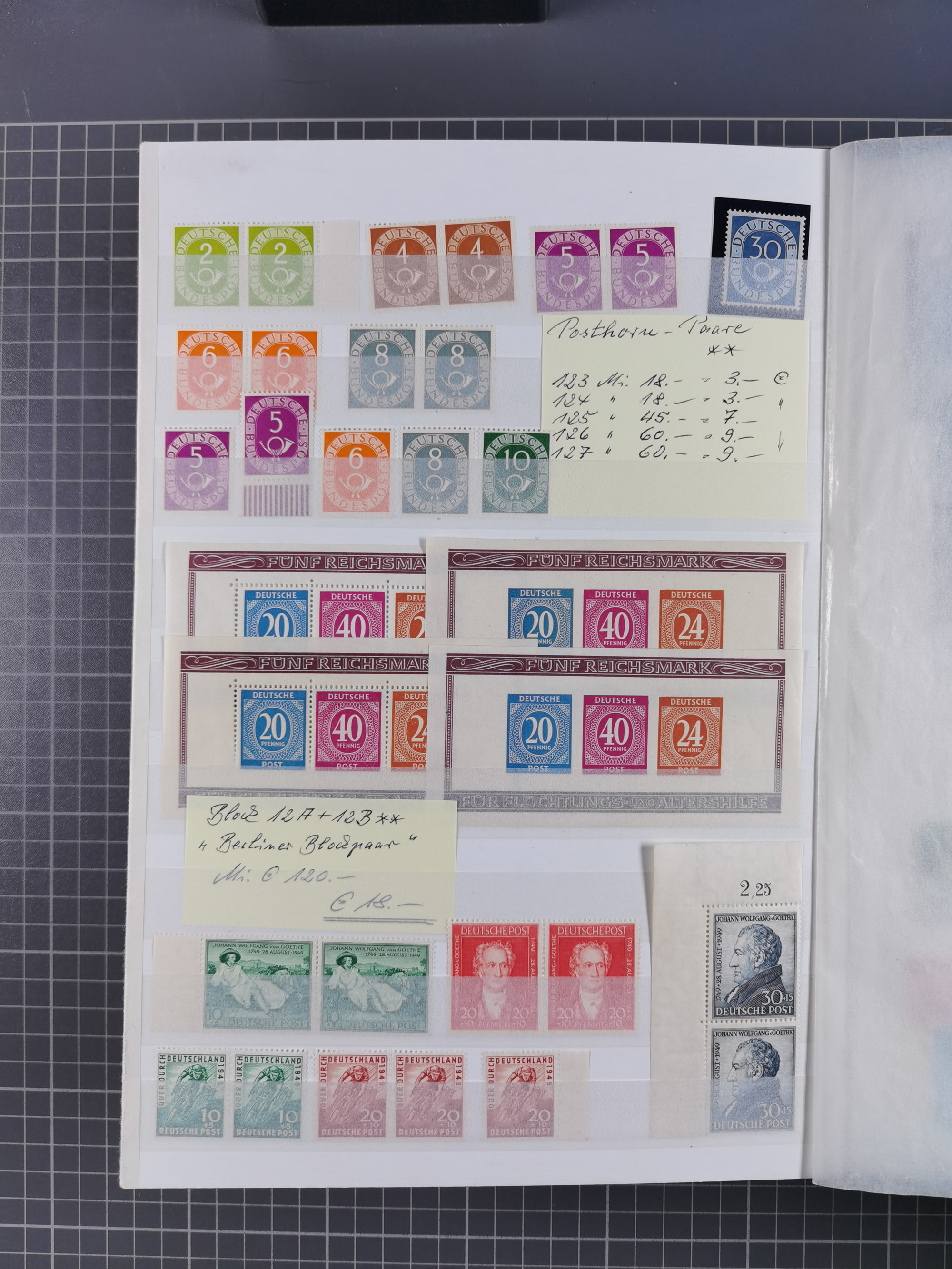 1923/60, umfangreicher ungebraucht/postfrischer und gestempelter Händler-Bestand ab Weimar bis Bund/Berlin und DDR mit besseren und kpl. Ausgaben auf Steckkarten auf großen Albenblättern. Dabei liegt der Schwerpunkt bei den Ausgaben nach 1945 mit u.a. Kontrollrat Block 12A/B mehrfach gestempelt, DDR mit u.a. 6x Mi.-Nr. 286-88 postfrisch und Blockausgaben ab Mi.-Nr. 7 meist mehrfach, Franz. Zone mit viel postfrischem Material sowie Berlin und Bund Anfangsausgaben bis ca. 10x pro Sorte. Erhaltung von etwas fehlerhaft bis einwandfrei, bessere zum Teil signiert