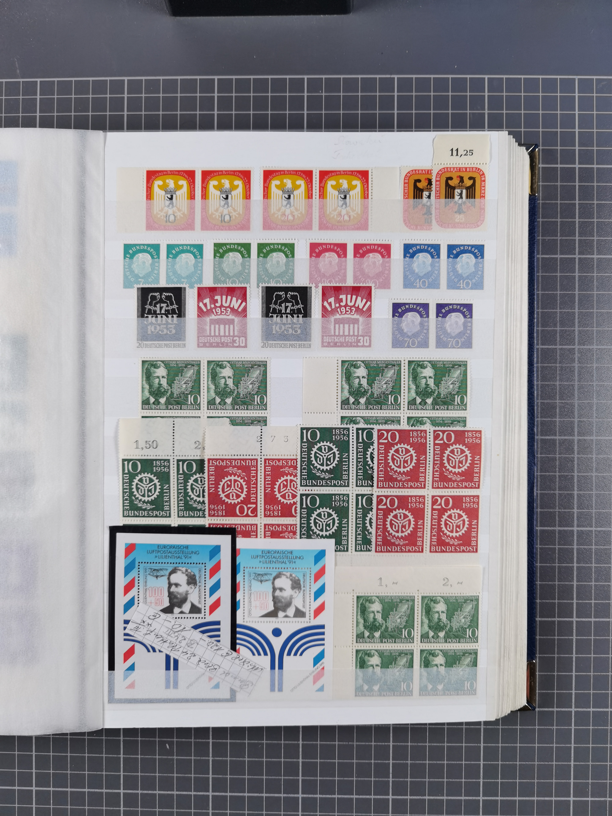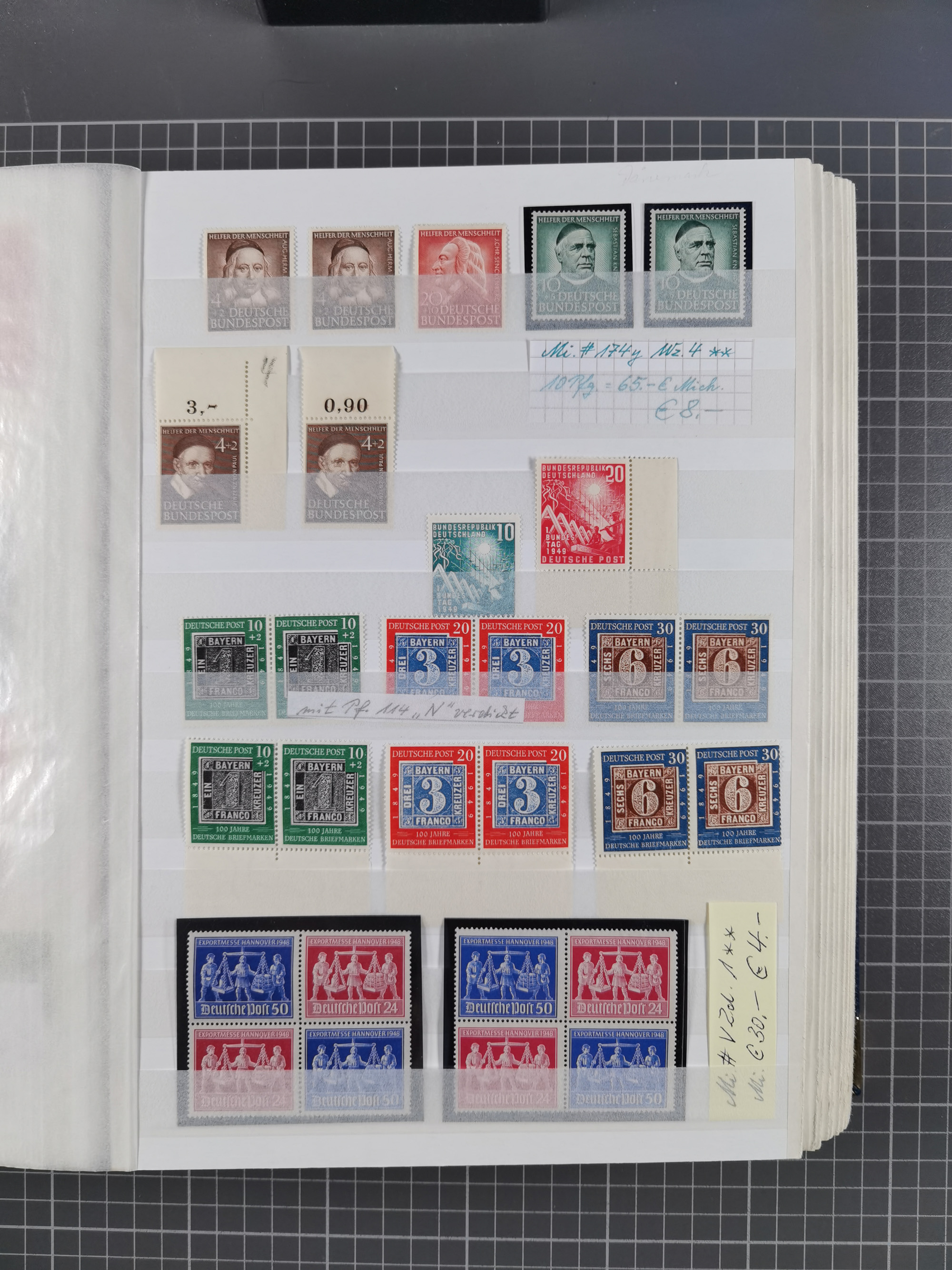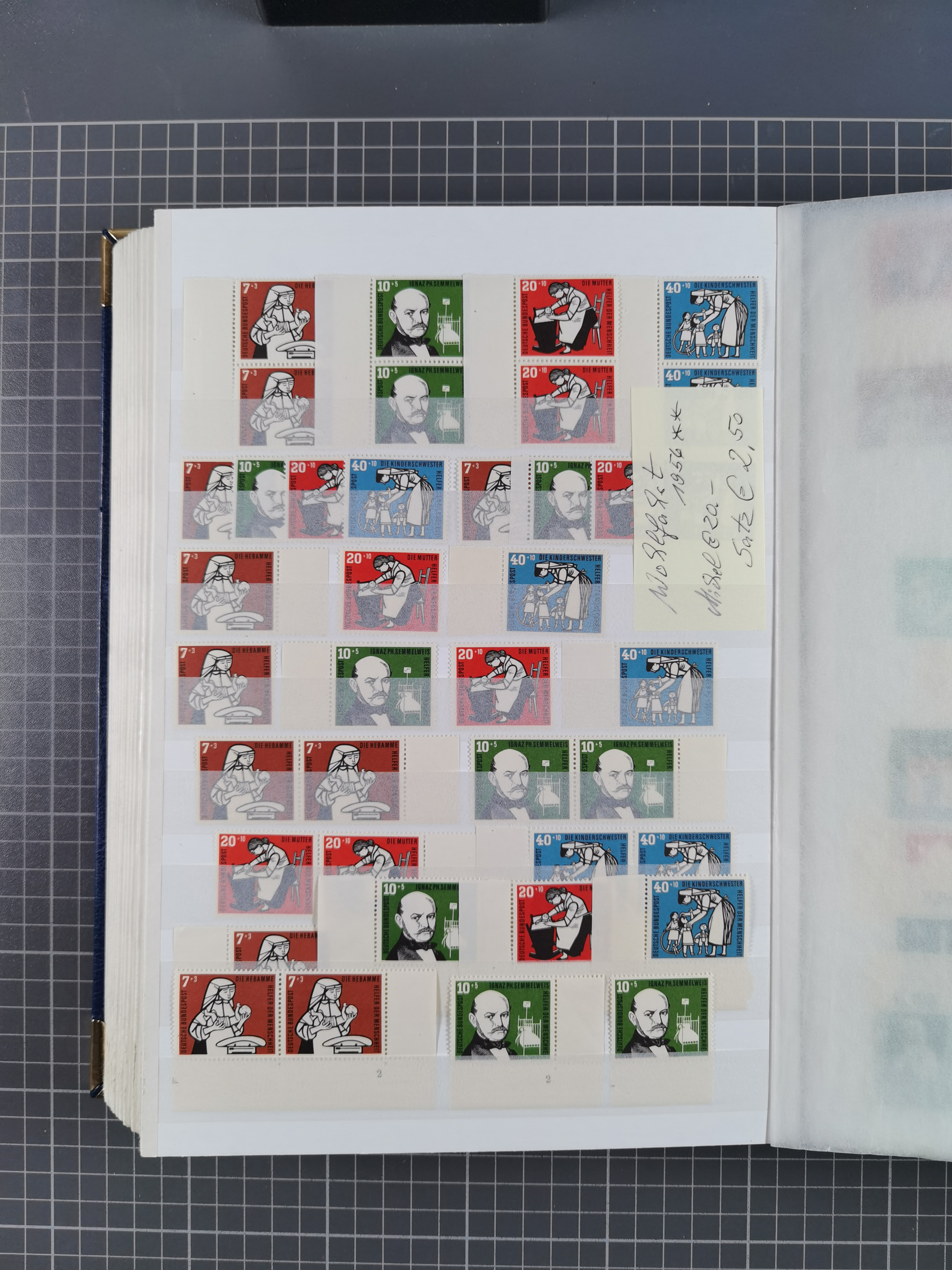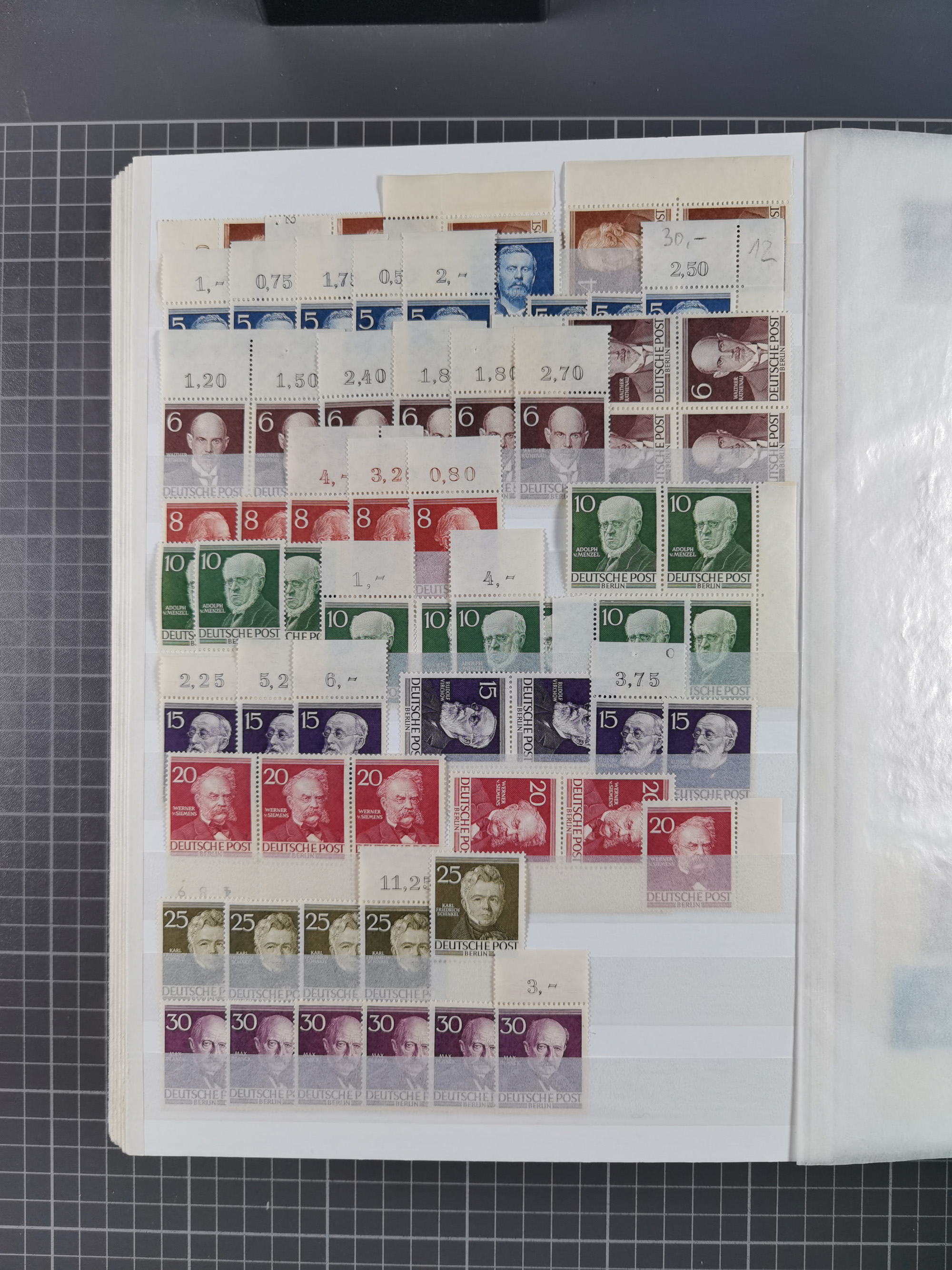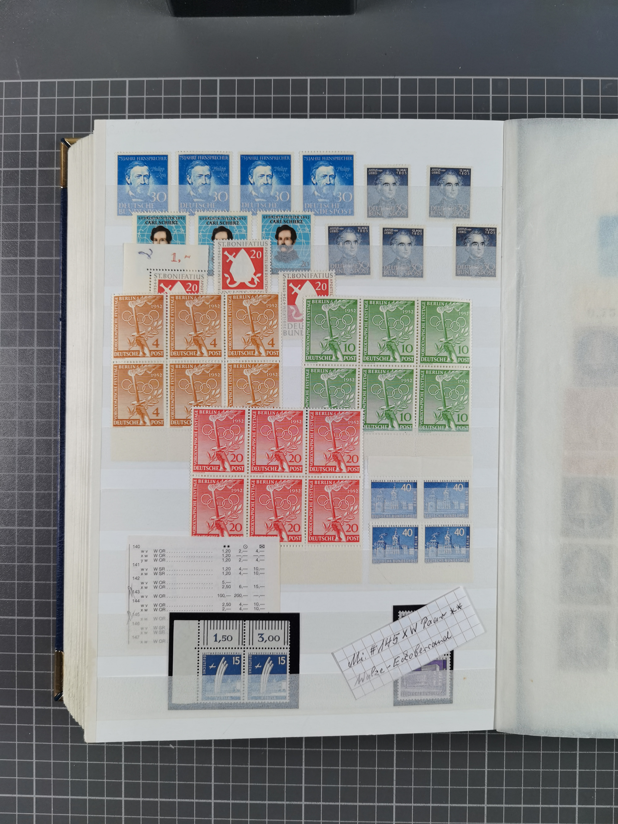 1923/60, umfangreicher ungebraucht/postfrischer und gestempelter Händler-Bestand ab Weimar bis Bund/Berlin und DDR mit besseren und kpl. Ausgaben auf Steckkarten auf großen Albenblättern. Dabei liegt der Schwerpunkt bei den Ausgaben nach 1945 mit u.a. Kontrollrat Block 12A/B mehrfach gestempelt, DDR mit u.a. 6x Mi.-Nr. 286-88 postfrisch und Blockausgaben ab Mi.-Nr. 7 meist mehrfach, Franz. Zone mit viel postfrischem Material sowie Berlin und Bund Anfangsausgaben bis ca. 10x pro Sorte. Erhaltung von etwas fehlerhaft bis einwandfrei, bessere zum Teil signiert