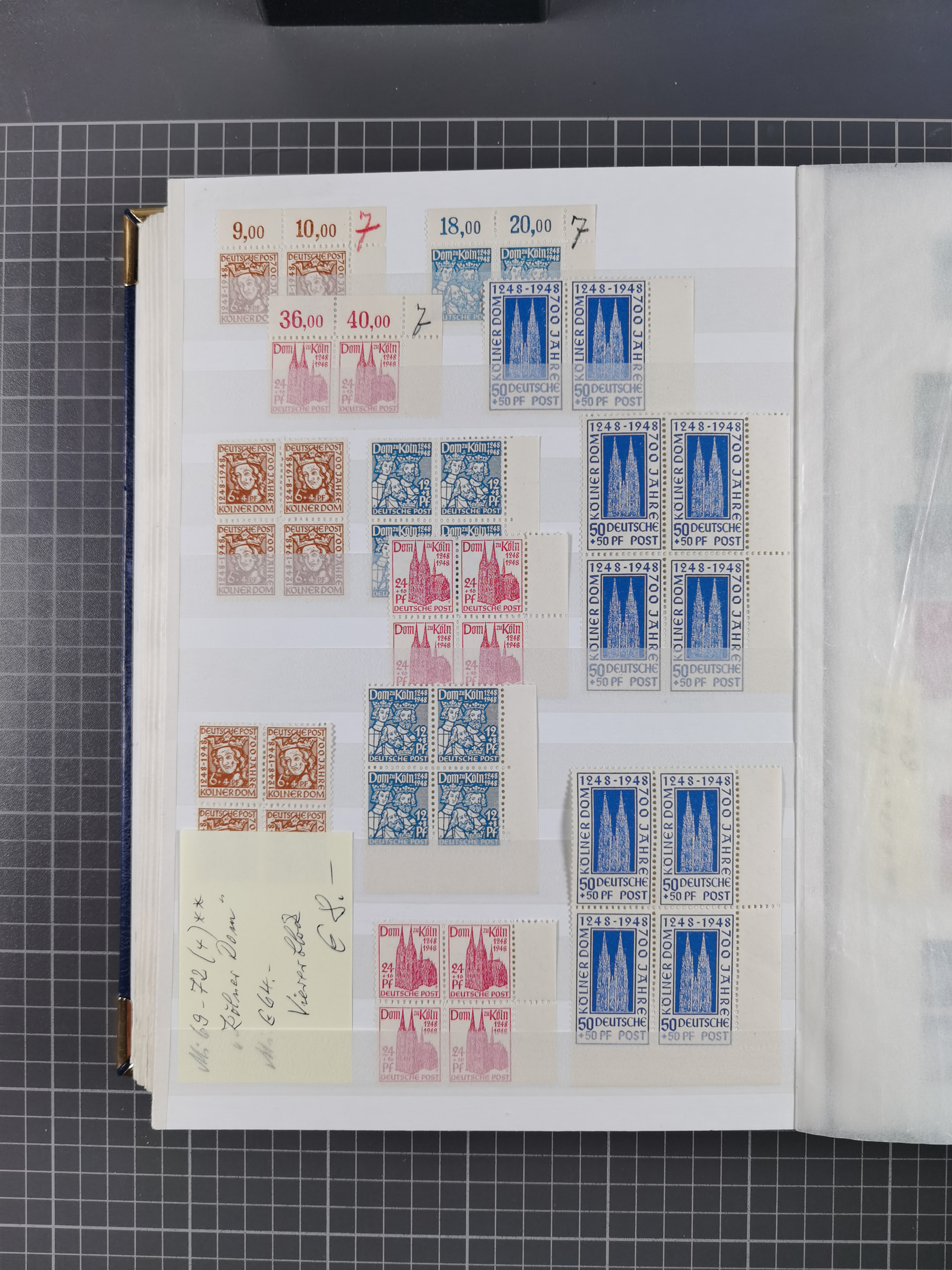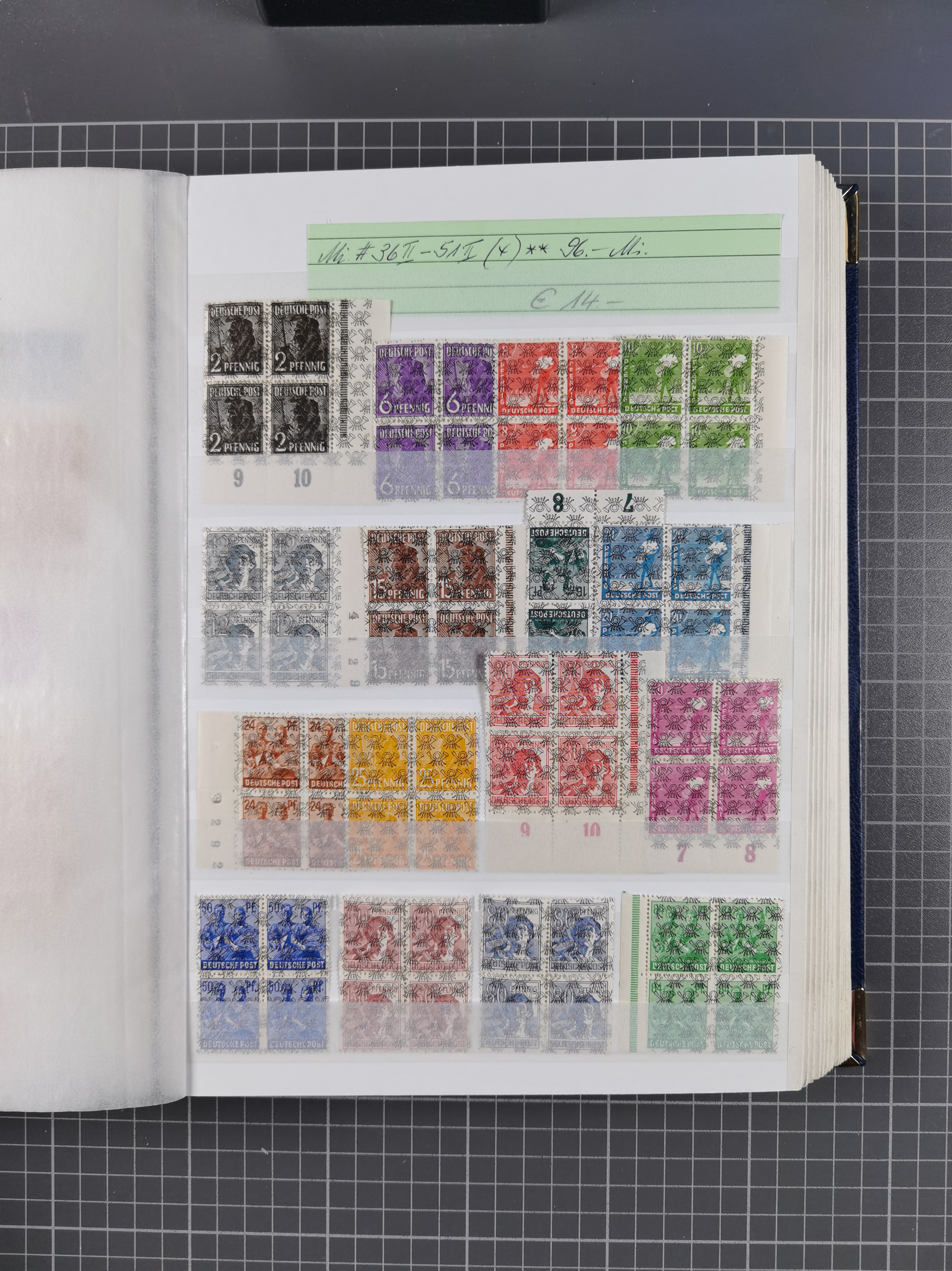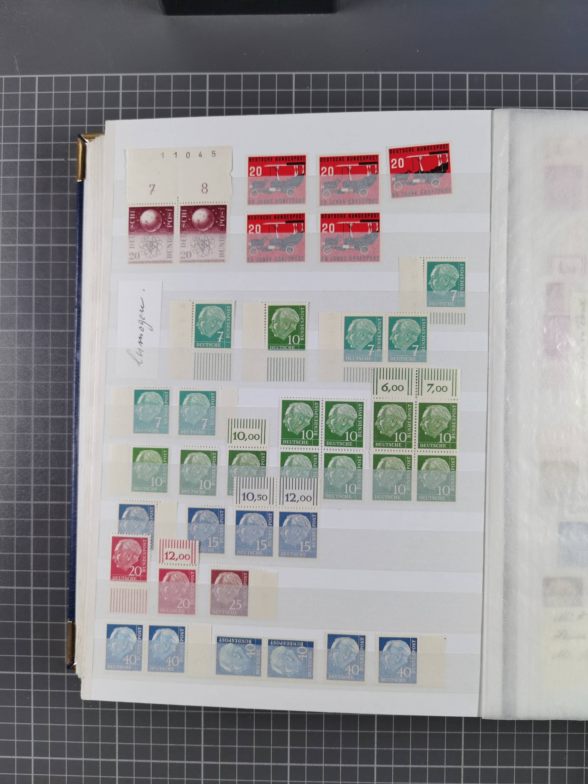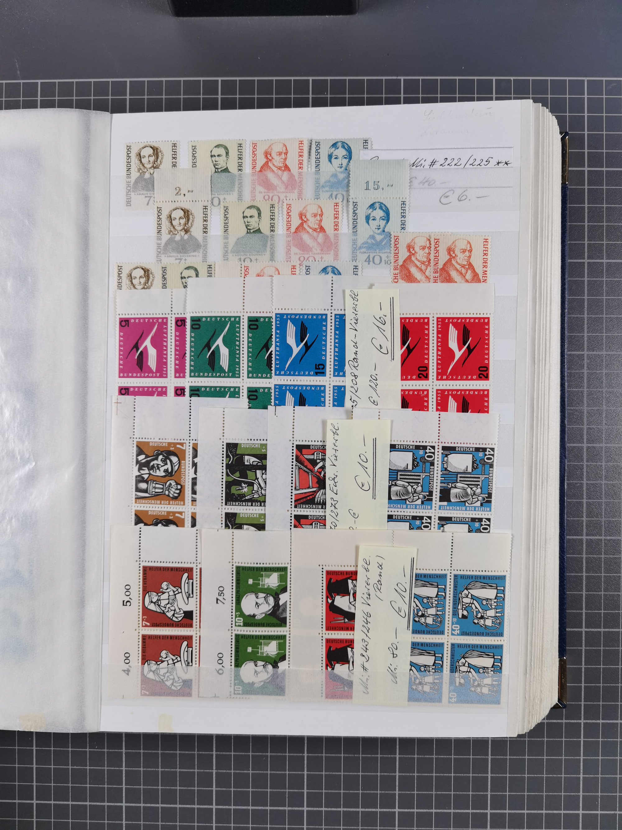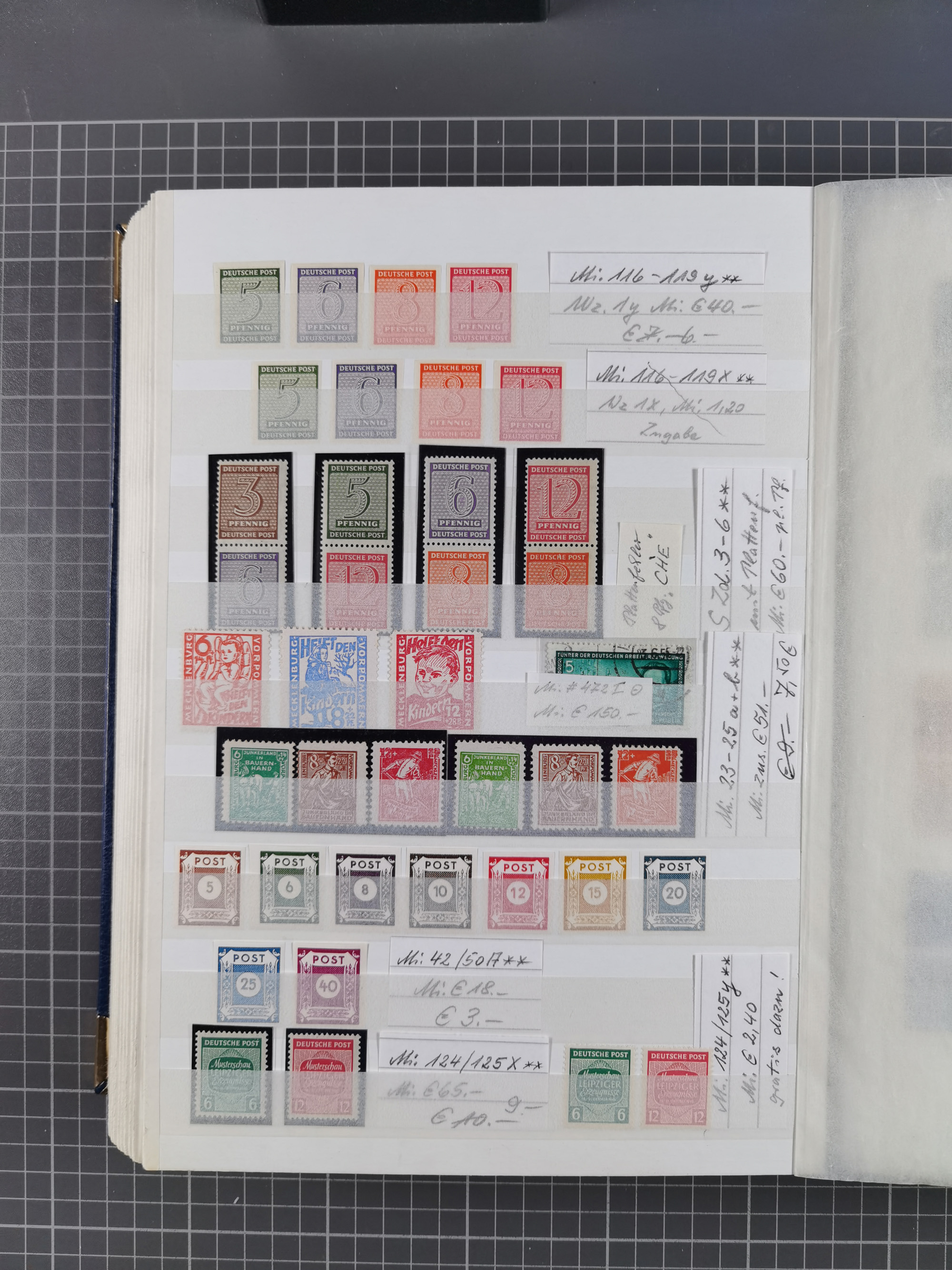 1923/60, umfangreicher ungebraucht/postfrischer und gestempelter Händler-Bestand ab Weimar bis Bund/Berlin und DDR mit besseren und kpl. Ausgaben auf Steckkarten auf großen Albenblättern. Dabei liegt der Schwerpunkt bei den Ausgaben nach 1945 mit u.a. Kontrollrat Block 12A/B mehrfach gestempelt, DDR mit u.a. 6x Mi.-Nr. 286-88 postfrisch und Blockausgaben ab Mi.-Nr. 7 meist mehrfach, Franz. Zone mit viel postfrischem Material sowie Berlin und Bund Anfangsausgaben bis ca. 10x pro Sorte. Erhaltung von etwas fehlerhaft bis einwandfrei, bessere zum Teil signiert