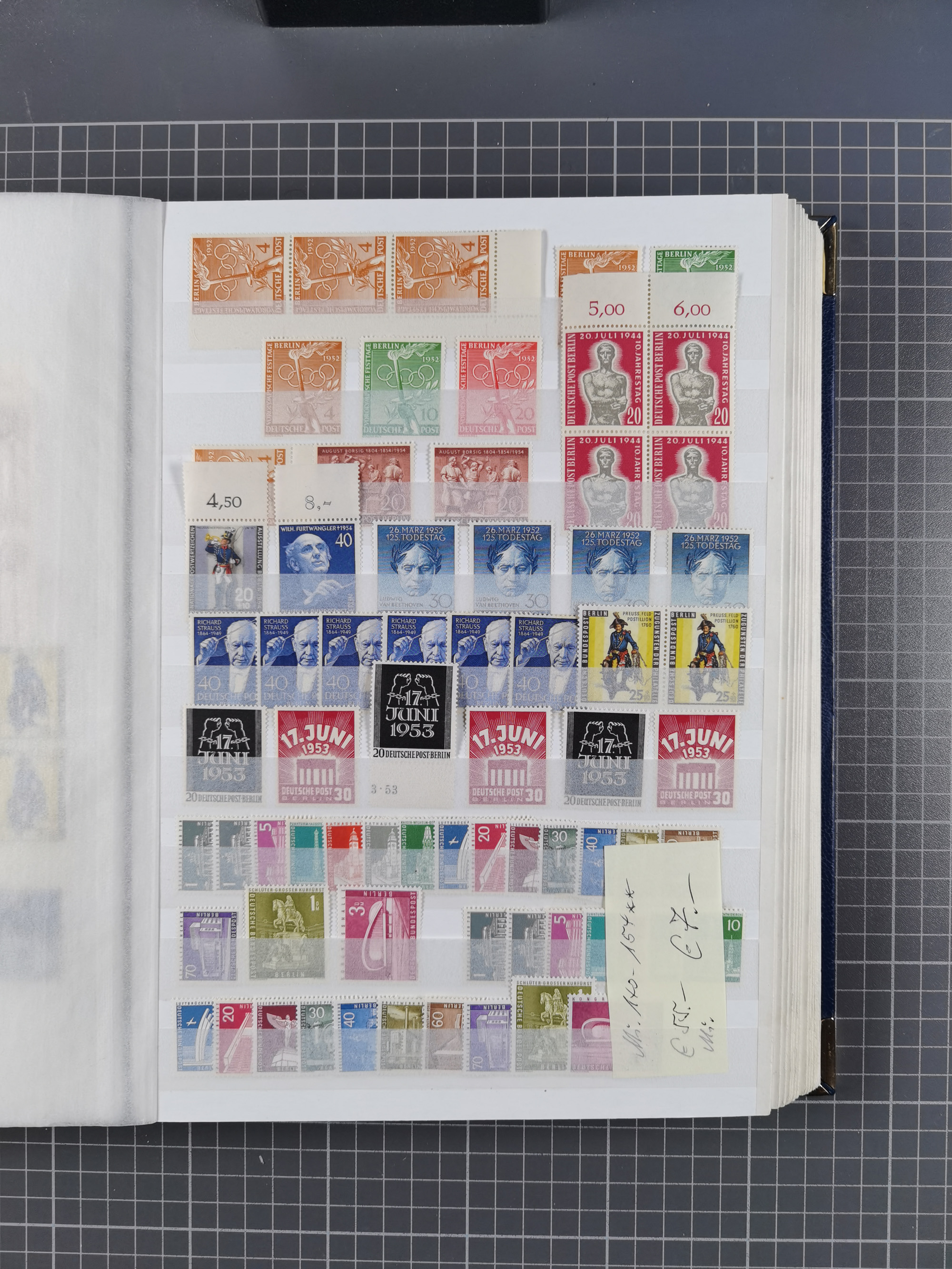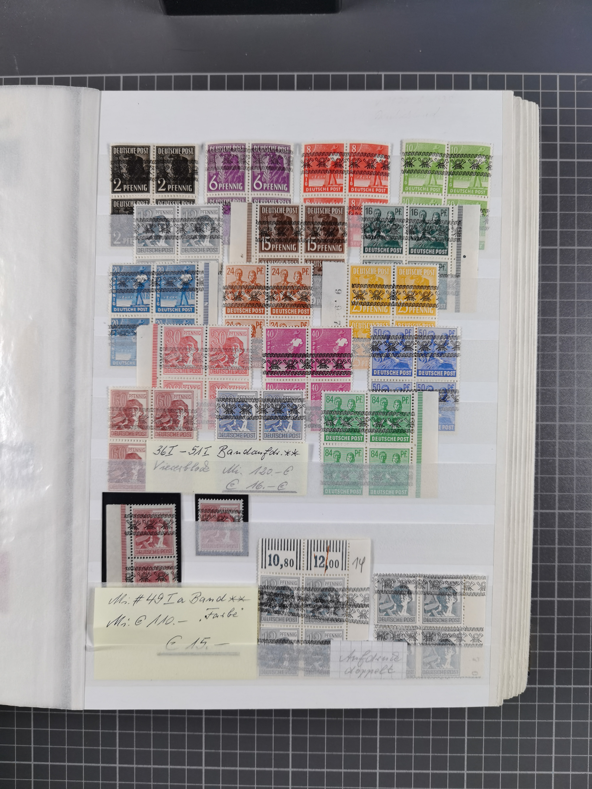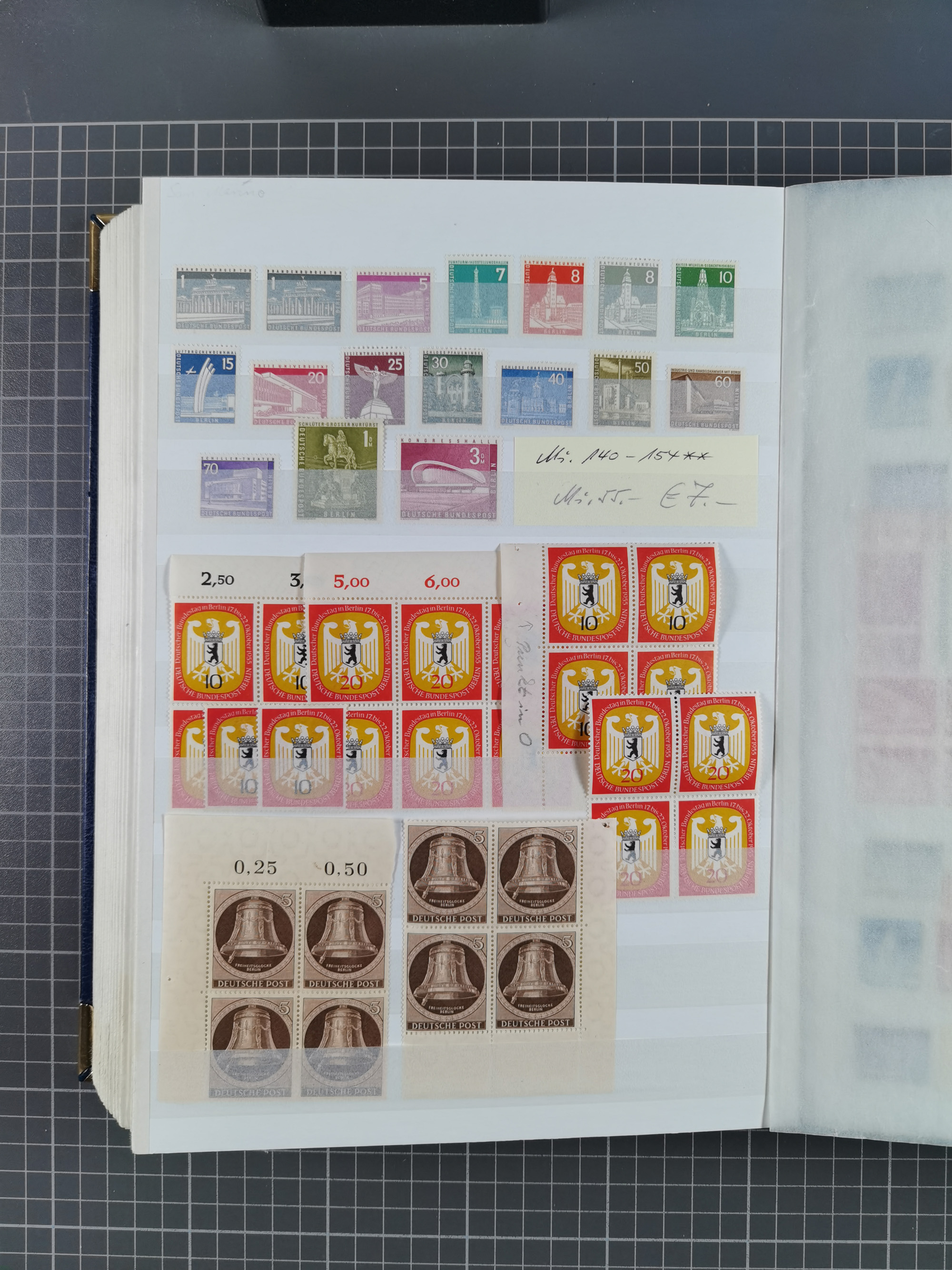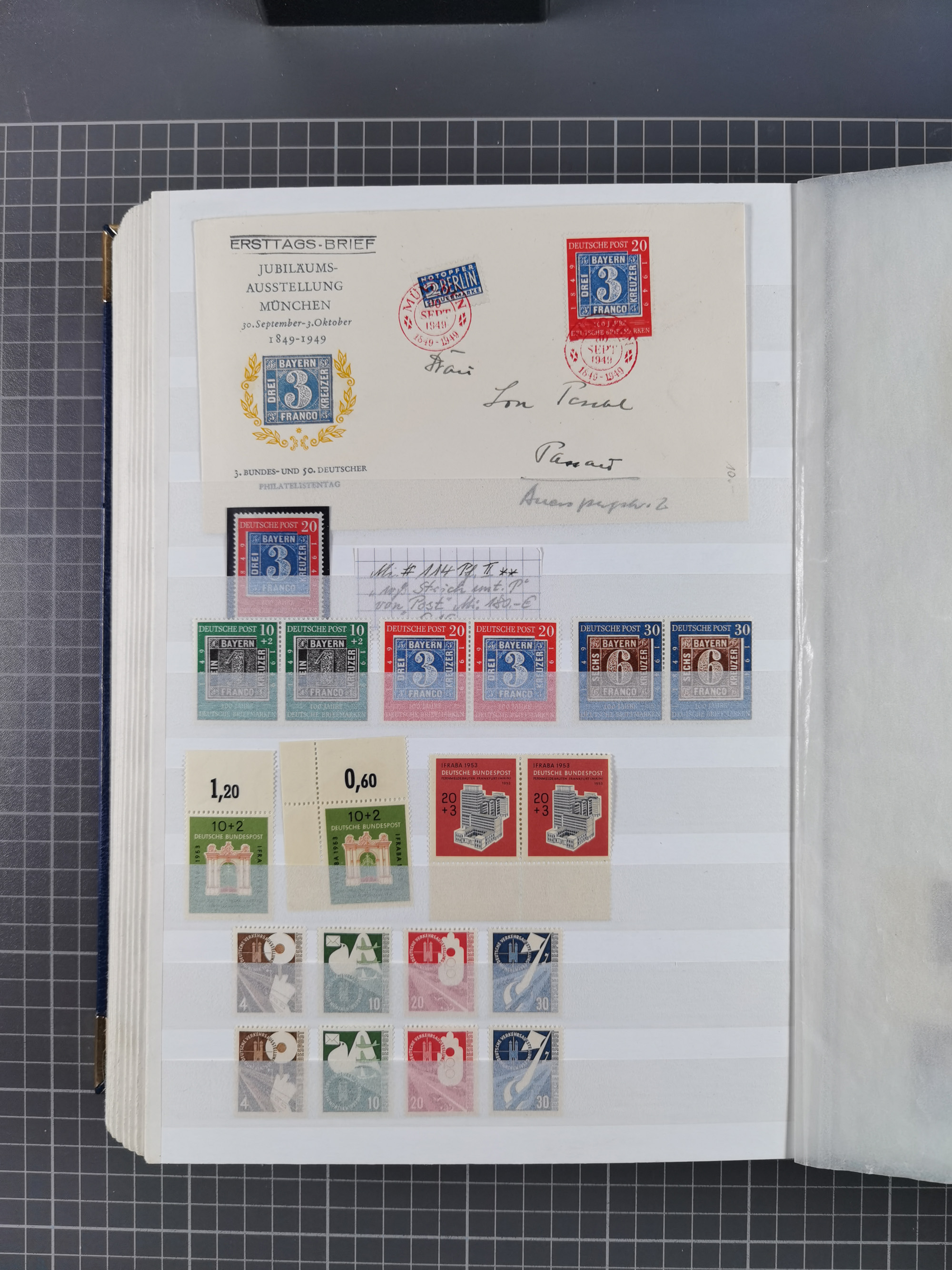 1923/60, umfangreicher ungebraucht/postfrischer und gestempelter Händler-Bestand ab Weimar bis Bund/Berlin und DDR mit besseren und kpl. Ausgaben auf Steckkarten auf großen Albenblättern. Dabei liegt der Schwerpunkt bei den Ausgaben nach 1945 mit u.a. Kontrollrat Block 12A/B mehrfach gestempelt, DDR mit u.a. 6x Mi.-Nr. 286-88 postfrisch und Blockausgaben ab Mi.-Nr. 7 meist mehrfach, Franz. Zone mit viel postfrischem Material sowie Berlin und Bund Anfangsausgaben bis ca. 10x pro Sorte. Erhaltung von etwas fehlerhaft bis einwandfrei, bessere zum Teil signiert