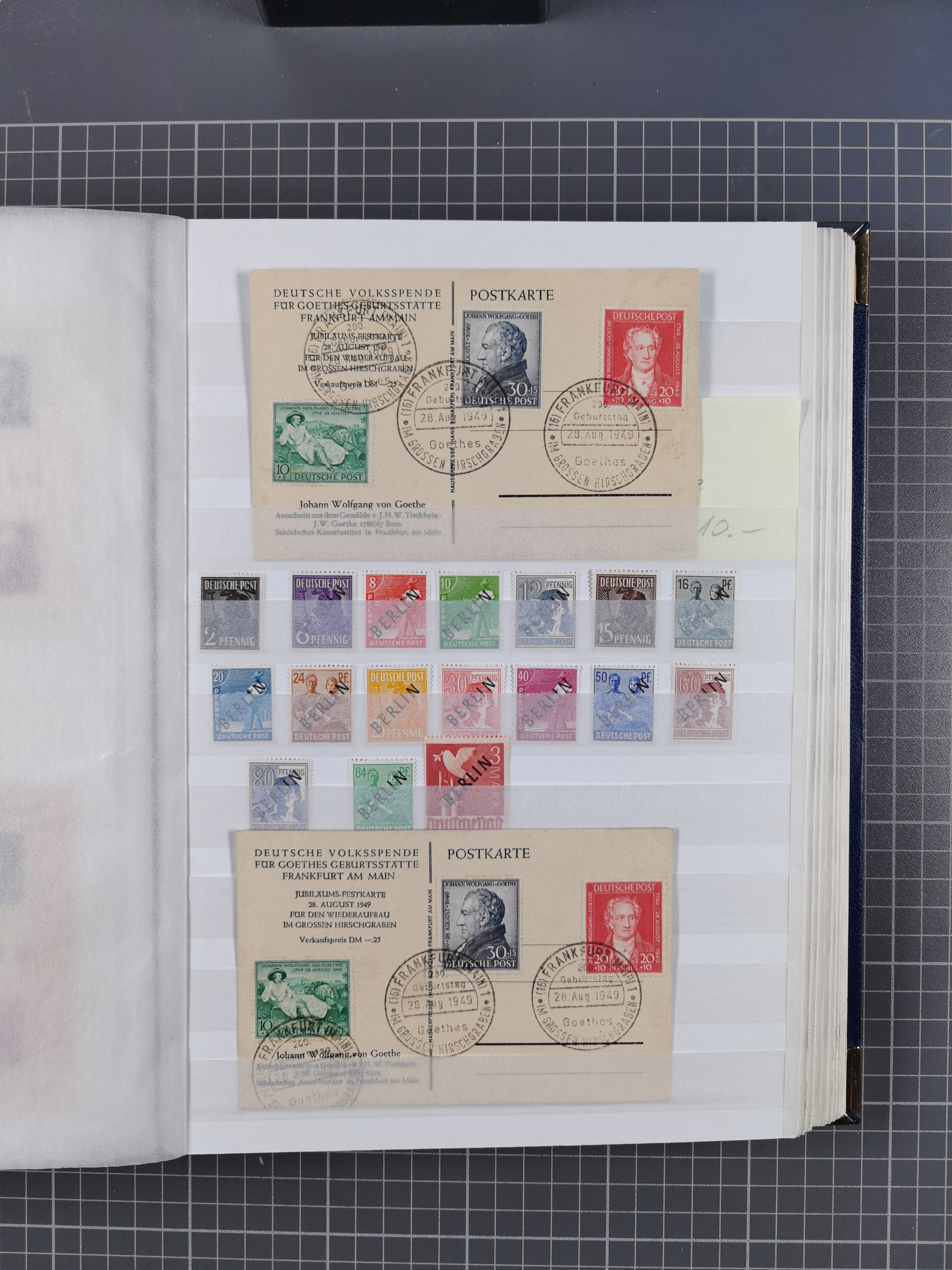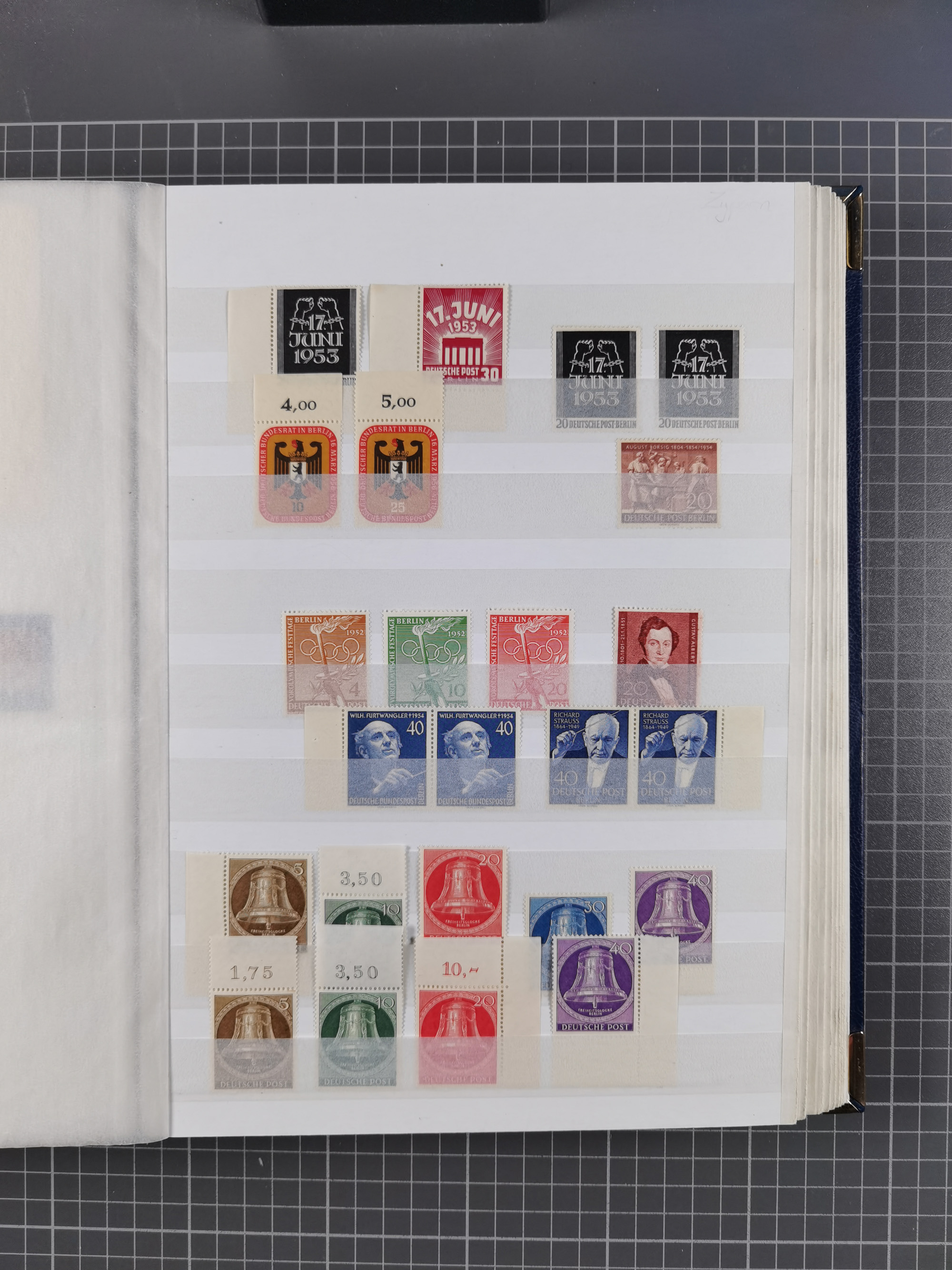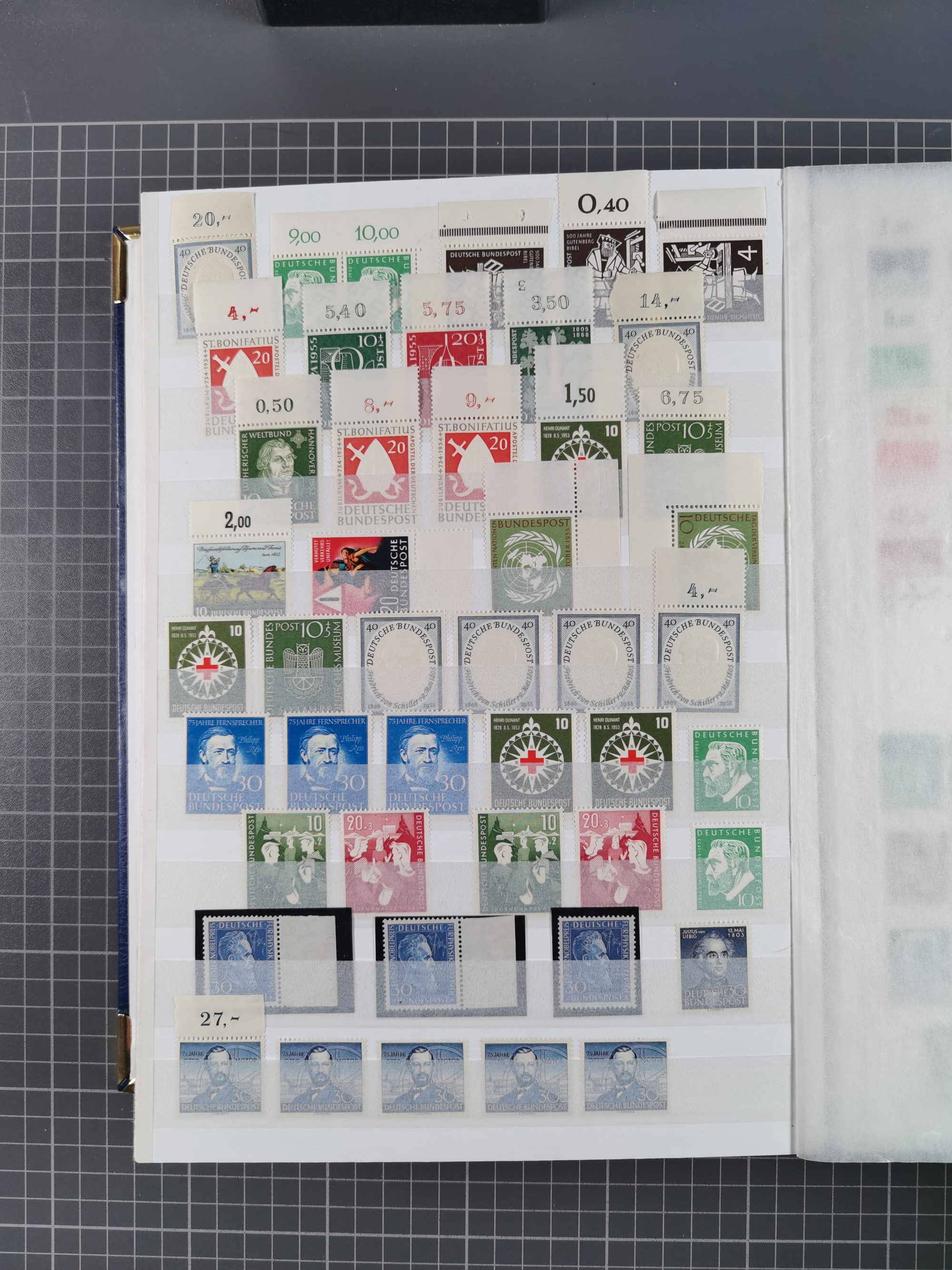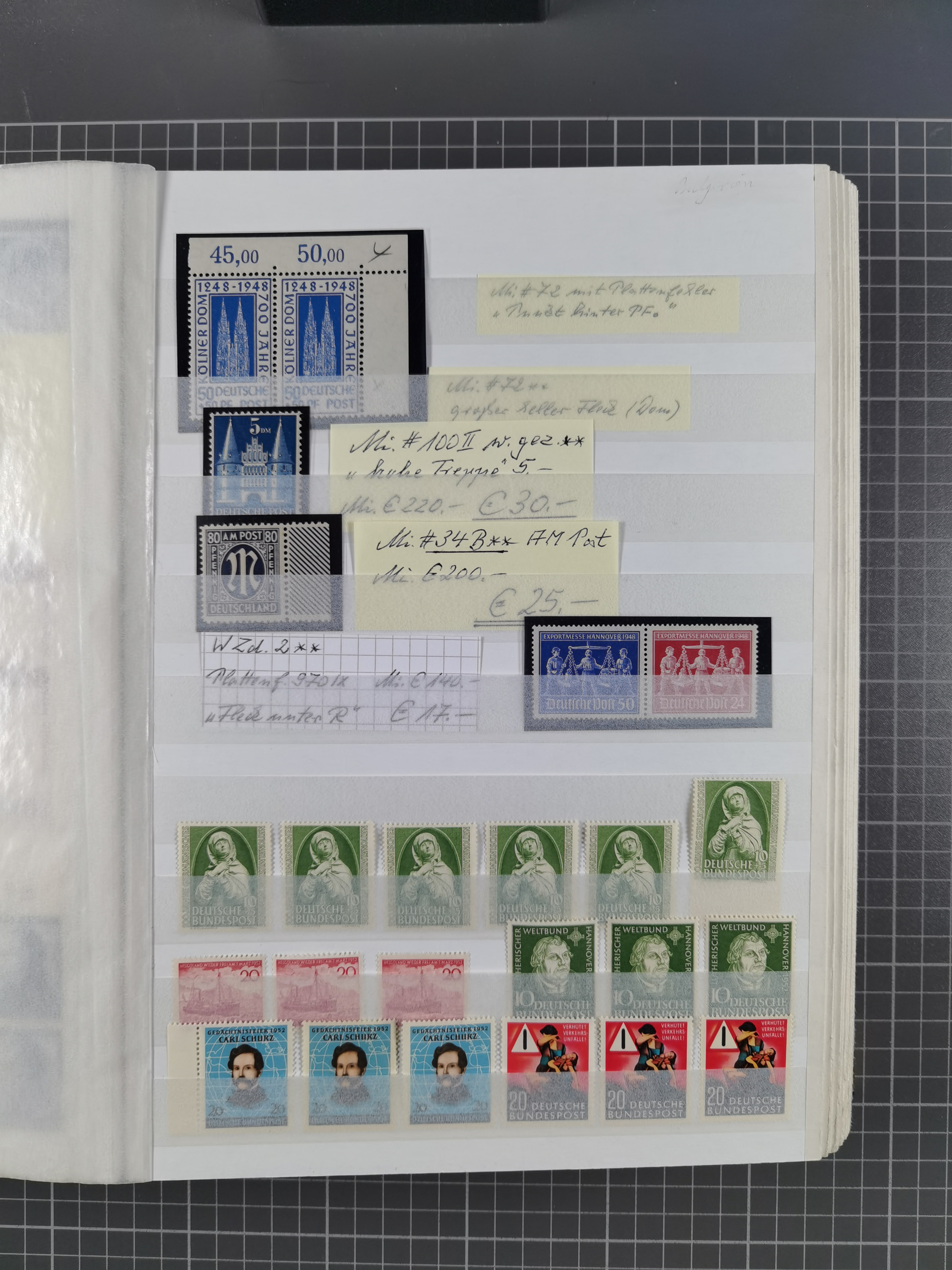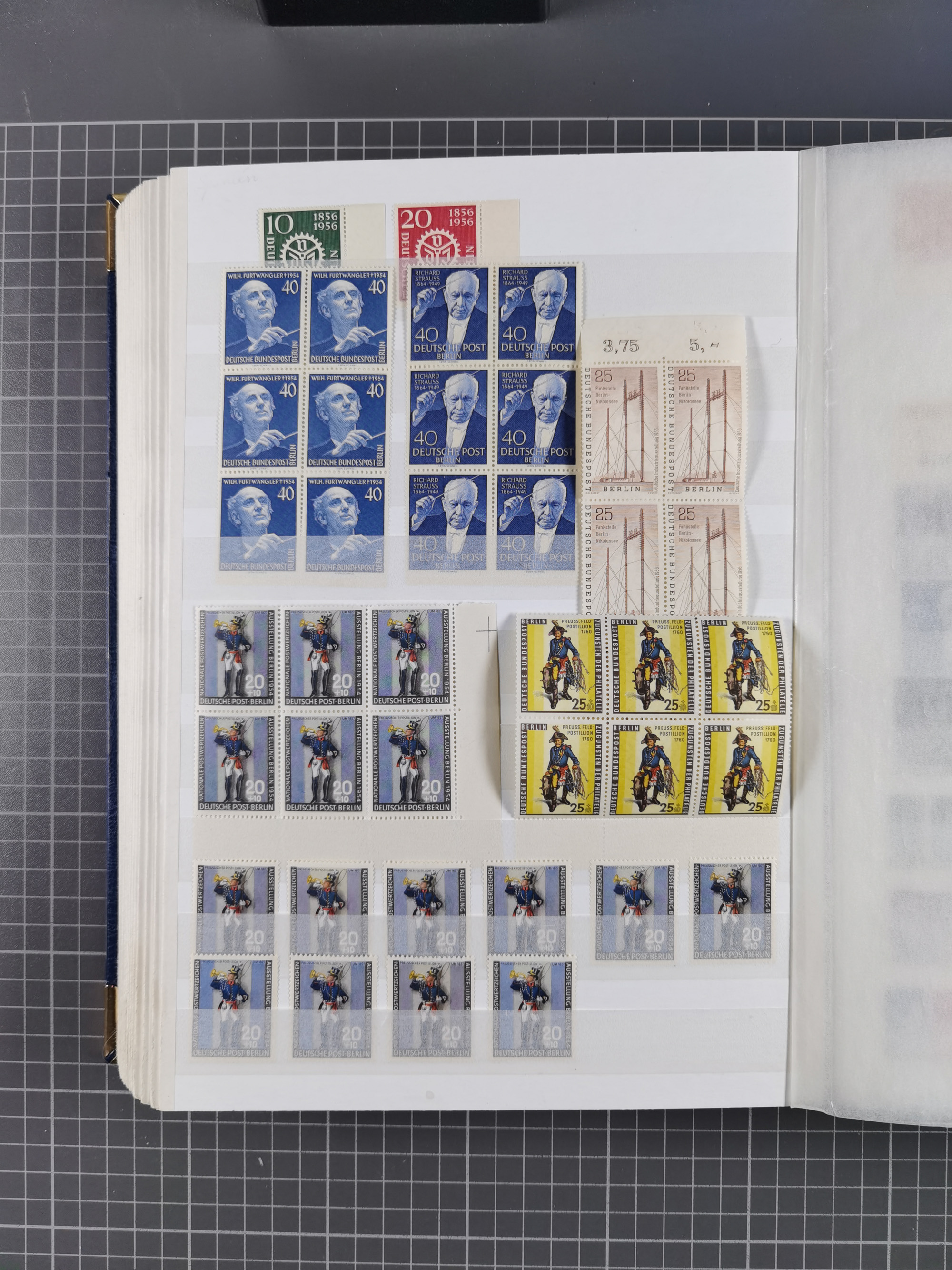 1923/60, umfangreicher ungebraucht/postfrischer und gestempelter Händler-Bestand ab Weimar bis Bund/Berlin und DDR mit besseren und kpl. Ausgaben auf Steckkarten auf großen Albenblättern. Dabei liegt der Schwerpunkt bei den Ausgaben nach 1945 mit u.a. Kontrollrat Block 12A/B mehrfach gestempelt, DDR mit u.a. 6x Mi.-Nr. 286-88 postfrisch und Blockausgaben ab Mi.-Nr. 7 meist mehrfach, Franz. Zone mit viel postfrischem Material sowie Berlin und Bund Anfangsausgaben bis ca. 10x pro Sorte. Erhaltung von etwas fehlerhaft bis einwandfrei, bessere zum Teil signiert