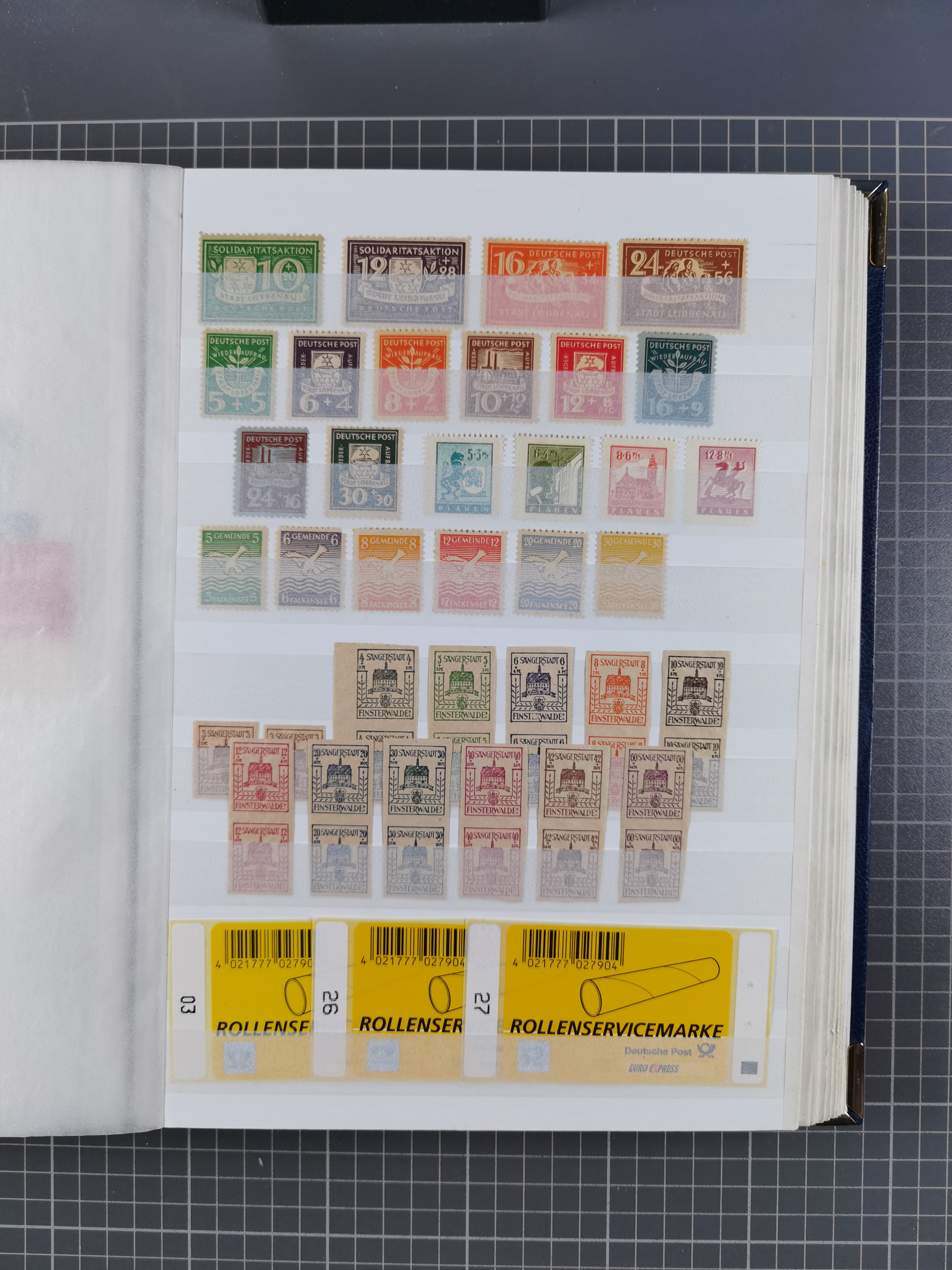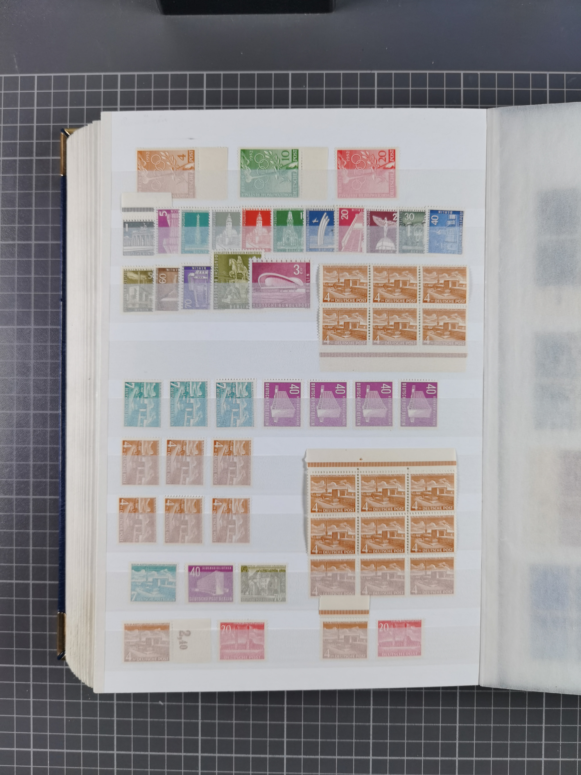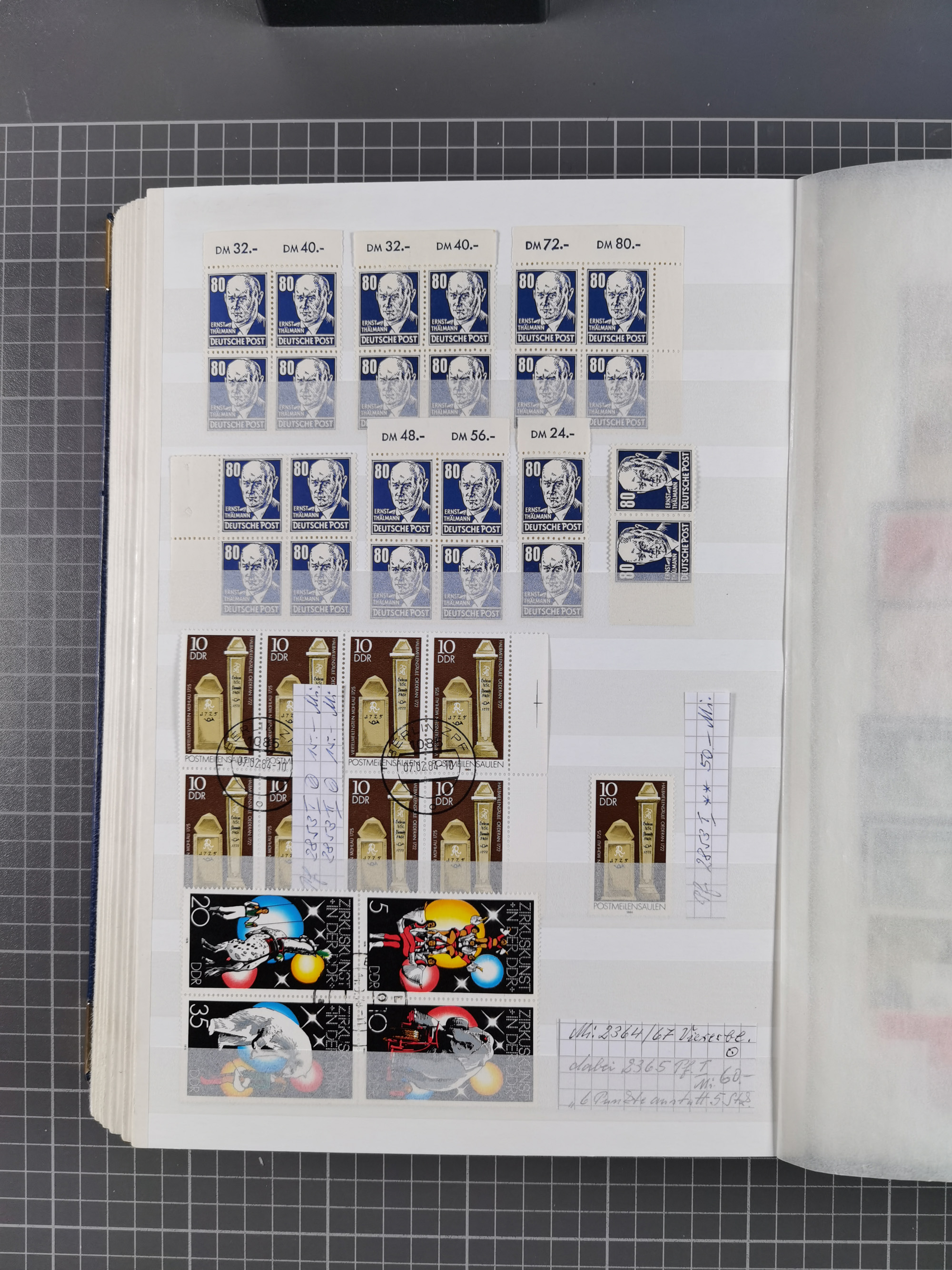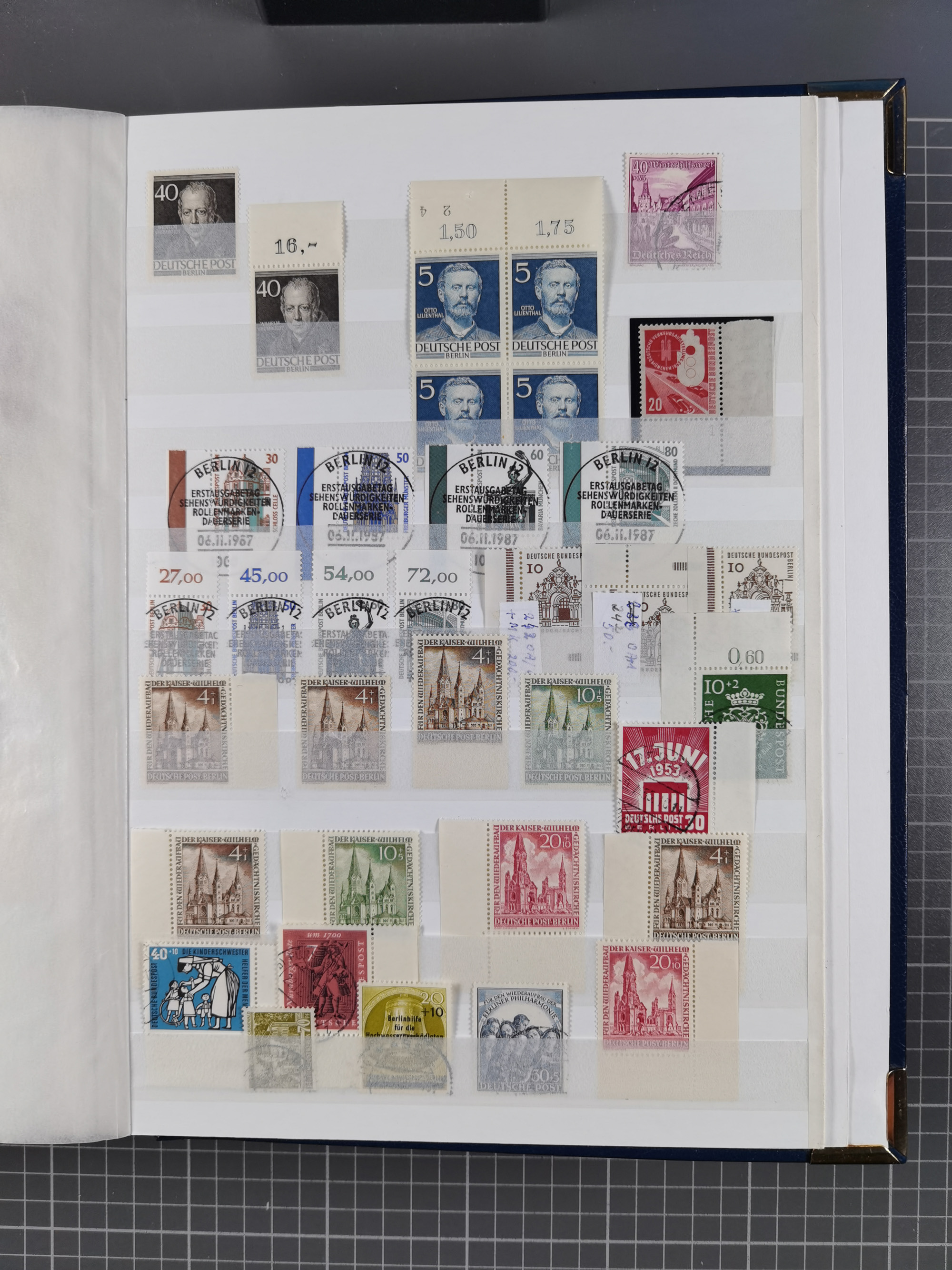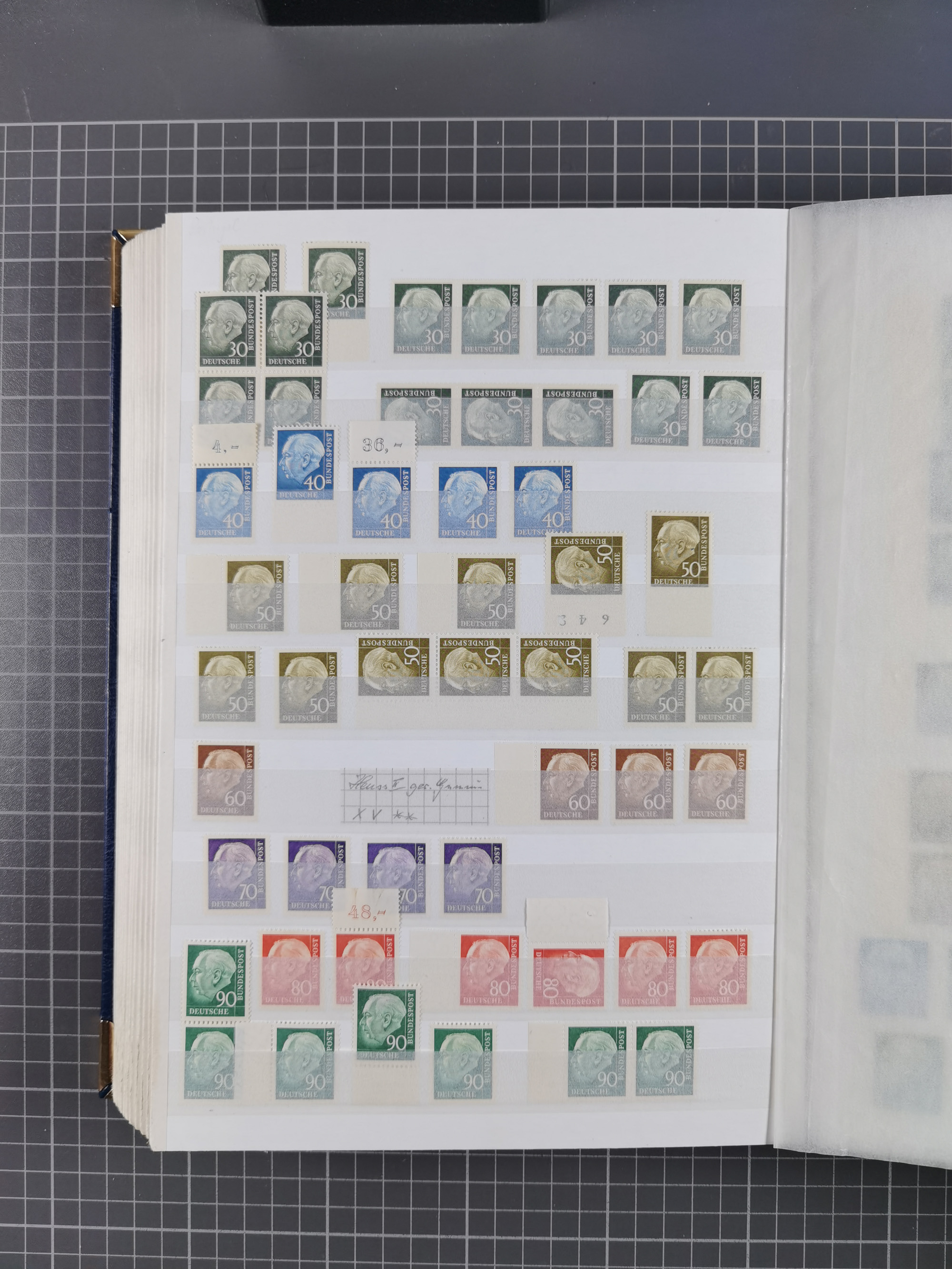 1923/60, umfangreicher ungebraucht/postfrischer und gestempelter Händler-Bestand ab Weimar bis Bund/Berlin und DDR mit besseren und kpl. Ausgaben auf Steckkarten auf großen Albenblättern. Dabei liegt der Schwerpunkt bei den Ausgaben nach 1945 mit u.a. Kontrollrat Block 12A/B mehrfach gestempelt, DDR mit u.a. 6x Mi.-Nr. 286-88 postfrisch und Blockausgaben ab Mi.-Nr. 7 meist mehrfach, Franz. Zone mit viel postfrischem Material sowie Berlin und Bund Anfangsausgaben bis ca. 10x pro Sorte. Erhaltung von etwas fehlerhaft bis einwandfrei, bessere zum Teil signiert
