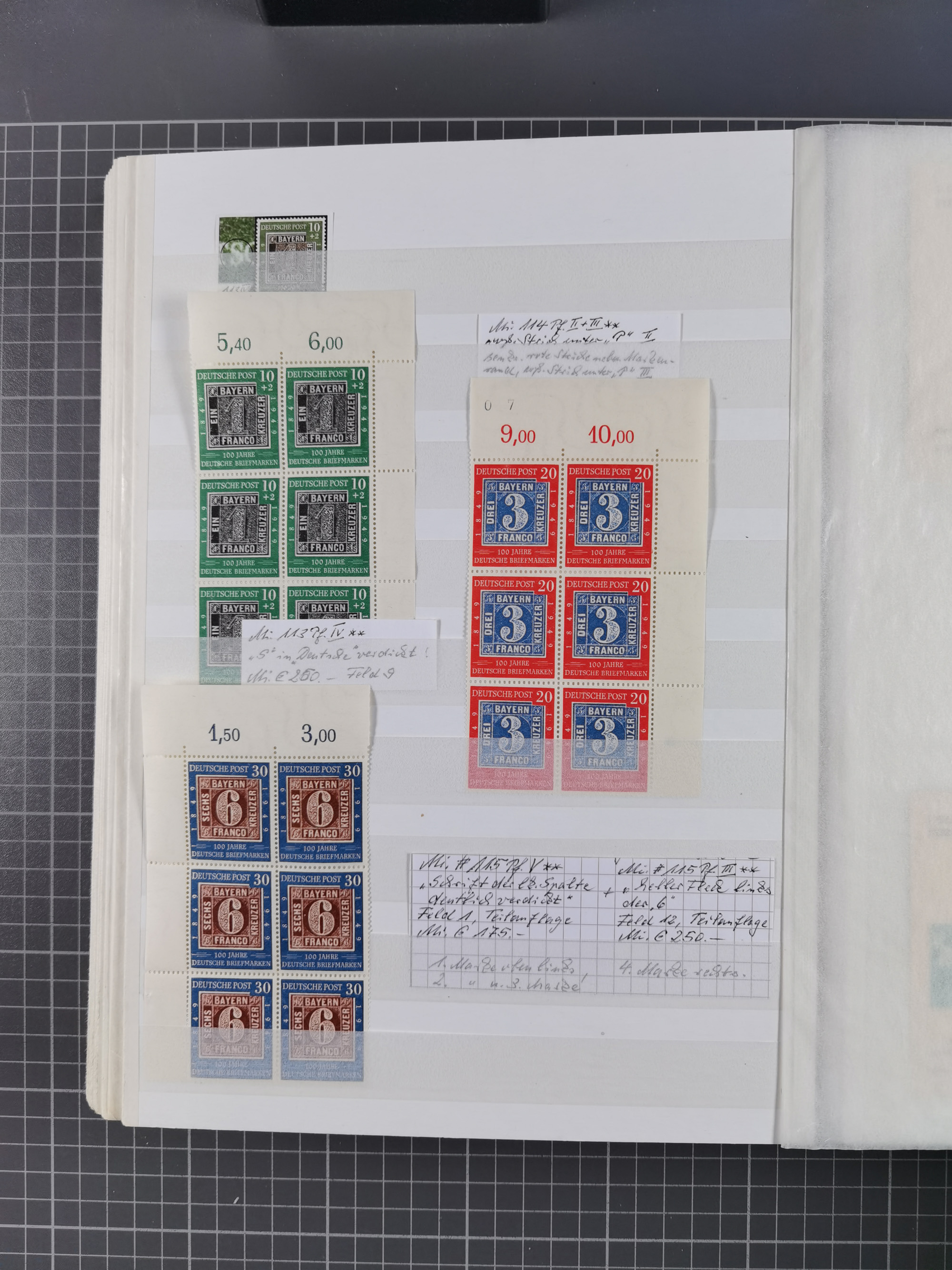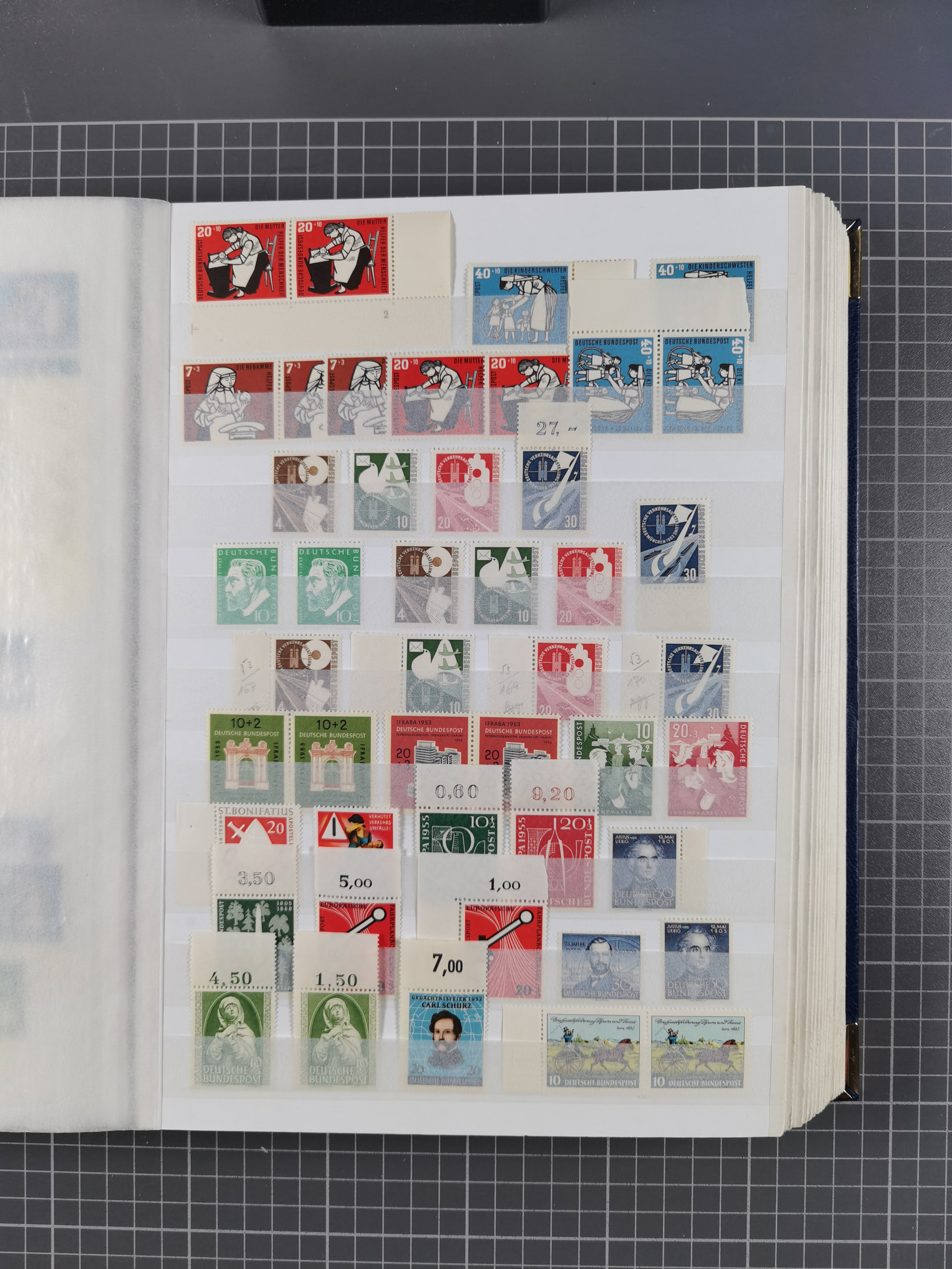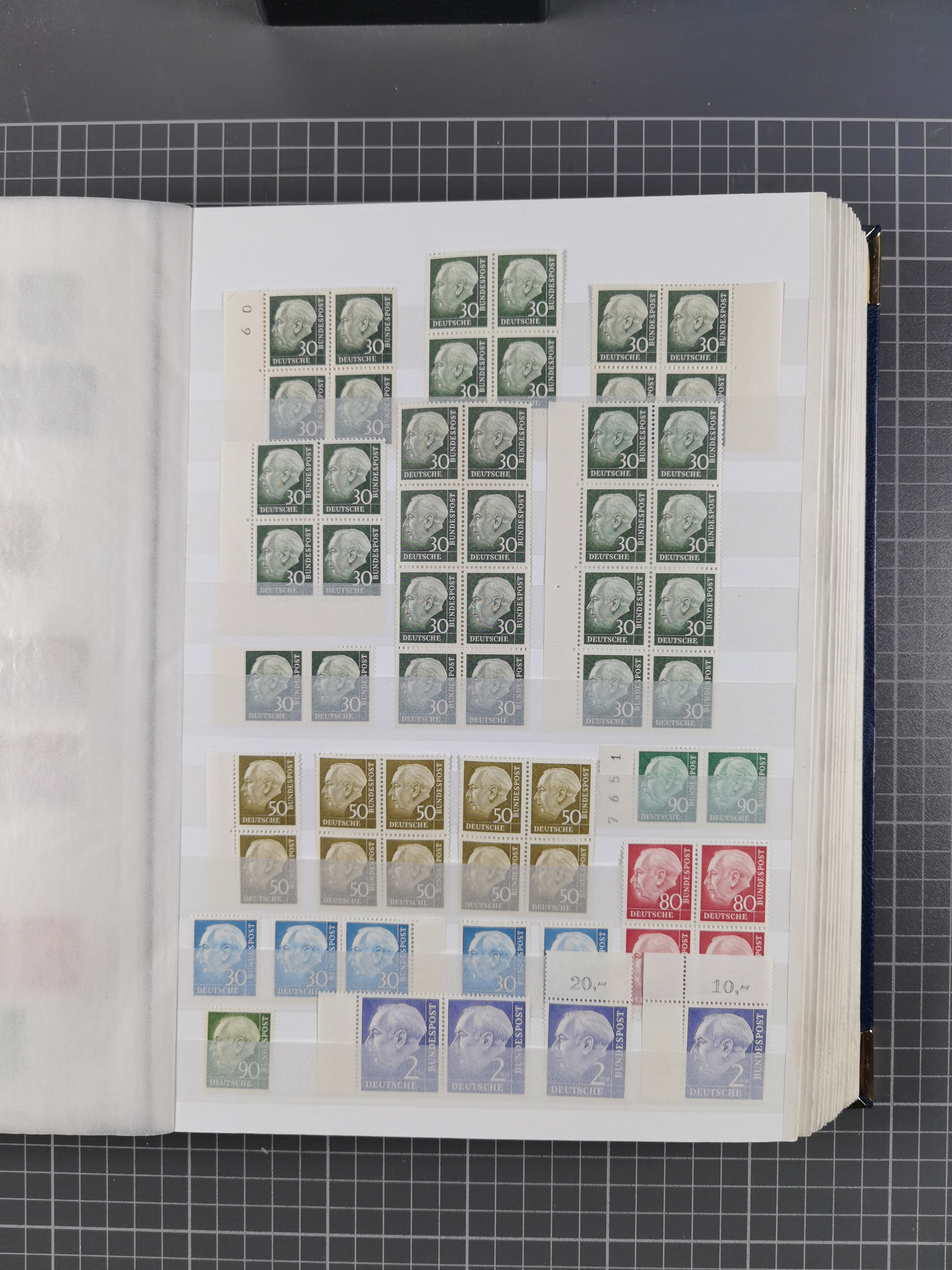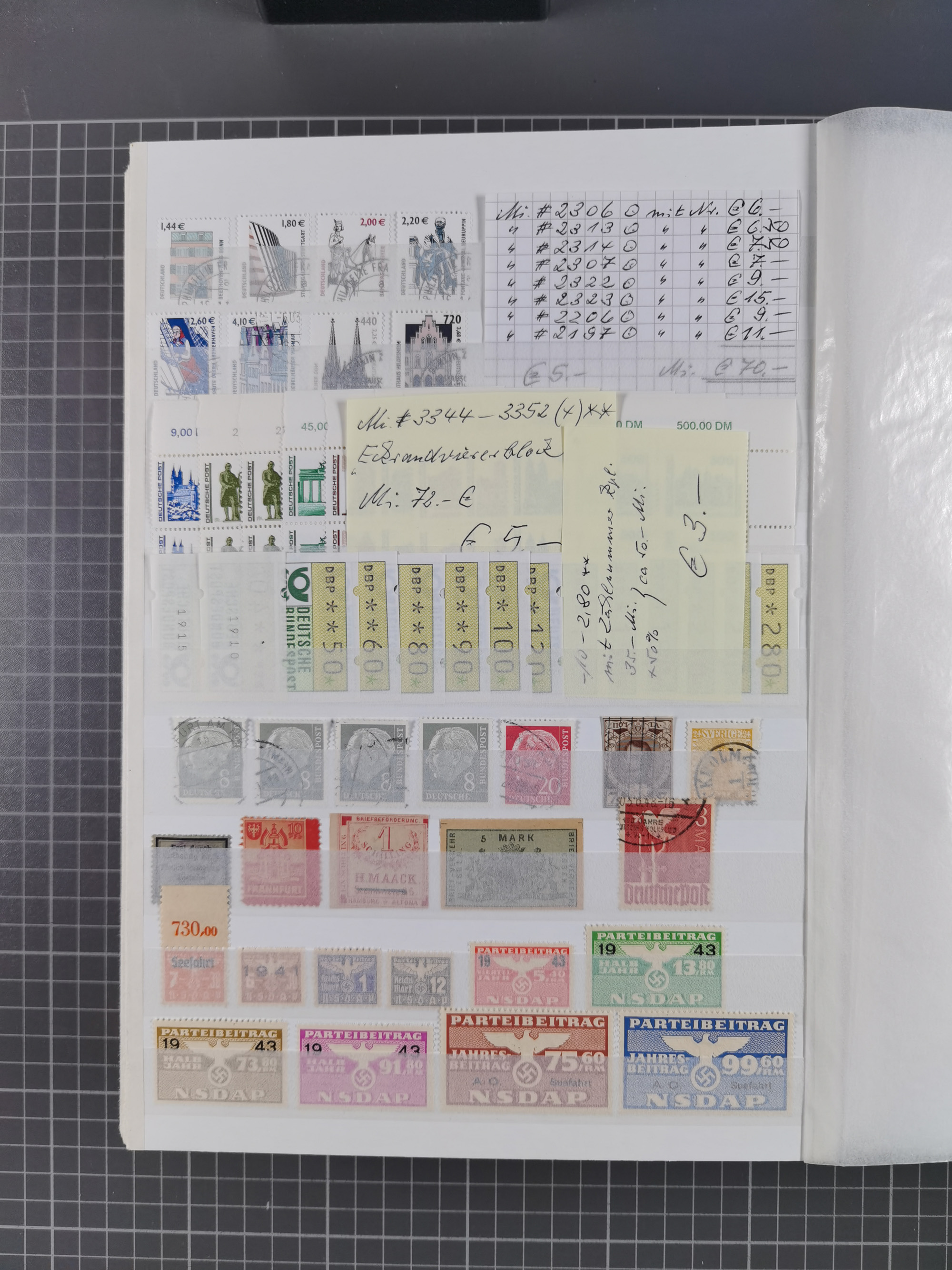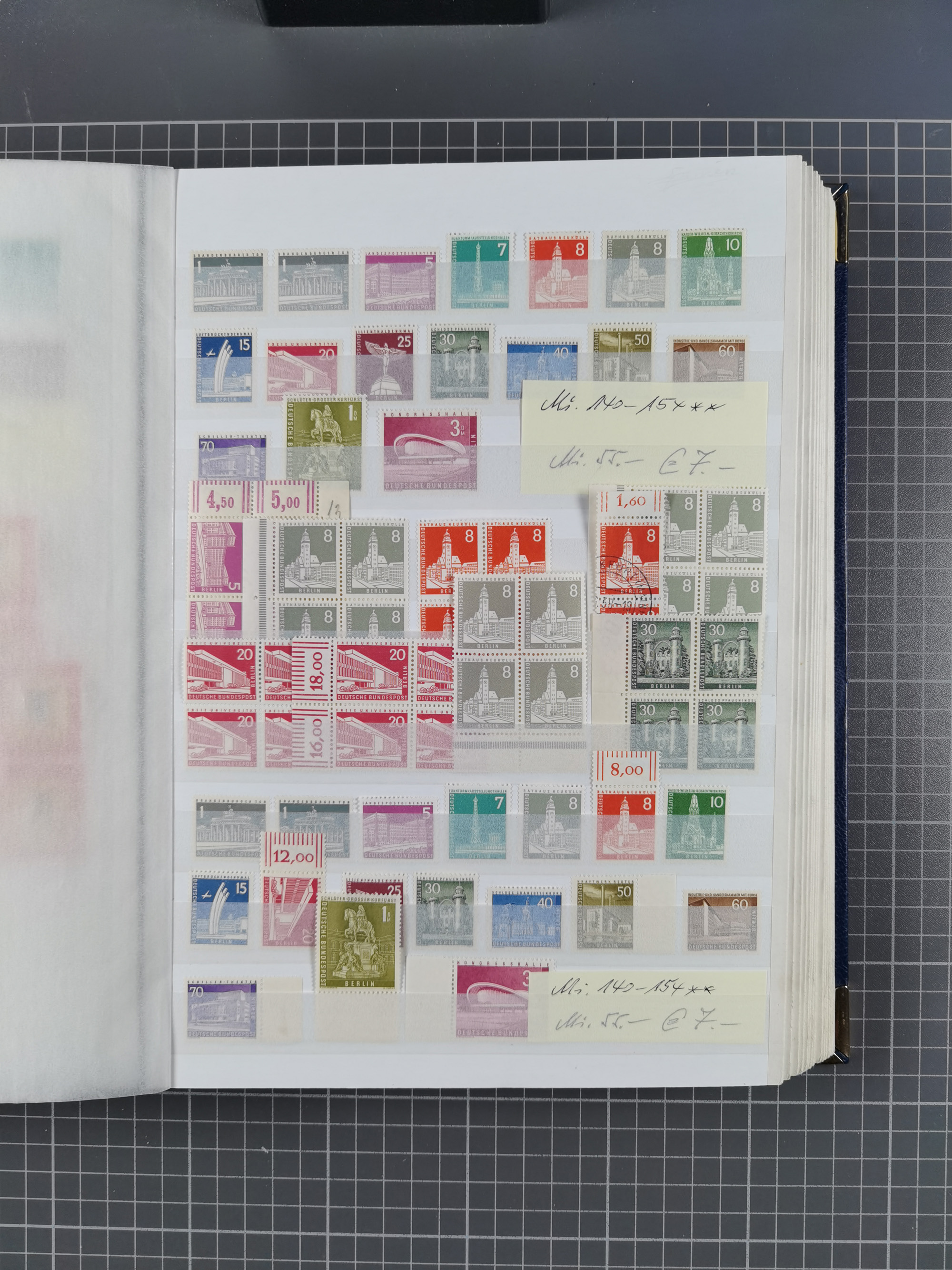 1923/60, umfangreicher ungebraucht/postfrischer und gestempelter Händler-Bestand ab Weimar bis Bund/Berlin und DDR mit besseren und kpl. Ausgaben auf Steckkarten auf großen Albenblättern. Dabei liegt der Schwerpunkt bei den Ausgaben nach 1945 mit u.a. Kontrollrat Block 12A/B mehrfach gestempelt, DDR mit u.a. 6x Mi.-Nr. 286-88 postfrisch und Blockausgaben ab Mi.-Nr. 7 meist mehrfach, Franz. Zone mit viel postfrischem Material sowie Berlin und Bund Anfangsausgaben bis ca. 10x pro Sorte. Erhaltung von etwas fehlerhaft bis einwandfrei, bessere zum Teil signiert