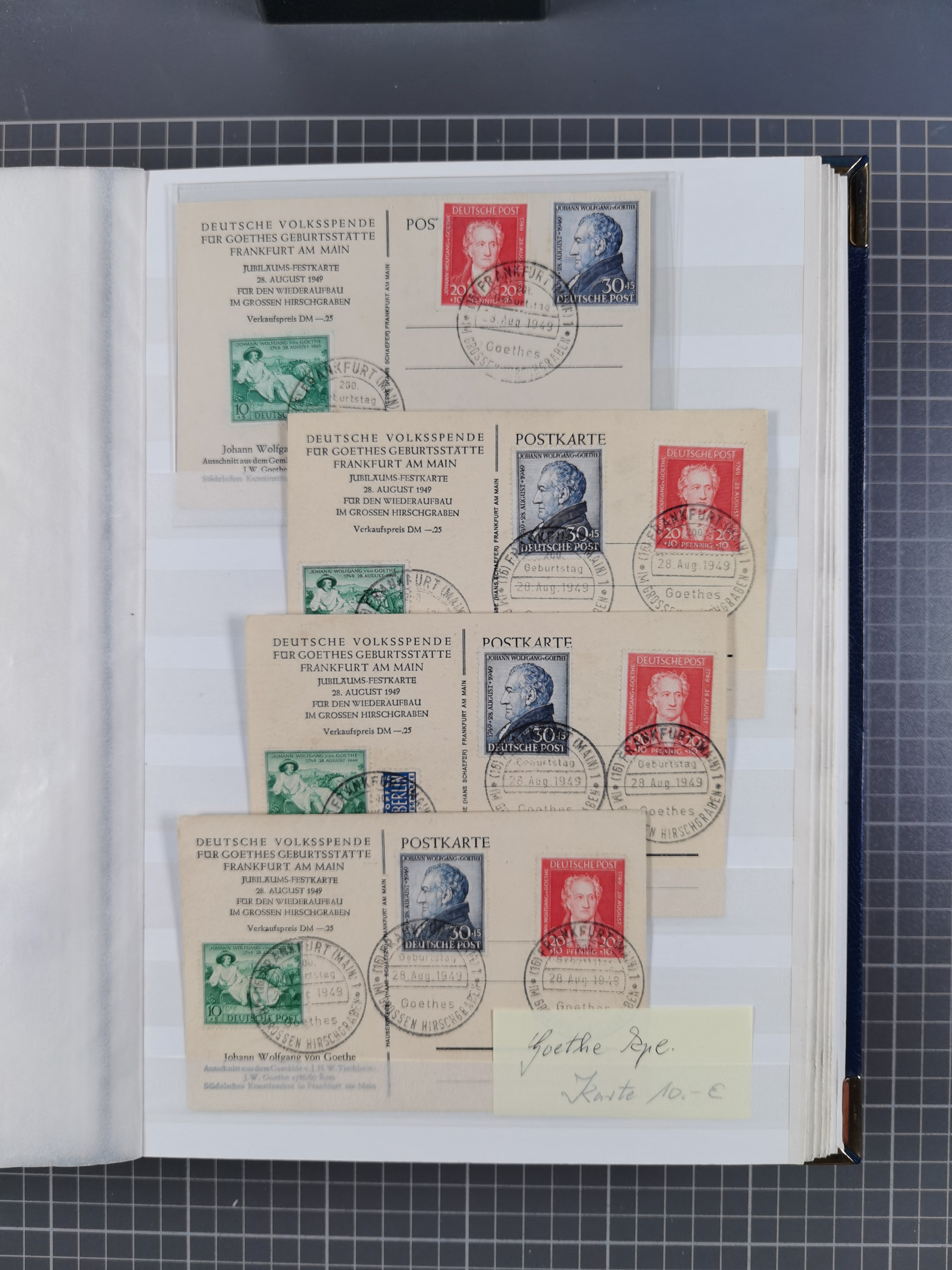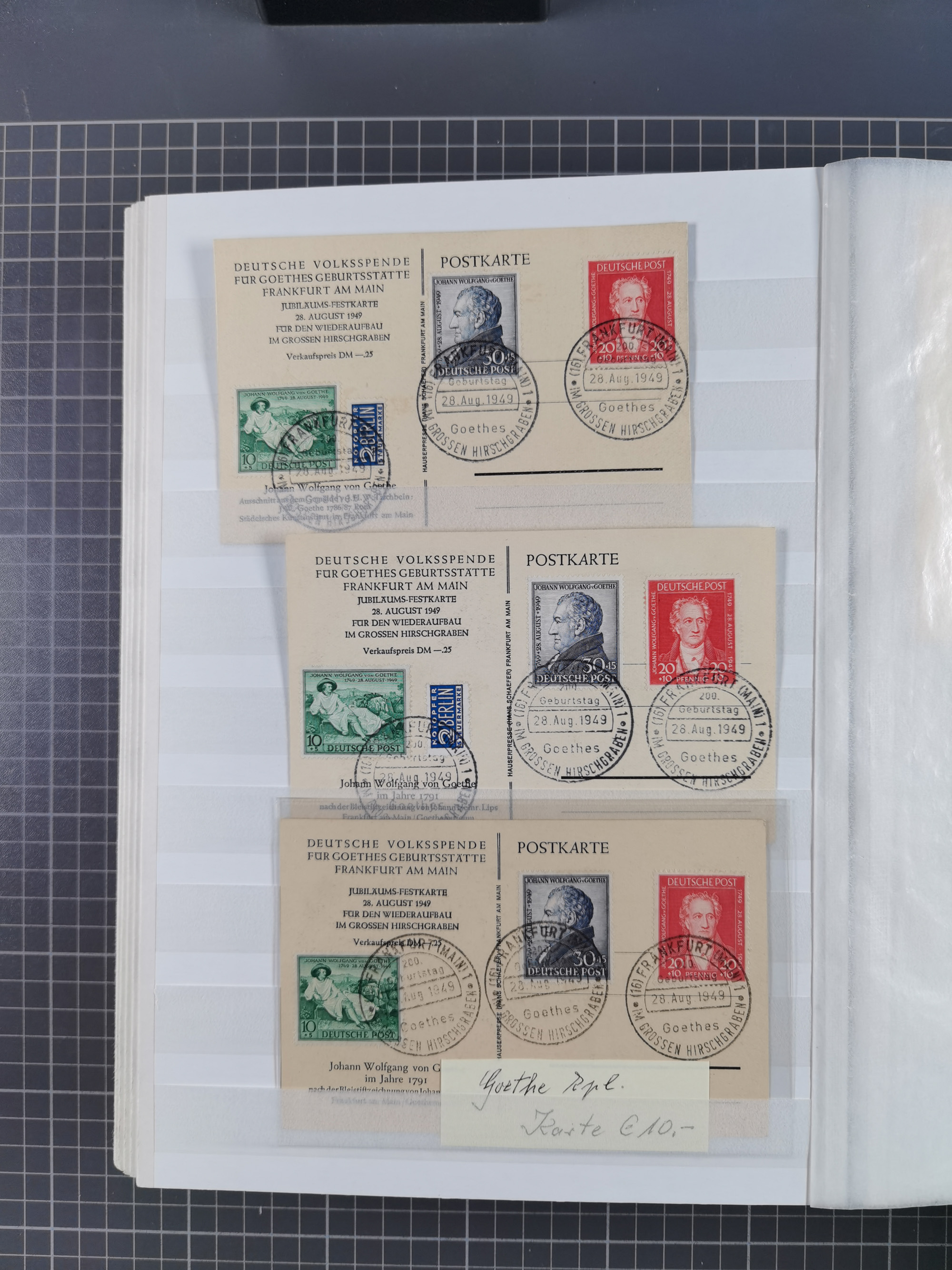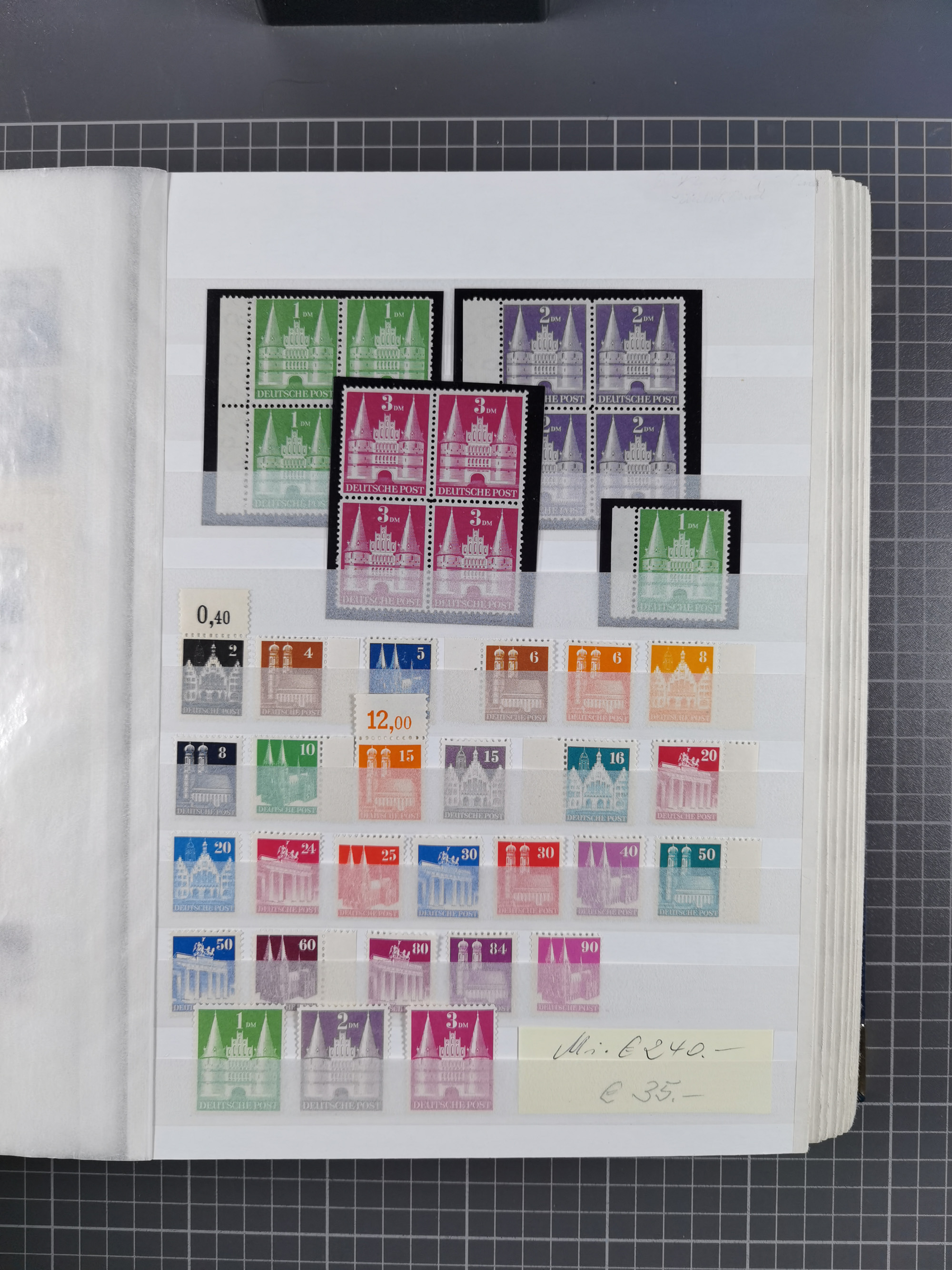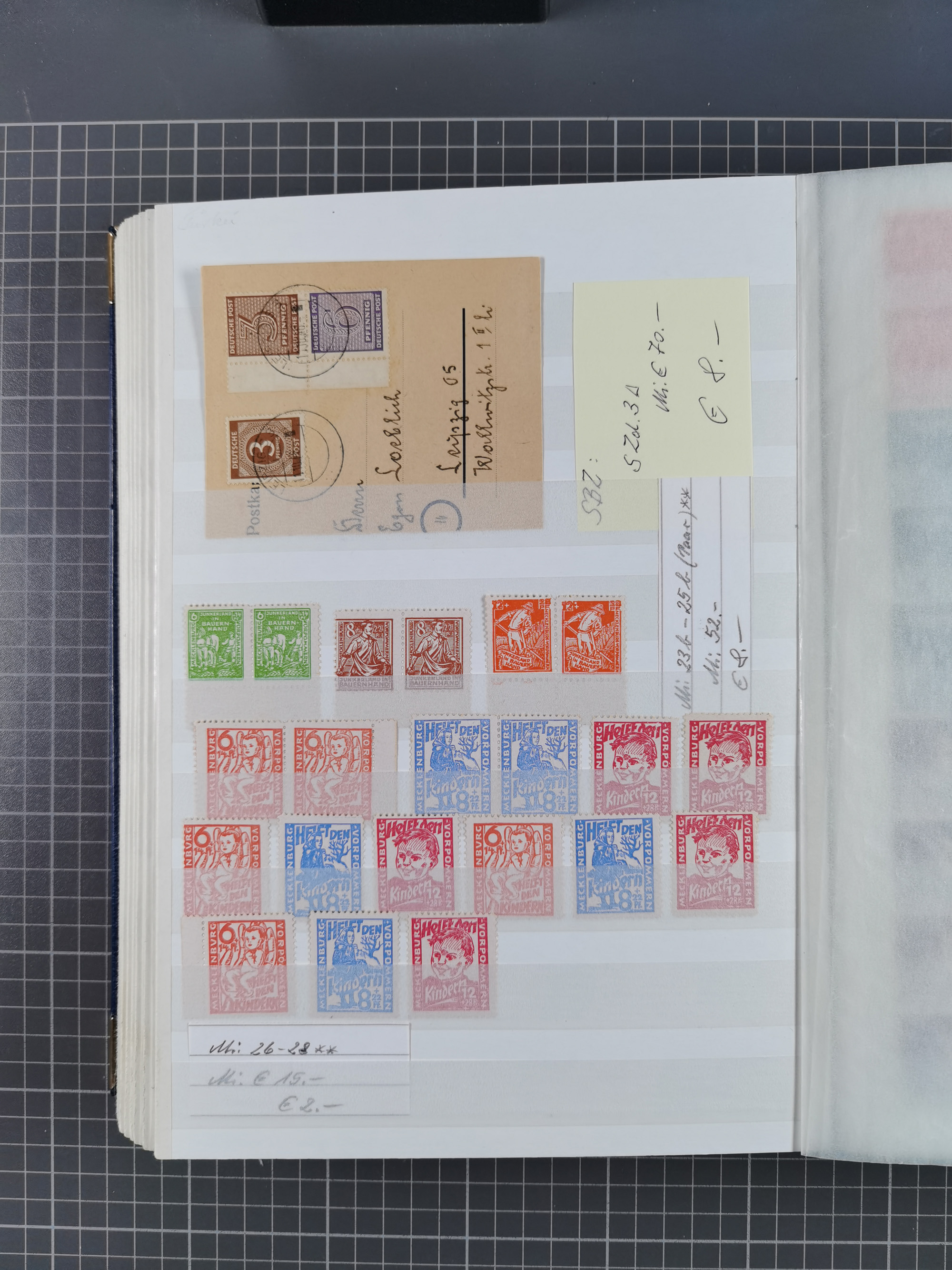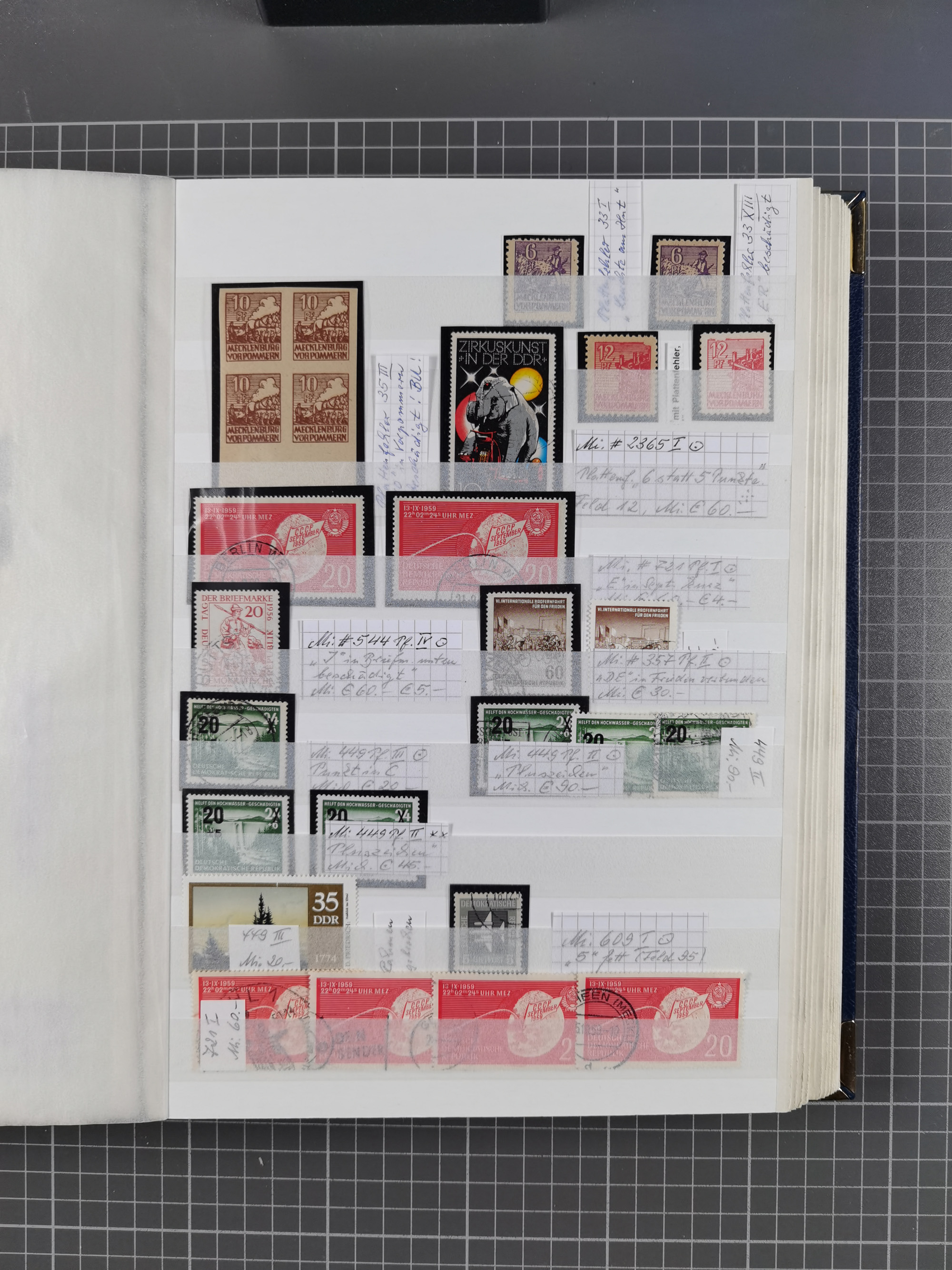 1923/60, umfangreicher ungebraucht/postfrischer und gestempelter Händler-Bestand ab Weimar bis Bund/Berlin und DDR mit besseren und kpl. Ausgaben auf Steckkarten auf großen Albenblättern. Dabei liegt der Schwerpunkt bei den Ausgaben nach 1945 mit u.a. Kontrollrat Block 12A/B mehrfach gestempelt, DDR mit u.a. 6x Mi.-Nr. 286-88 postfrisch und Blockausgaben ab Mi.-Nr. 7 meist mehrfach, Franz. Zone mit viel postfrischem Material sowie Berlin und Bund Anfangsausgaben bis ca. 10x pro Sorte. Erhaltung von etwas fehlerhaft bis einwandfrei, bessere zum Teil signiert