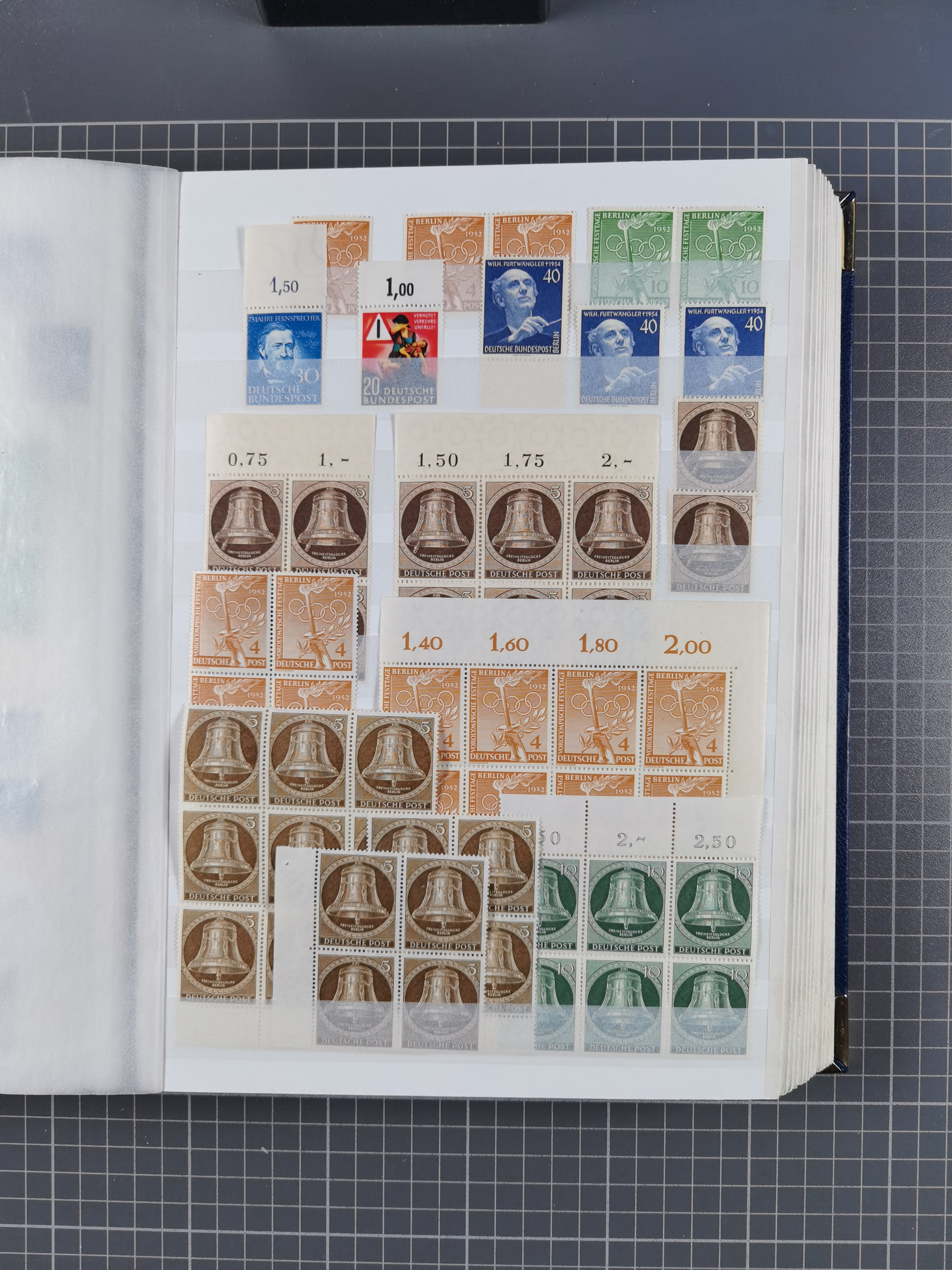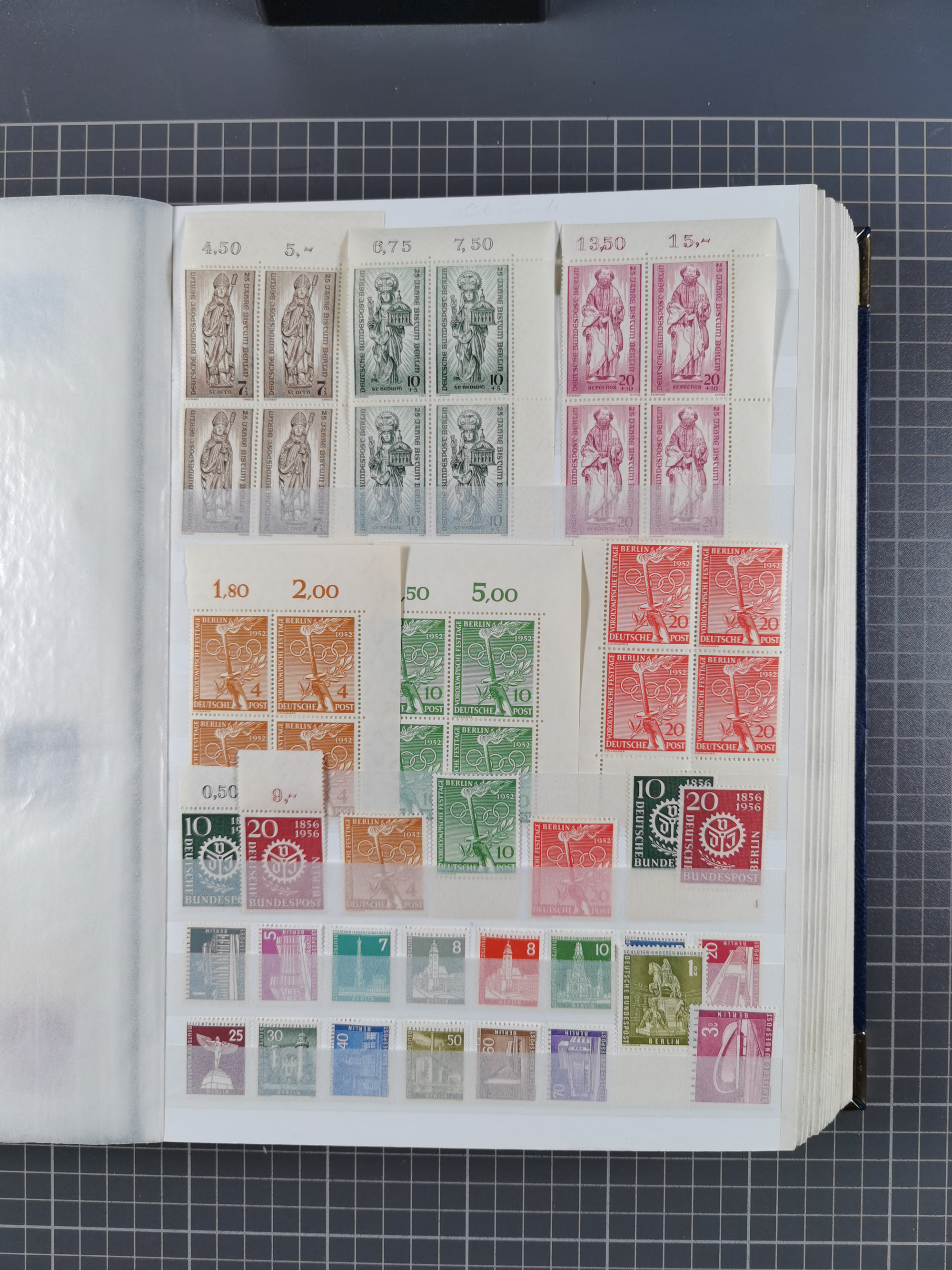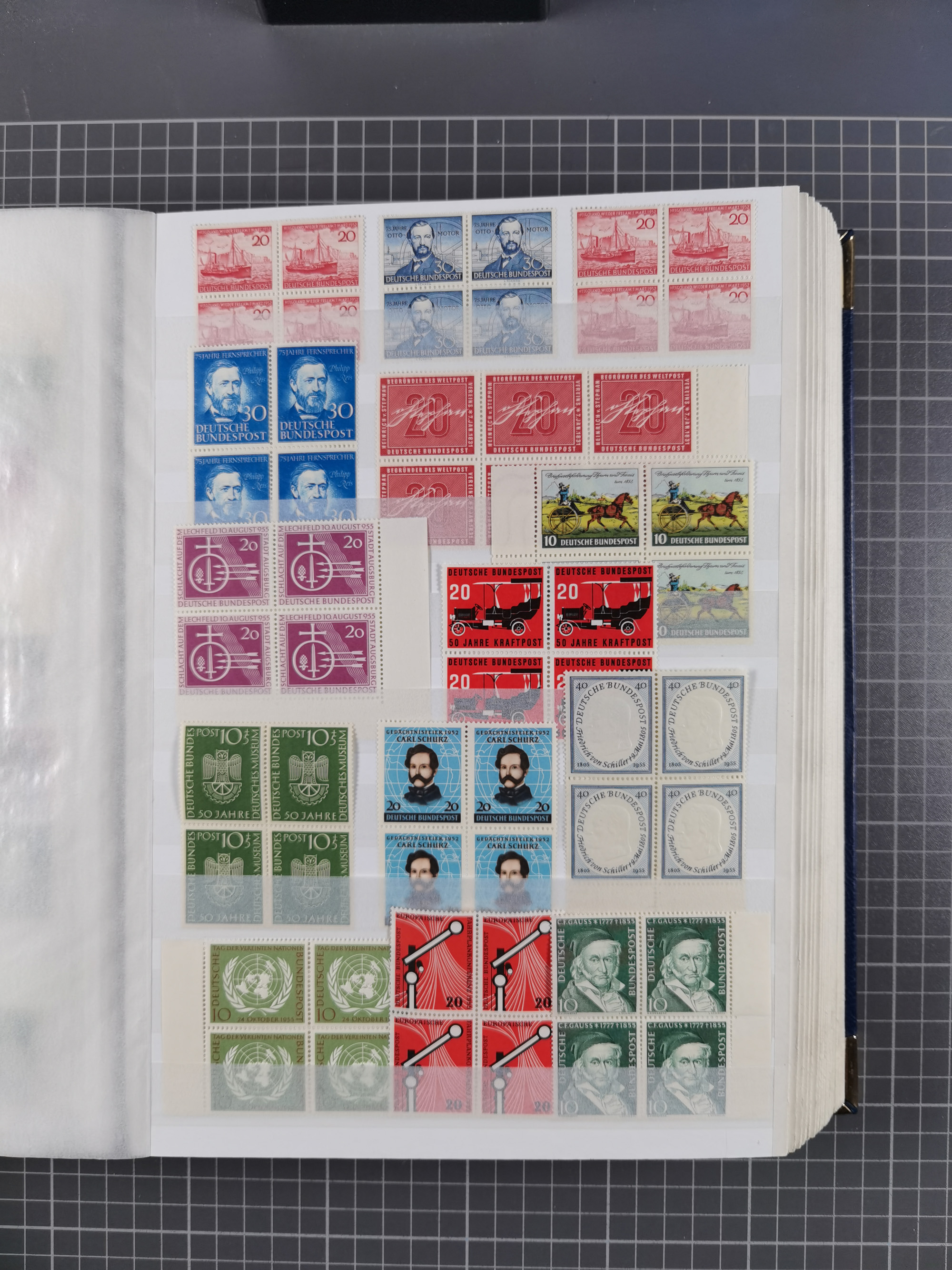 1939/2002, meist postfrischer und teils gestempelter Sammlungsbestand ab etwas Deutsches Reich, Saar, SBZ, Französische Zone mit Rot-Kreuz Block (2), Marken in Paaren oder 4er-Blocks, Bizone, Bauten kpl. (3) sowie 1-3 M. zusätzlich in 4er-Blocks, Goethe auf Karte (9), Band- und Netzaufdruck, Bl. 1 (2), über Berlin mit Schwarzaufdruck bis auf 1-2 M. kpl., teils sign., Glocken, Bauten, etc., ferner Bundesrepublik mit u.a. 114 FDC, 113-15 in Paaren, zusätzlich in postfrischen Eckr. 6er-Bl., teils mit PF, Posthorn mit u.a. 30 Pfg. postfrisch, Heuss inkl. Lumogen mehrfach, Marienkirche, NBA, Rontgen, Liebig, Bedeutende Deutsche kpl. in 4er-Bl., etliche weitere Sondermarken und Wohlfahrts-Ausgaben und Sätze, etc., viel mehrfach und mit Bogen- und Eckrand, später viel modernes Material sowie zwei Bogenmappen, gute Erhaltung, in 15 Alben