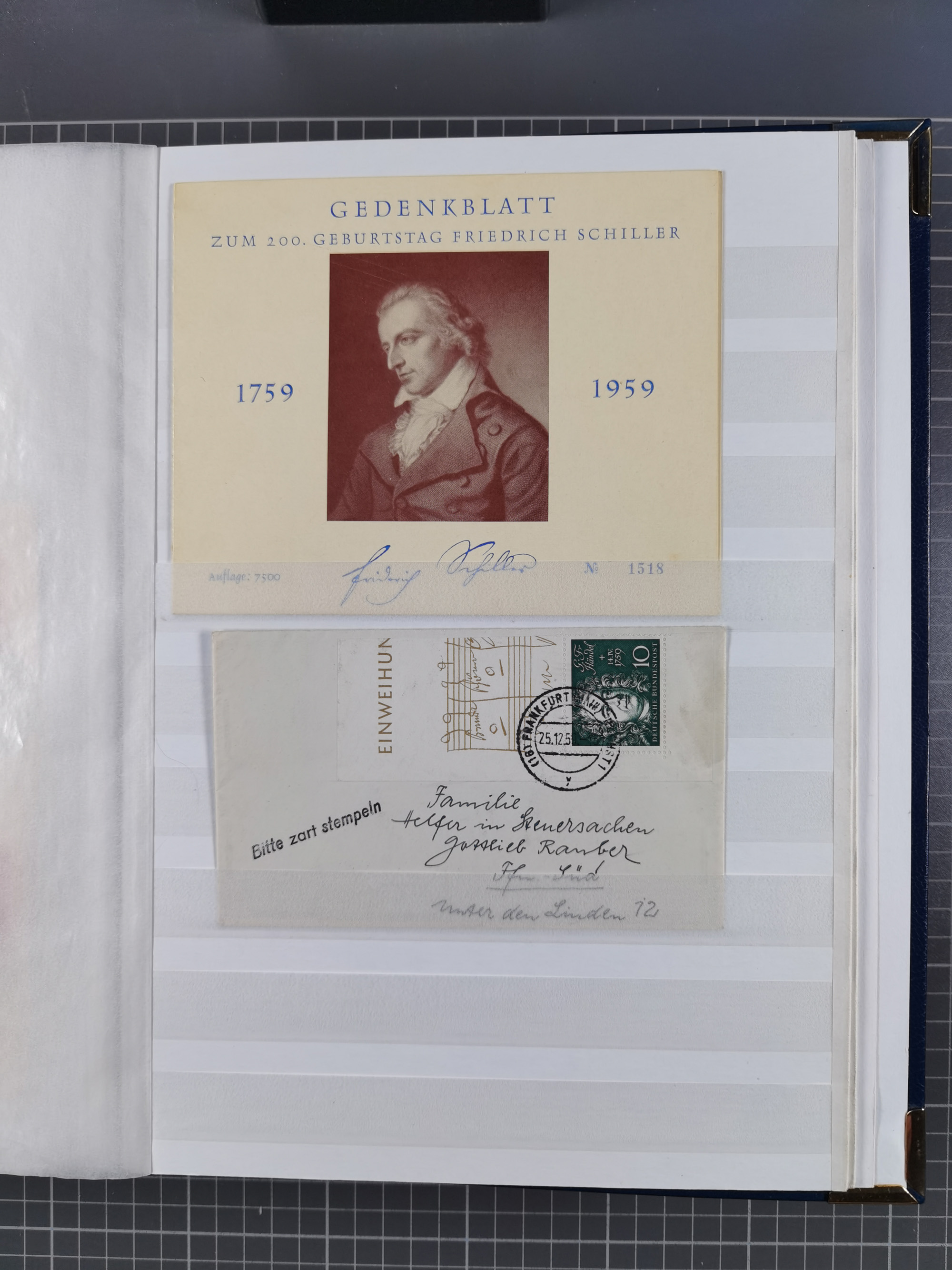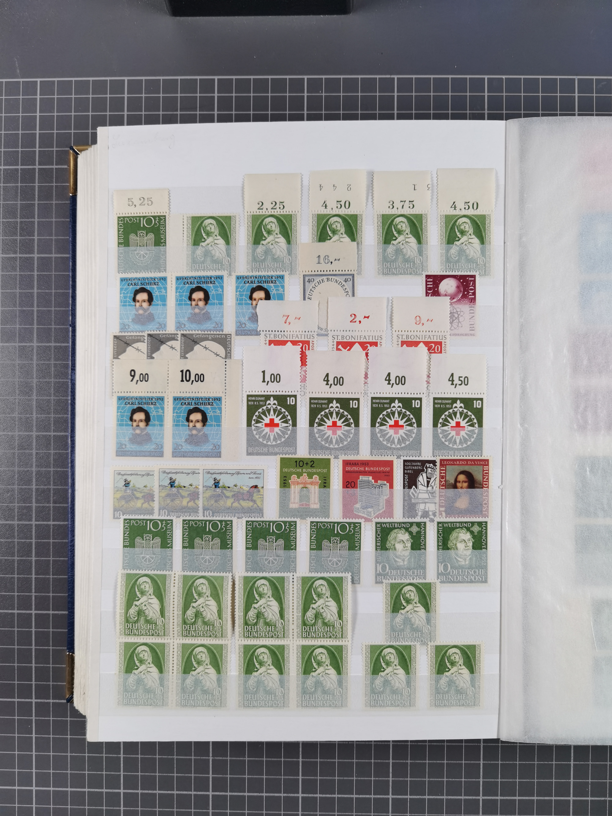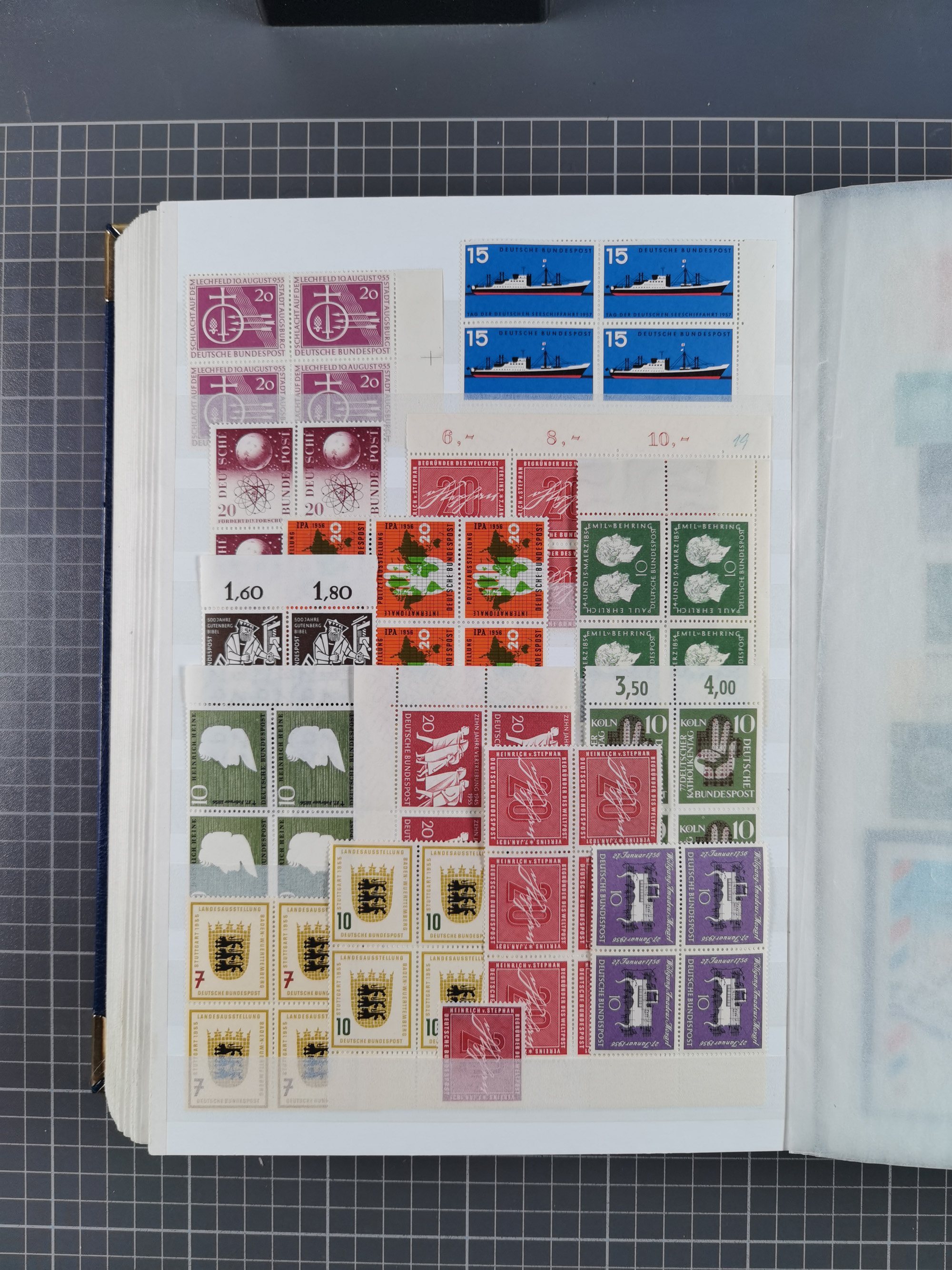1939/2002, meist postfrischer und teils gestempelter Sammlungsbestand ab etwas Deutsches Reich, Saar, SBZ, Französische Zone mit Rot-Kreuz Block (2), Marken in Paaren oder 4er-Blocks, Bizone, Bauten kpl. (3) sowie 1-3 M. zusätzlich in 4er-Blocks, Goethe auf Karte (9), Band- und Netzaufdruck, Bl. 1 (2), über Berlin mit Schwarzaufdruck bis auf 1-2 M. kpl., teils sign., Glocken, Bauten, etc., ferner Bundesrepublik mit u.a. 114 FDC, 113-15 in Paaren, zusätzlich in postfrischen Eckr. 6er-Bl., teils mit PF, Posthorn mit u.a. 30 Pfg. postfrisch, Heuss inkl. Lumogen mehrfach, Marienkirche, NBA, Rontgen, Liebig, Bedeutende Deutsche kpl. in 4er-Bl., etliche weitere Sondermarken und Wohlfahrts-Ausgaben und Sätze, etc., viel mehrfach und mit Bogen- und Eckrand, später viel modernes Material sowie zwei Bogenmappen, gute Erhaltung, in 15 Alben