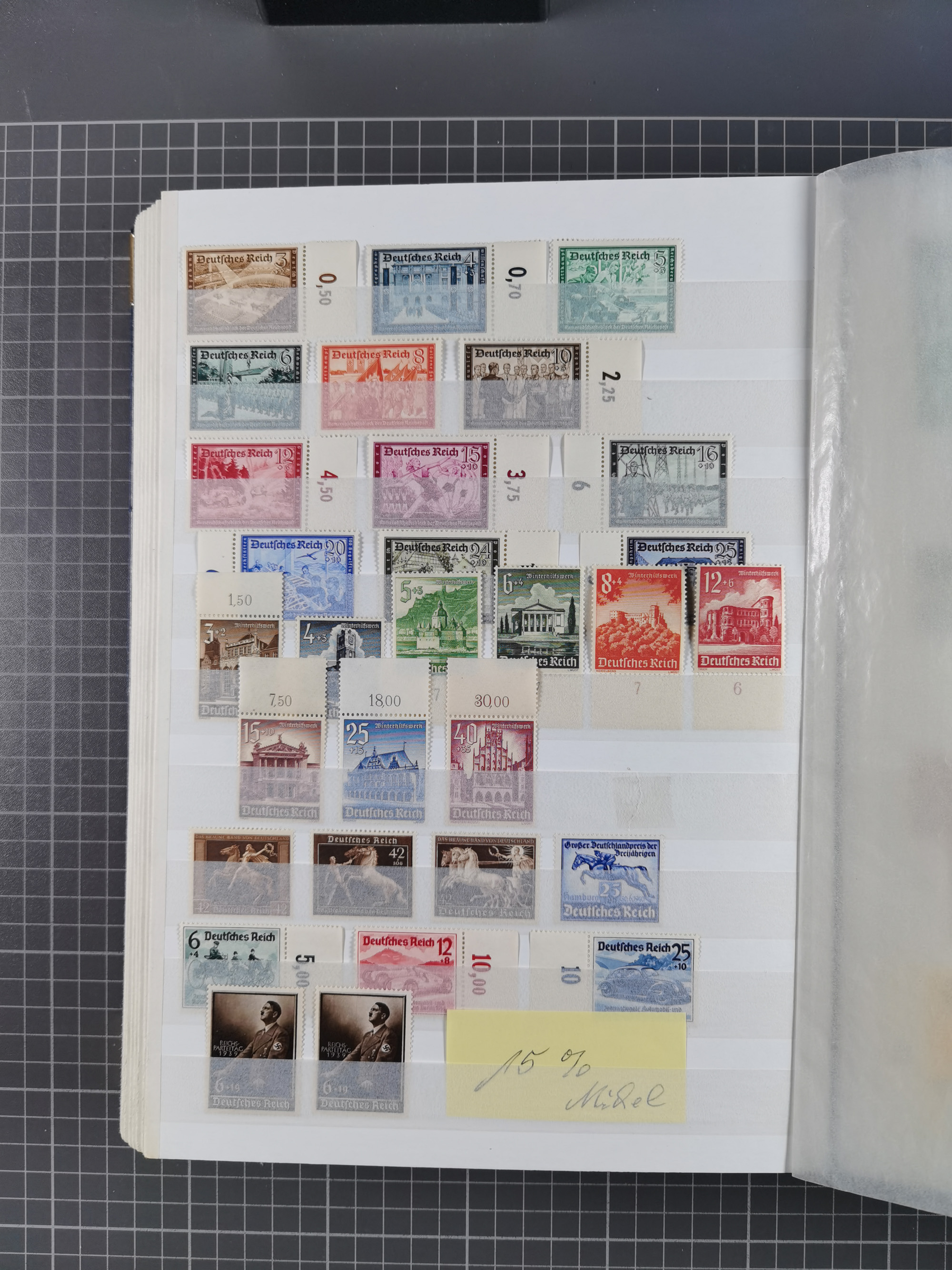 1932/44, meist gestempelte, in den Hauptnummern fast komplette Sammlung Deutsches Reich und Besetzungsausgaben, dabei bessere Werte, Randstücke und Zusammendrucke, aufgelockert durch etliche R-Briefe und Blankoumschläge mit Sonderstempeln, dabei u.a. Mi.-Nr. 628-31 auf Zeppelinbrief mit Fahrt zur Leipziger Messe, Blocks 4-11, Bl. 11 mit SSt. “MARSCHSTAFFEL ZUM RPT DER NSDAP GAU SACHSEN”, ferner Dienst- und Feldpostmarken mit u.a. Mi.-Nr. 2 auf Feldpostadresse, Böhmen und Mähren mit Zusammendrucken, Mi.-Nr. 29 auf NSDAP-Brief mit rotem V-Werbestempel “OLMÜTZ -8.VIII.41”, rotem L2 und blauem L1 “Victoria siegt…” und rückseitiger Vignette, etc., meist gute Erhaltung, im KaBe-Album
