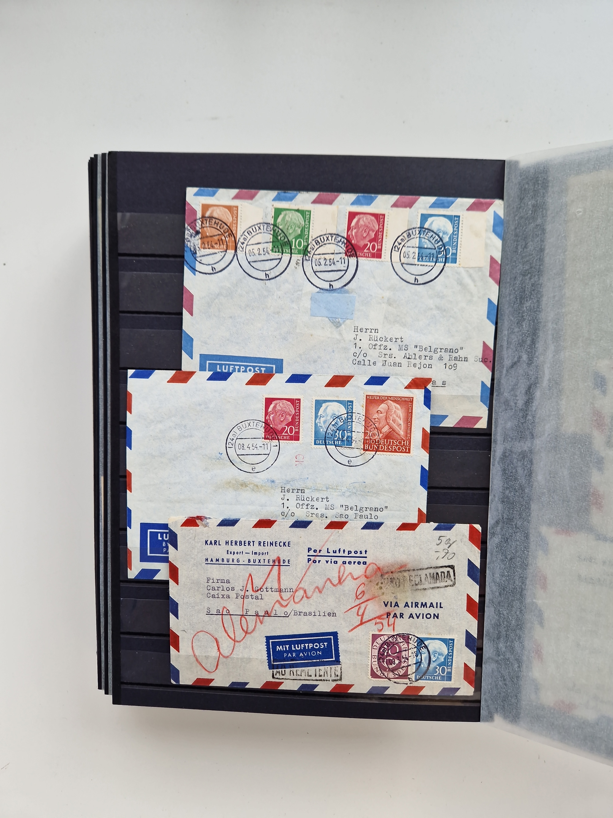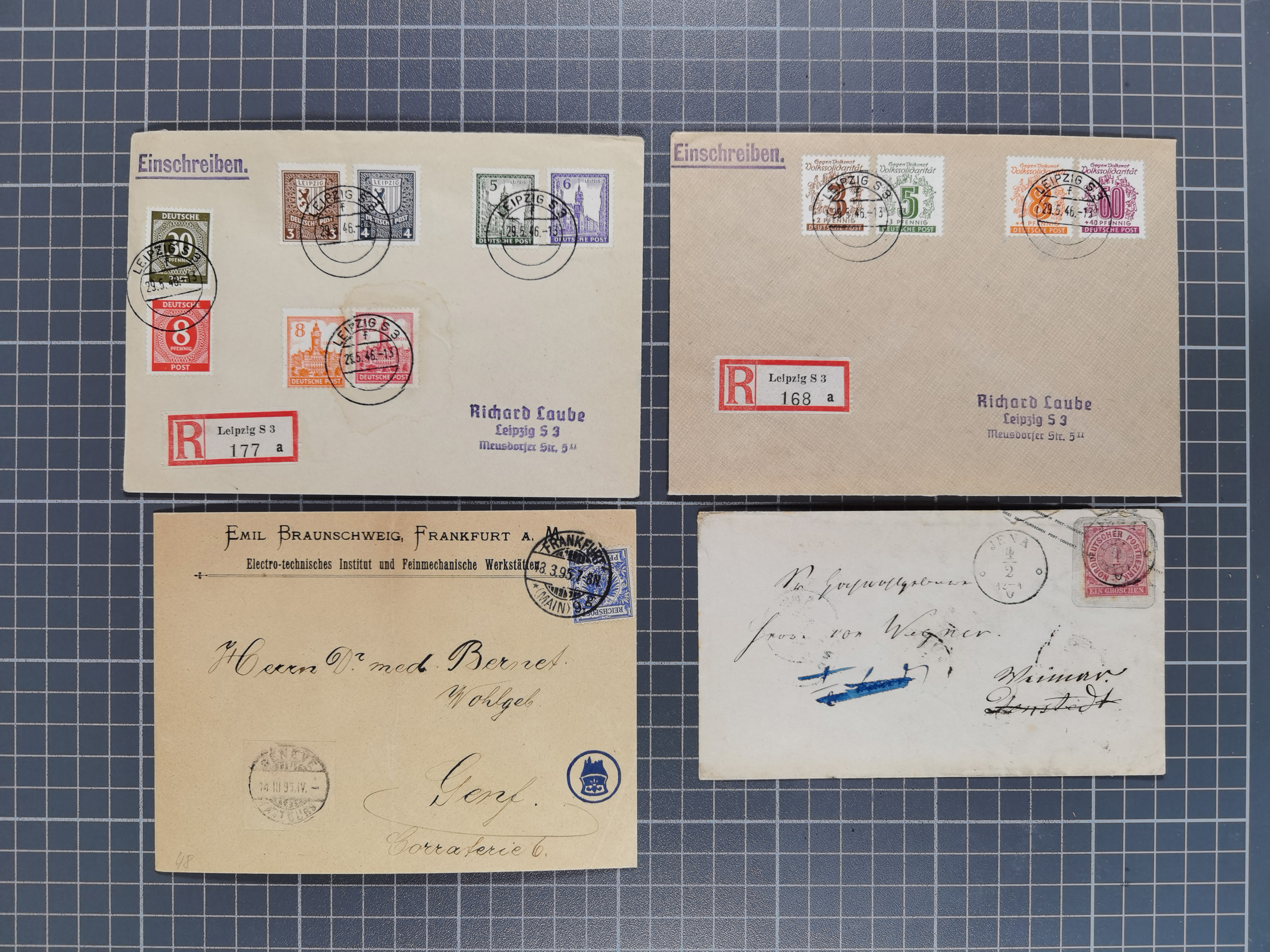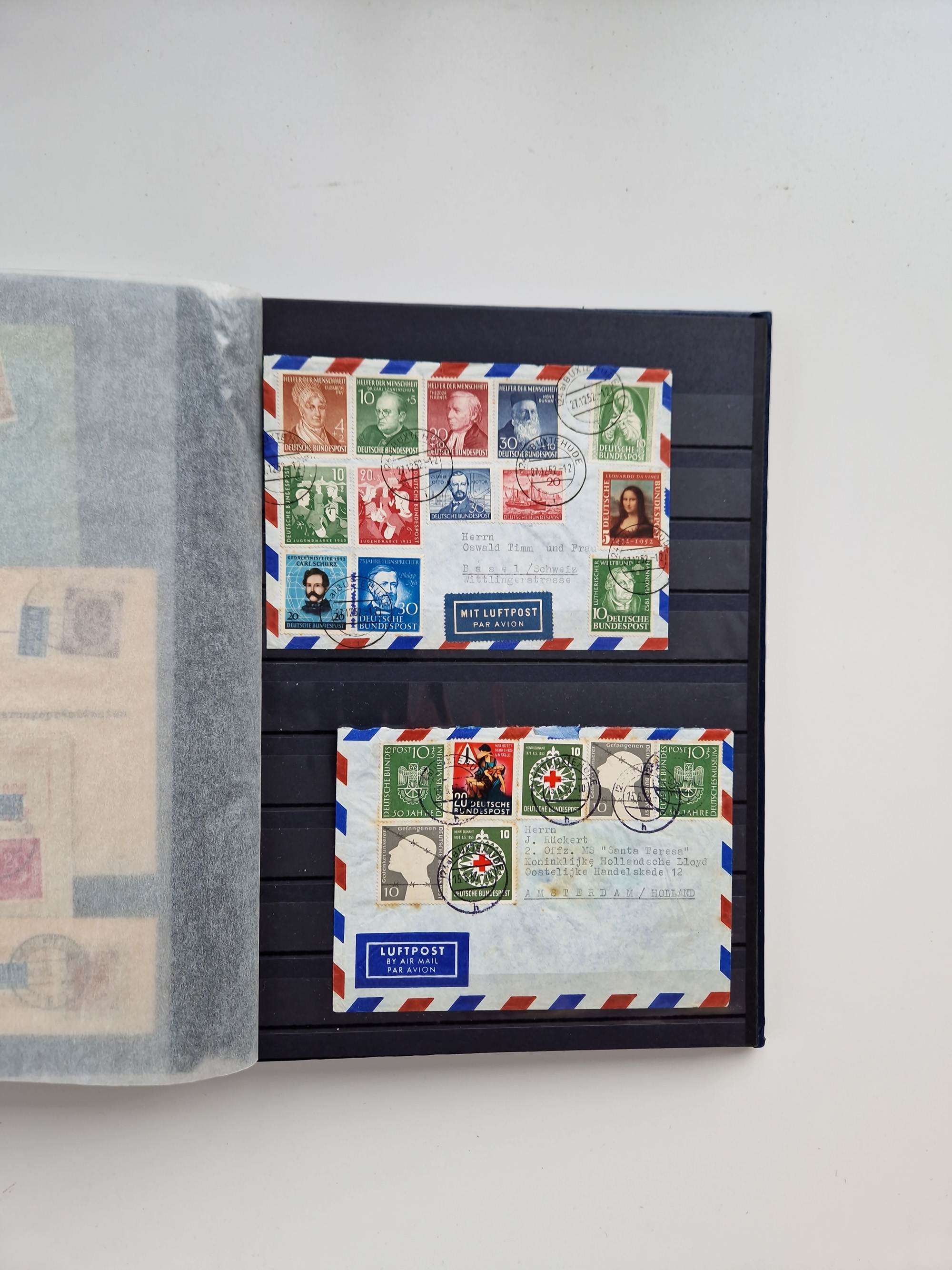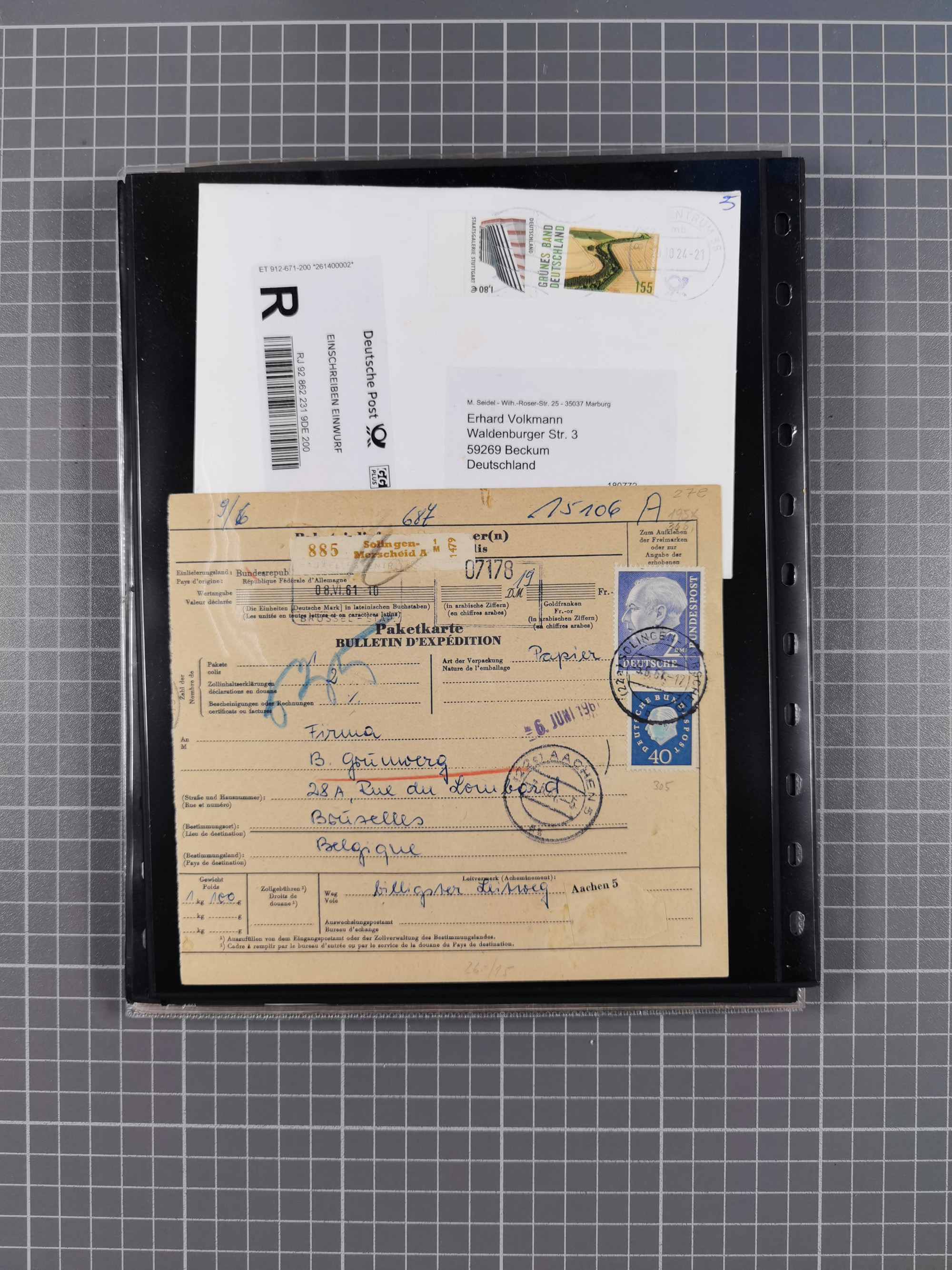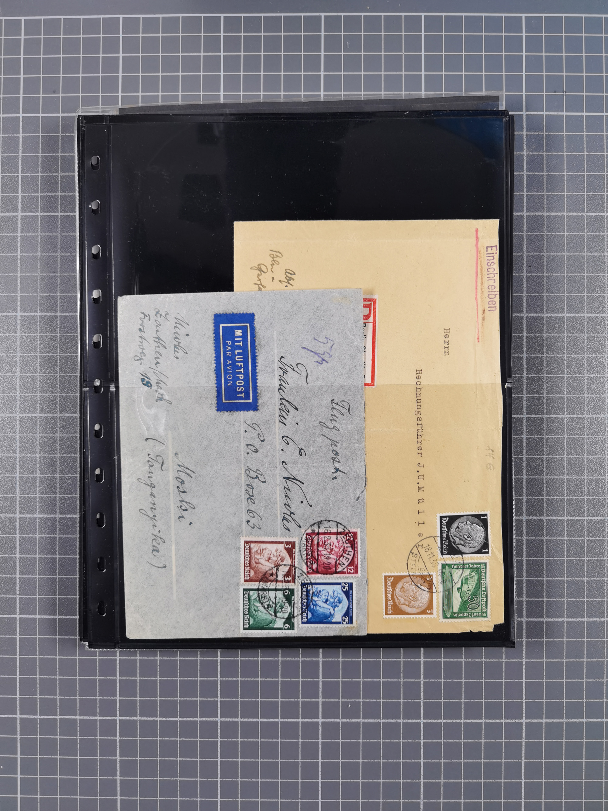 1865/1950 (ca.), Album mit 122 hochwertigen Belegen, diese einzeln vom Einlieferer beschrieben und nach Michel bewertet 15.000 €. Dazu ein Karton mit über 170 Briefen, Karten und Ganzsachen, dabei etliche interessante Belege, meist gute Erhaltung
