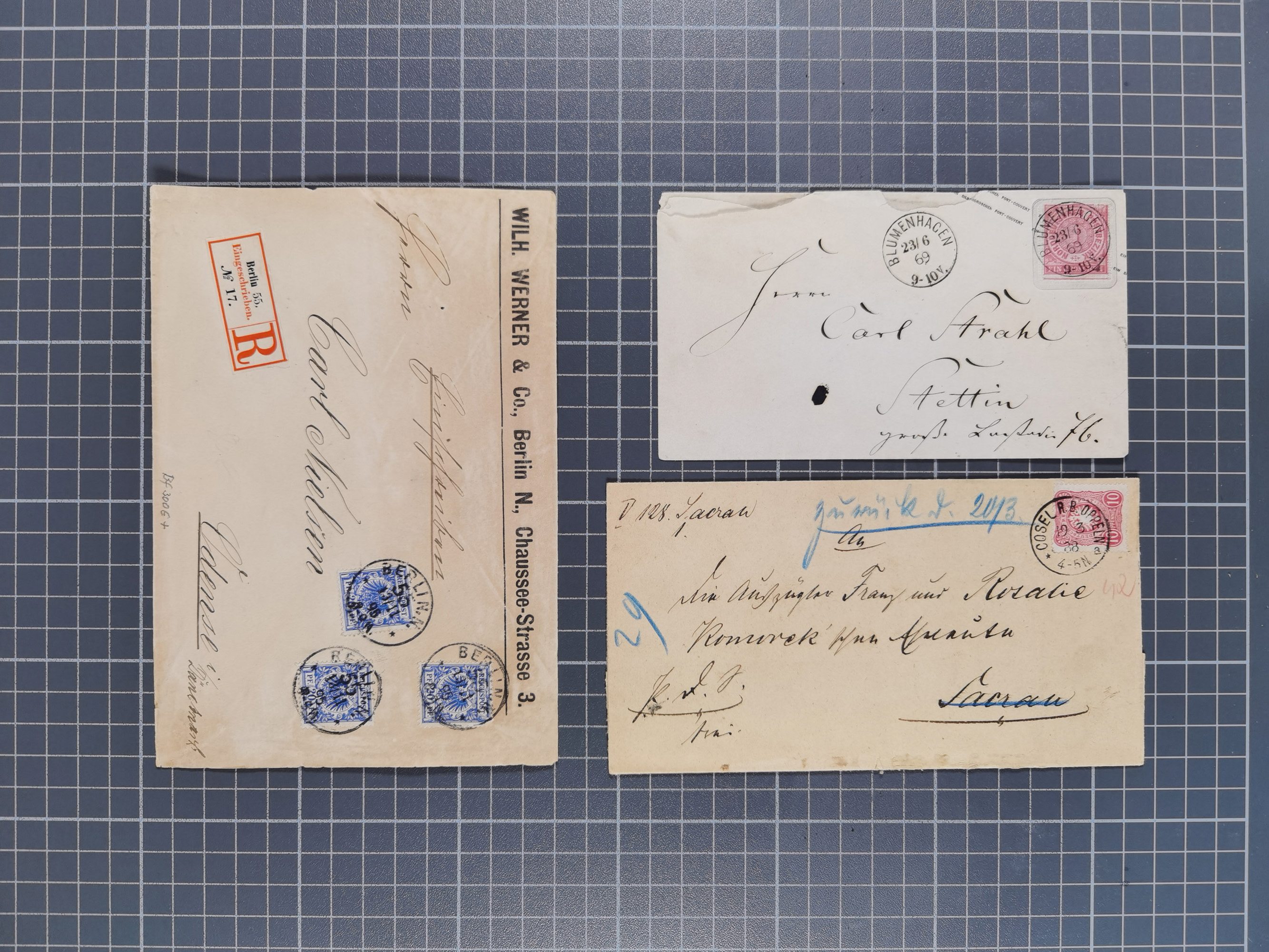 Berlin: 1817/1904,Stempel-Sammlung ab Vorphila mit ca. 280 Briefen, Karten und Ganzsachen mit vielen verschiedenen Stempeln inkl. Bahnpost- und Hufeisenstempeln mit besseren, Schwerpunkt ab Preußen bis ca. 1875. Dabei auch u.a. Nummernstempel “106” auf Brief, “BERLIN P.E.7 F. ” auf Paketbegleitbrief, Rahmenstempel “BERLIN CABINETS-EXPEDITION” auf Brief 1871 und Destinationen ab Preußen mit u.a. Italien, Kanada, Polen und USA. Meist klare Abschläge