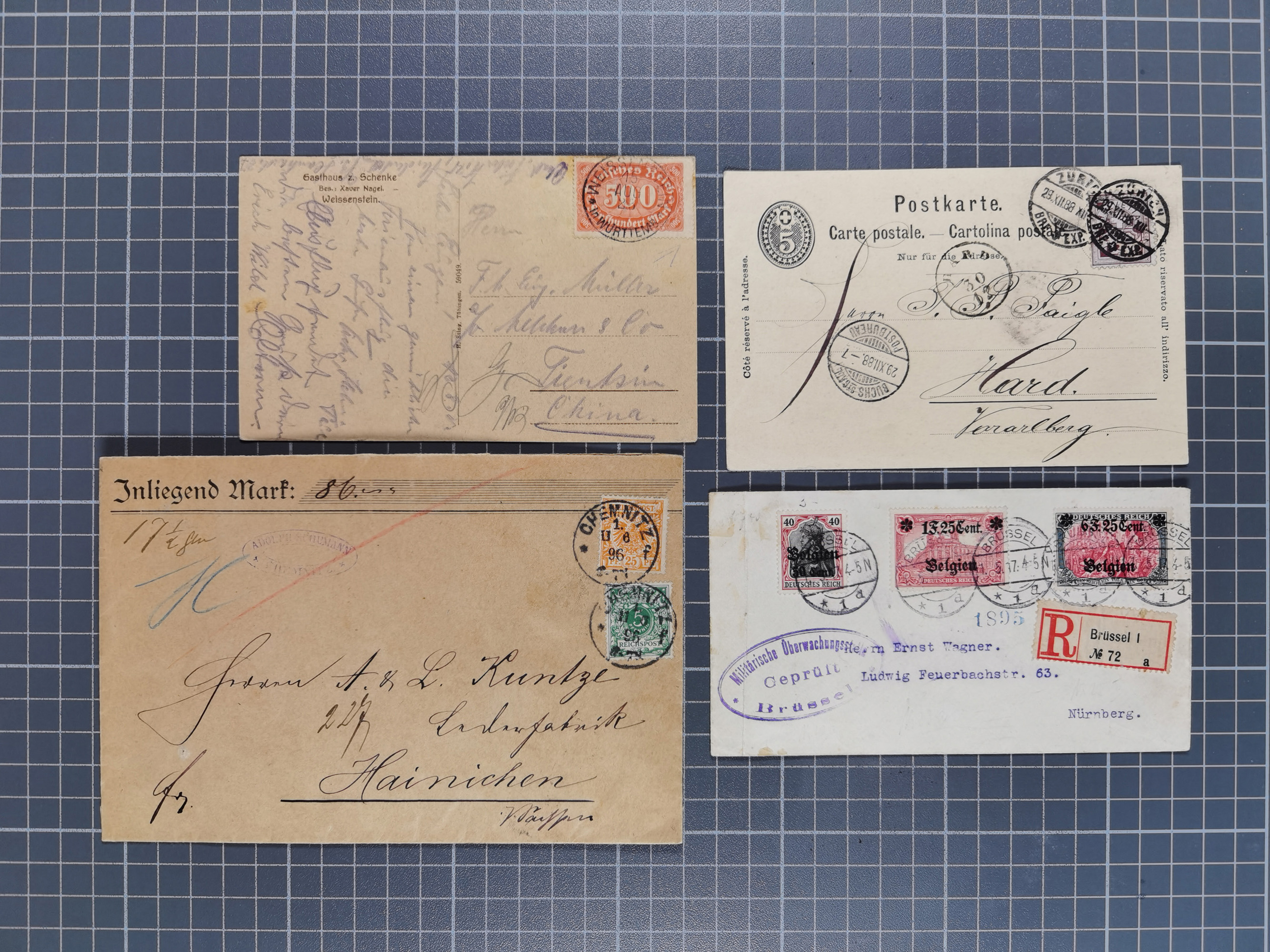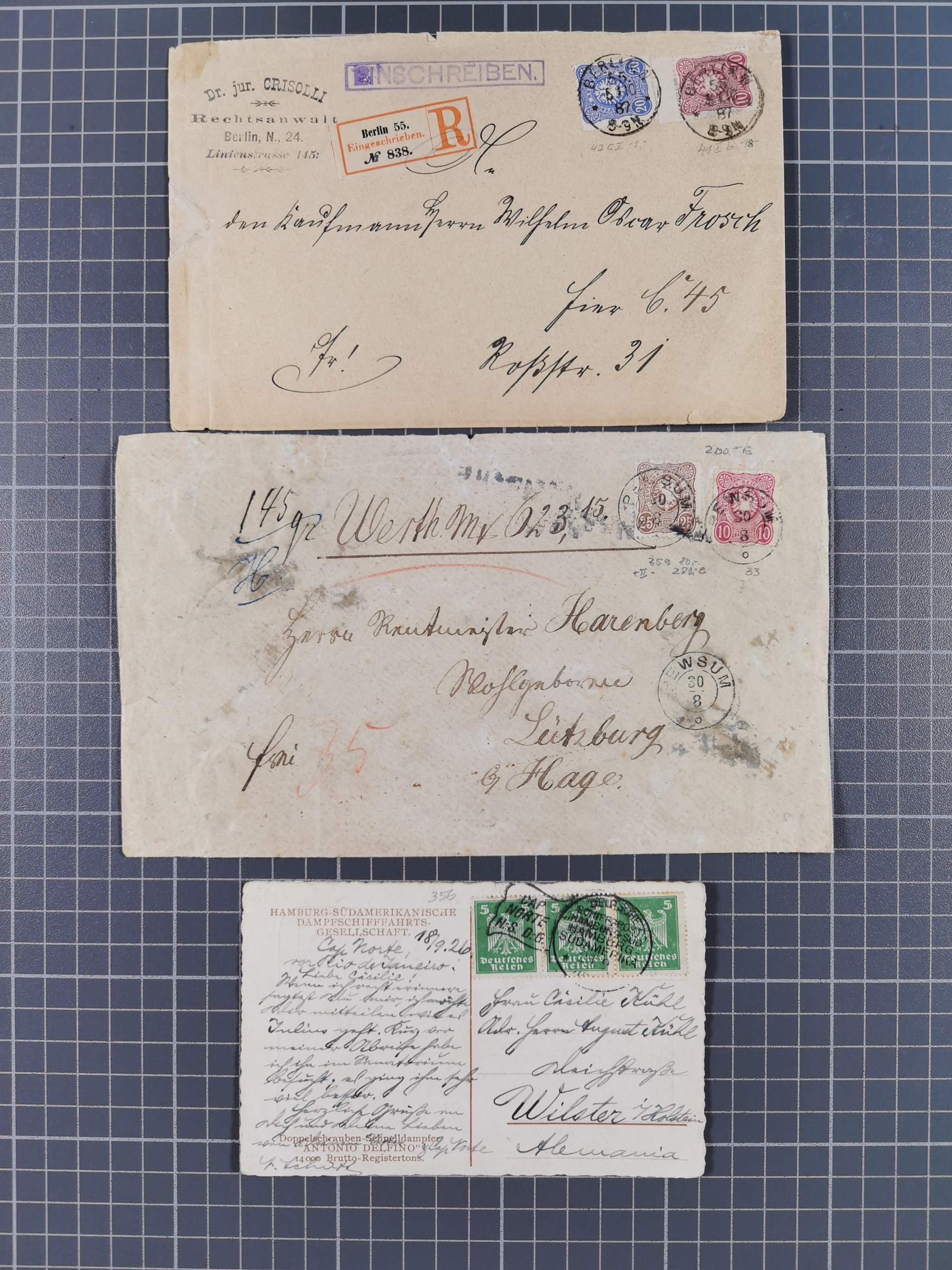 1826/1937 (ca.), umfangreiche Partie mit rund 40 Belegen, inkl. Deutsche Kolonie und WWI Besetzungen, interessante Einzel-, Mehrfach- und Mischfrankaturen, dabei u.a. Brustschild + Frankreich auf Faltbrief, Teil Stempel mit blauem “AUS DAENEMARK”, “LINIE HAMBURG WESTAFRIKA”, “LOME”, etc., etwas unterschiedlich, meist in guter Gesamterhaltung