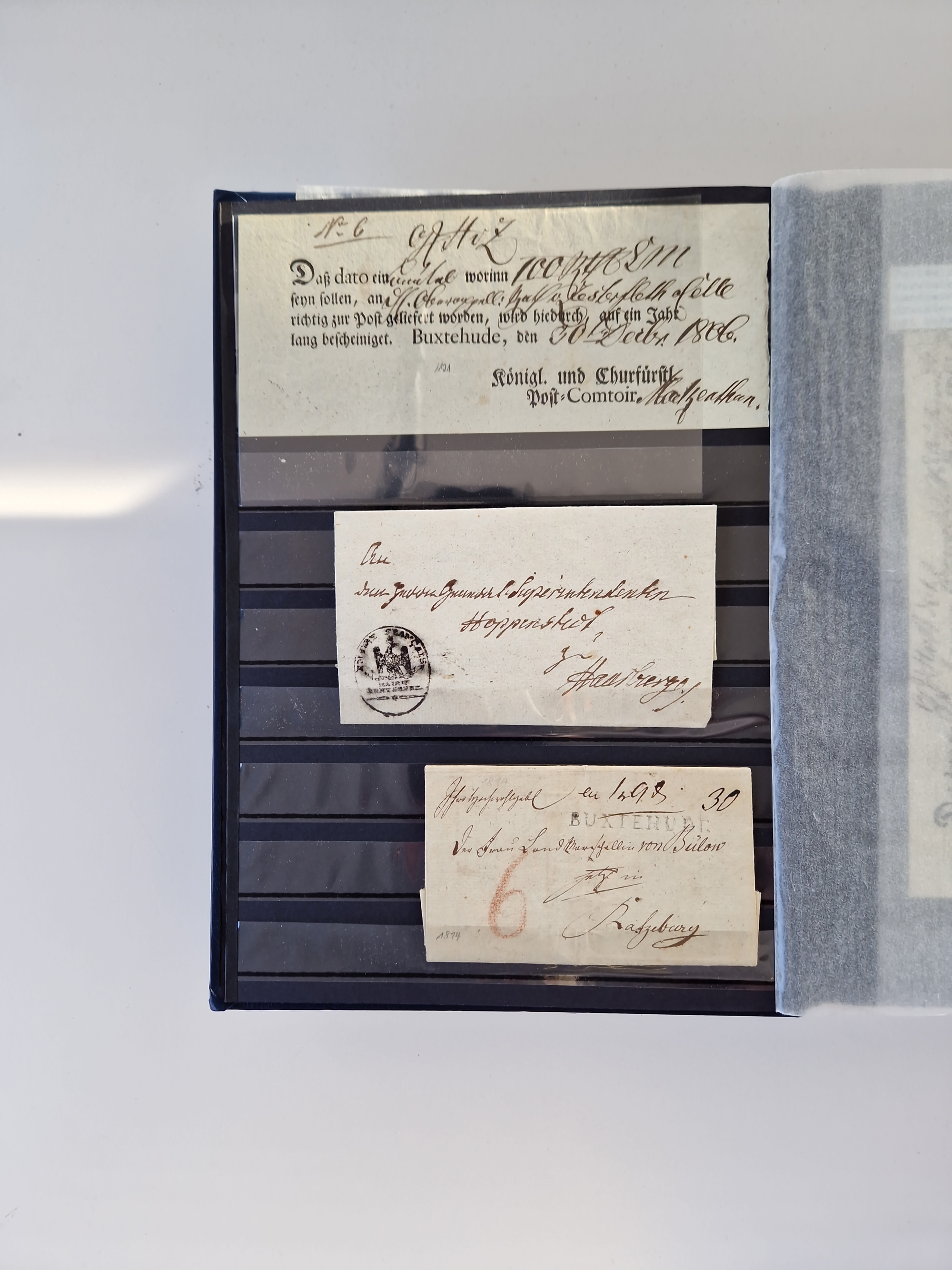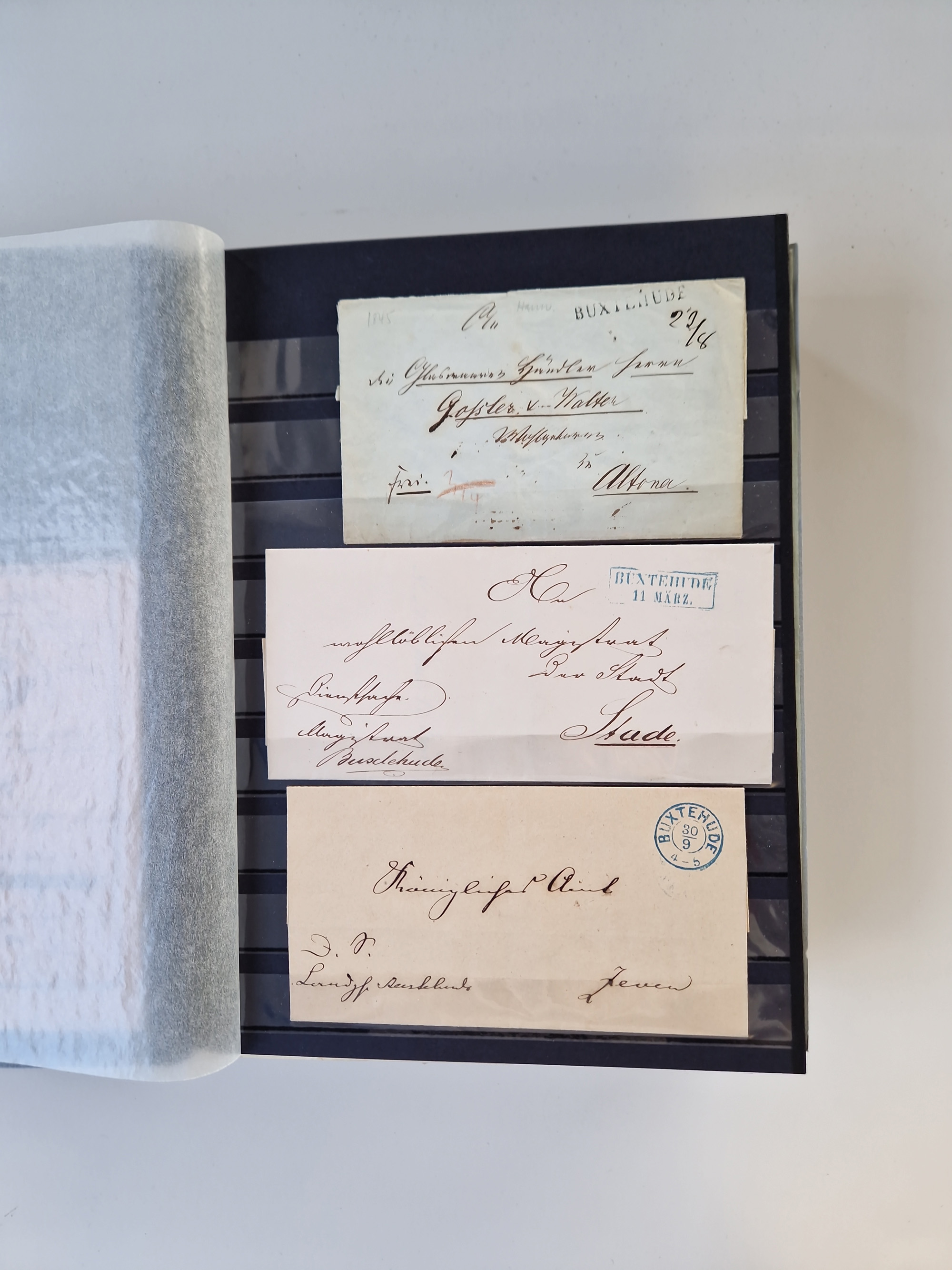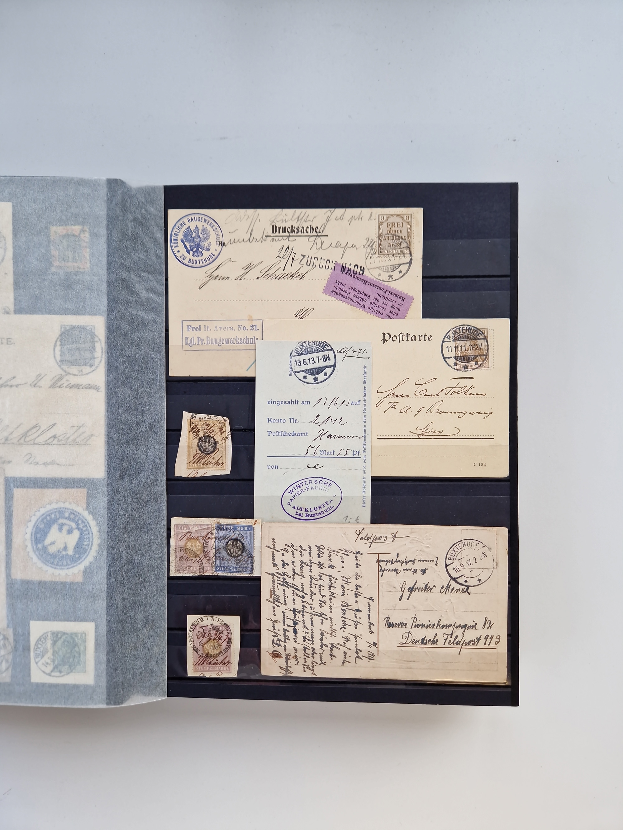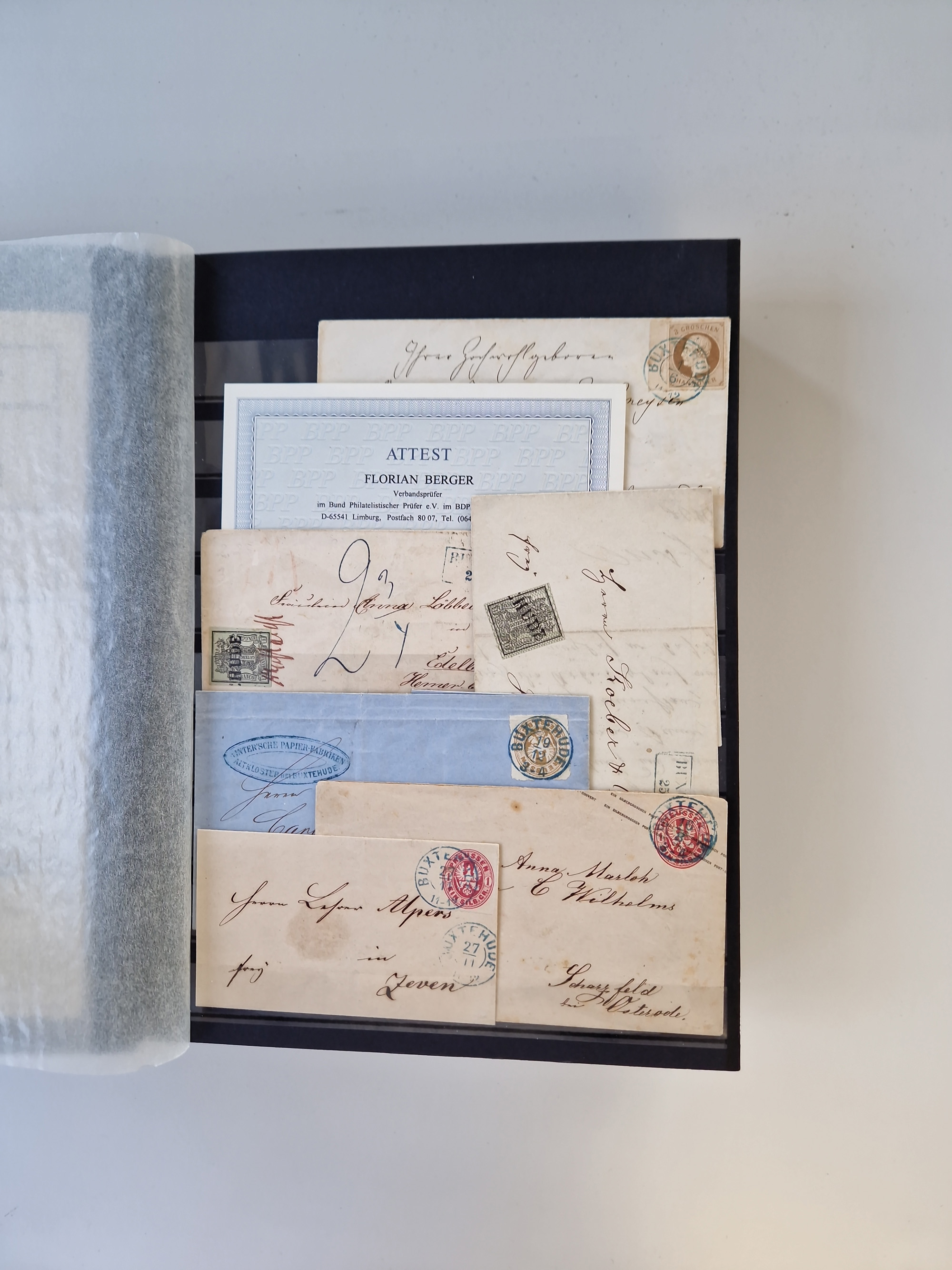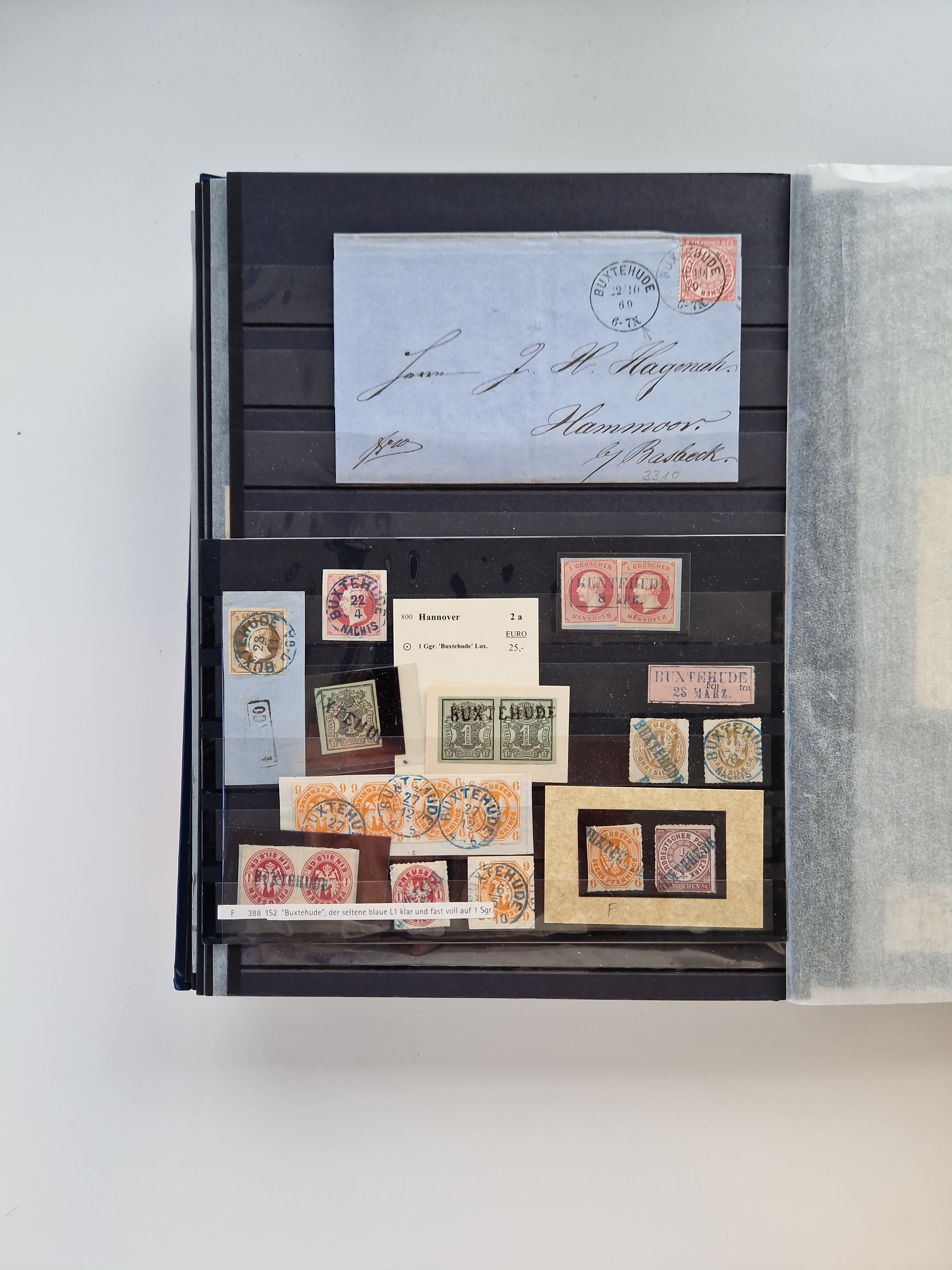Buxtehude: 1787/2020, umfangreiche Sammlung ab Vorphila mit u.a. frühem Postschein von 1797, Botenbrief 1813 mit Dienstsiegel, Personenschein 1854 mit blauem L1 “BUXTEHUDE”, Hannover Mi.-Nr. 2a mit Vorausentwertung “(BUXT)EHUDE” und übergehendem handschriftlichem Vermerk “reicht nicht” auf Damenkuvert im Postverein (FA Berger BPP), Deutsches Reich ab Brustschild mit interessanten Frankaturen, Zonen-Ausgaben mit Paketkarten und Auslandsbriefe und Bund mit Anfangsausgaben und Luftpostbriefen sowie geschätzt weit über 1000 moderne Briefe inkl. sehr vieler Belege mit Freistempeln, in 16 Alben