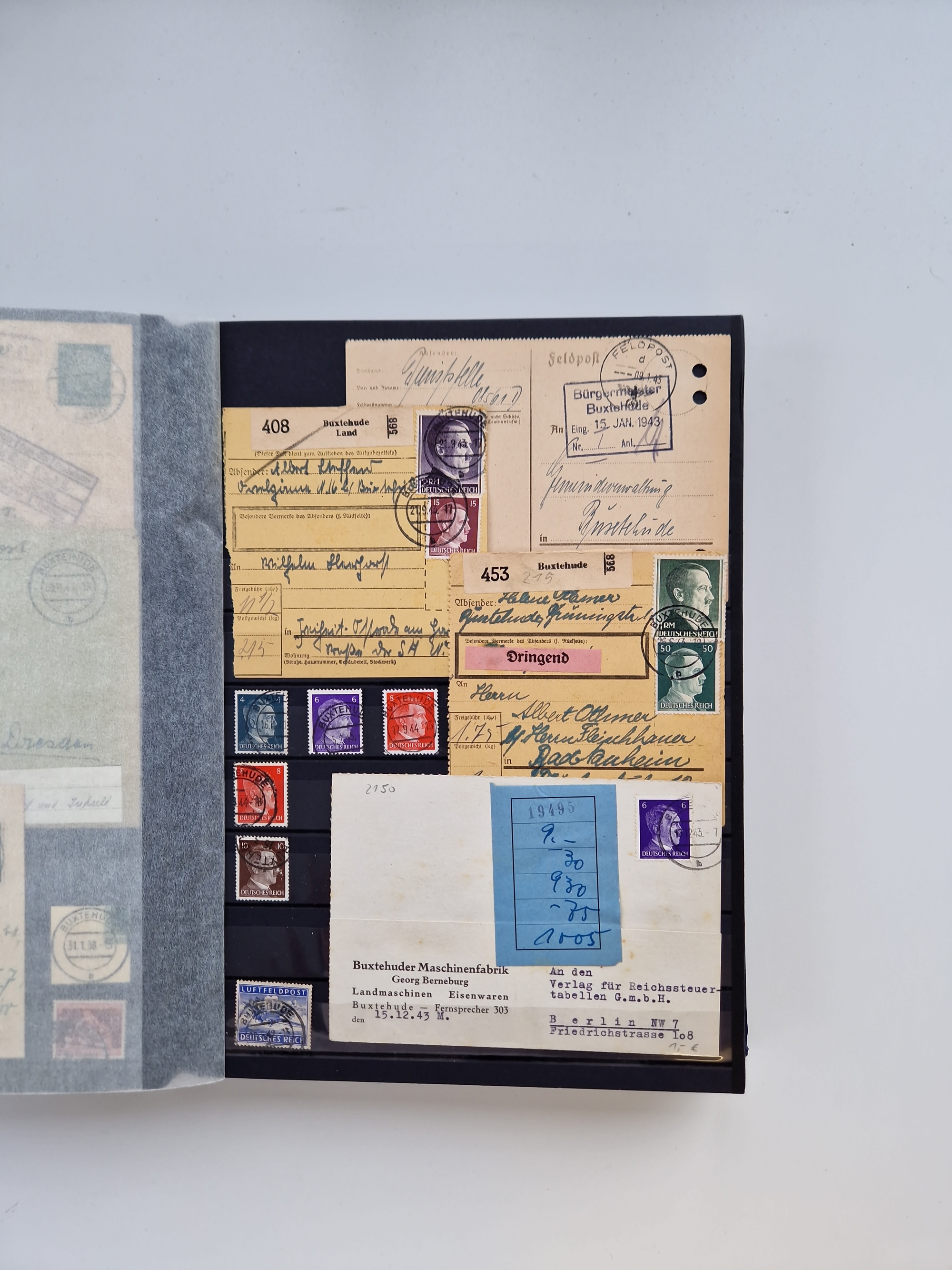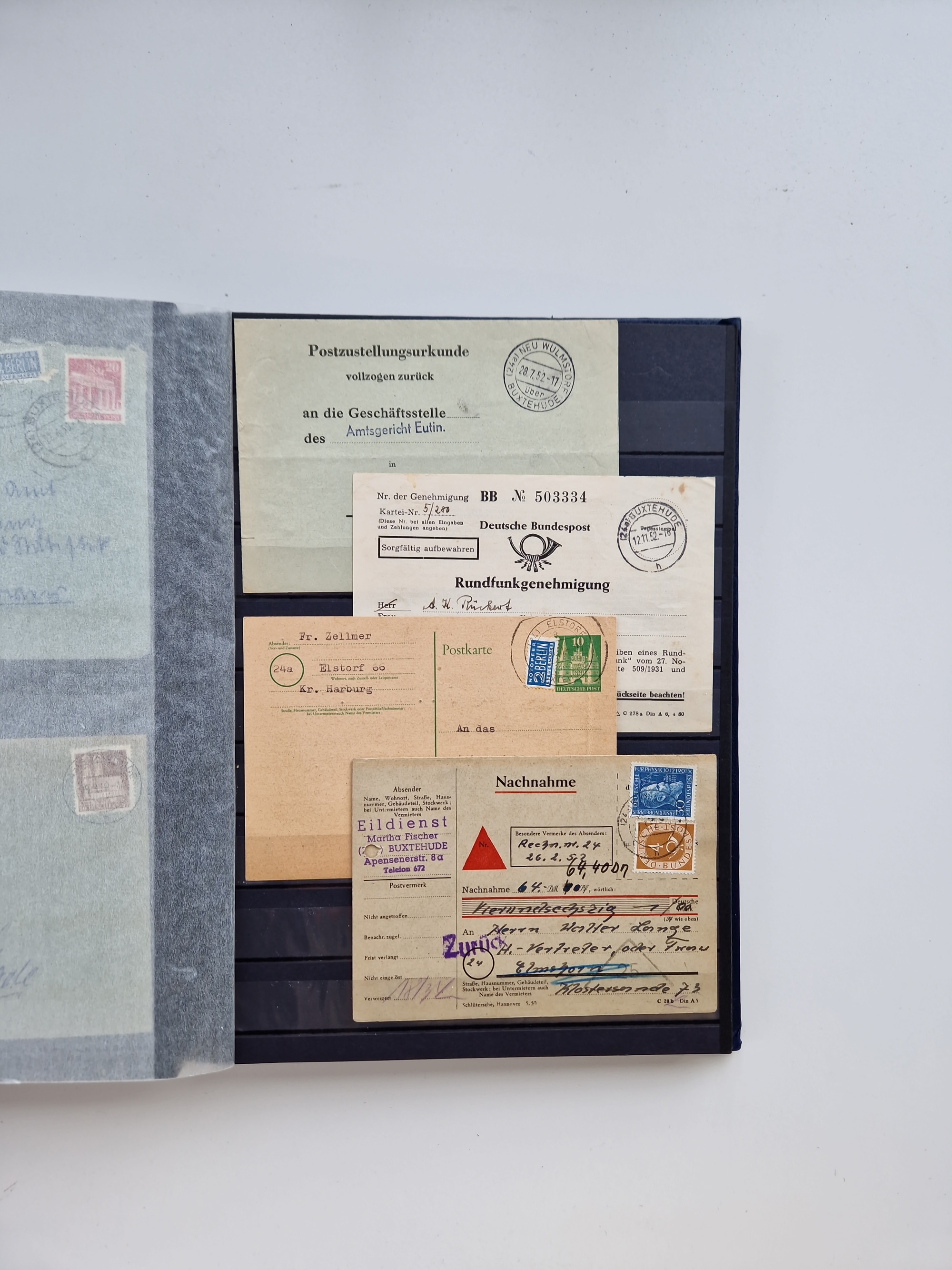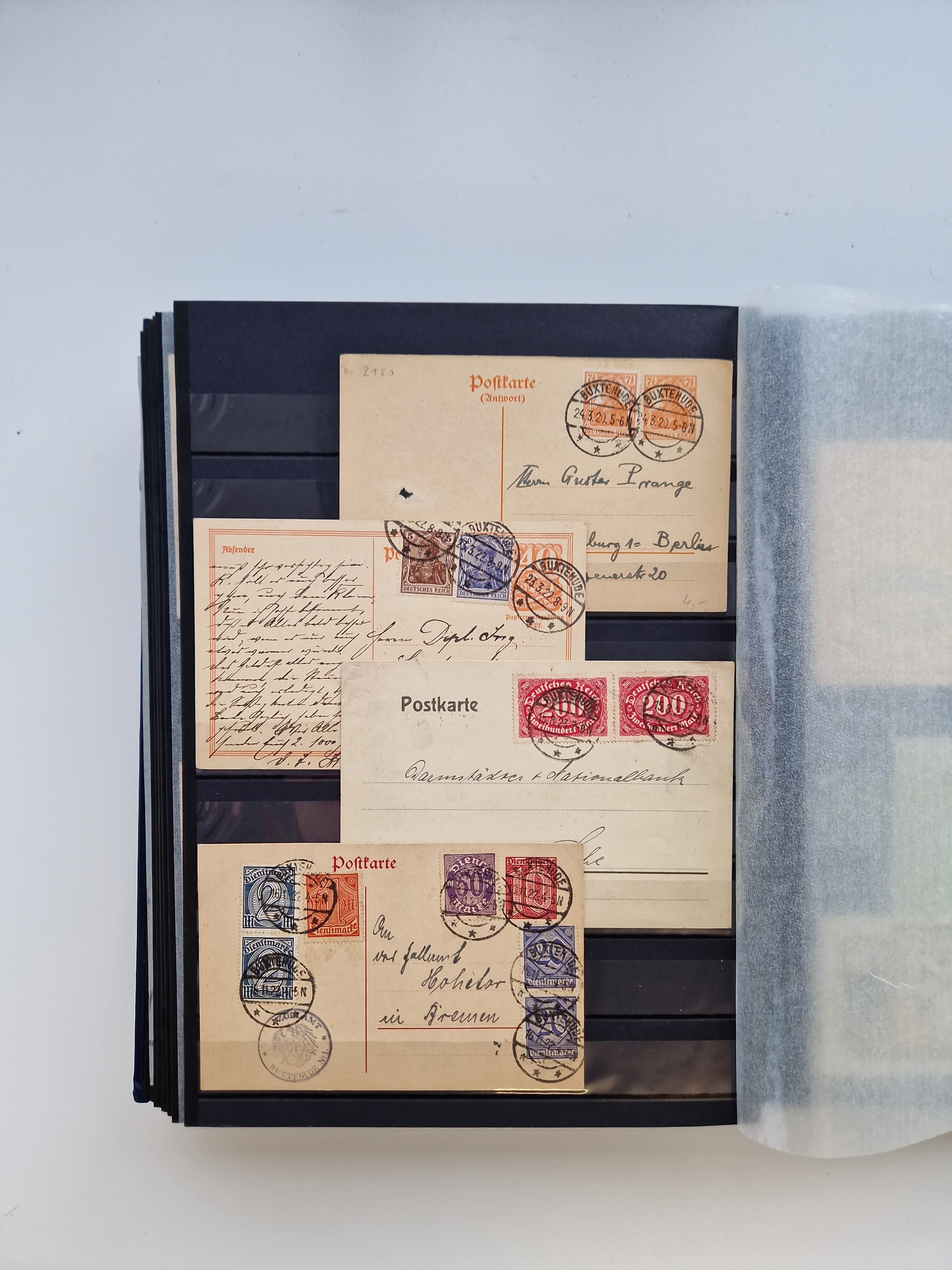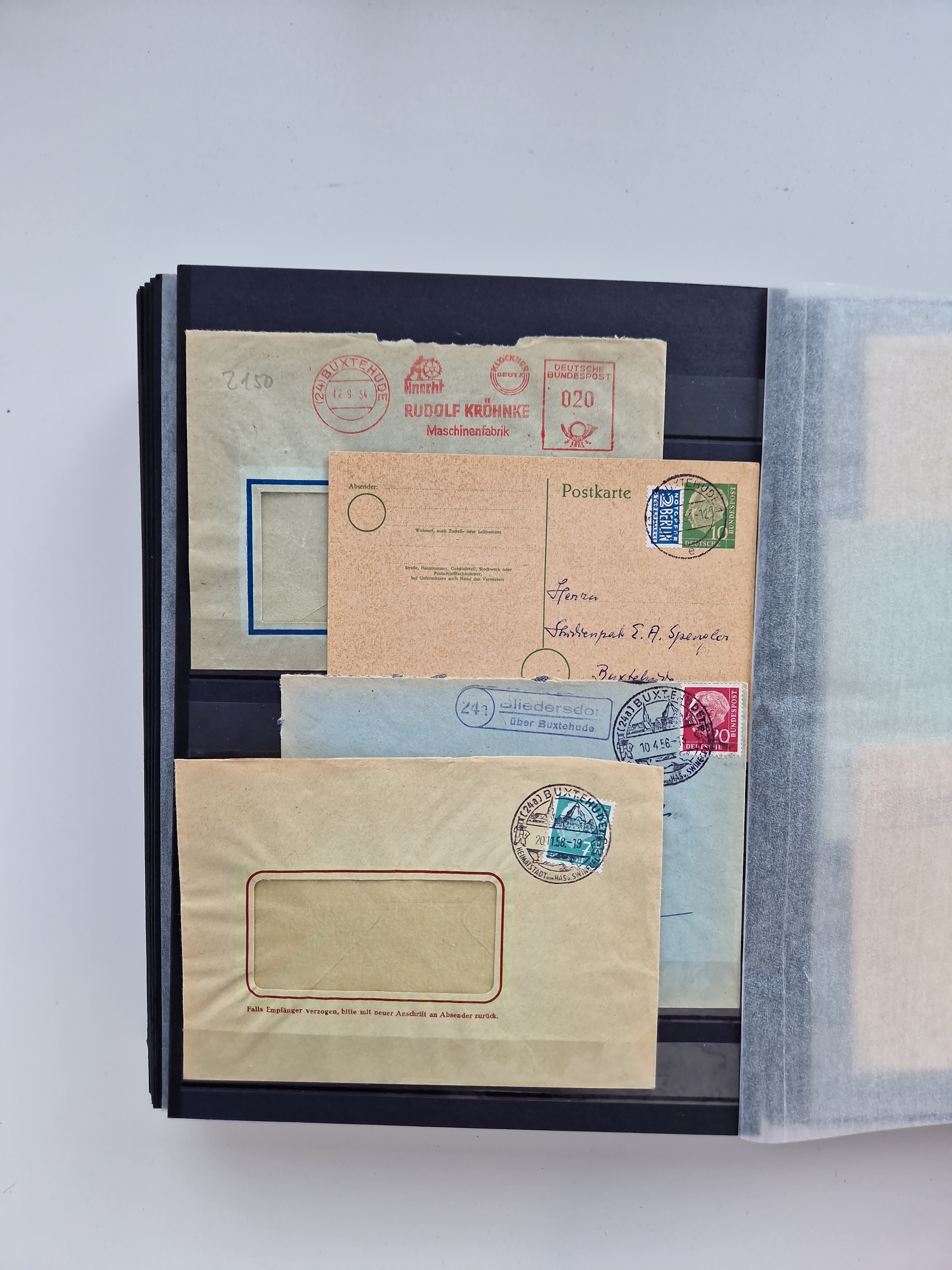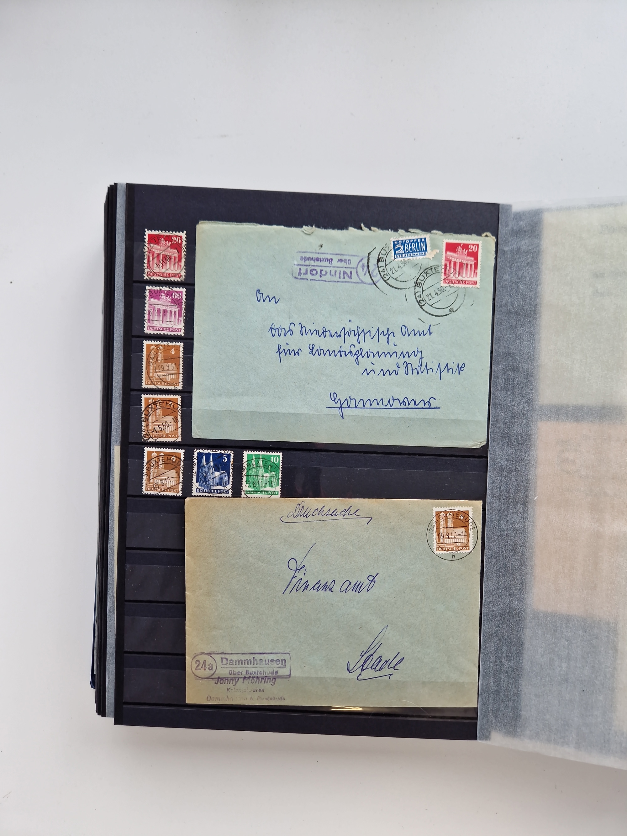 Buxtehude: 1787/2020, umfangreiche Sammlung ab Vorphila mit u.a. frühem Postschein von 1797, Botenbrief 1813 mit Dienstsiegel, Personenschein 1854 mit blauem L1 “BUXTEHUDE”, Hannover Mi.-Nr. 2a mit Vorausentwertung “(BUXT)EHUDE” und übergehendem handschriftlichem Vermerk “reicht nicht” auf Damenkuvert im Postverein (FA Berger BPP), Deutsches Reich ab Brustschild mit interessanten Frankaturen, Zonen-Ausgaben mit Paketkarten und Auslandsbriefe und Bund mit Anfangsausgaben und Luftpostbriefen sowie geschätzt weit über 1000 moderne Briefe inkl. sehr vieler Belege mit Freistempeln, in 16 Alben