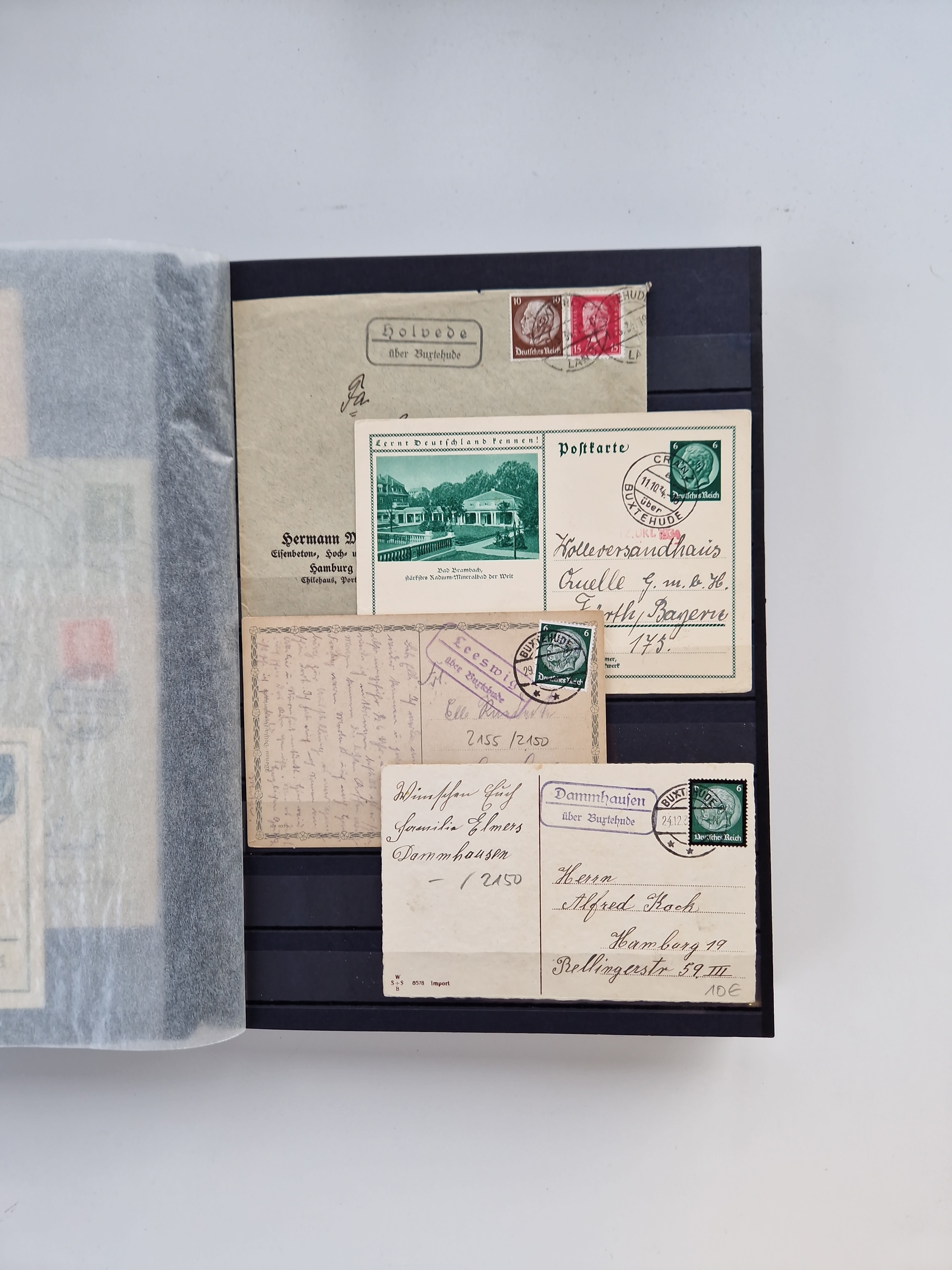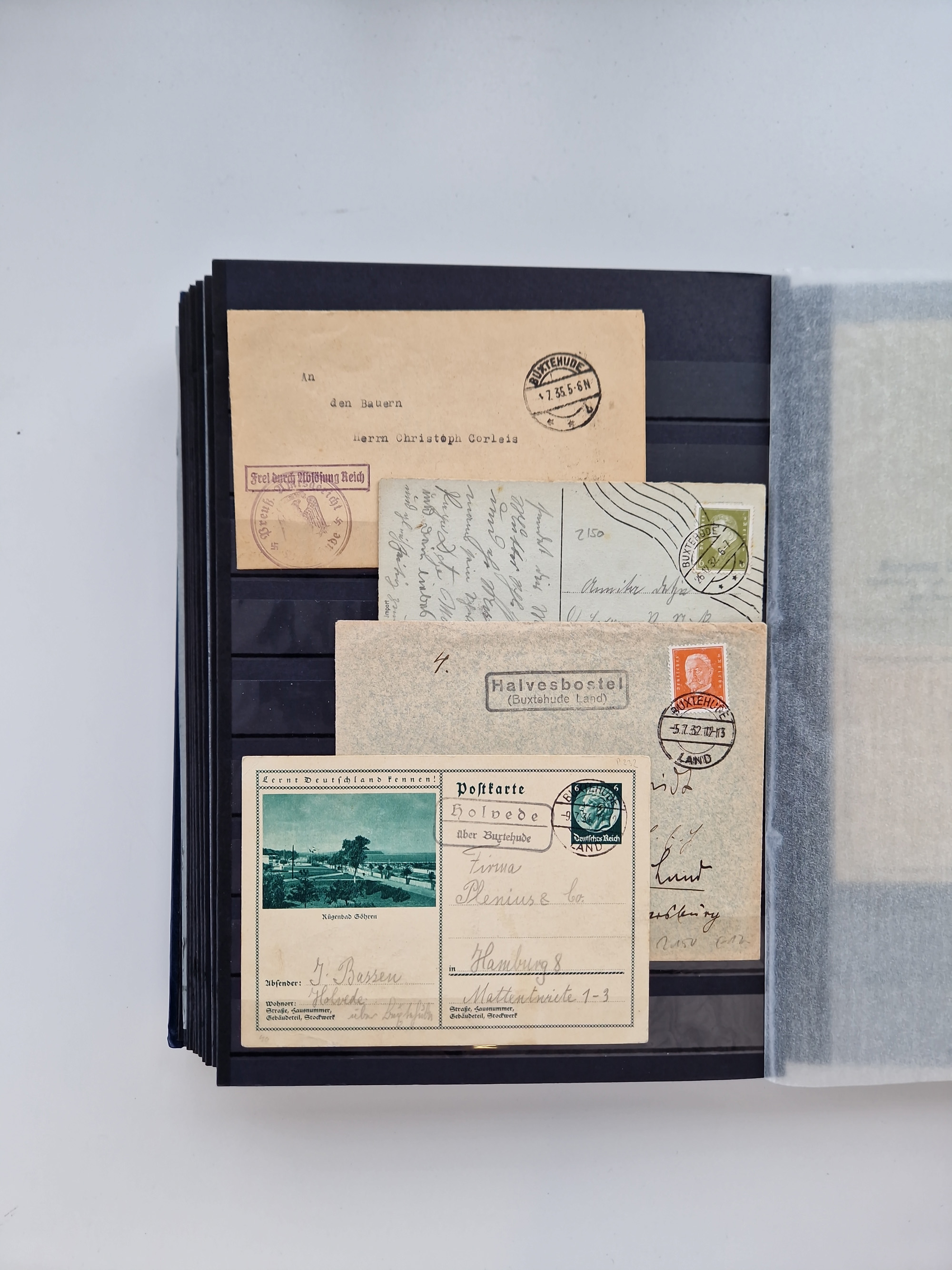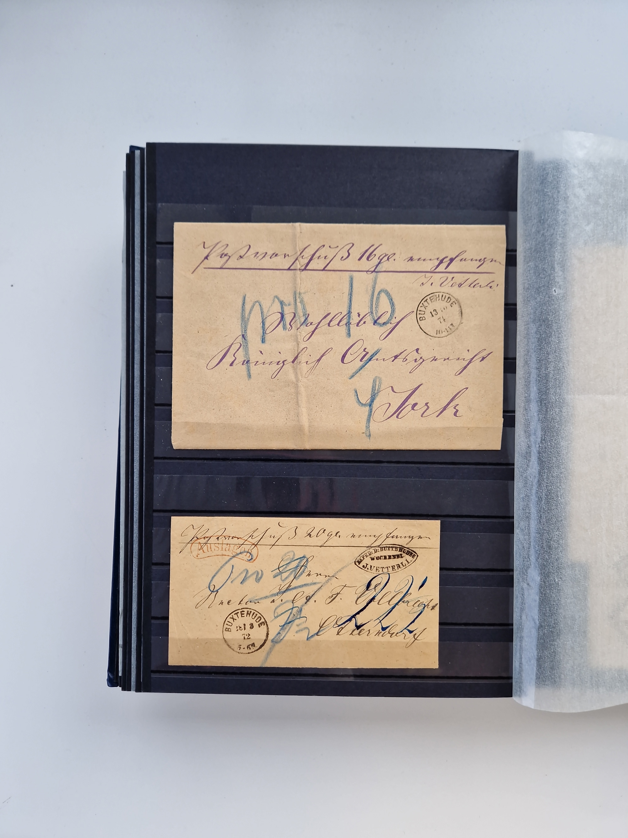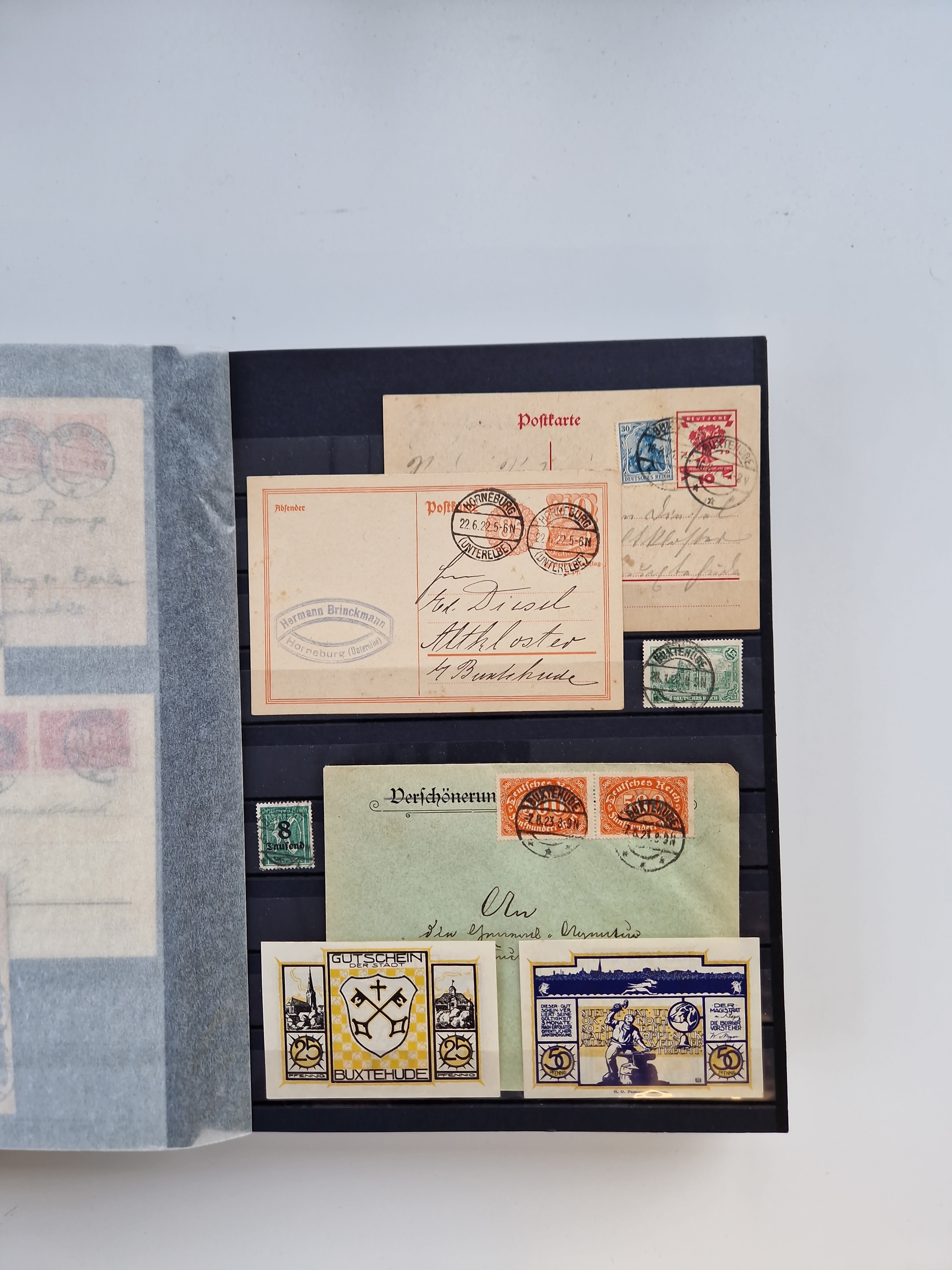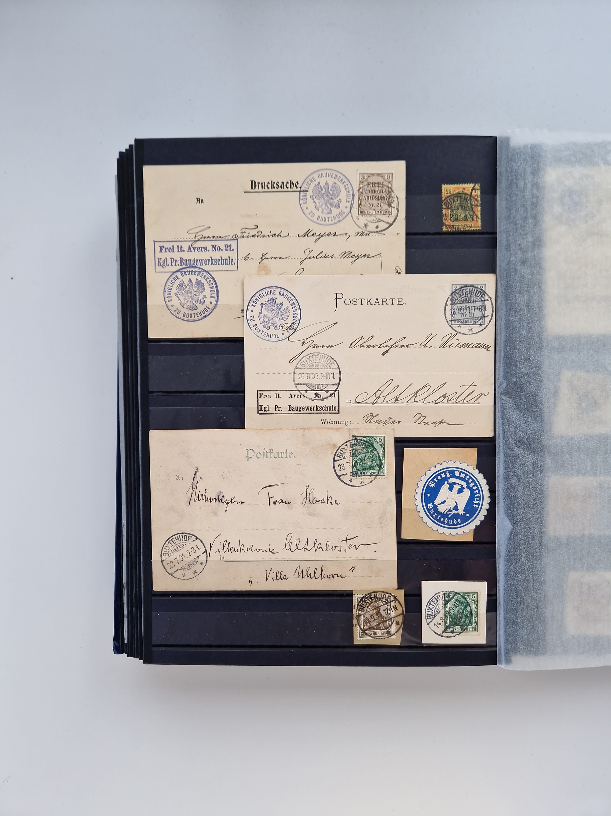 Buxtehude: 1787/2020, umfangreiche Sammlung ab Vorphila mit u.a. frühem Postschein von 1797, Botenbrief 1813 mit Dienstsiegel, Personenschein 1854 mit blauem L1 “BUXTEHUDE”, Hannover Mi.-Nr. 2a mit Vorausentwertung “(BUXT)EHUDE” und übergehendem handschriftlichem Vermerk “reicht nicht” auf Damenkuvert im Postverein (FA Berger BPP), Deutsches Reich ab Brustschild mit interessanten Frankaturen, Zonen-Ausgaben mit Paketkarten und Auslandsbriefe und Bund mit Anfangsausgaben und Luftpostbriefen sowie geschätzt weit über 1000 moderne Briefe inkl. sehr vieler Belege mit Freistempeln, in 16 Alben