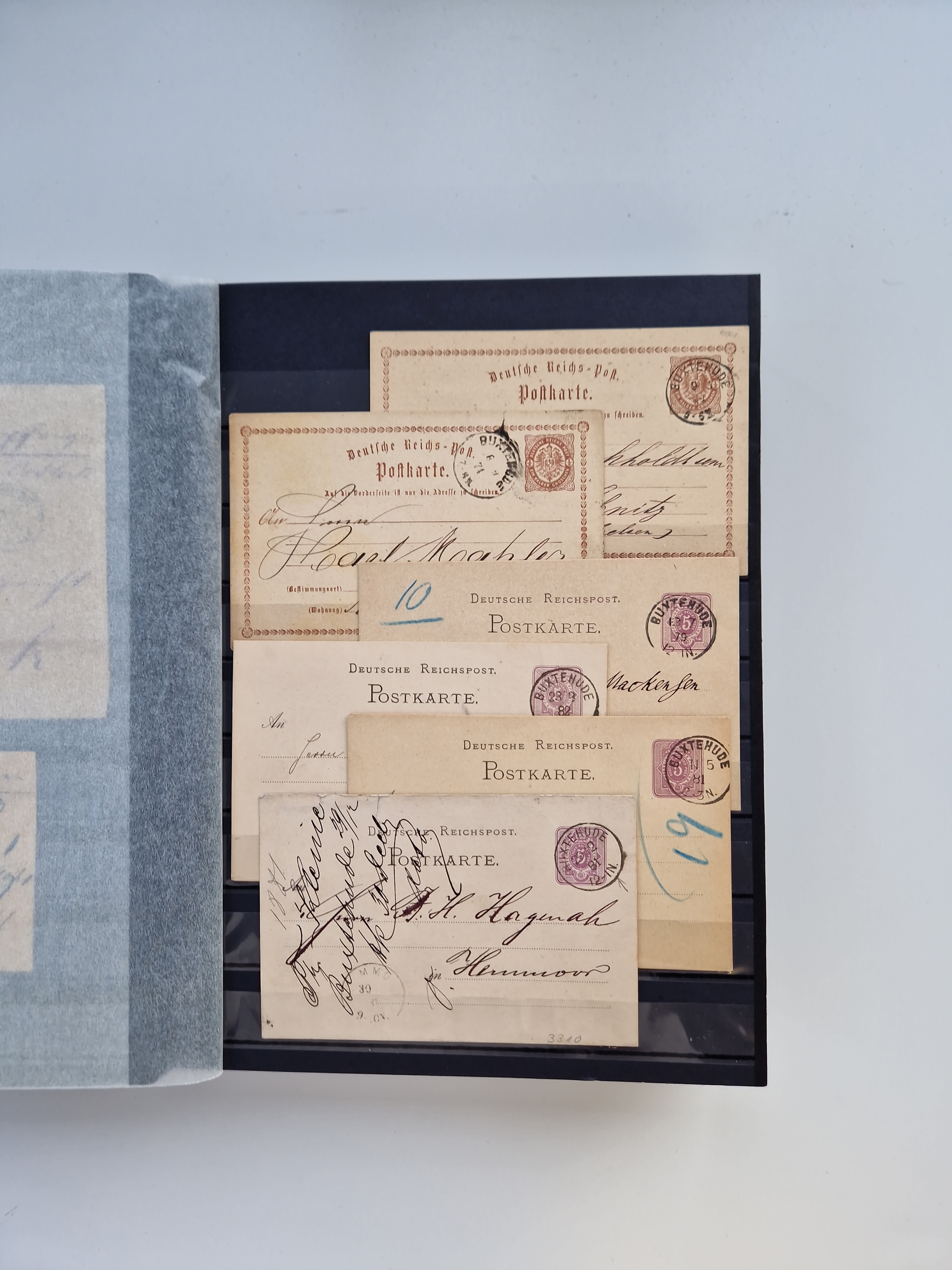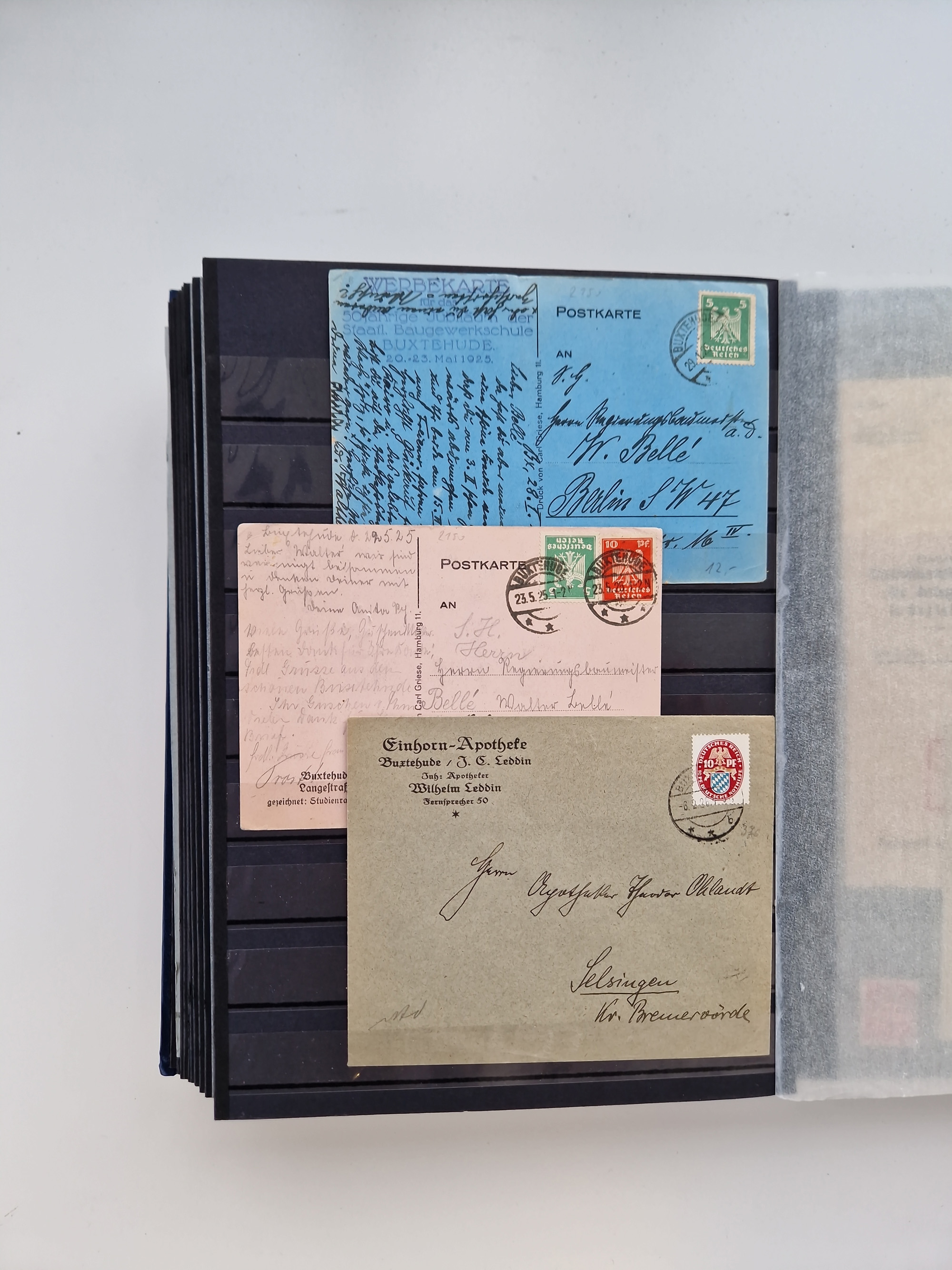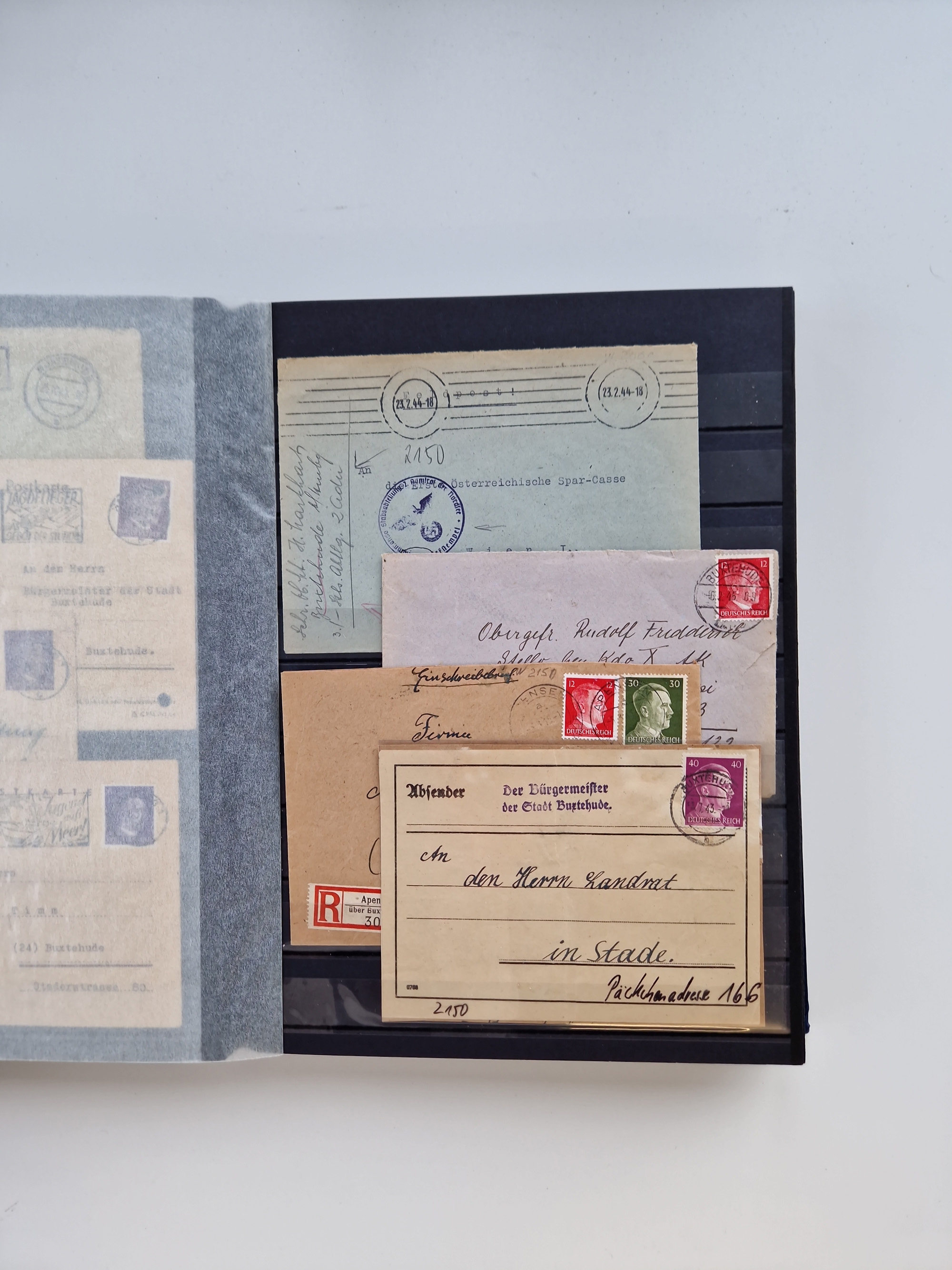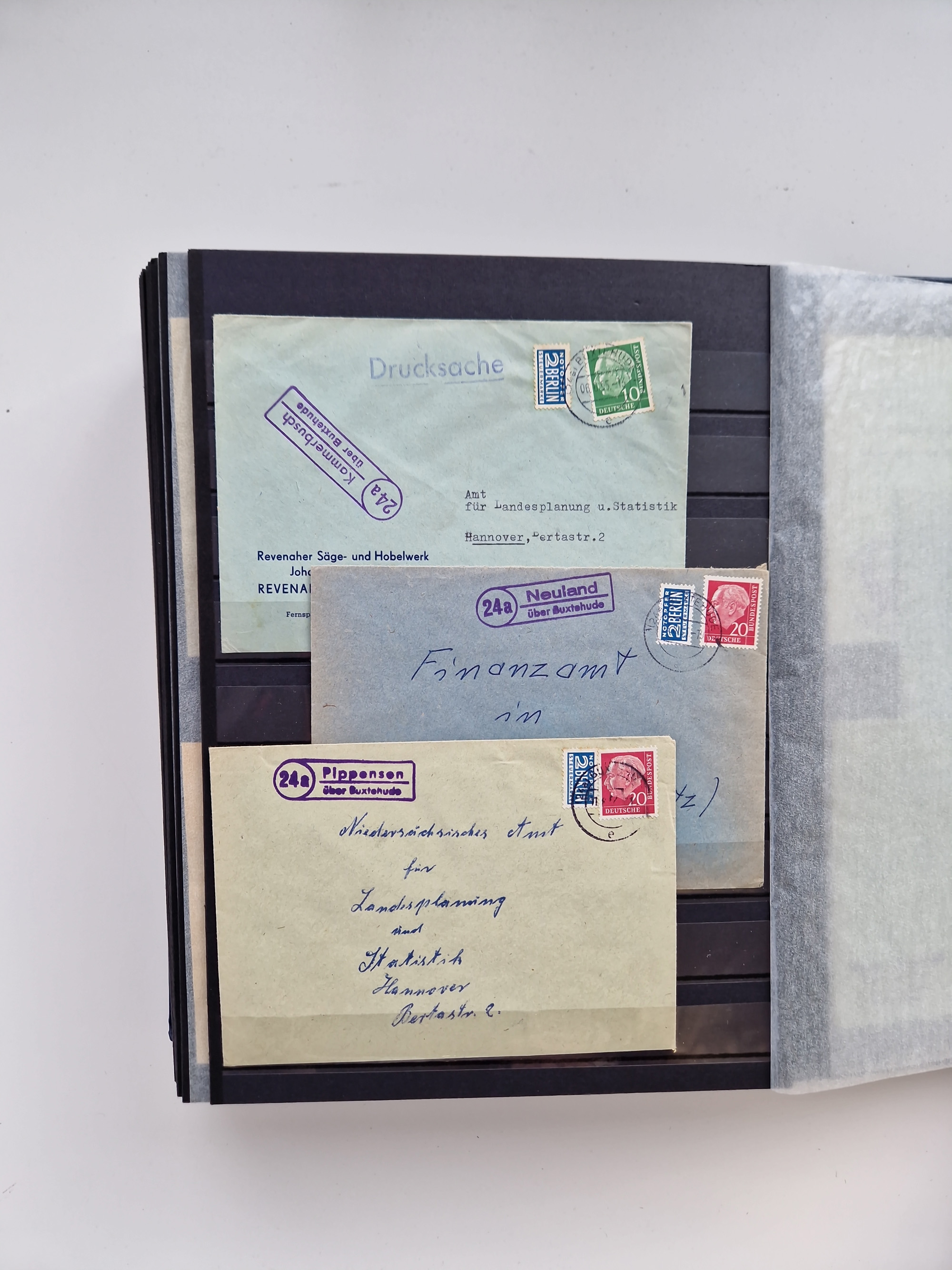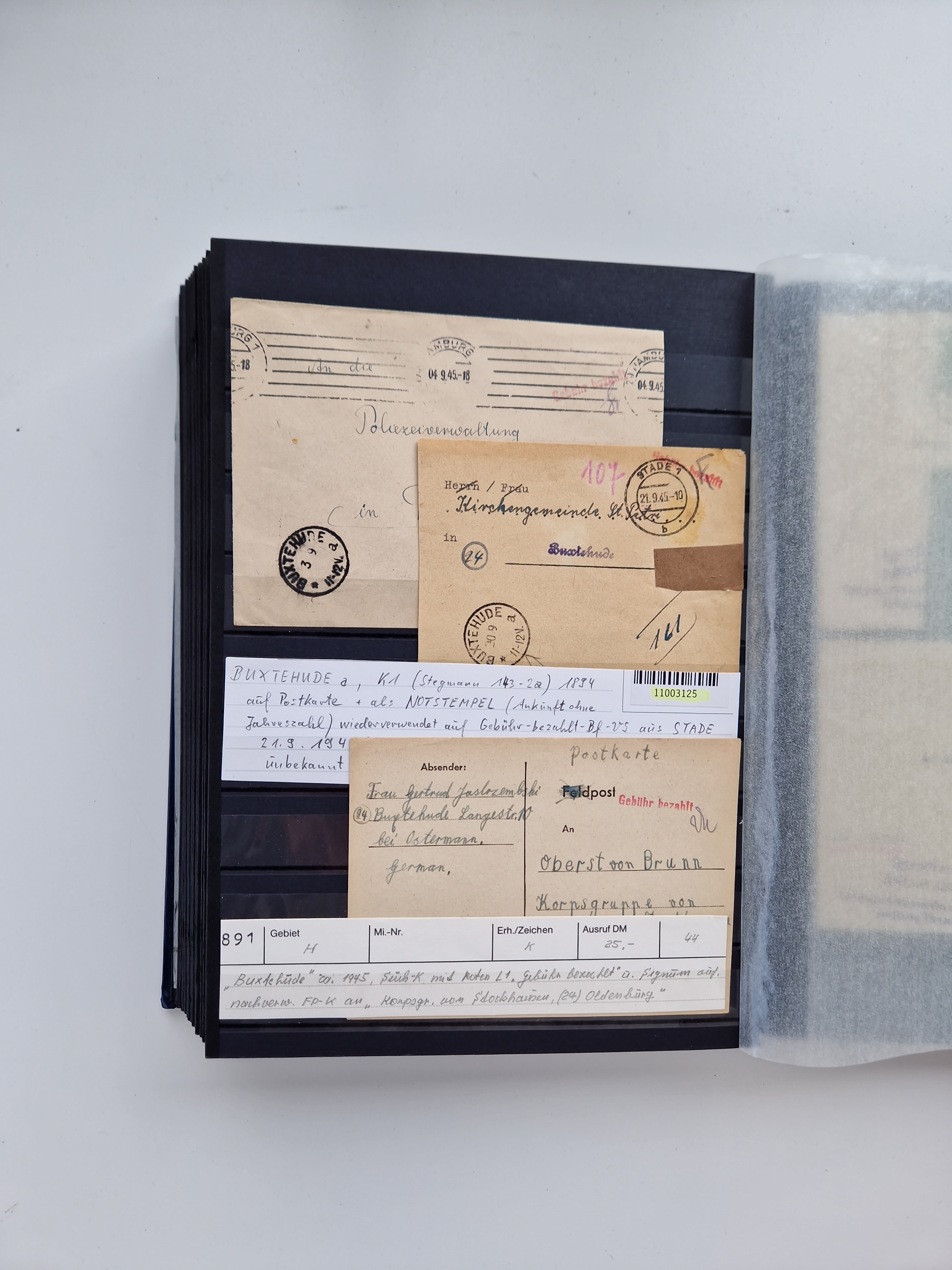 Buxtehude: 1787/2020, umfangreiche Sammlung ab Vorphila mit u.a. frühem Postschein von 1797, Botenbrief 1813 mit Dienstsiegel, Personenschein 1854 mit blauem L1 “BUXTEHUDE”, Hannover Mi.-Nr. 2a mit Vorausentwertung “(BUXT)EHUDE” und übergehendem handschriftlichem Vermerk “reicht nicht” auf Damenkuvert im Postverein (FA Berger BPP), Deutsches Reich ab Brustschild mit interessanten Frankaturen, Zonen-Ausgaben mit Paketkarten und Auslandsbriefe und Bund mit Anfangsausgaben und Luftpostbriefen sowie geschätzt weit über 1000 moderne Briefe inkl. sehr vieler Belege mit Freistempeln, in 16 Alben