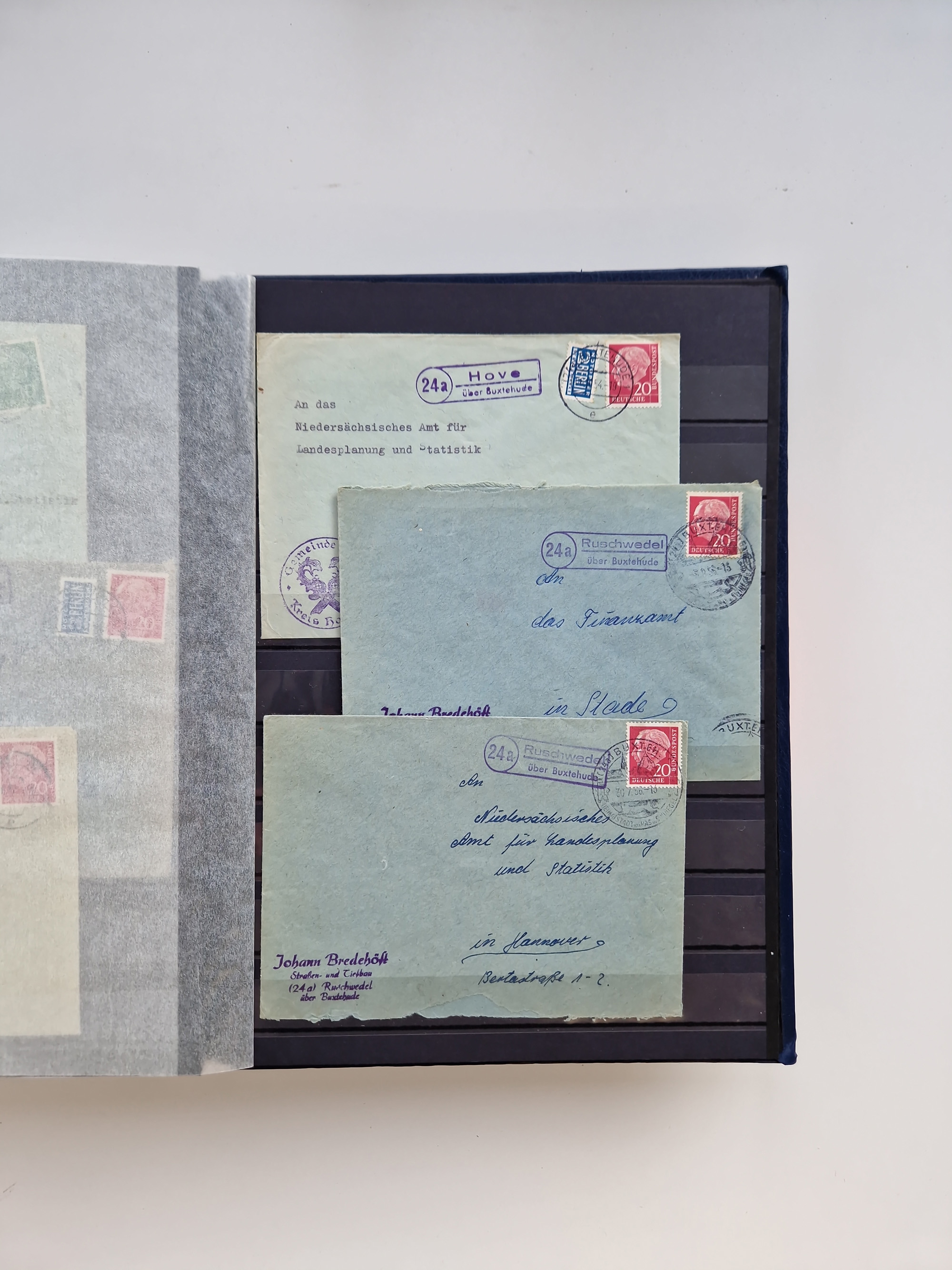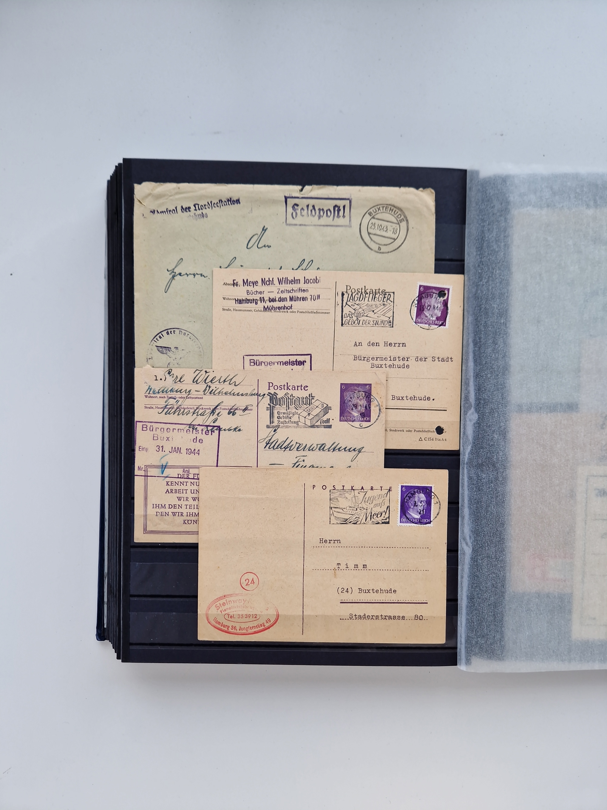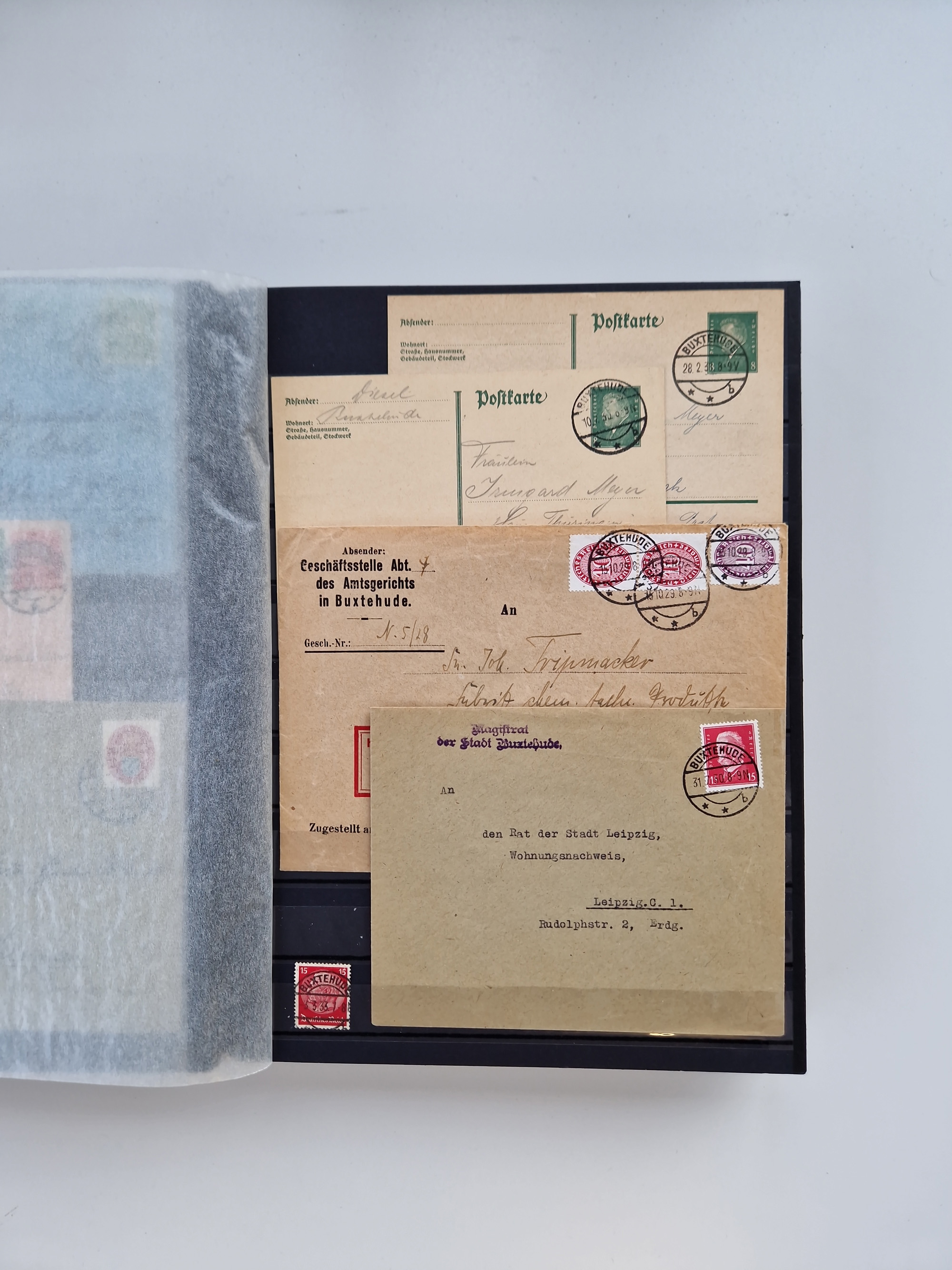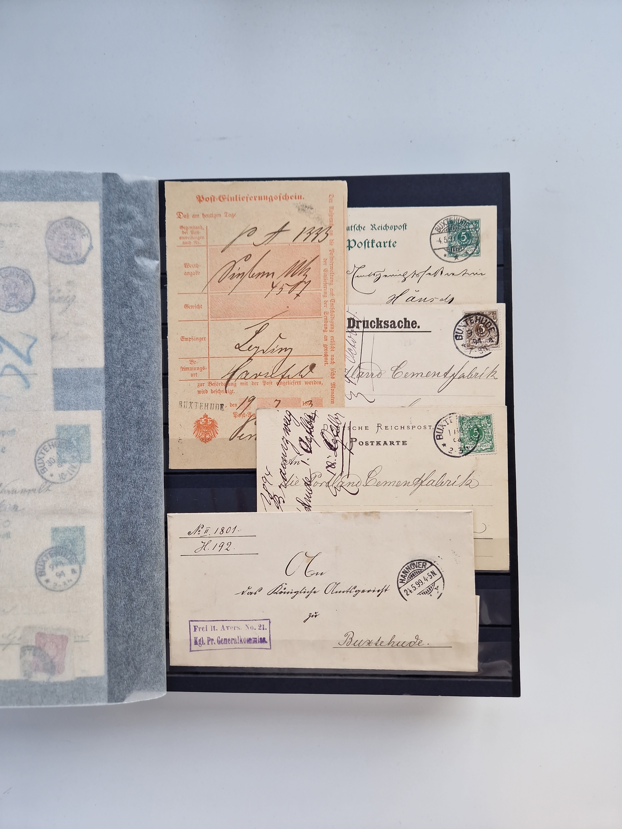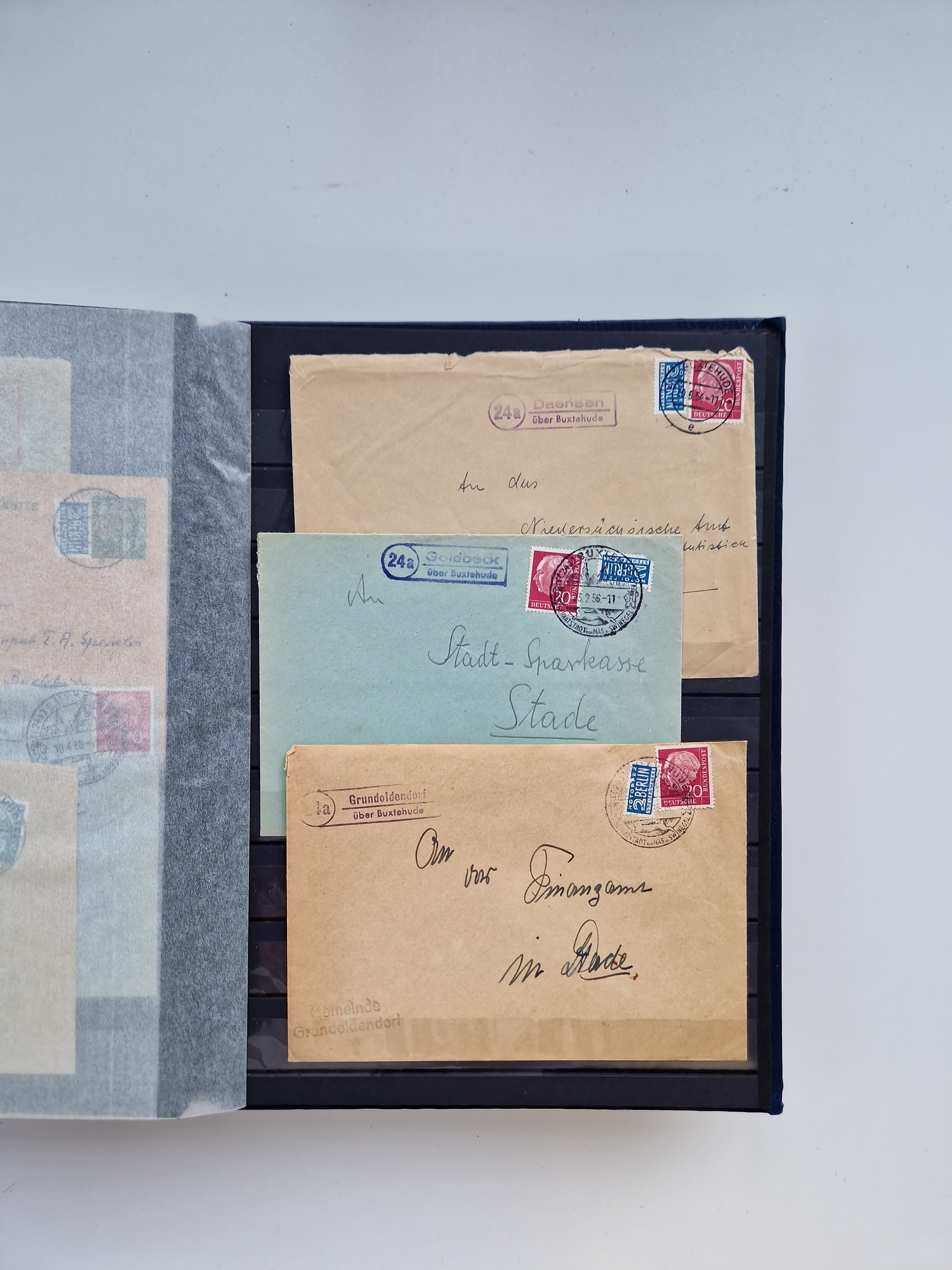 Buxtehude: 1787/2020, umfangreiche Sammlung ab Vorphila mit u.a. frühem Postschein von 1797, Botenbrief 1813 mit Dienstsiegel, Personenschein 1854 mit blauem L1 “BUXTEHUDE”, Hannover Mi.-Nr. 2a mit Vorausentwertung “(BUXT)EHUDE” und übergehendem handschriftlichem Vermerk “reicht nicht” auf Damenkuvert im Postverein (FA Berger BPP), Deutsches Reich ab Brustschild mit interessanten Frankaturen, Zonen-Ausgaben mit Paketkarten und Auslandsbriefe und Bund mit Anfangsausgaben und Luftpostbriefen sowie geschätzt weit über 1000 moderne Briefe inkl. sehr vieler Belege mit Freistempeln, in 16 Alben