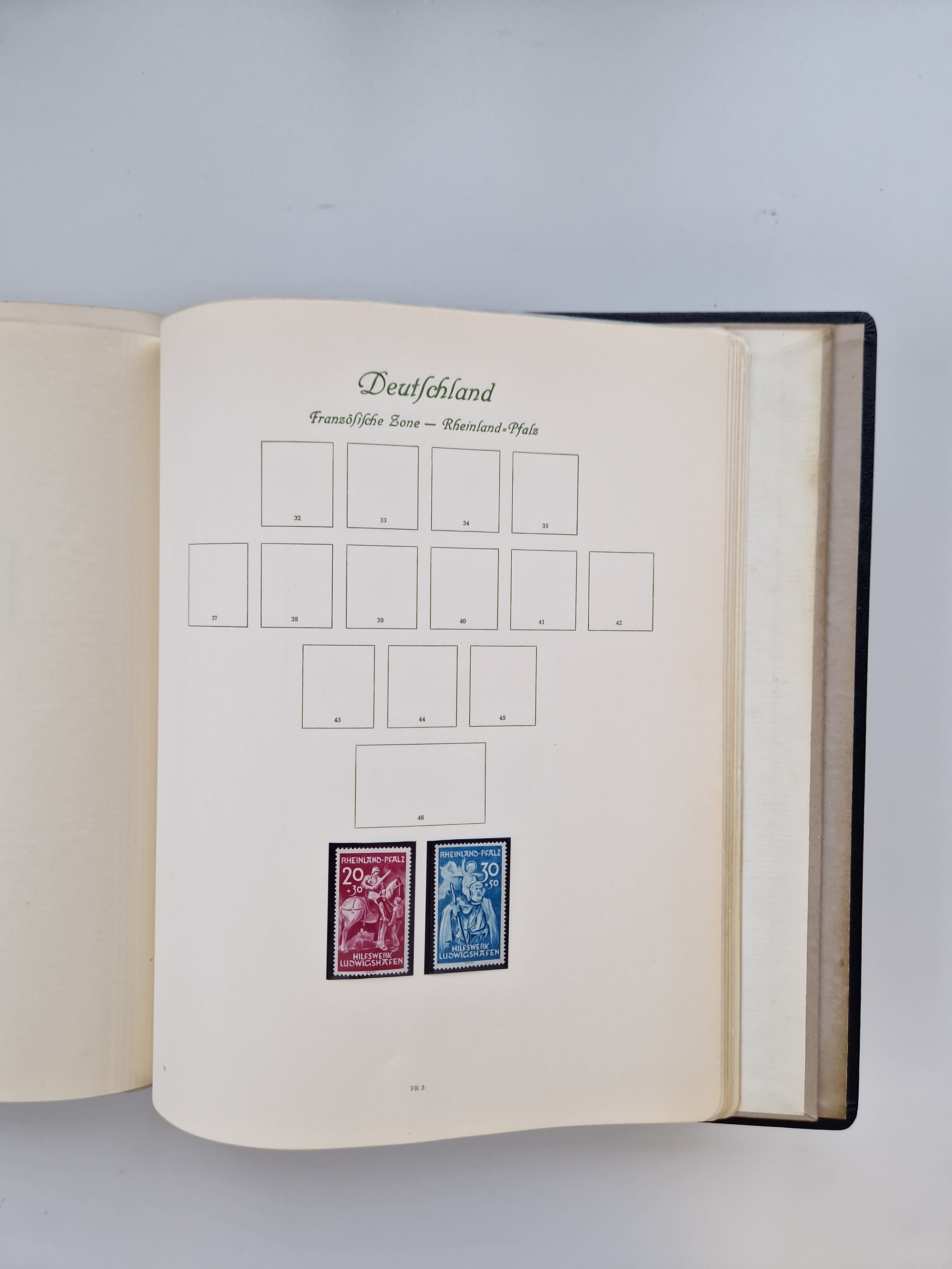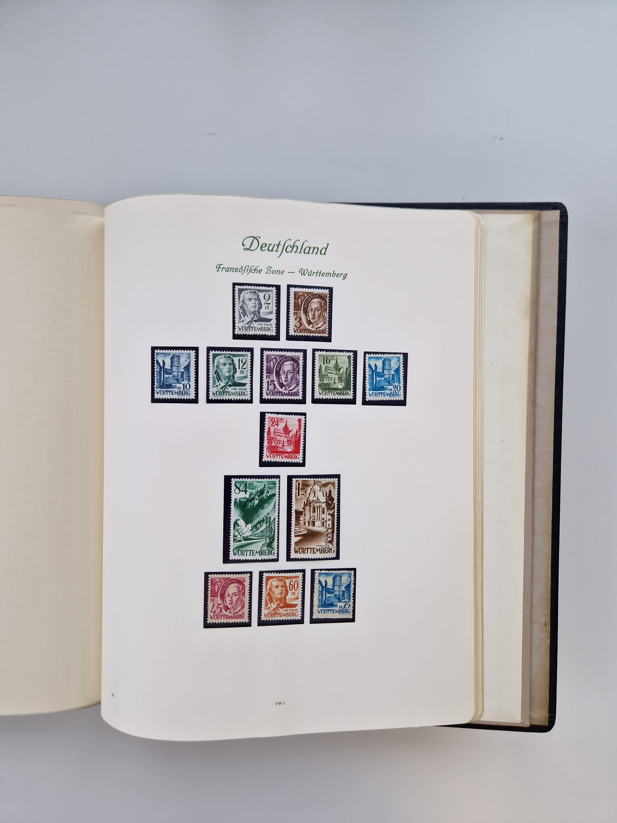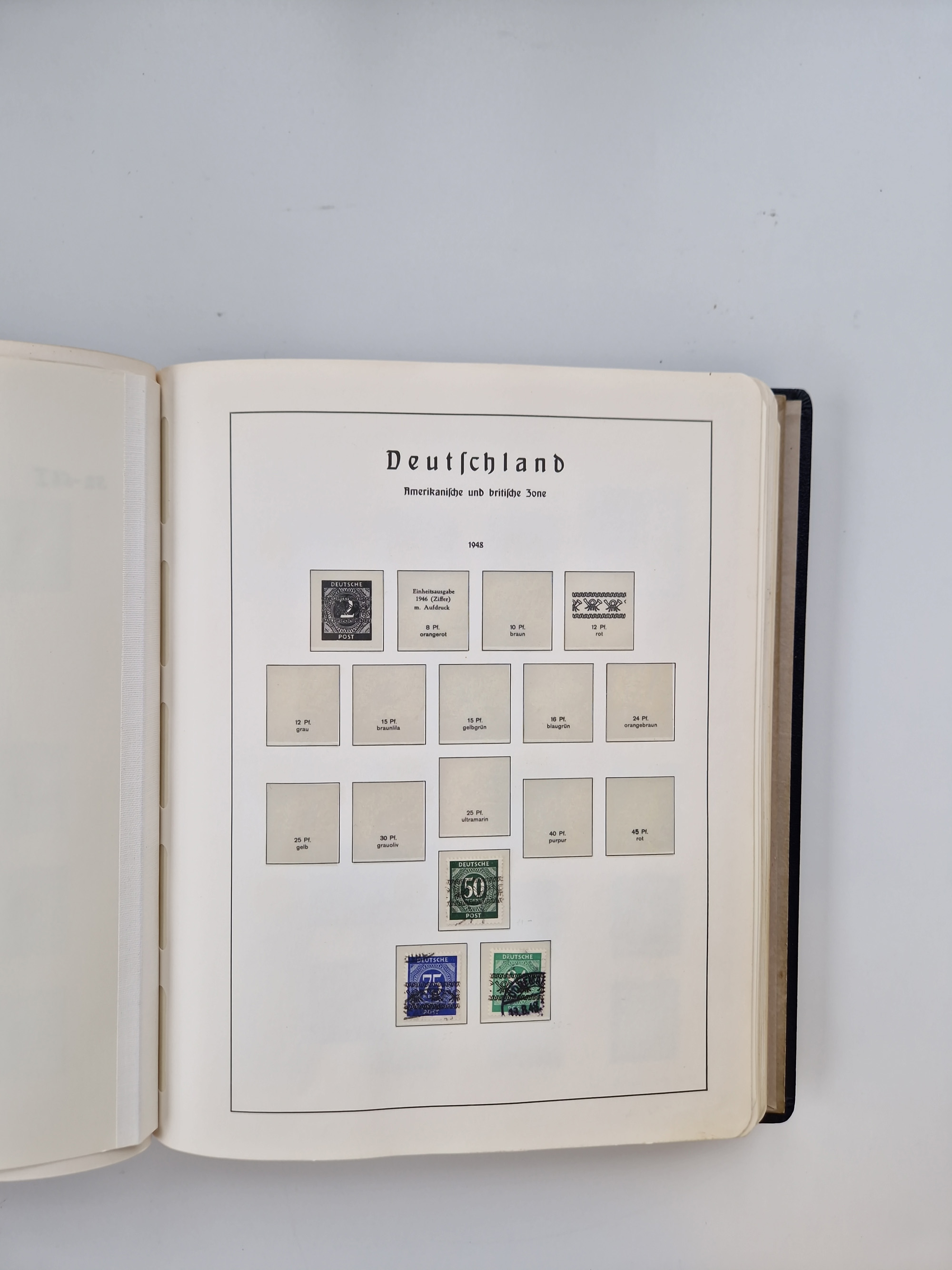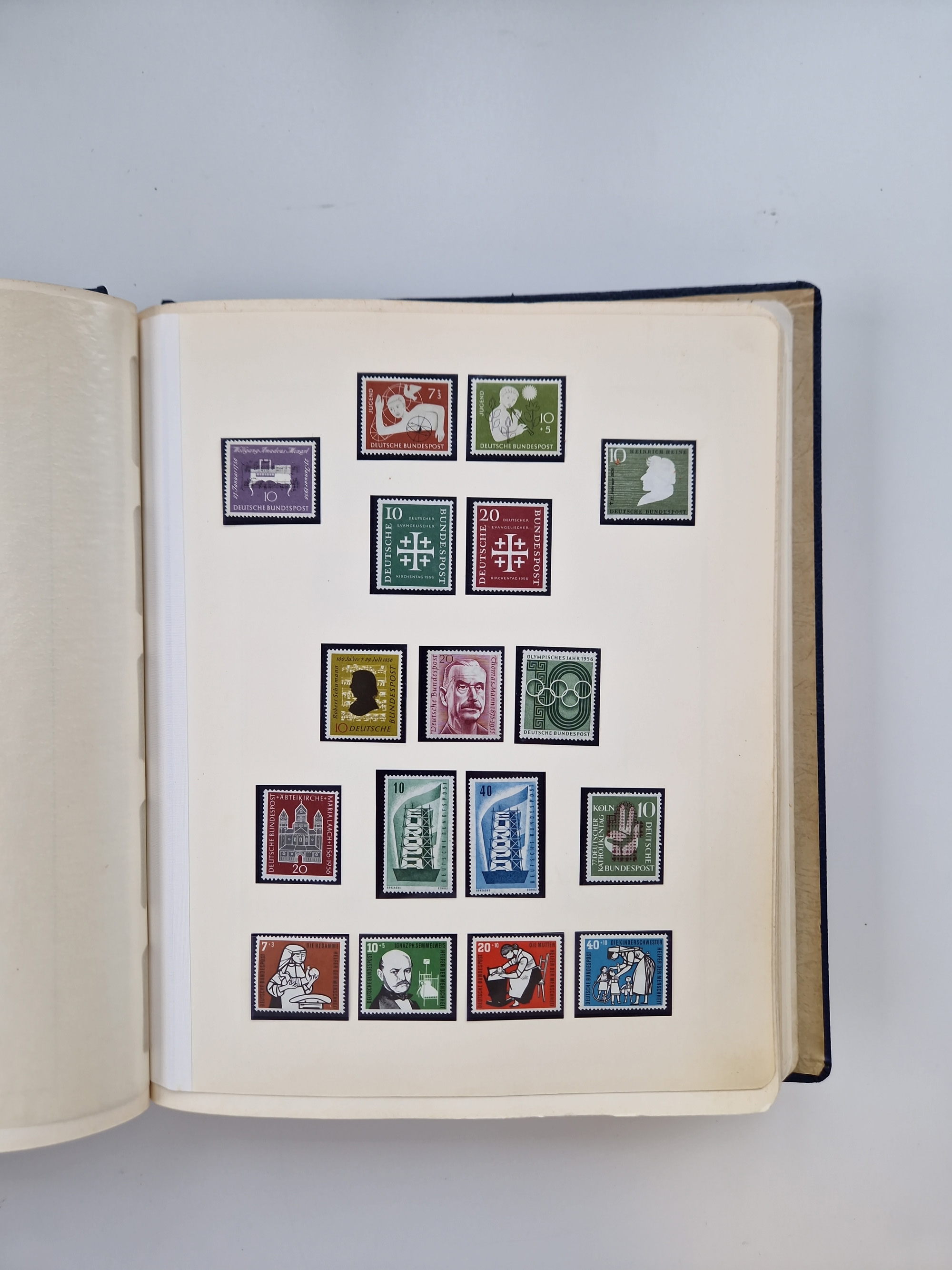 1945/59, Gemeinschaftsausgaben, FZ, Bizone und Saarland, Sammlung in zwei Vordruckalben mit u.a. Bl. 12 A/B, gutem Teil Bauten, 2 Rotes Kreuz-Blocks, etc.