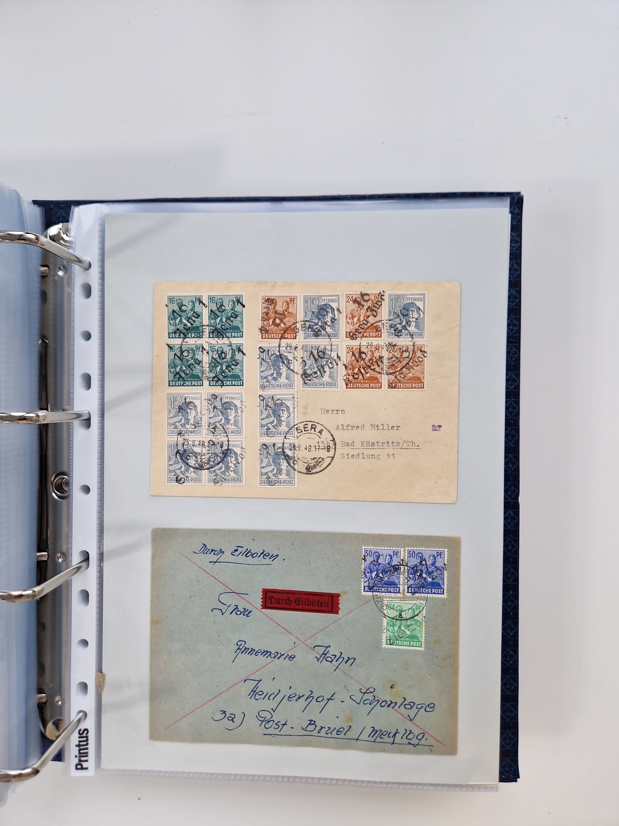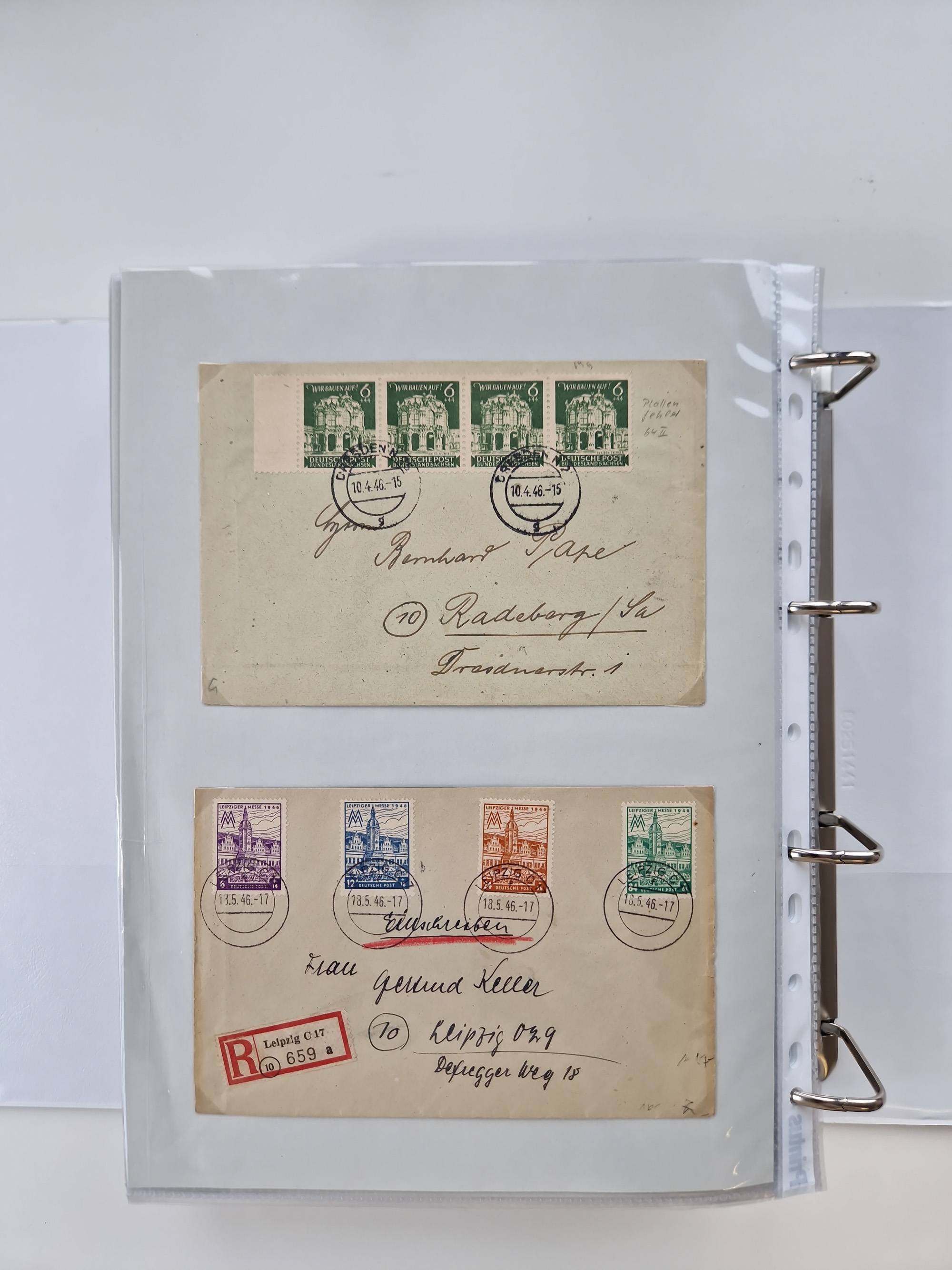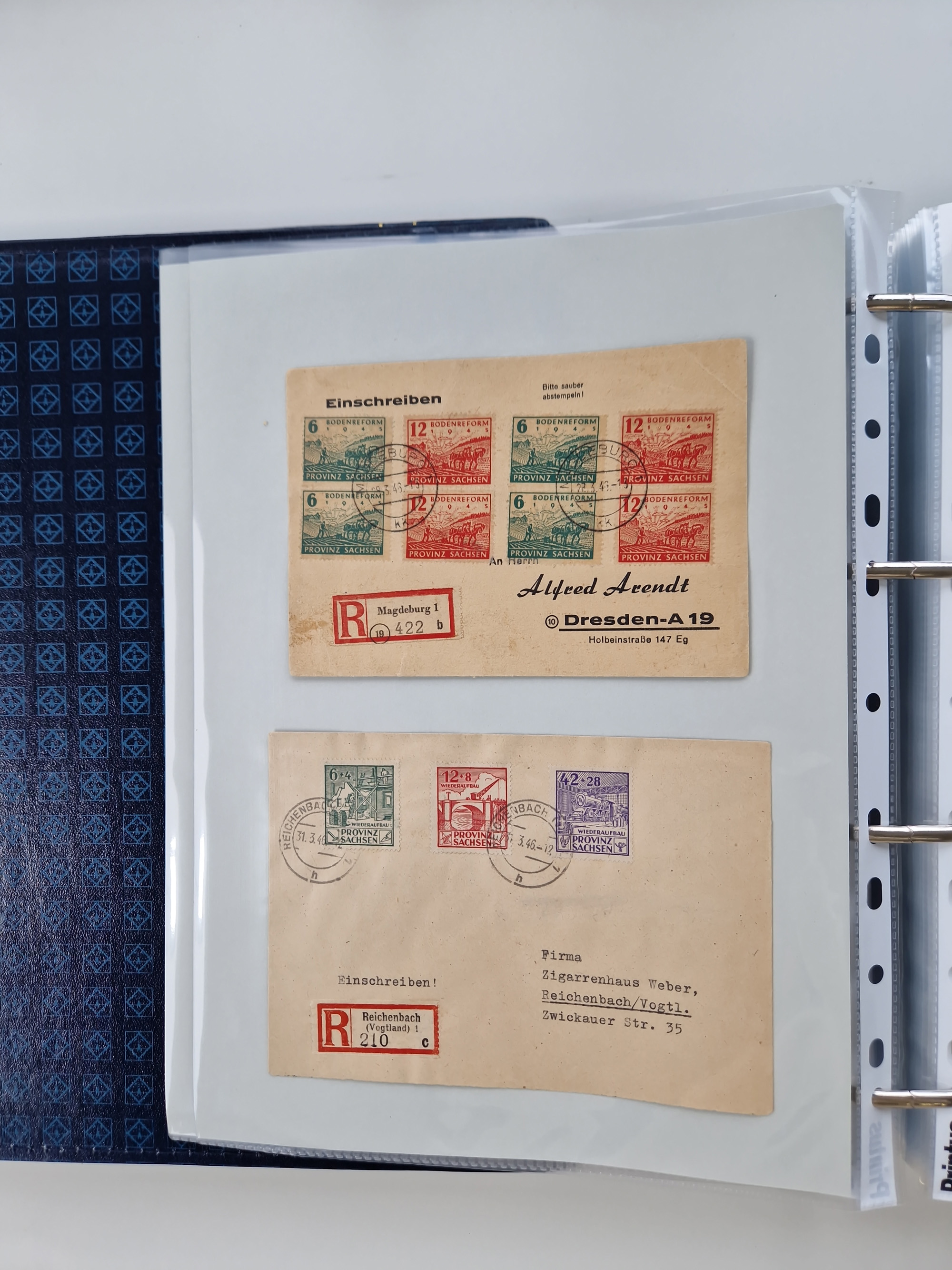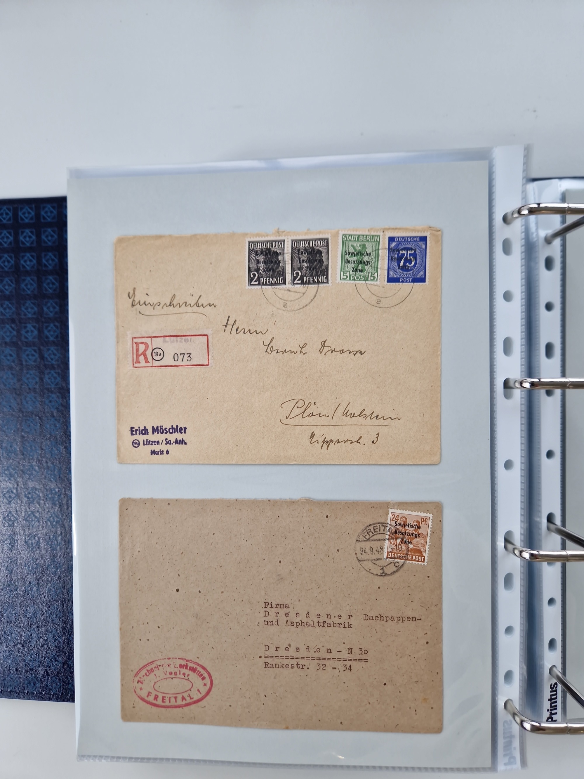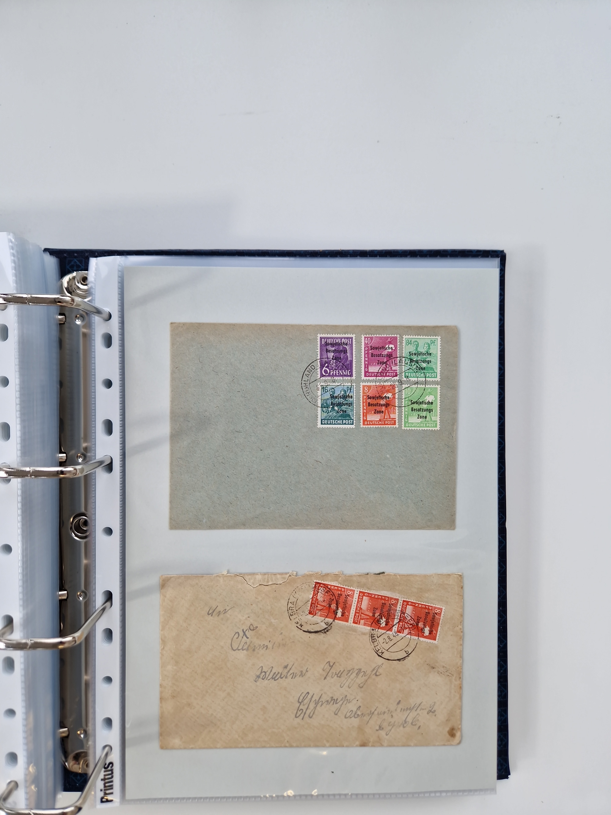 1945/48, ungebrauchte/postfrische und gestempelte Sammlungspartie, dabei Marken und Blocks, aber auch immer wieder bessere Briefe, dabei u.a. Fredersdorf Mi.-Nr. 53 u. 69 auf Karte, 39 Briefe mit Sächs. Schwärzungen, Ost-Sachsen Durchstiche auf Brief, ein Brief mit Notstempel, über 40 Briefe mit Bezirkshandstempeln sowie eine Paketkarte mit Mi.-Nr. 177VIII und 180VIII (6), etc., in vier Alben