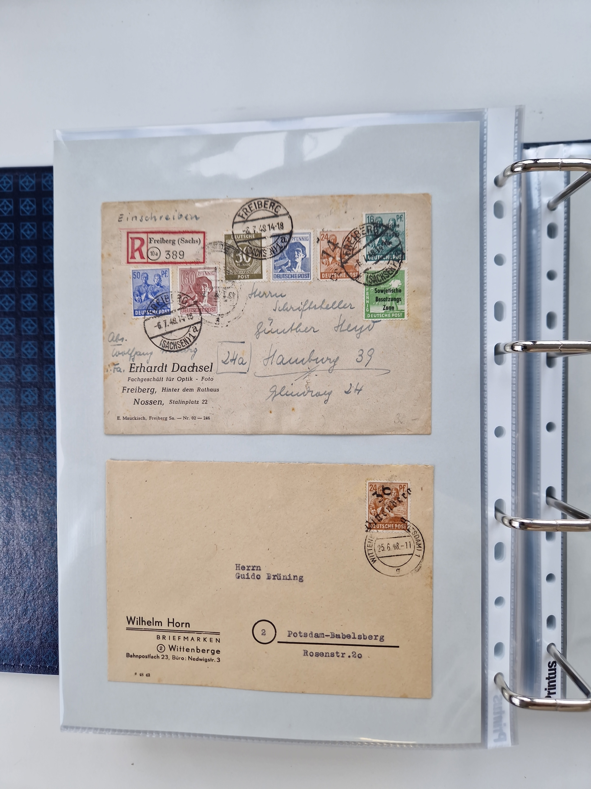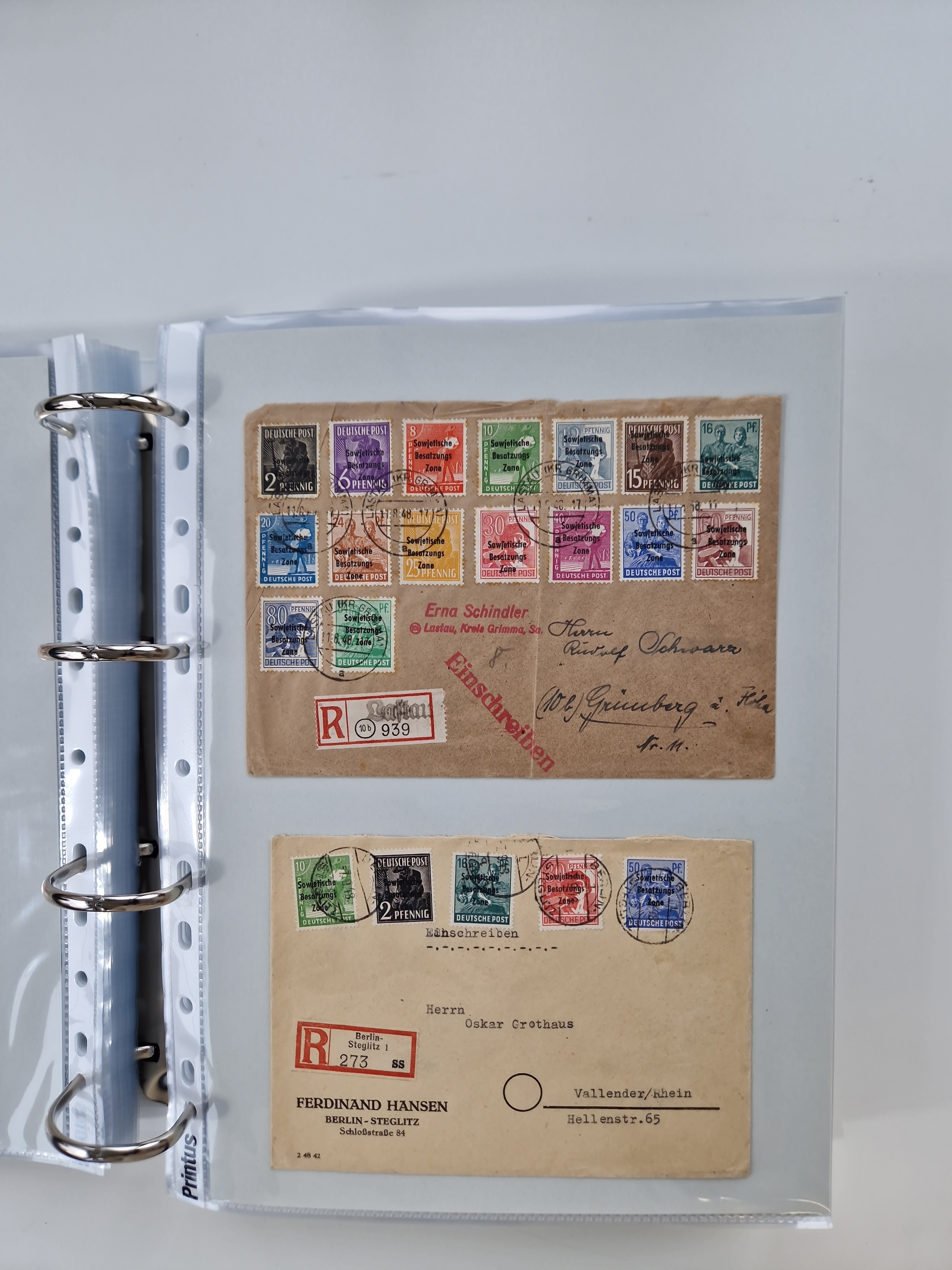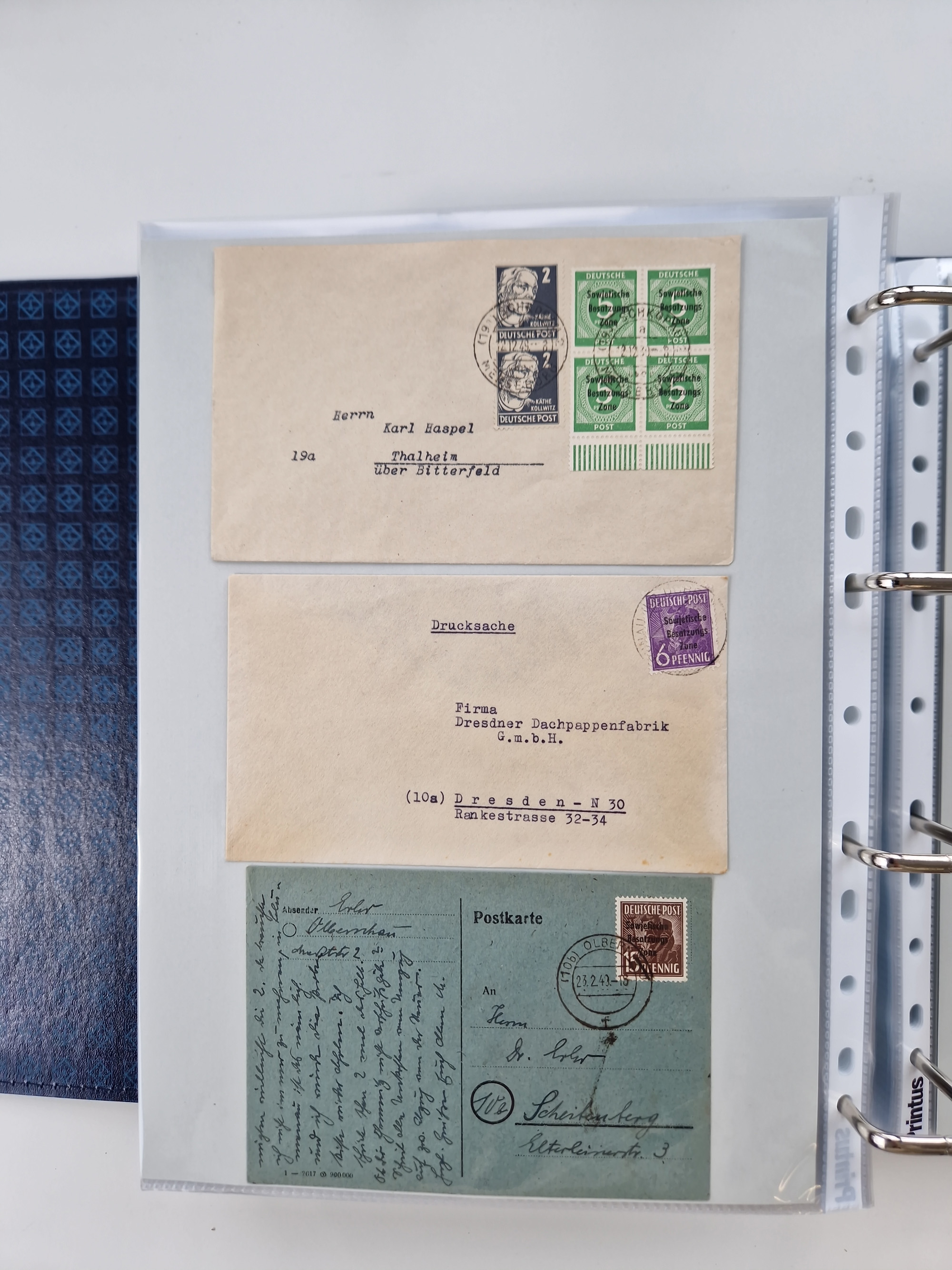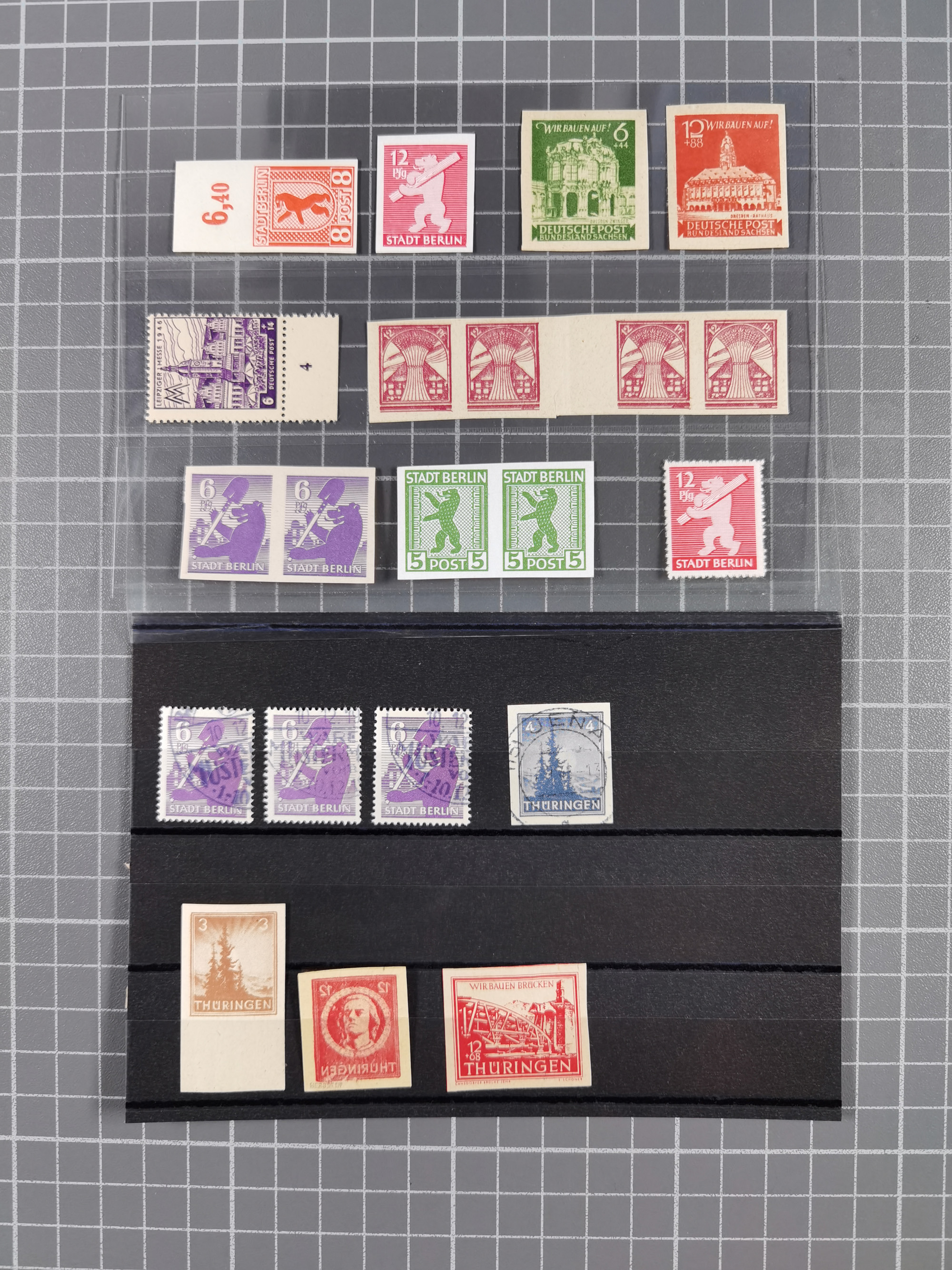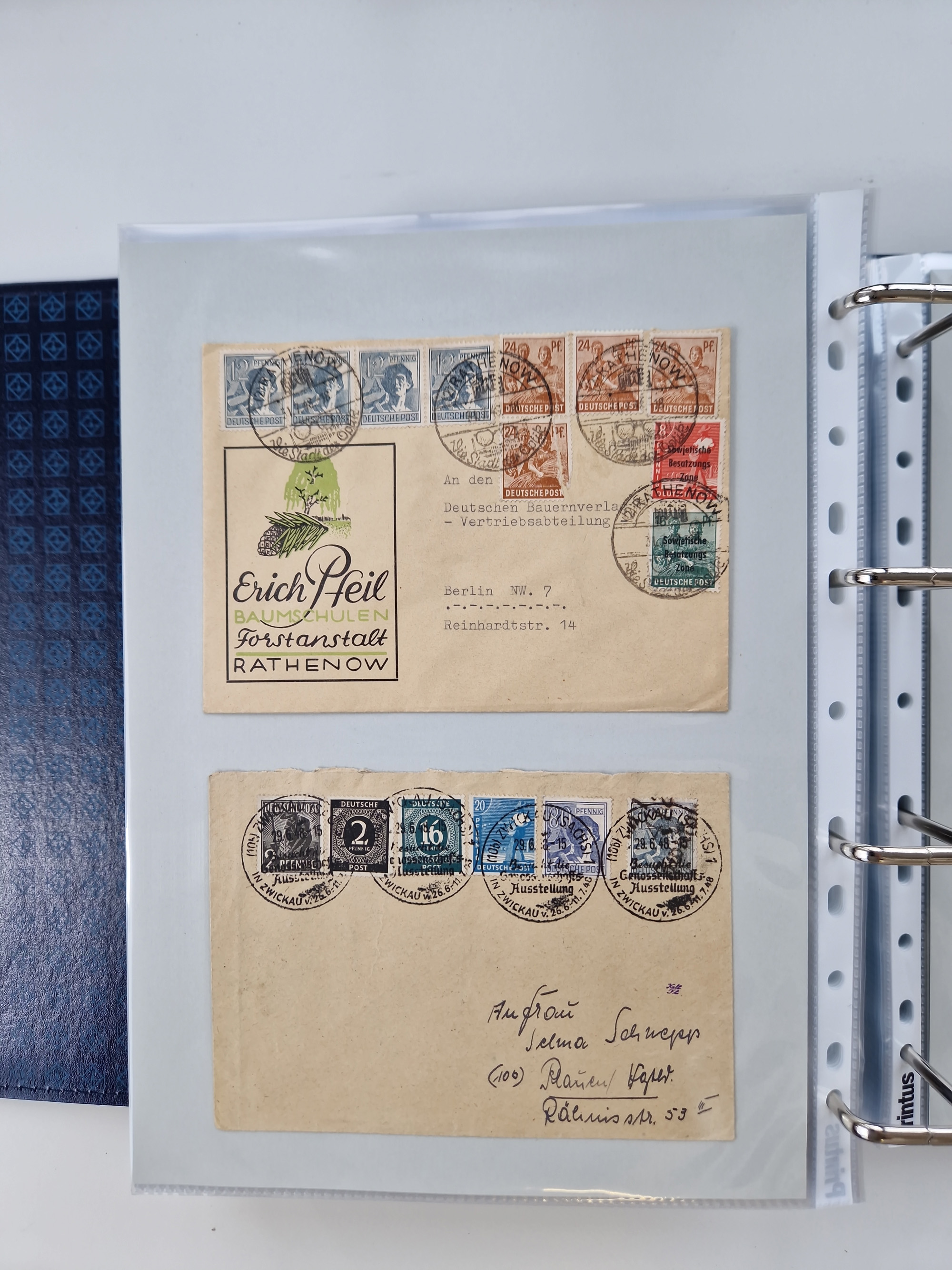 1945/48, ungebrauchte/postfrische und gestempelte Sammlungspartie, dabei Marken und Blocks, aber auch immer wieder bessere Briefe, dabei u.a. Fredersdorf Mi.-Nr. 53 u. 69 auf Karte, 39 Briefe mit Sächs. Schwärzungen, Ost-Sachsen Durchstiche auf Brief, ein Brief mit Notstempel, über 40 Briefe mit Bezirkshandstempeln sowie eine Paketkarte mit Mi.-Nr. 177VIII und 180VIII (6), etc., in vier Alben