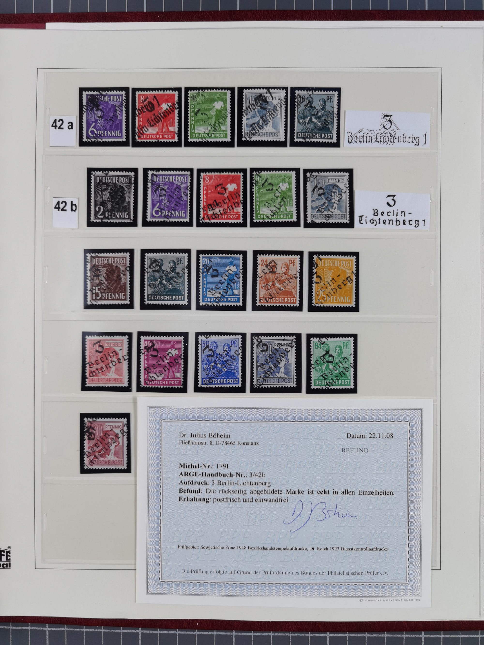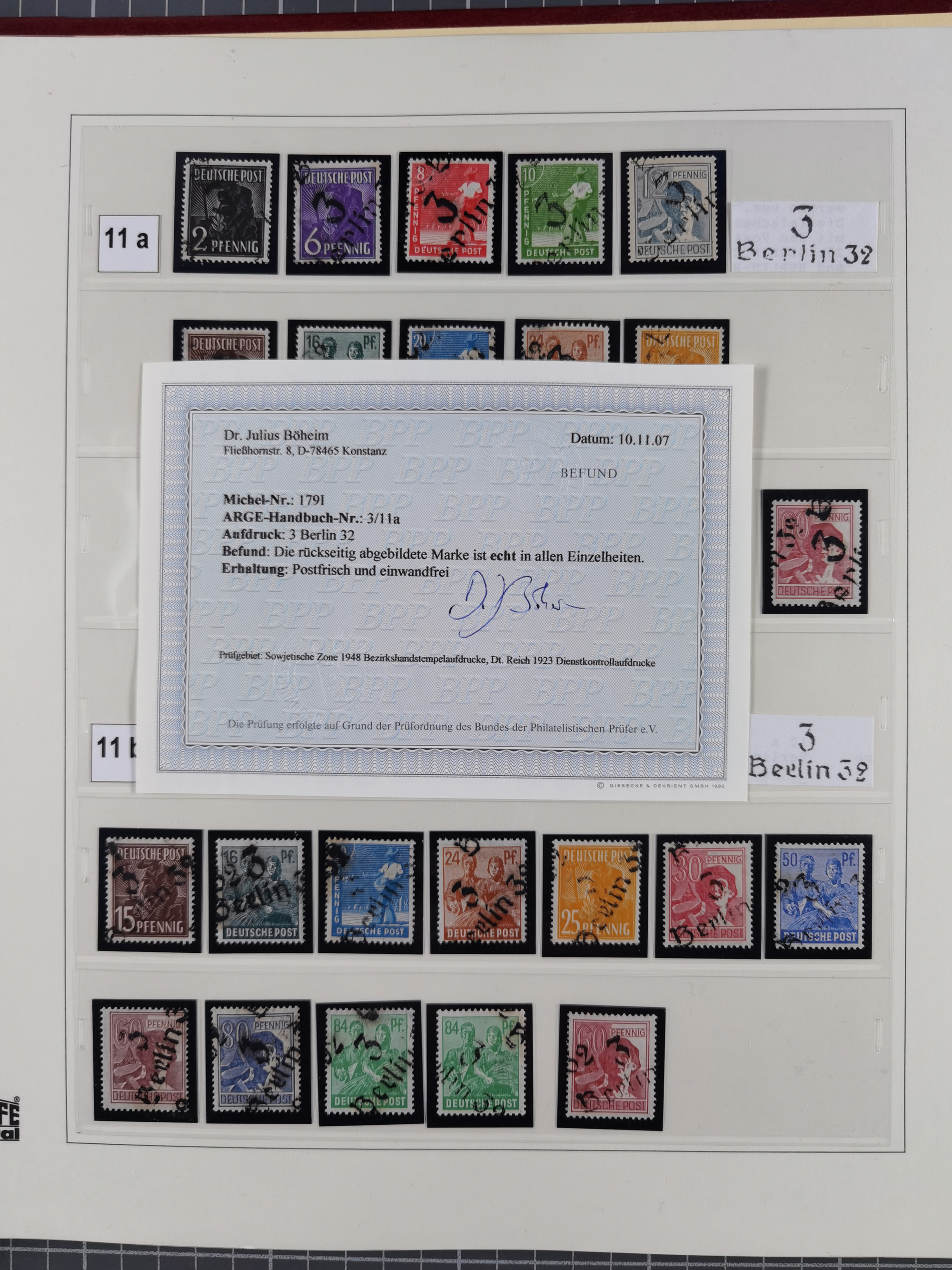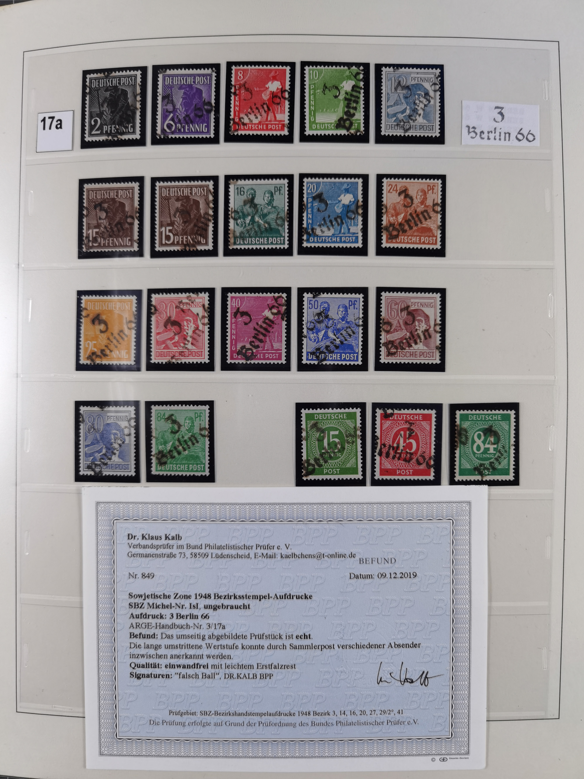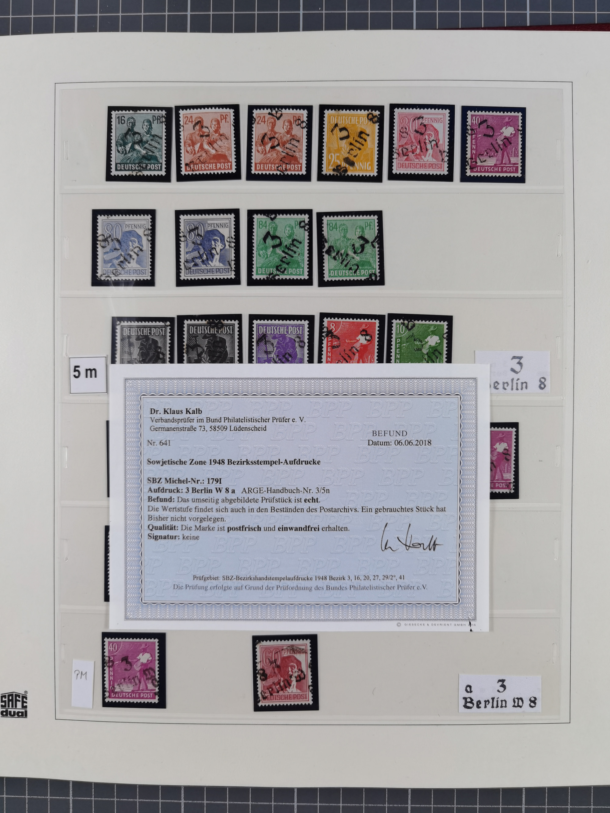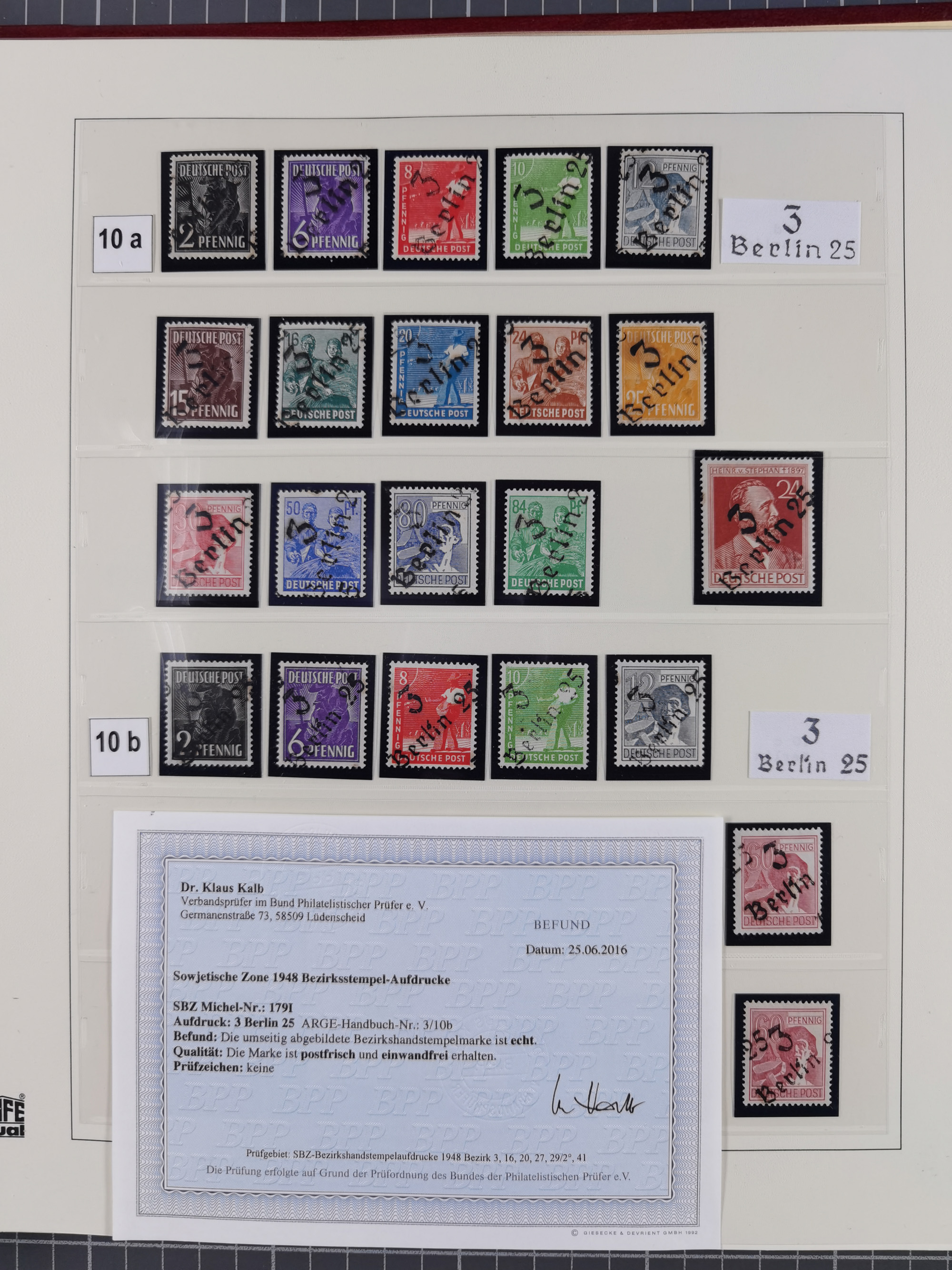 1948, sehr reichhaltige fast ausschließlich postfrische Material-Sammlung des Bezirk 3 mit vielen hunderten Marken sauber sortiert nach Handstempelvarianten, inkl. 45 Ganzsachen, dabei viele kpl. Ausgaben, seltene Handstempel sowie bessere Wertstufen, dabei u.a. schablonierte Aufdrucke, farbige Aufdrucke, Marken aus Postmuseumsbeständen aus z.B. Biesdorf, Blankenburg, Buchholz, etc., ferner Mi.-Nr. 168I und 177I mit ARGE-Nr. 39a aus Postmuseumsbestand, 174I mit 41f in violett, IIaIc, 170 mit 2e in violett, 179bI mit 2d ungebraucht, IIaI mit 18b, 179aI mit 36, IsI mit 36, IIdI mit 38b sowie 38d, 174I mit 41f in violett, 179aI mit 42b, sechs Werte mit seltenem 49a (5) bzw. 49b (1), etc. etc., insgesamt über 40 Exemplare Mi.-Nr. 179Ia sowie 10 Exemplare Mi.-Nr. IIdI, fast ausnahmslos sign. Busse BPP, Kalb BPP, Herbst BPP, Böheim BPP bzw. 38 Befunde und 2 Garantie-Atteste, wenige Fälschungen, gute Erhaltung, in drei Alben und auf Blättern