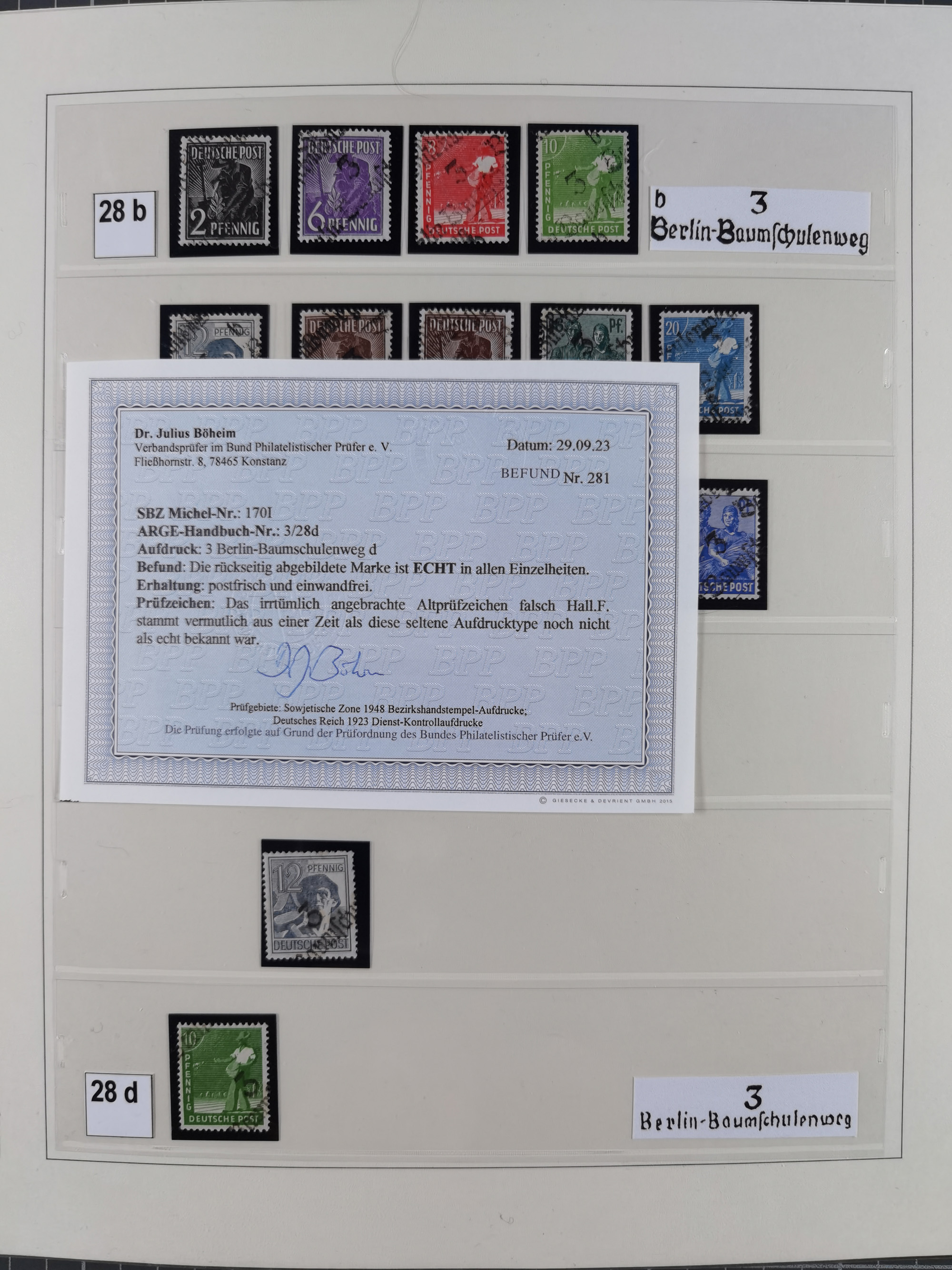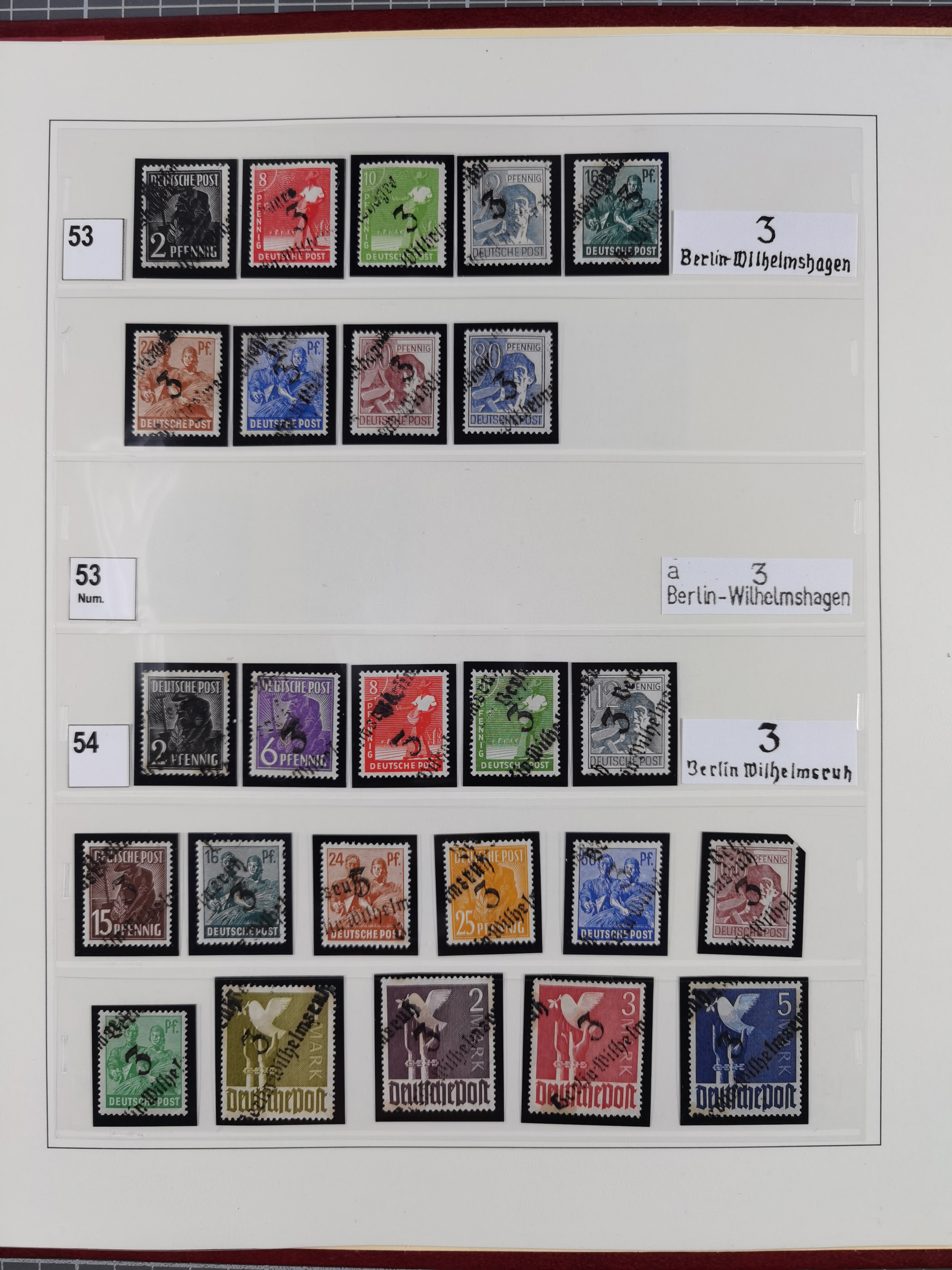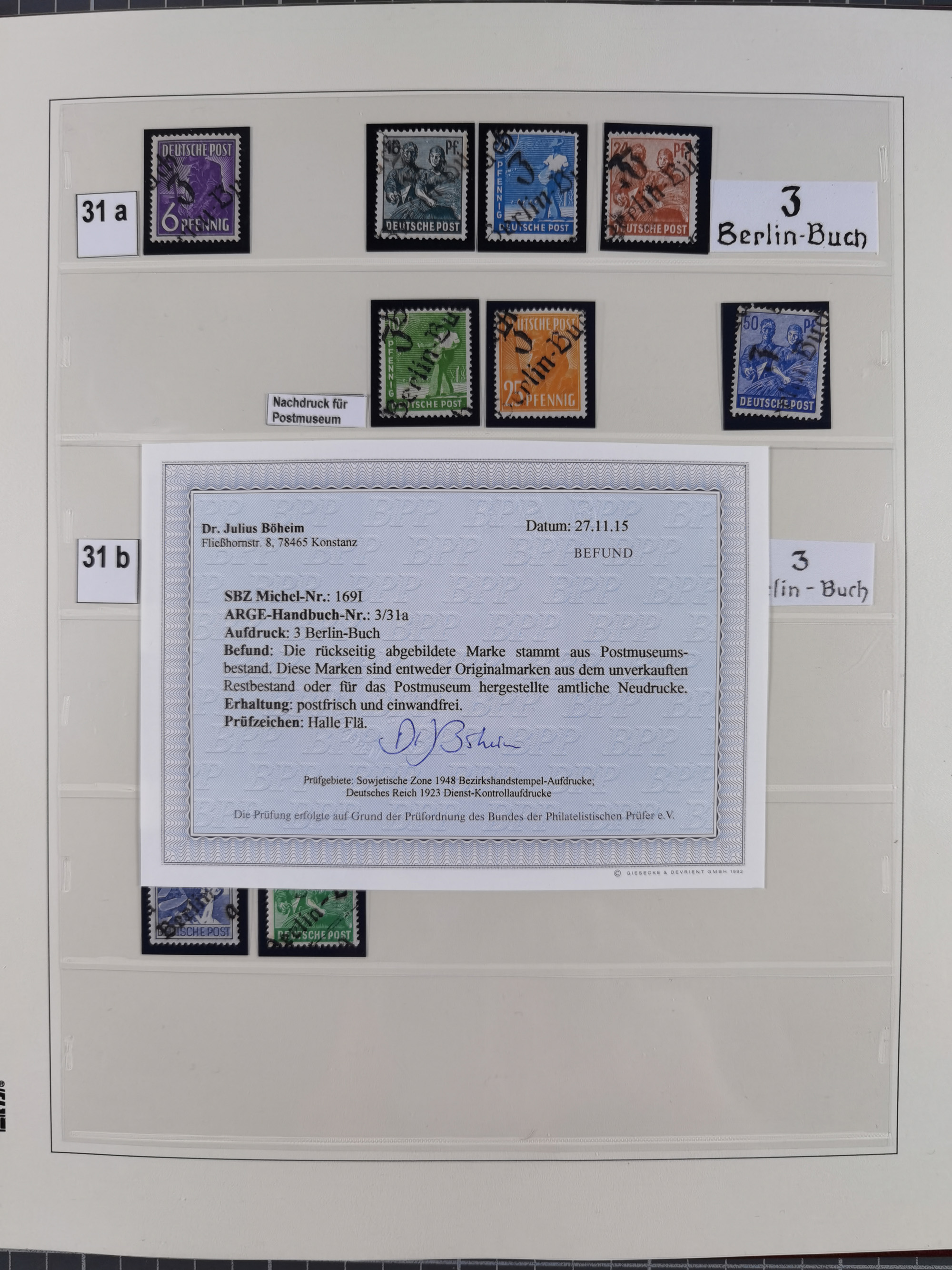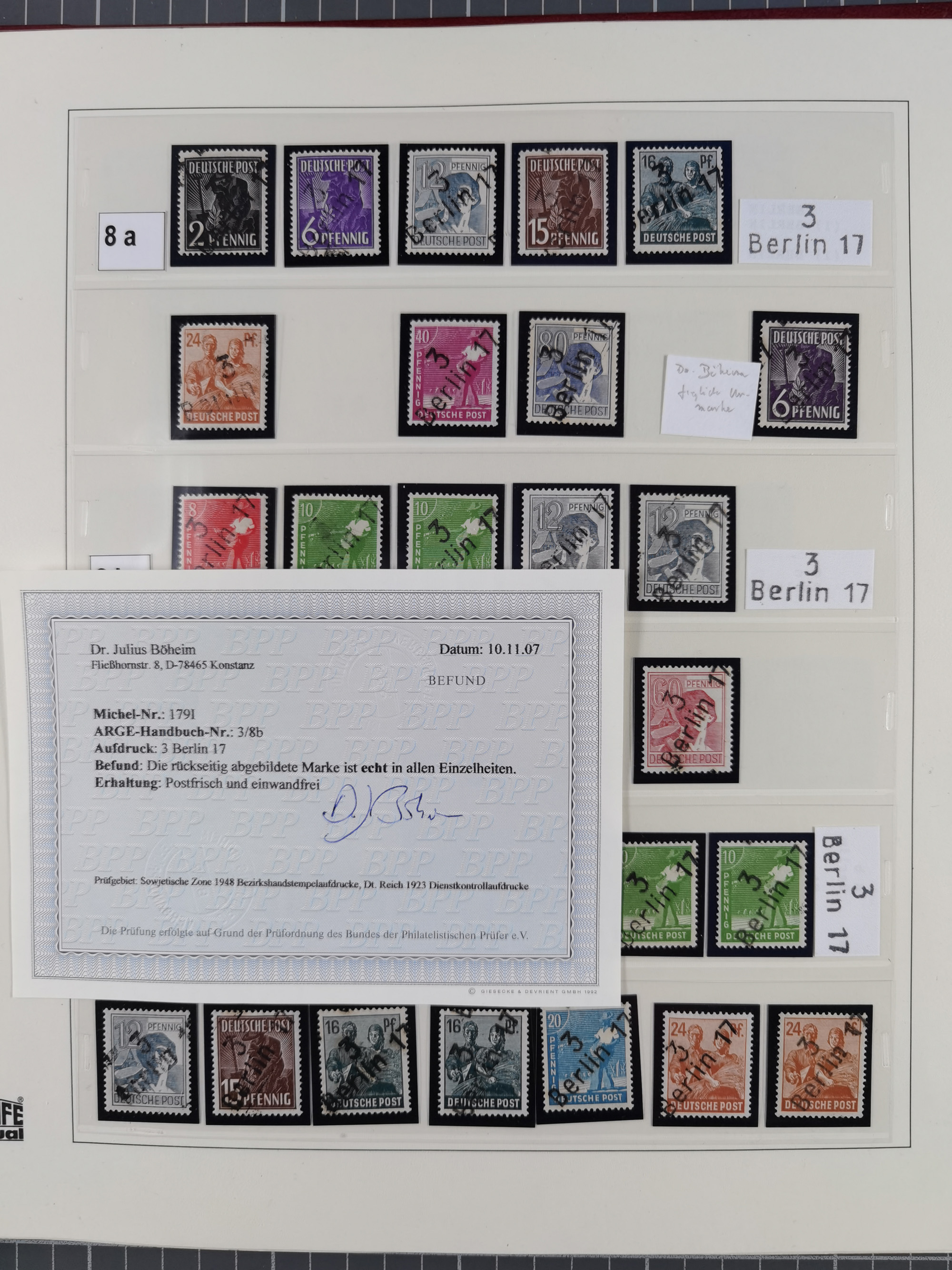 1948, sehr reichhaltige fast ausschließlich postfrische Material-Sammlung des Bezirk 3 mit vielen hunderten Marken sauber sortiert nach Handstempelvarianten, inkl. 45 Ganzsachen, dabei viele kpl. Ausgaben, seltene Handstempel sowie bessere Wertstufen, dabei u.a. schablonierte Aufdrucke, farbige Aufdrucke, Marken aus Postmuseumsbeständen aus z.B. Biesdorf, Blankenburg, Buchholz, etc., ferner Mi.-Nr. 168I und 177I mit ARGE-Nr. 39a aus Postmuseumsbestand, 174I mit 41f in violett, IIaIc, 170 mit 2e in violett, 179bI mit 2d ungebraucht, IIaI mit 18b, 179aI mit 36, IsI mit 36, IIdI mit 38b sowie 38d, 174I mit 41f in violett, 179aI mit 42b, sechs Werte mit seltenem 49a (5) bzw. 49b (1), etc. etc., insgesamt über 40 Exemplare Mi.-Nr. 179Ia sowie 10 Exemplare Mi.-Nr. IIdI, fast ausnahmslos sign. Busse BPP, Kalb BPP, Herbst BPP, Böheim BPP bzw. 38 Befunde und 2 Garantie-Atteste, wenige Fälschungen, gute Erhaltung, in drei Alben und auf Blättern