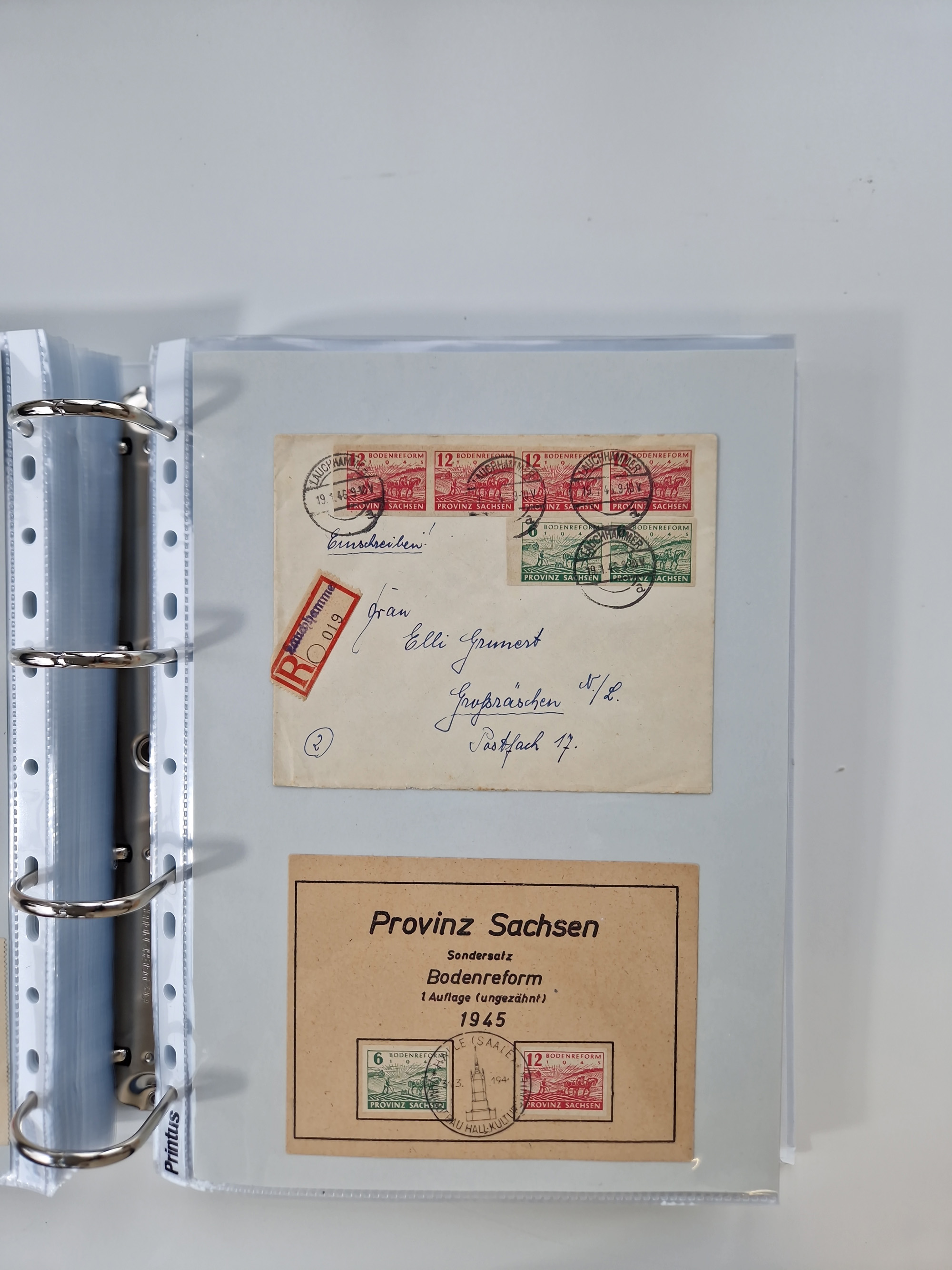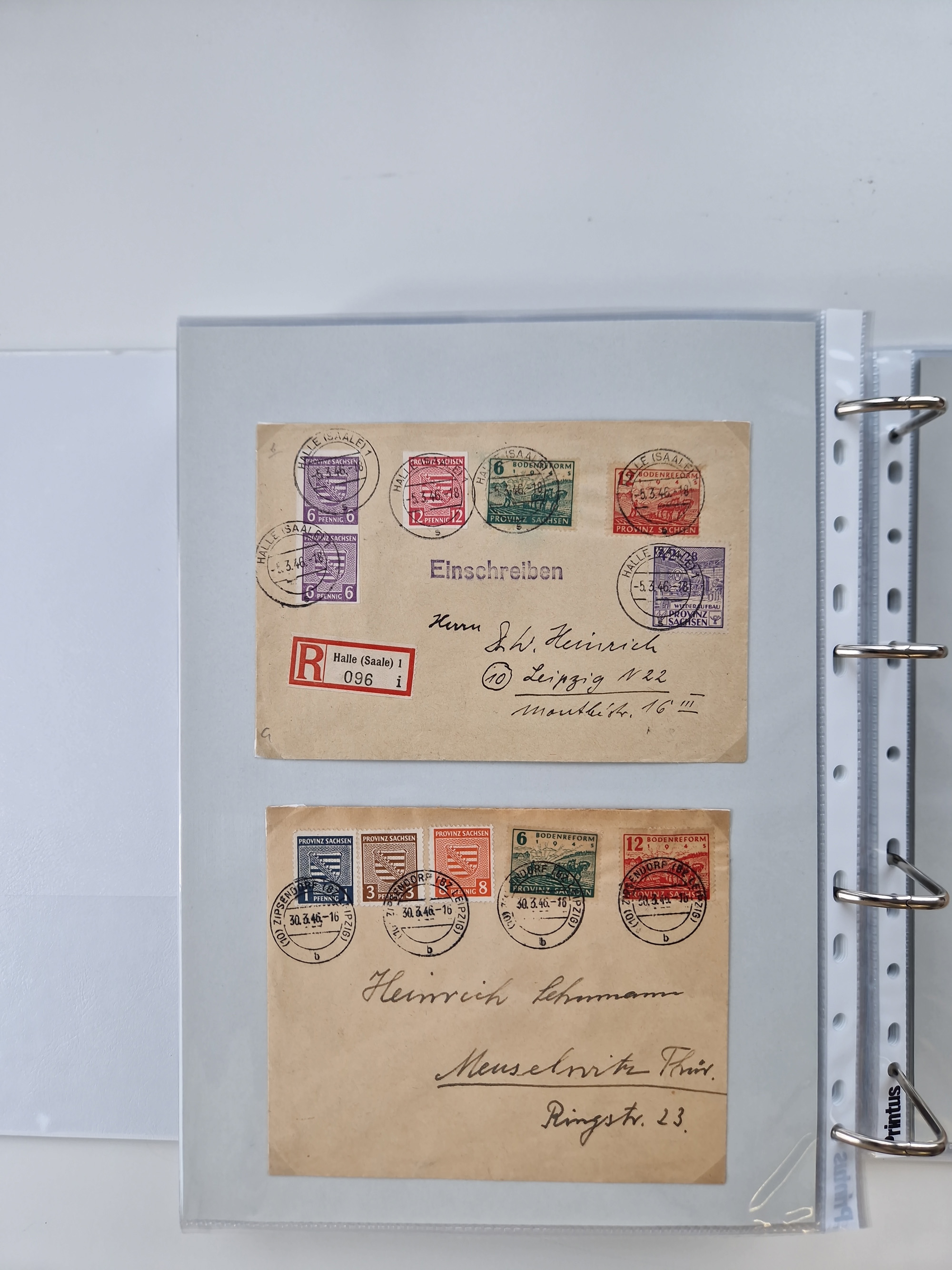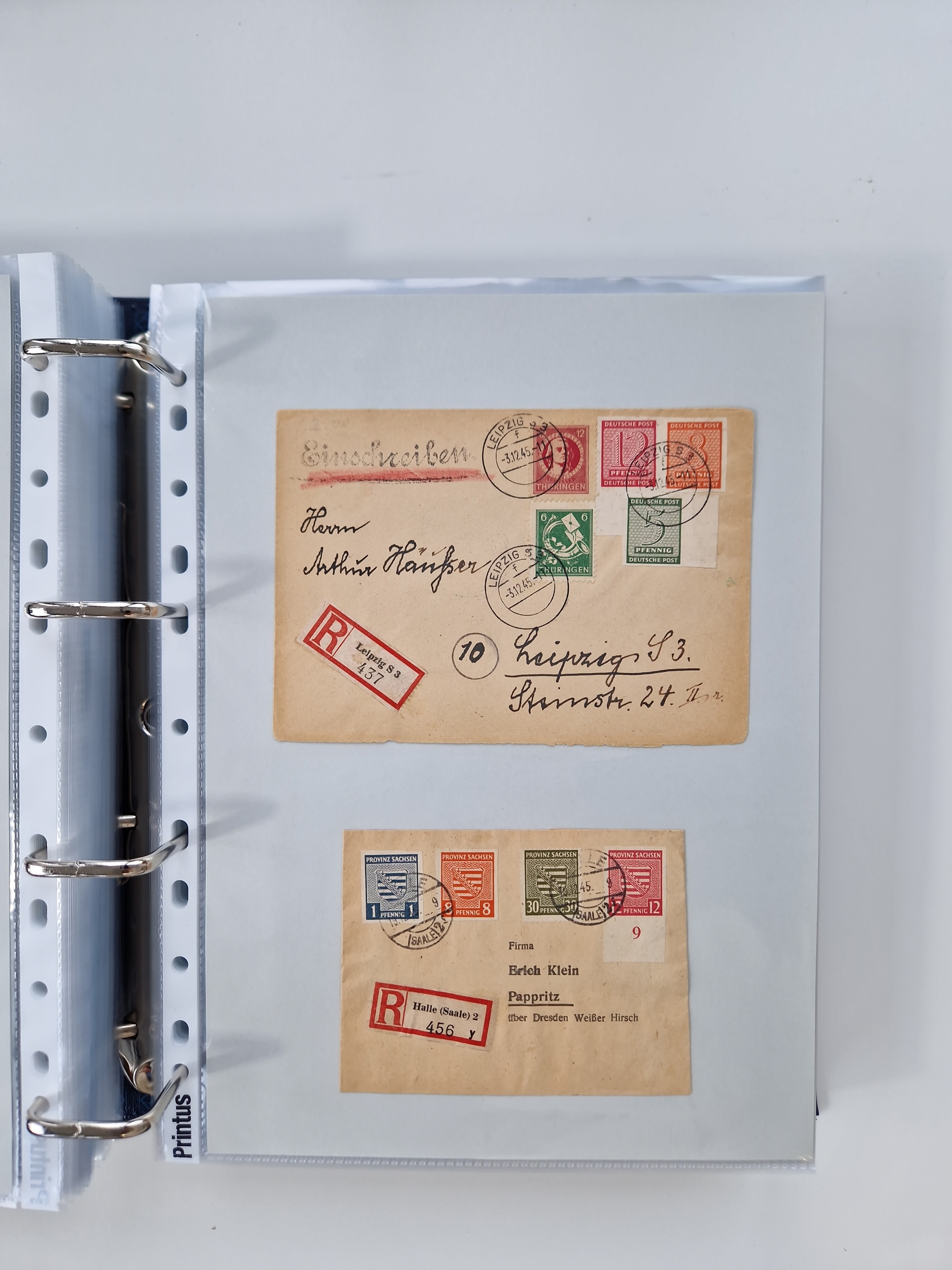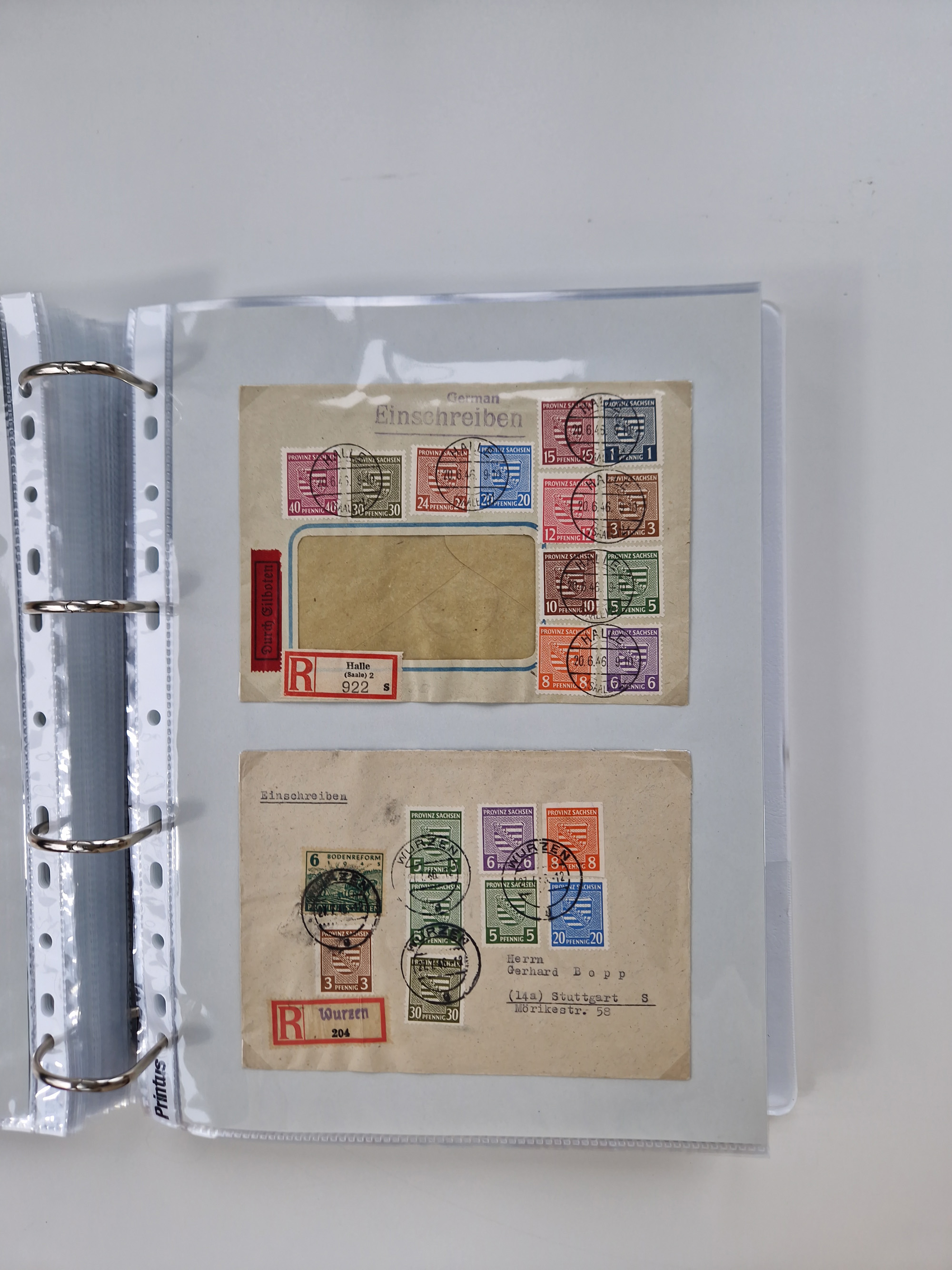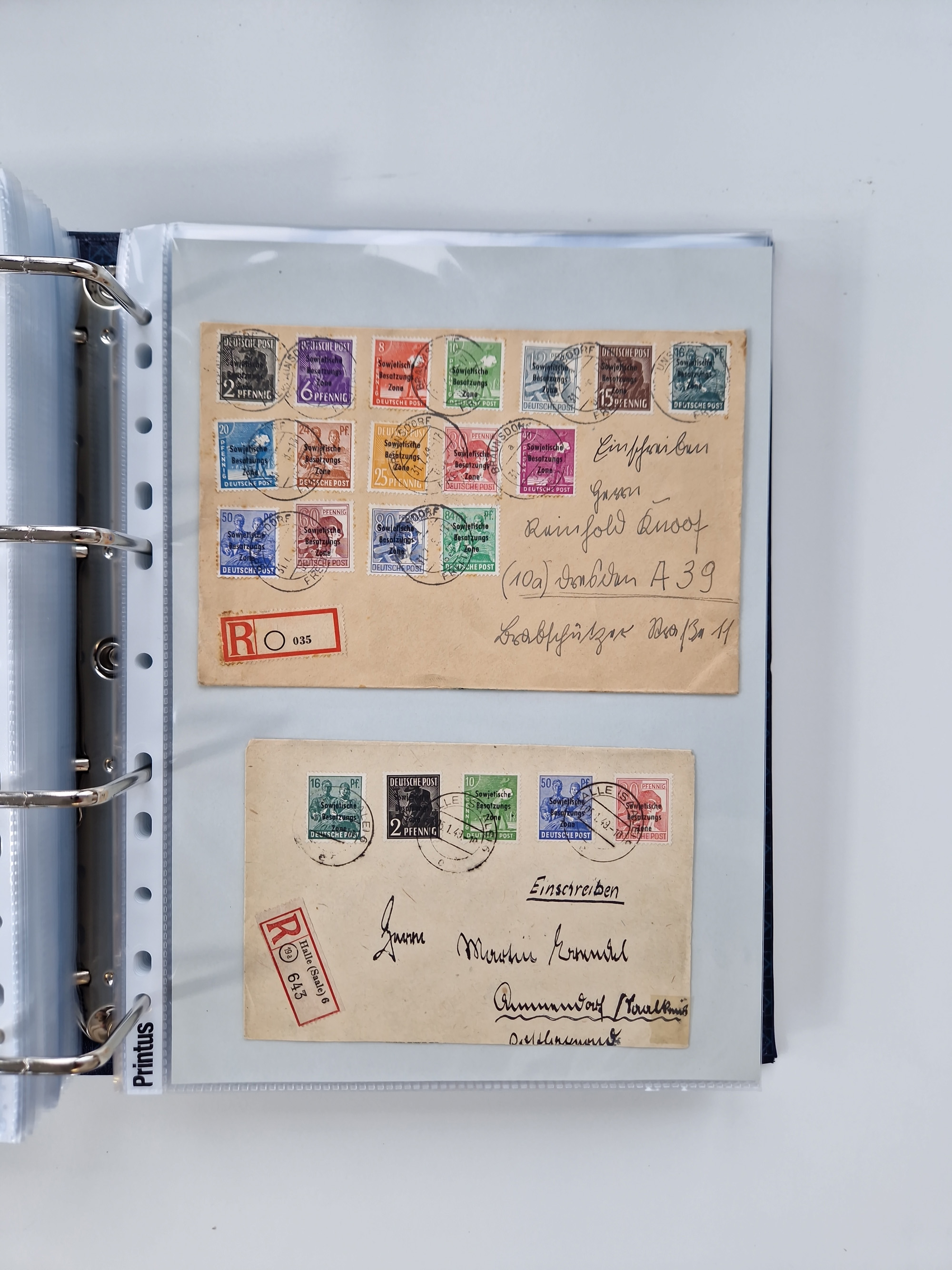 1945/48, geschätzt 200-300 Briefe mit Sammlerpost, vielen R-Briefen, mehrere Briefe mit POL-Lochungen aus Halle inkl. Briefe mit ZU, Notstempel, Gebühr bezahlt, Zensuren, Gebührenmeldung mit senkrechtem Paar Arbeiter 60 Pfg., Zehnfachfrankaturen mit Mehrfachfrankaturen bis 84 Pfg. und fünf R-Briefe mit Amts-R-Zettel von Bad Nauheim mit Buchstaben “B", “E”, “G” und “J” (einmal ohne Buchstaben), meist in guter Erhaltung