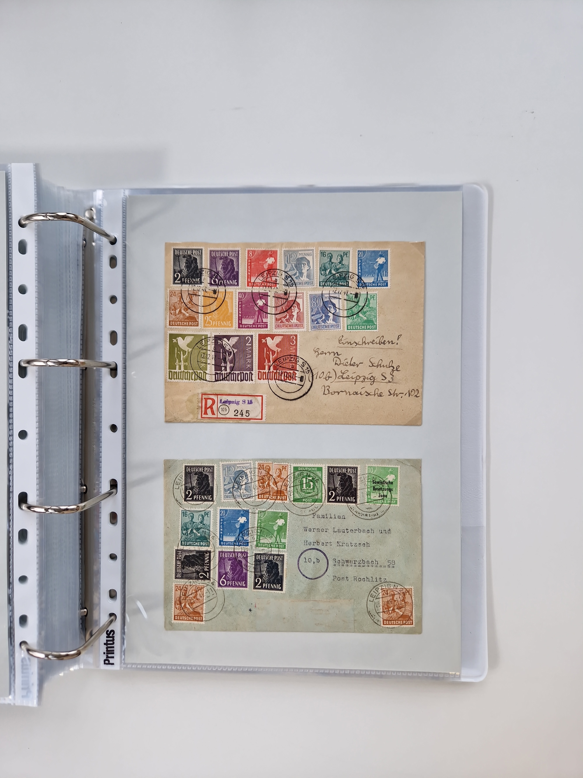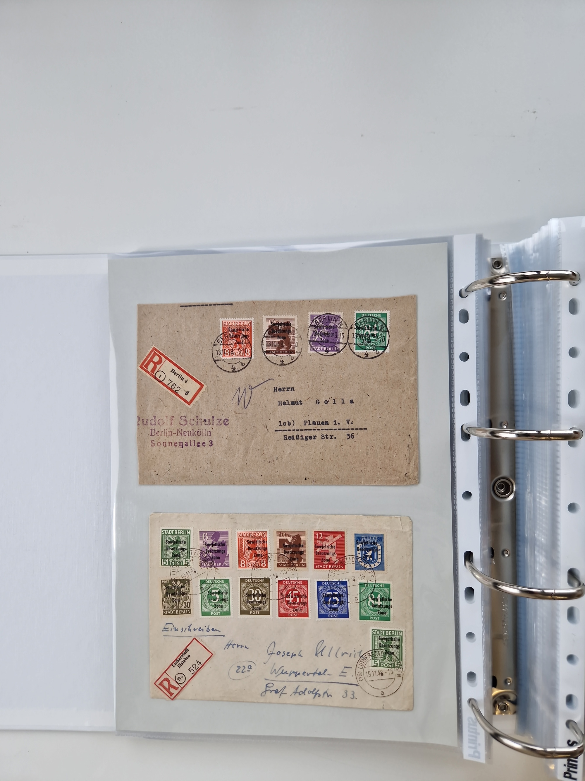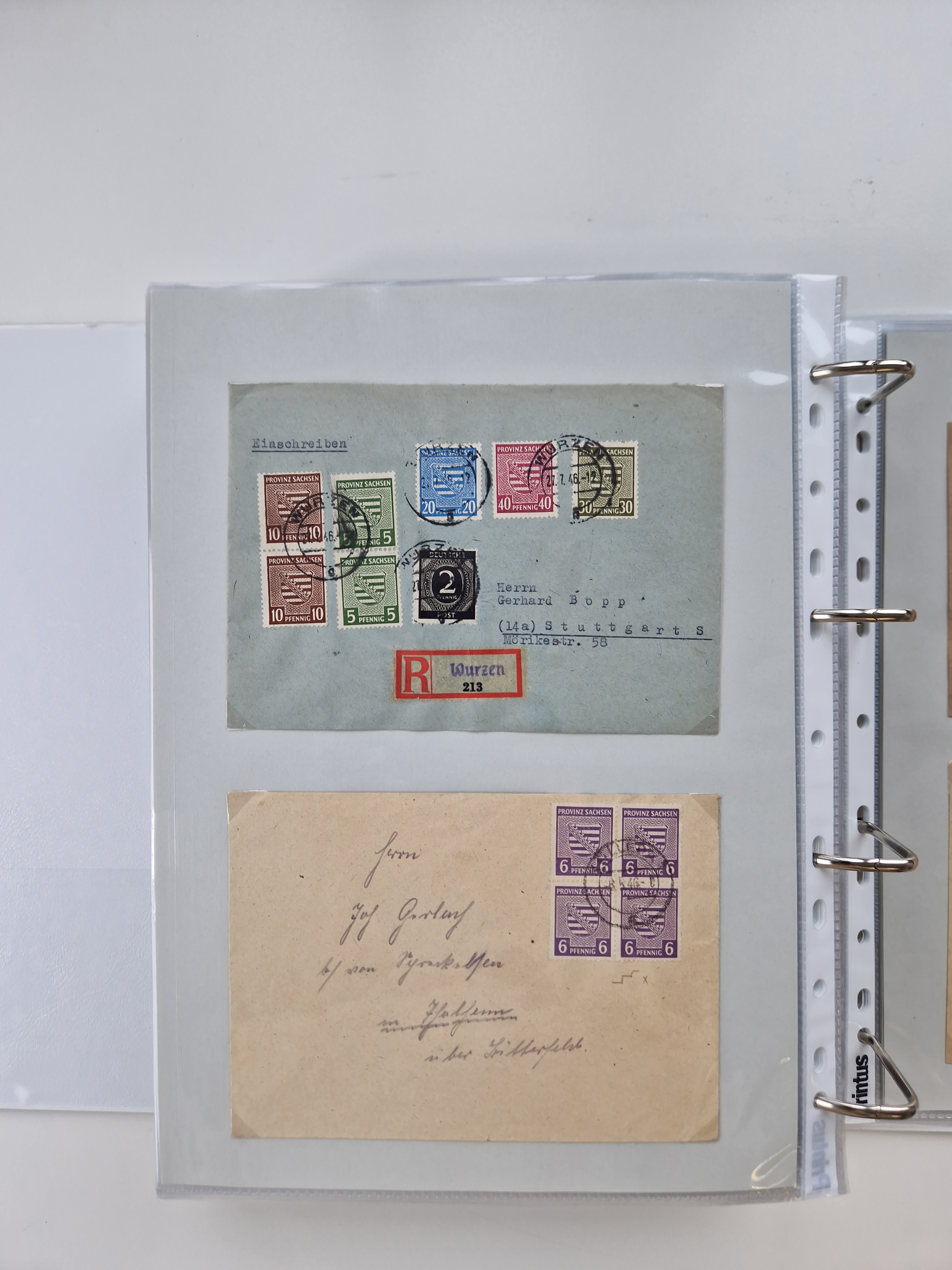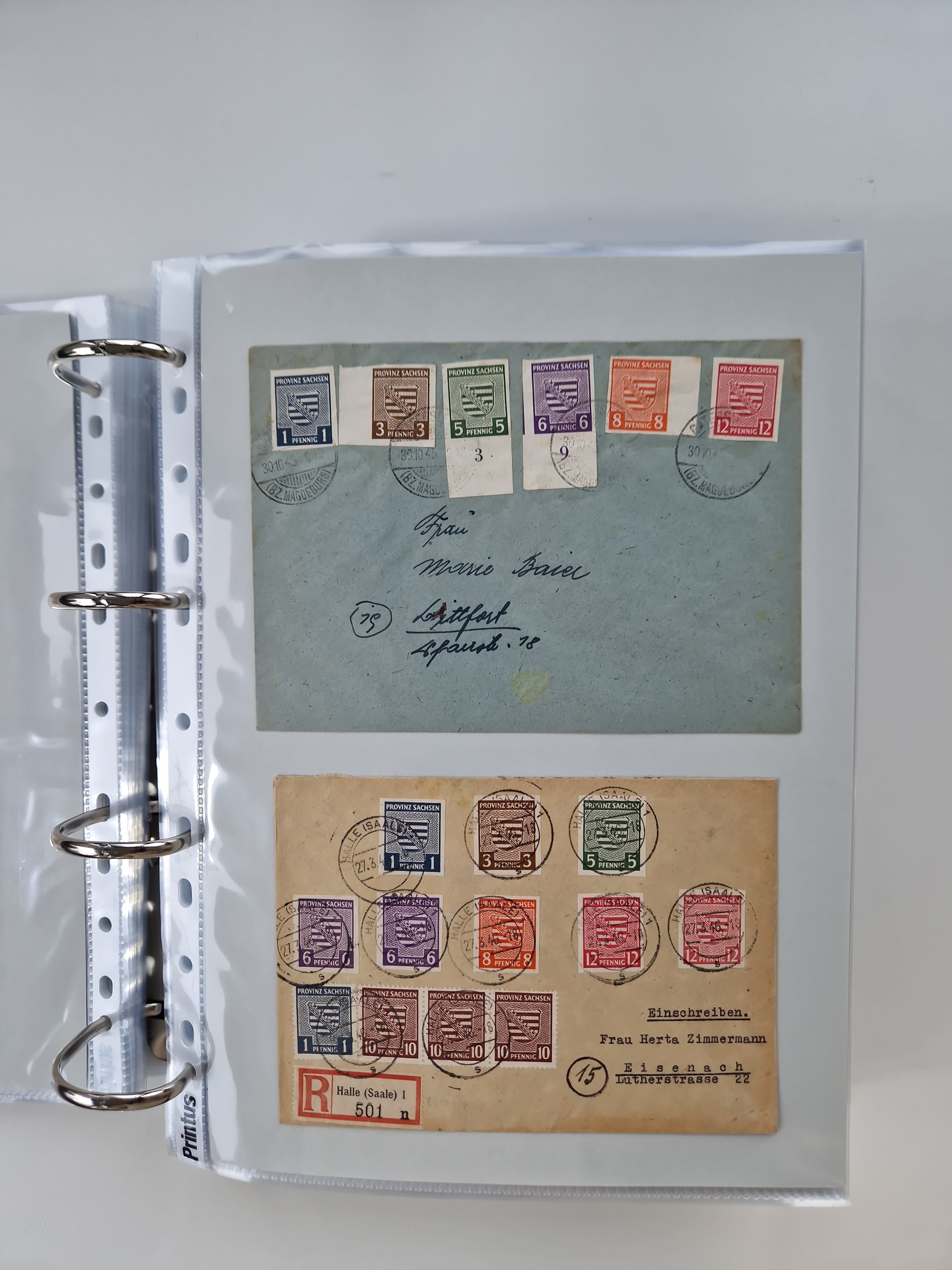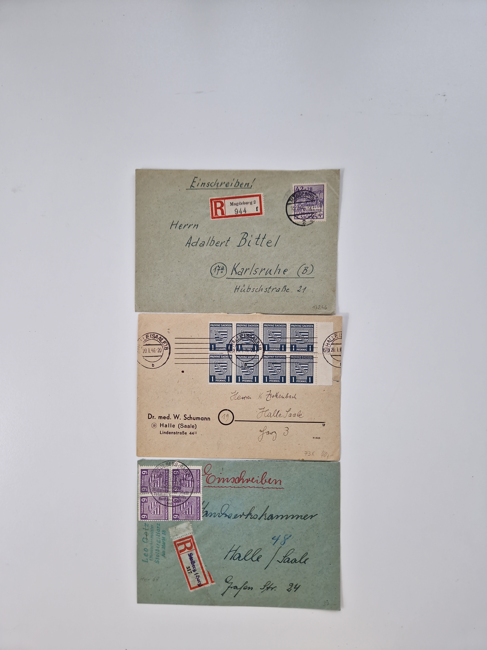 1945/48, geschätzt 200-300 Briefe mit Sammlerpost, vielen R-Briefen, mehrere Briefe mit POL-Lochungen aus Halle inkl. Briefe mit ZU, Notstempel, Gebühr bezahlt, Zensuren, Gebührenmeldung mit senkrechtem Paar Arbeiter 60 Pfg., Zehnfachfrankaturen mit Mehrfachfrankaturen bis 84 Pfg. und fünf R-Briefe mit Amts-R-Zettel von Bad Nauheim mit Buchstaben “B", “E”, “G” und “J” (einmal ohne Buchstaben), meist in guter Erhaltung