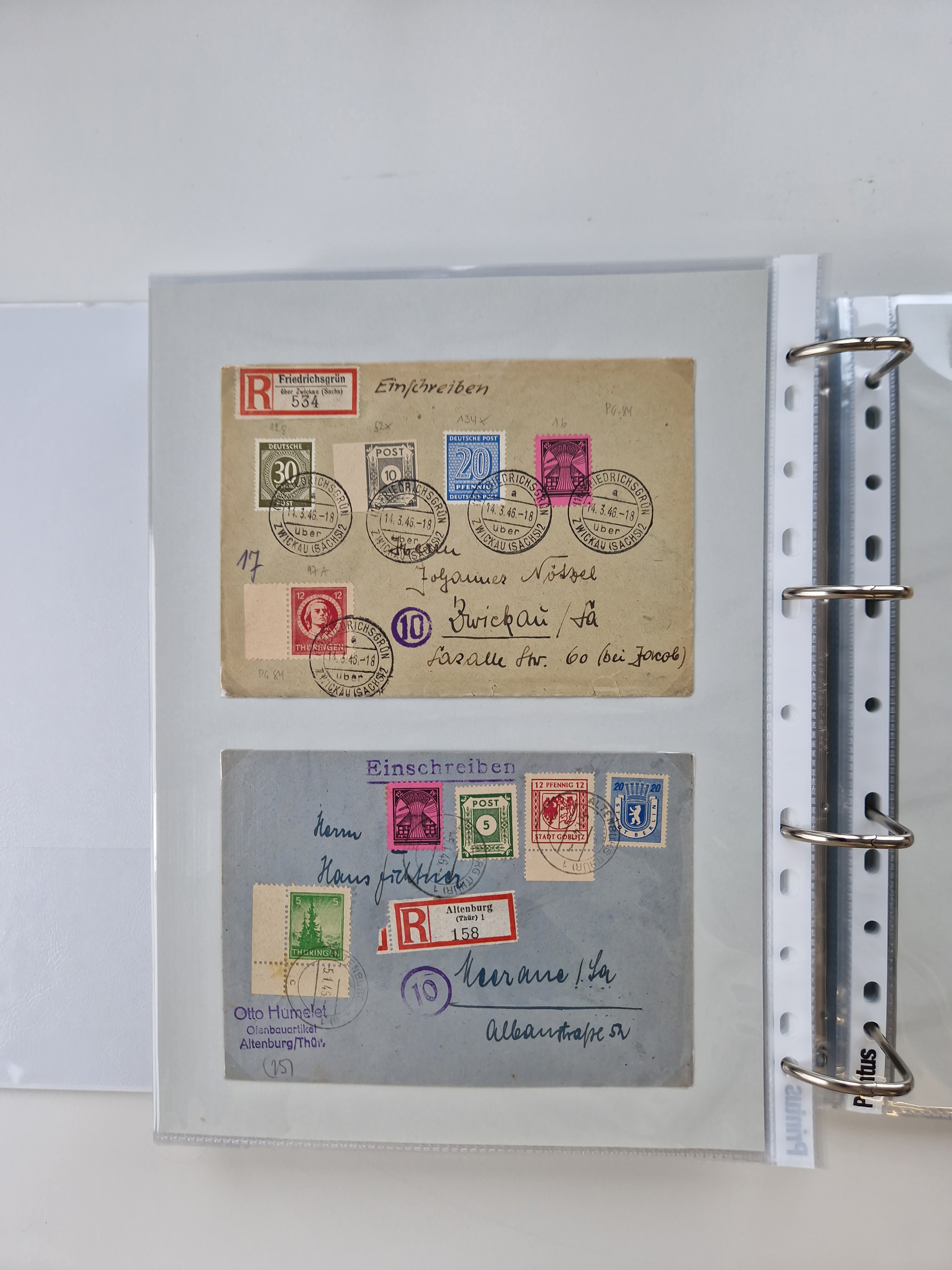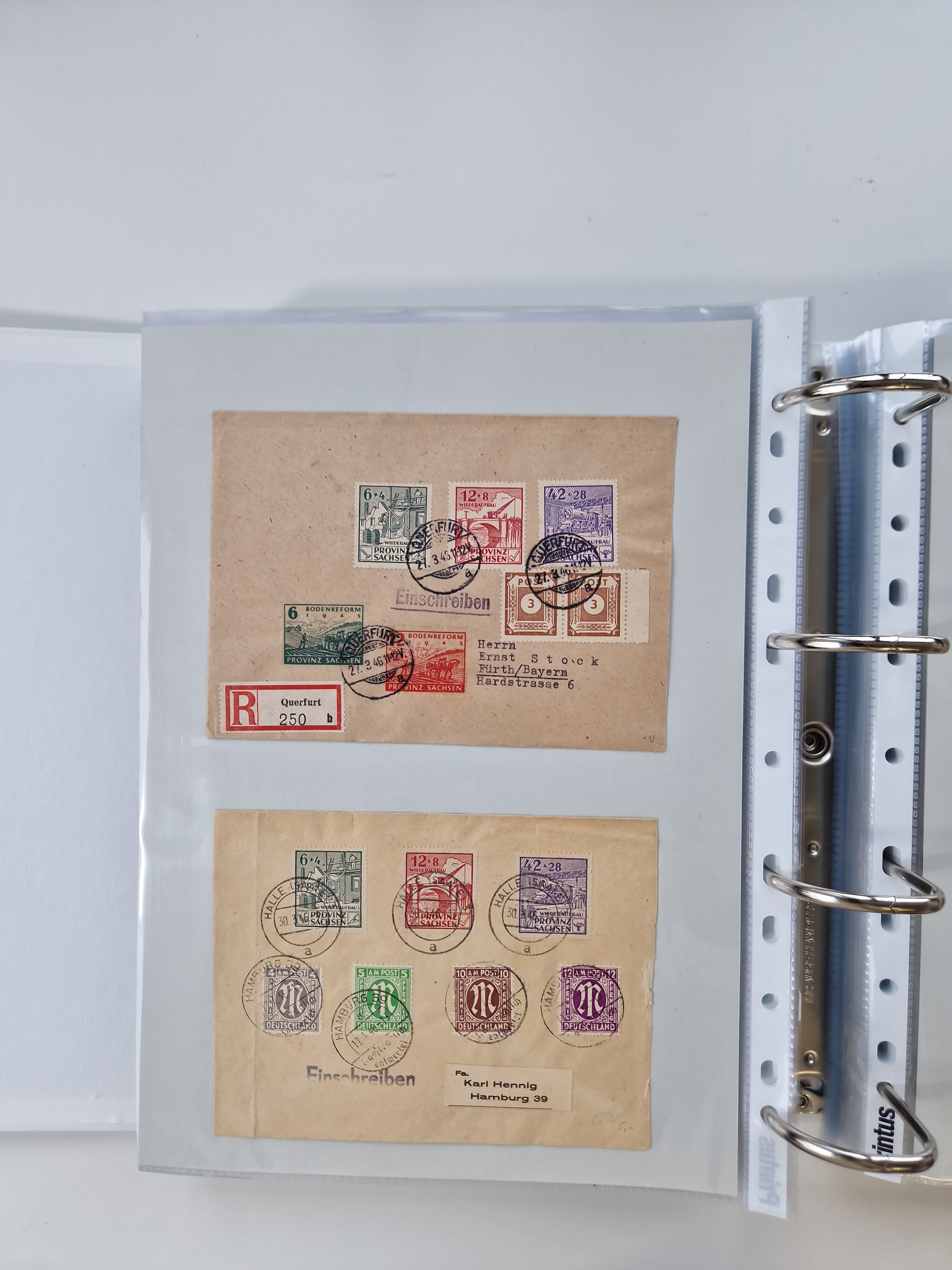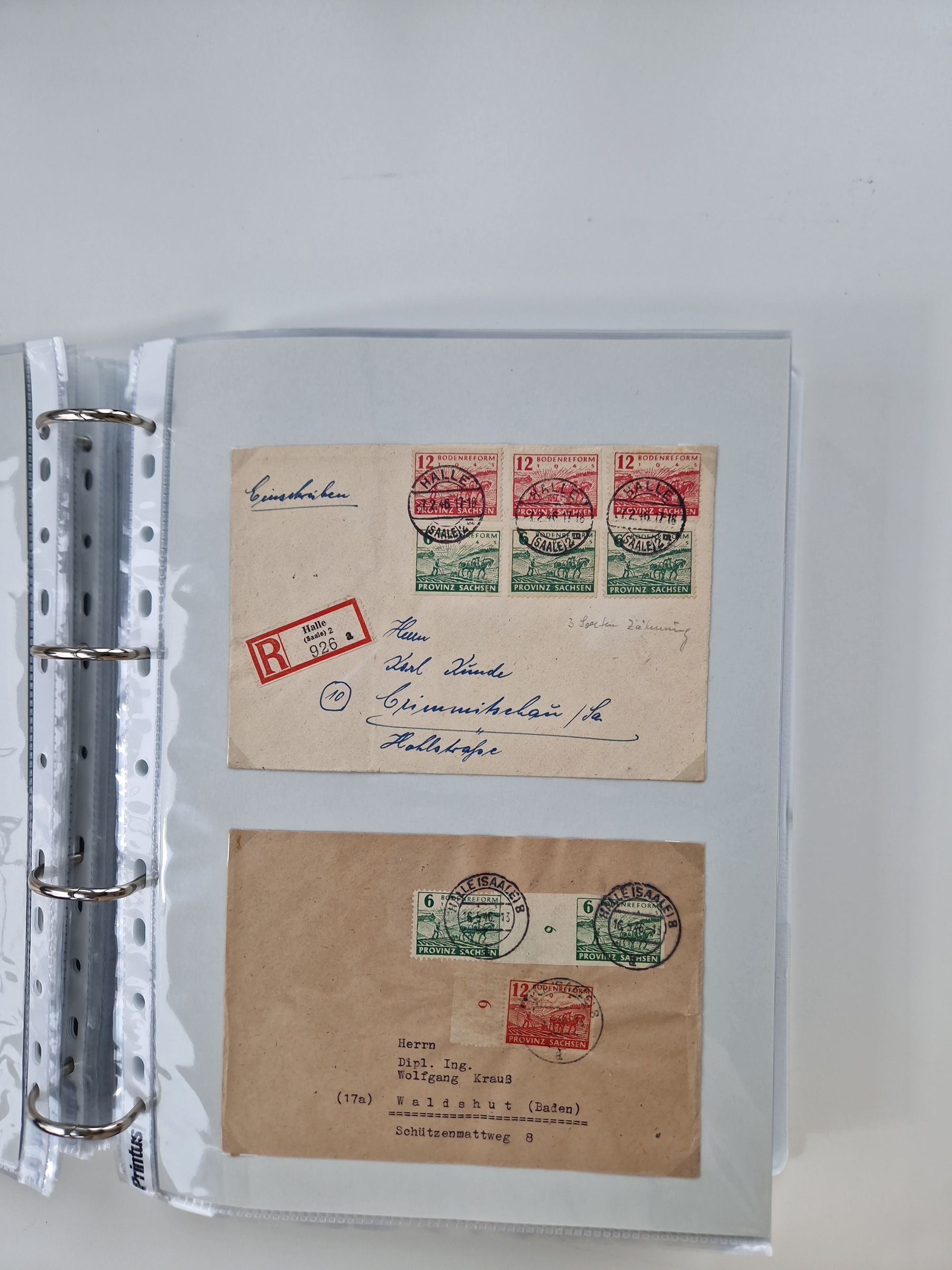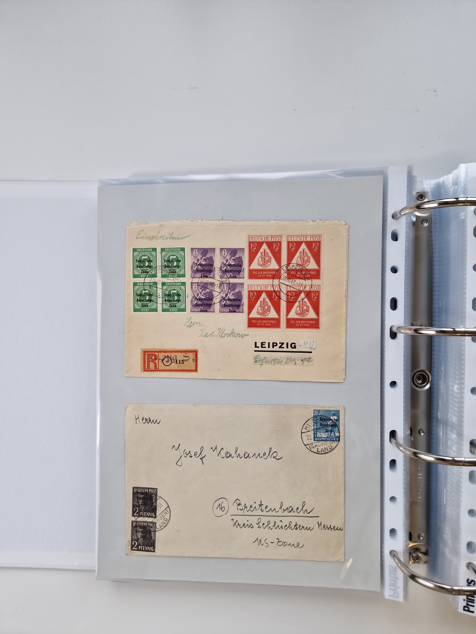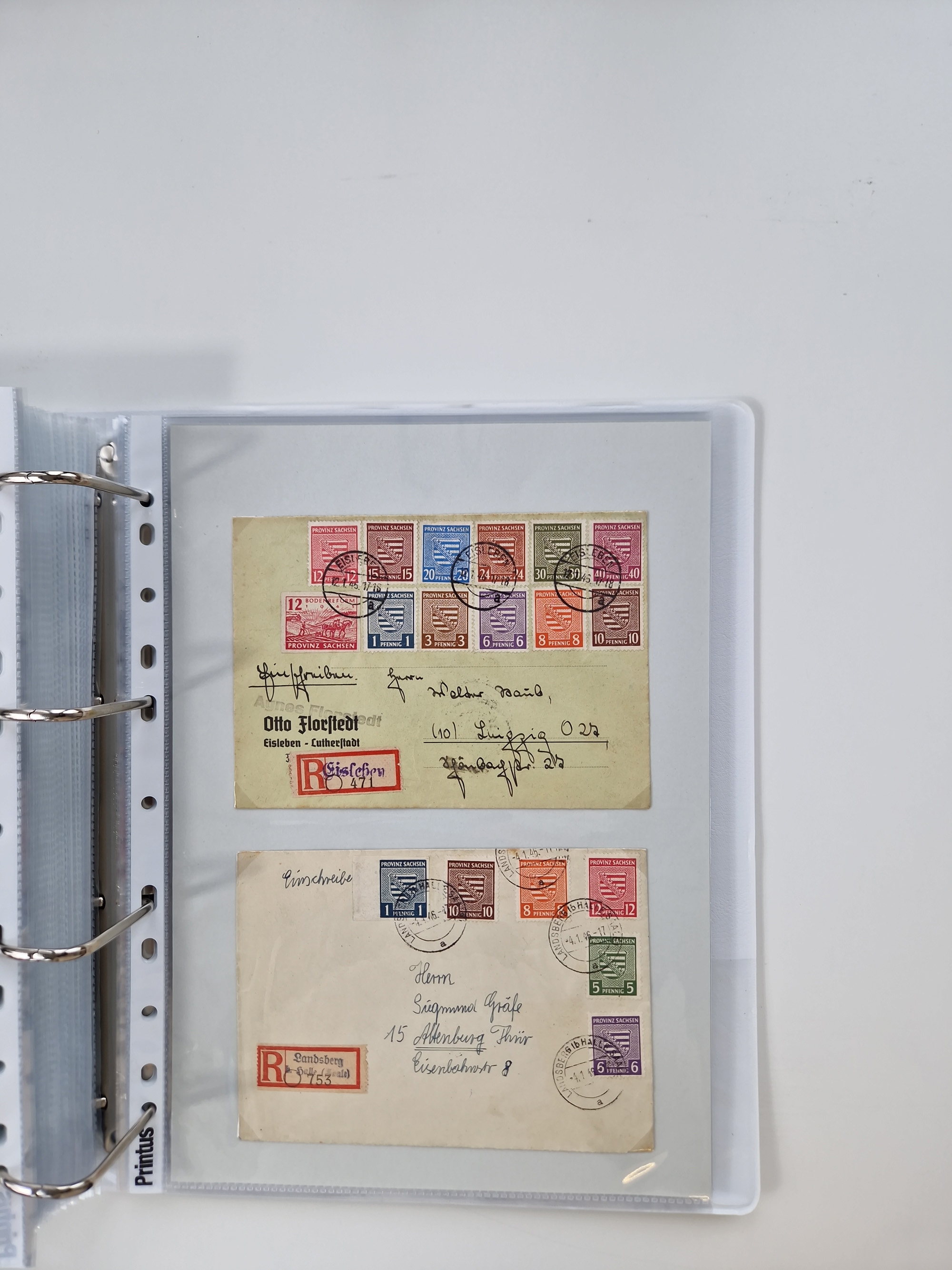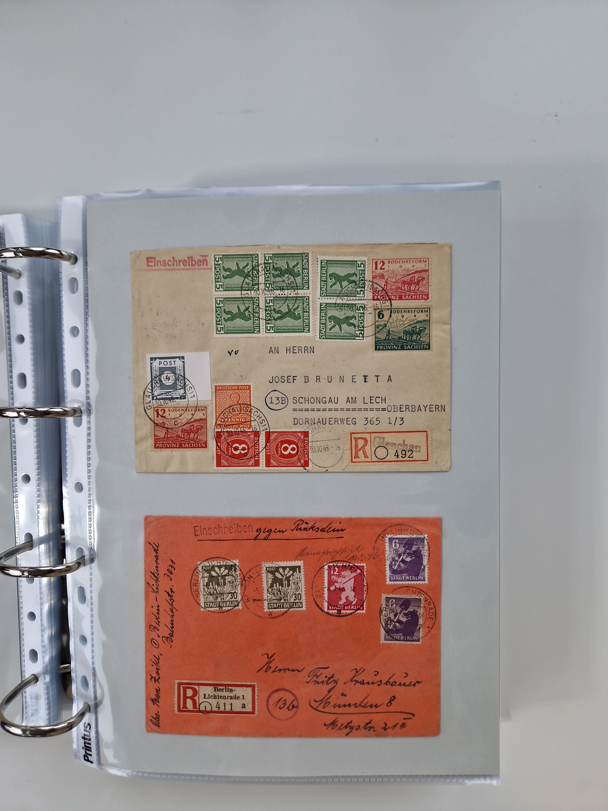 1945/48, geschätzt 200-300 Briefe mit Sammlerpost, vielen R-Briefen, mehrere Briefe mit POL-Lochungen aus Halle inkl. Briefe mit ZU, Notstempel, Gebühr bezahlt, Zensuren, Gebührenmeldung mit senkrechtem Paar Arbeiter 60 Pfg., Zehnfachfrankaturen mit Mehrfachfrankaturen bis 84 Pfg. und fünf R-Briefe mit Amts-R-Zettel von Bad Nauheim mit Buchstaben “B", “E”, “G” und “J” (einmal ohne Buchstaben), meist in guter Erhaltung