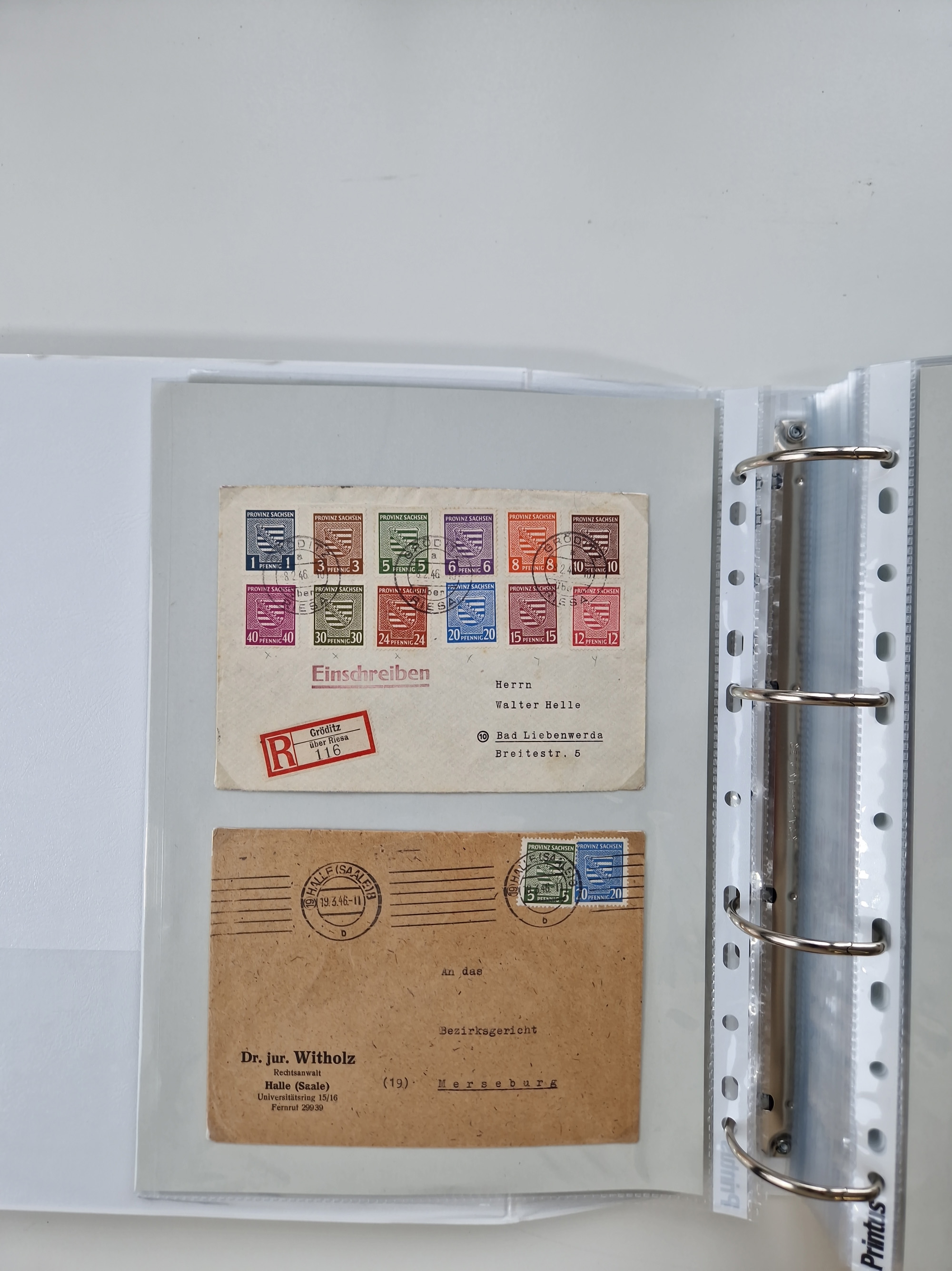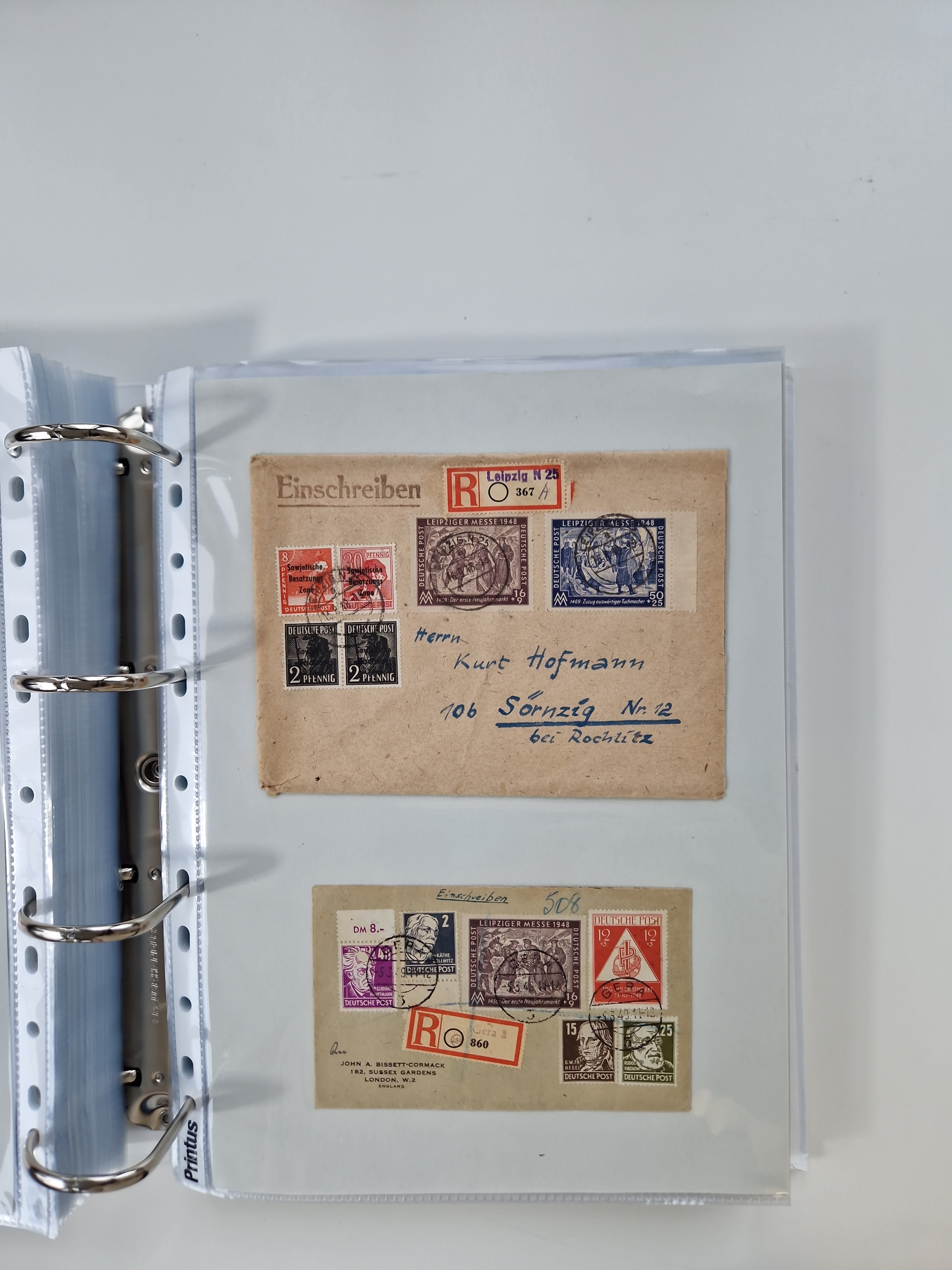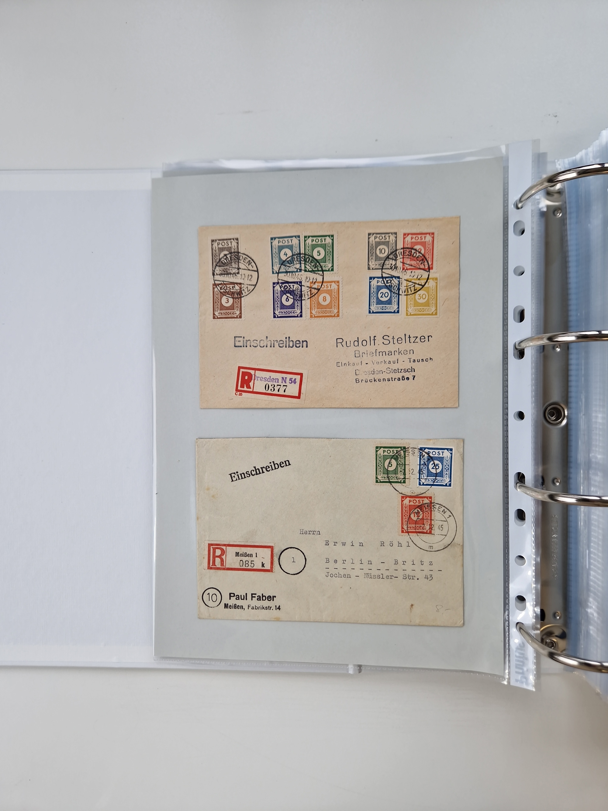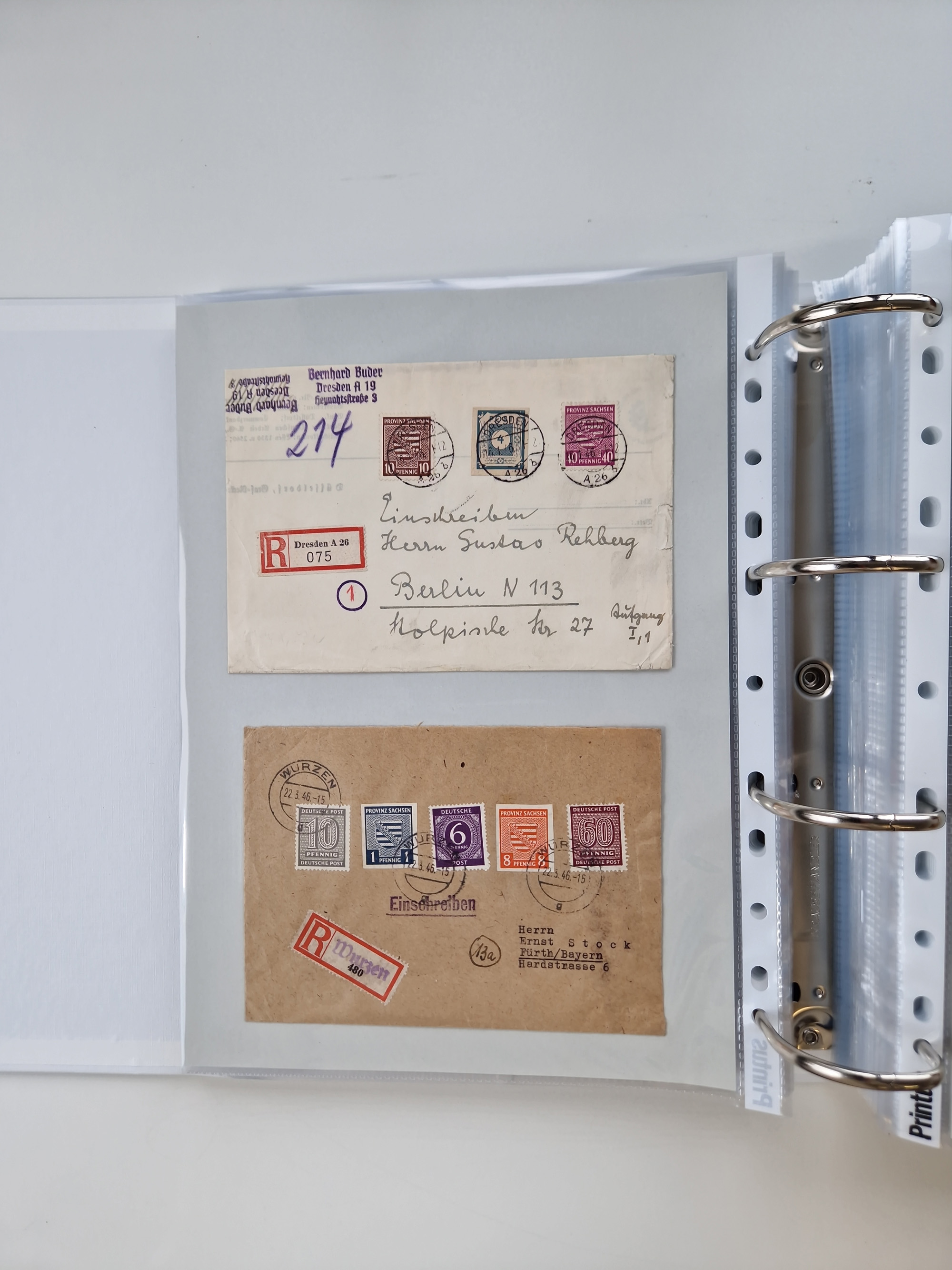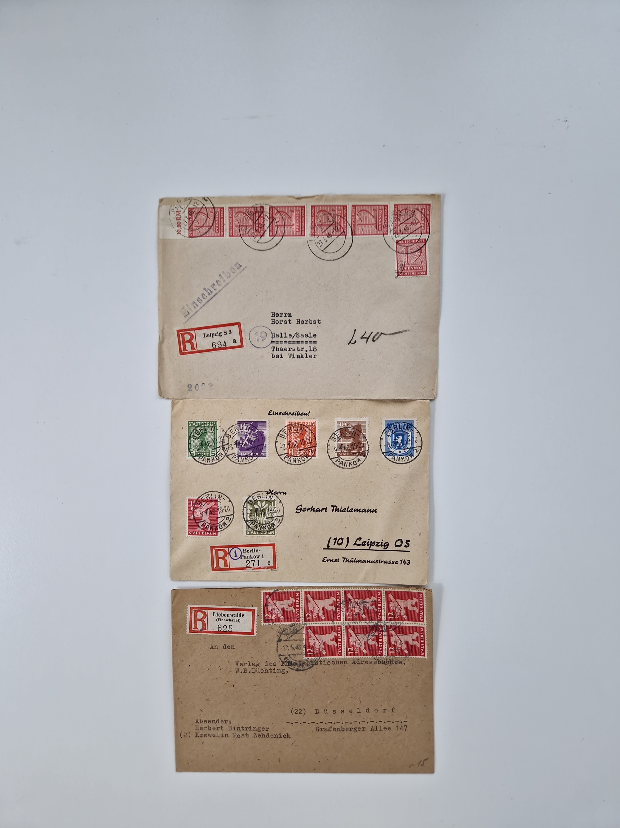 1945/48, geschätzt 200-300 Briefe mit Sammlerpost, vielen R-Briefen, mehrere Briefe mit POL-Lochungen aus Halle inkl. Briefe mit ZU, Notstempel, Gebühr bezahlt, Zensuren, Gebührenmeldung mit senkrechtem Paar Arbeiter 60 Pfg., Zehnfachfrankaturen mit Mehrfachfrankaturen bis 84 Pfg. und fünf R-Briefe mit Amts-R-Zettel von Bad Nauheim mit Buchstaben “B", “E”, “G” und “J” (einmal ohne Buchstaben), meist in guter Erhaltung