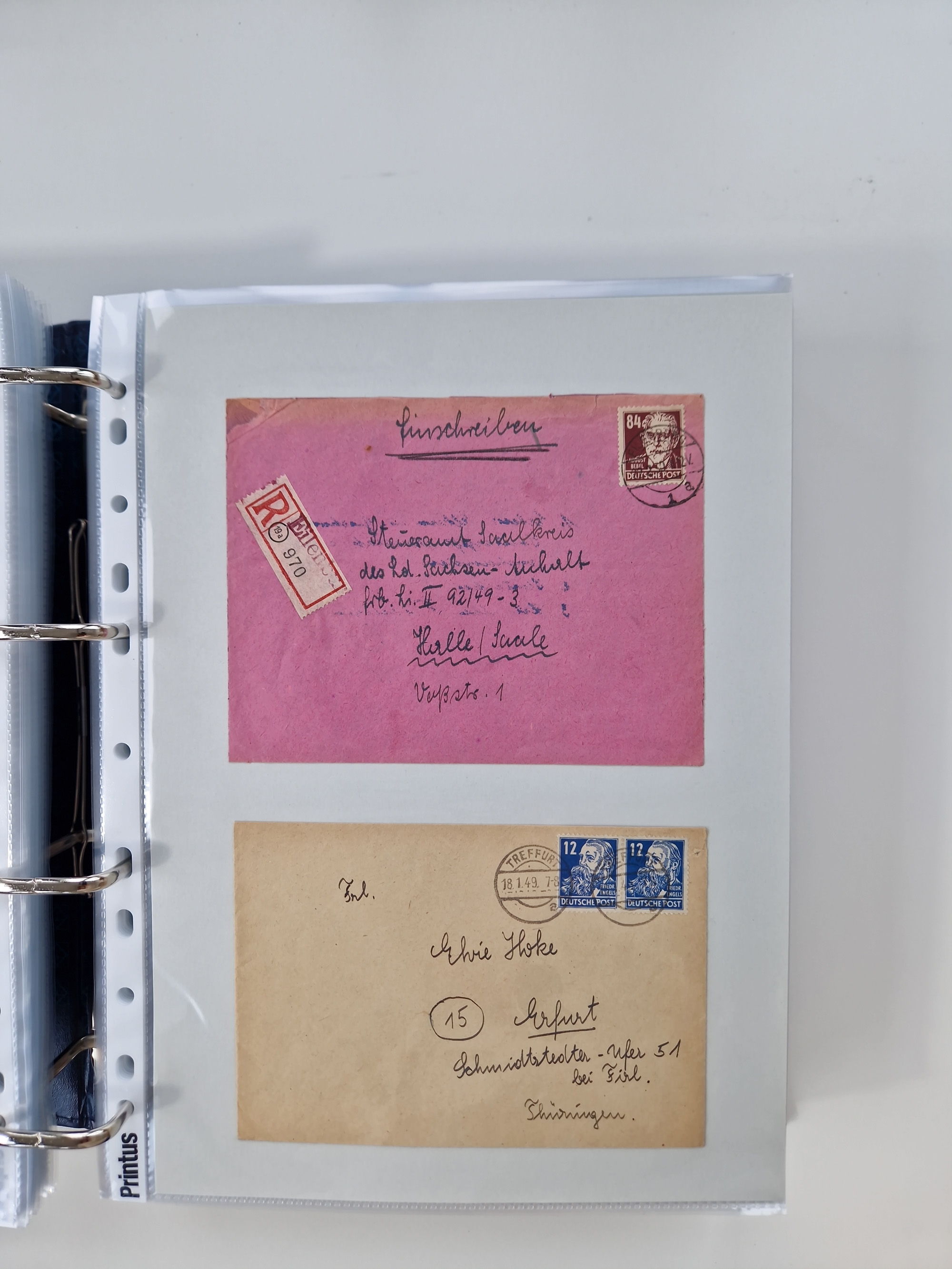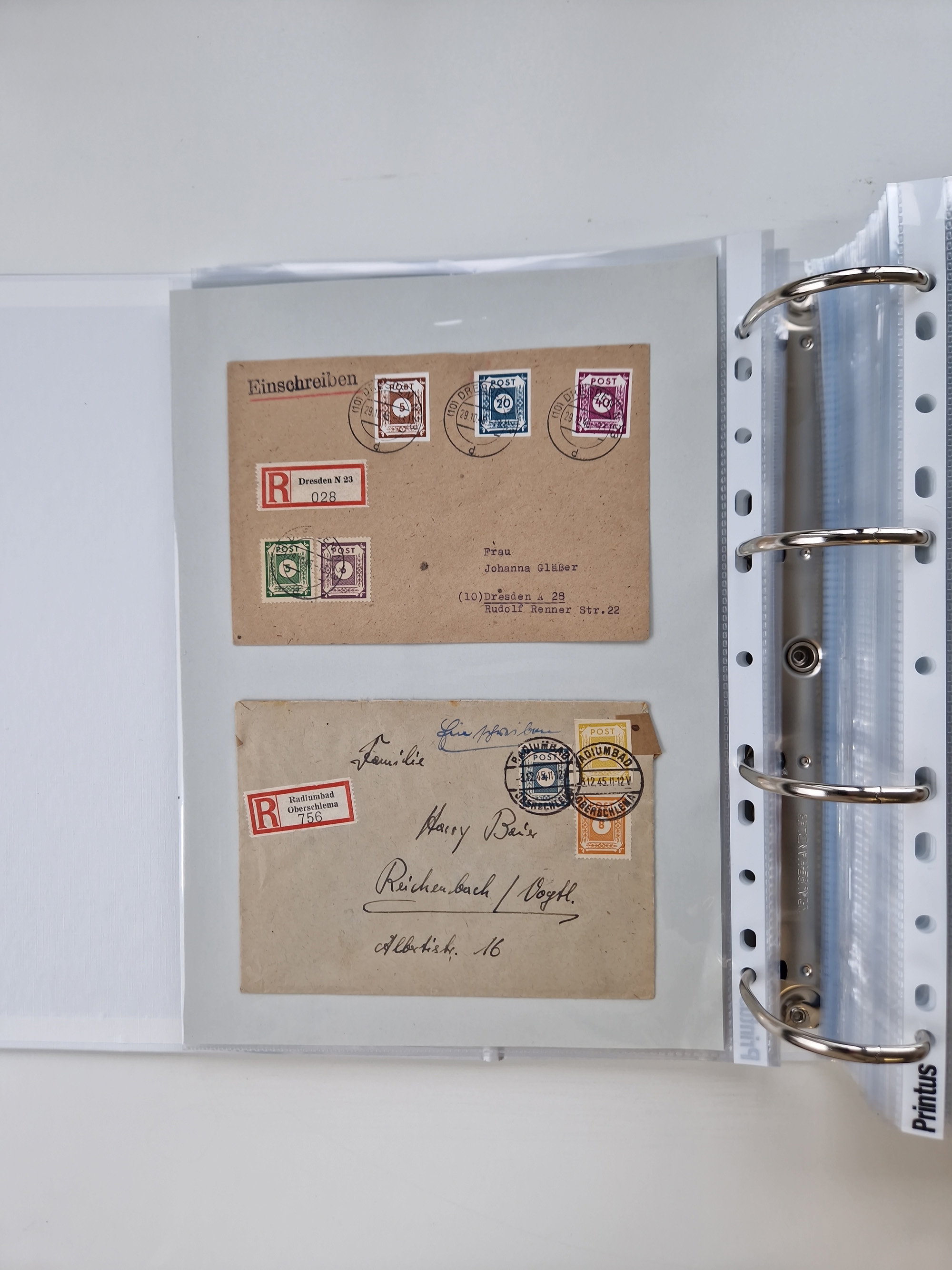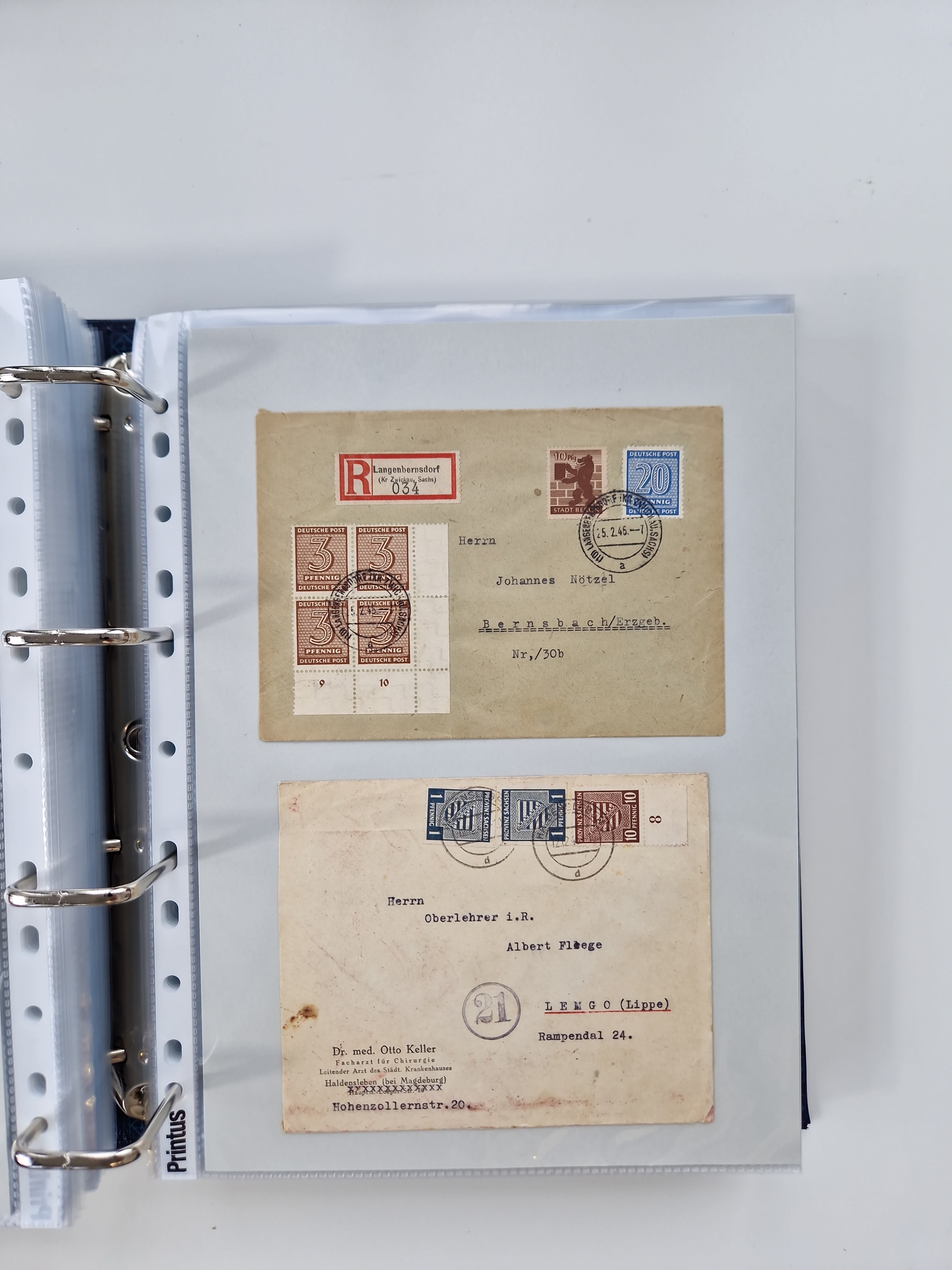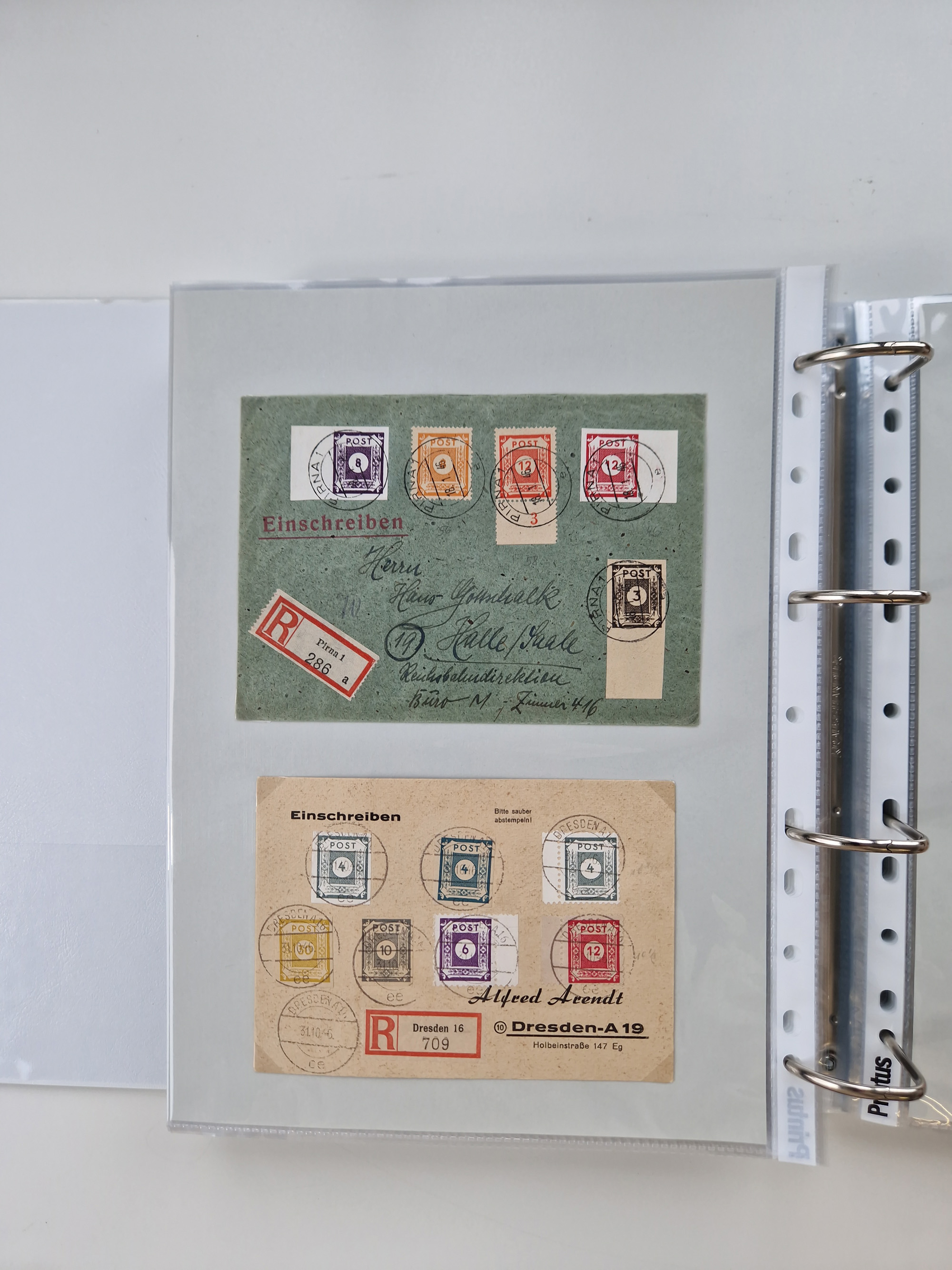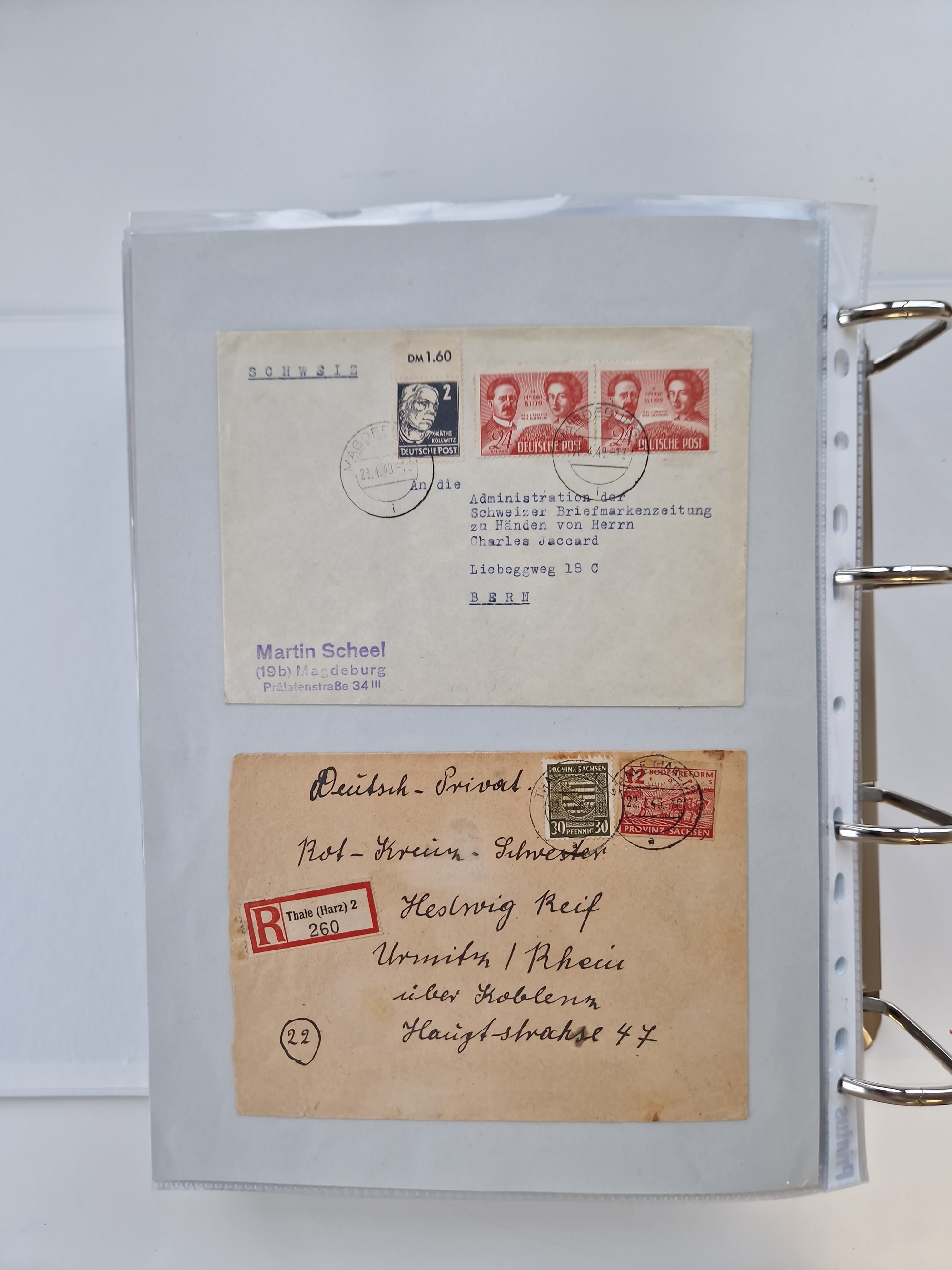 1945/48, geschätzt 200-300 Briefe mit Sammlerpost, vielen R-Briefen, mehrere Briefe mit POL-Lochungen aus Halle inkl. Briefe mit ZU, Notstempel, Gebühr bezahlt, Zensuren, Gebührenmeldung mit senkrechtem Paar Arbeiter 60 Pfg., Zehnfachfrankaturen mit Mehrfachfrankaturen bis 84 Pfg. und fünf R-Briefe mit Amts-R-Zettel von Bad Nauheim mit Buchstaben “B", “E”, “G” und “J” (einmal ohne Buchstaben), meist in guter Erhaltung