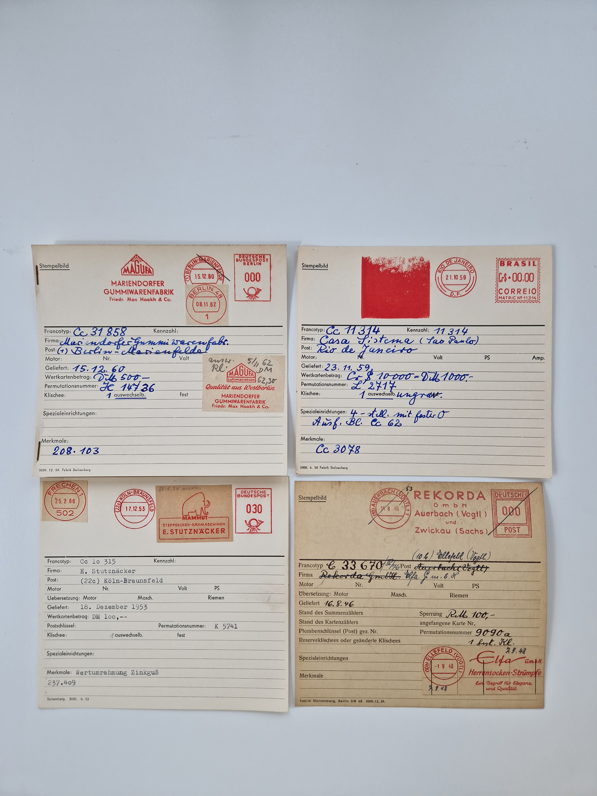 1946/69, umfangreicher Bestand “Absenderfreistempel Muster-Abschläge” auf geschätzt 5000 Stammkarten der Firma “Francotyp”, der Schwerpunkt liegt bei Bund, dazu etwas Ausland. Dabei nur verschiedene Firmen, Typen usw. mit interessanten Motiven und weiteren Besonderheiten, aus dem Firmen-Archiv stammend.