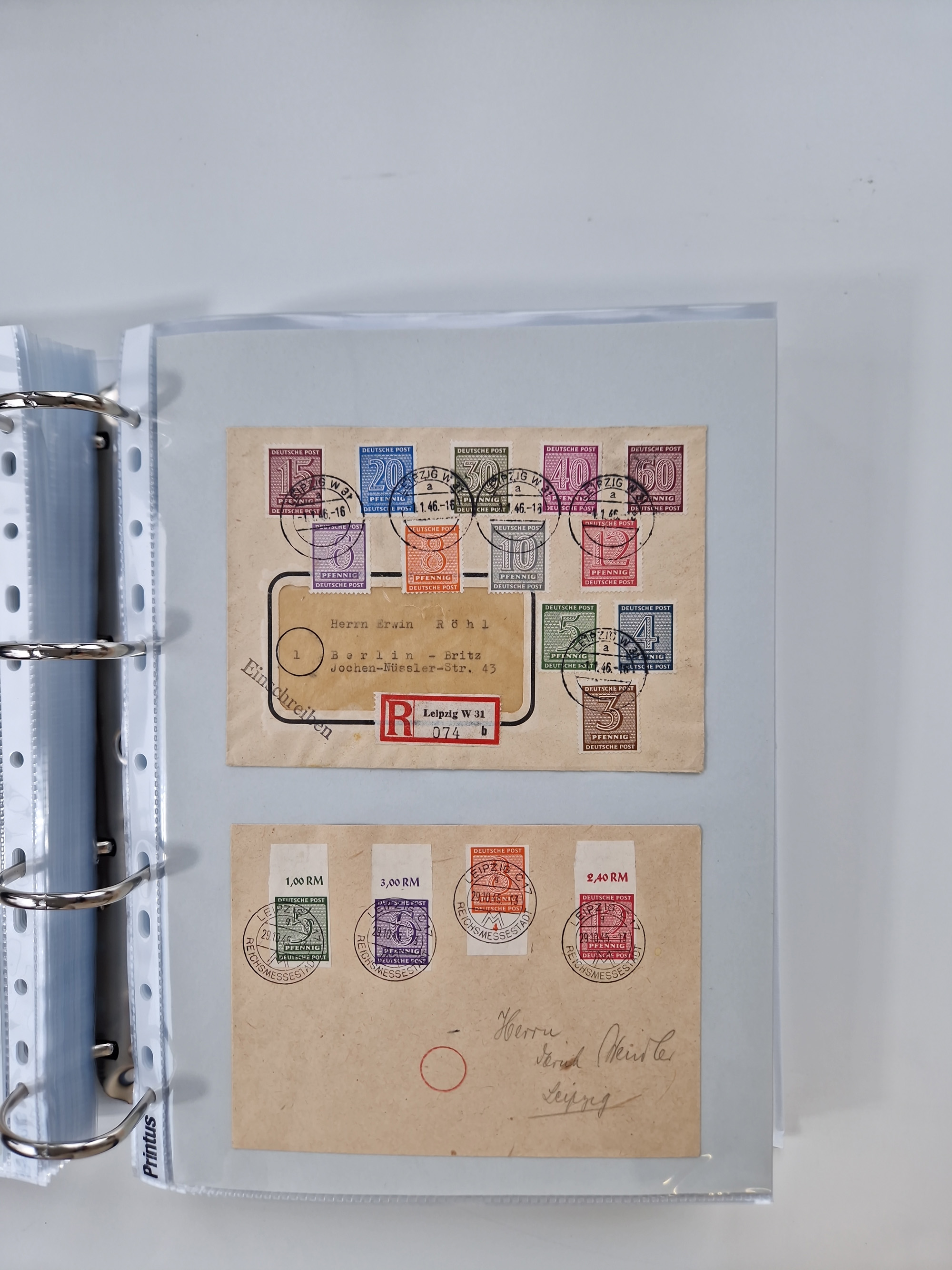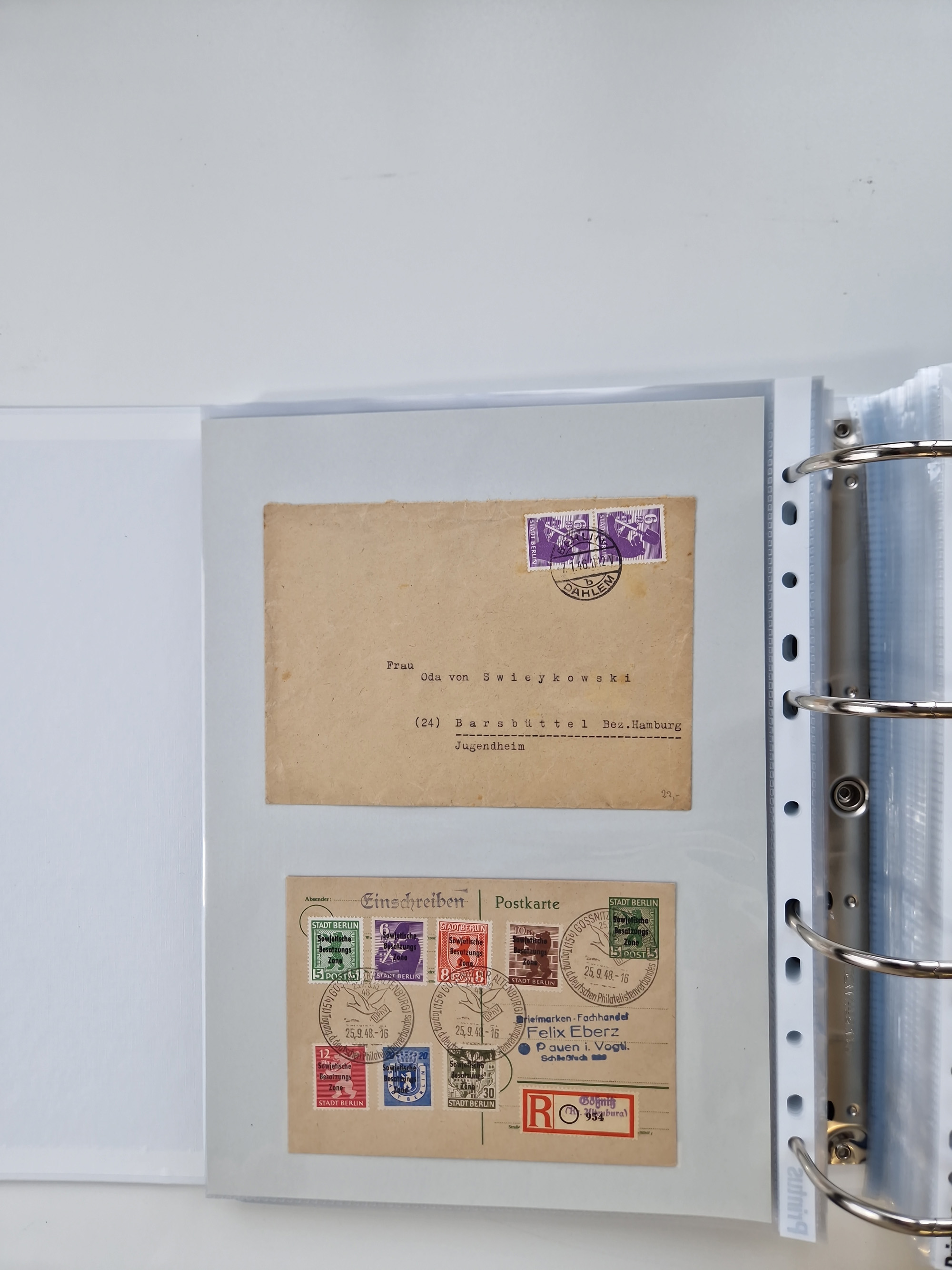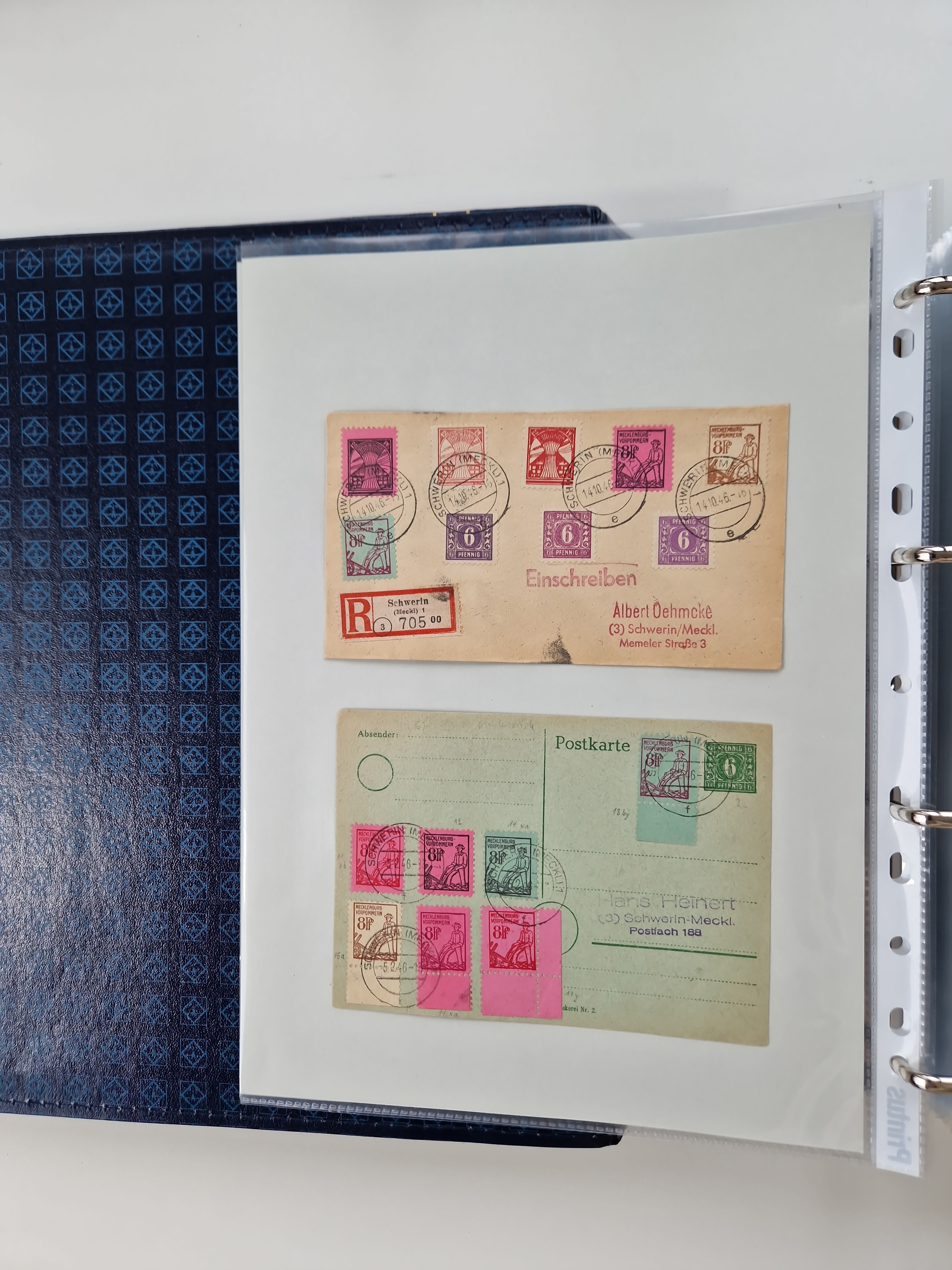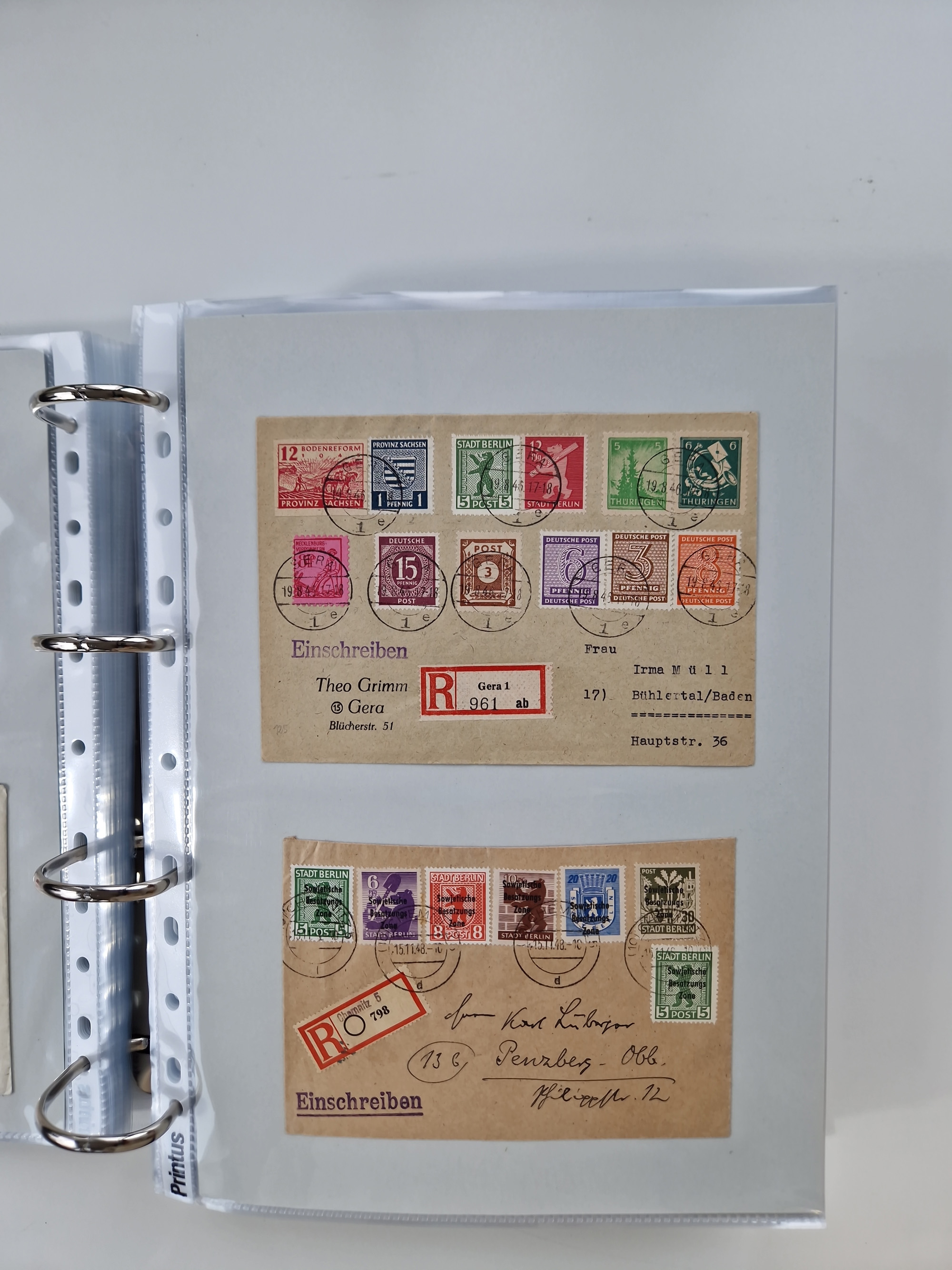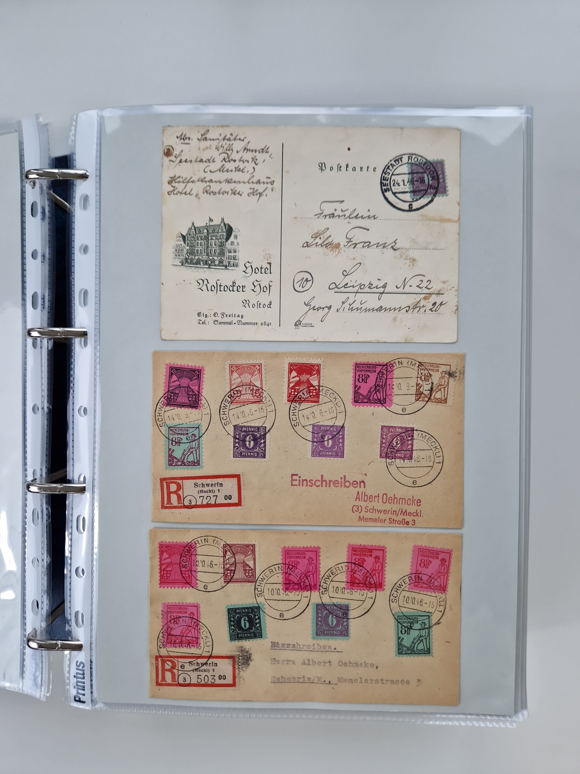 1945/49, umfangreiche Sammlung mit geschätzt 800-900 Briefen, Karten und Ganzsachen. Dabei viele R-Briefe und Satzbriefe, Bedarfspost Mecklenburg Vorpommern, Marken mit Rändern und Einheiten, Bezirkshandstempel mit Bedarfspost und weiteren Besonderheiten, sauber auf Albenblättern in drei Ordnern