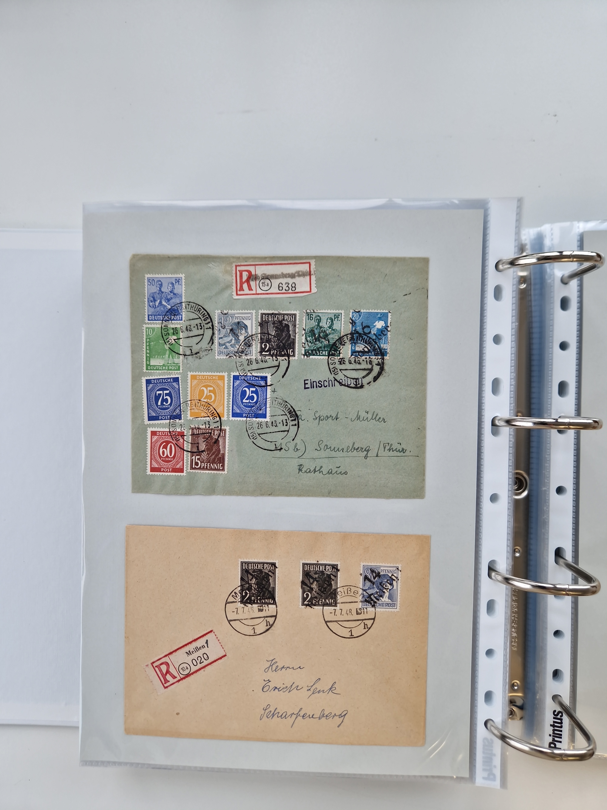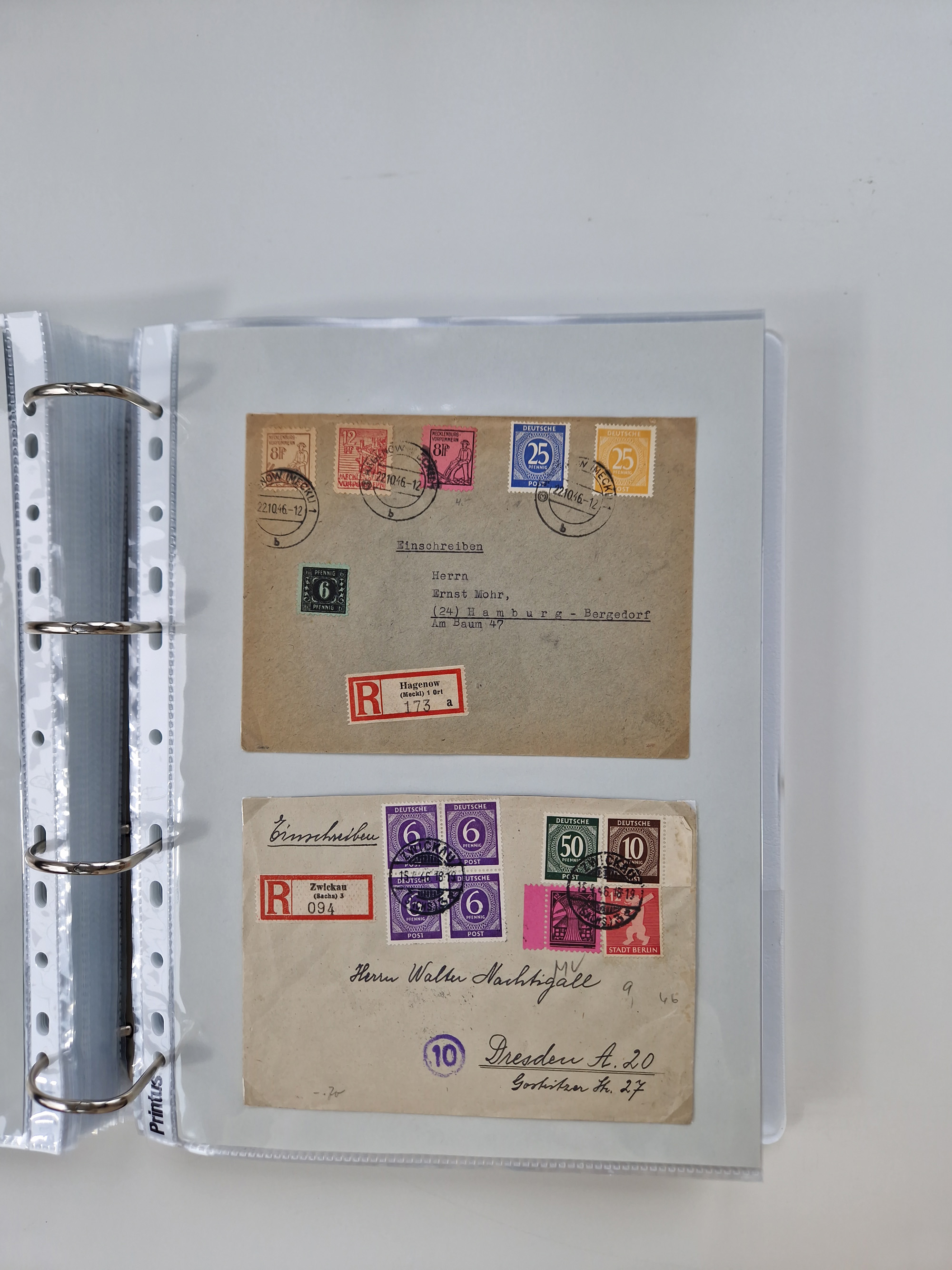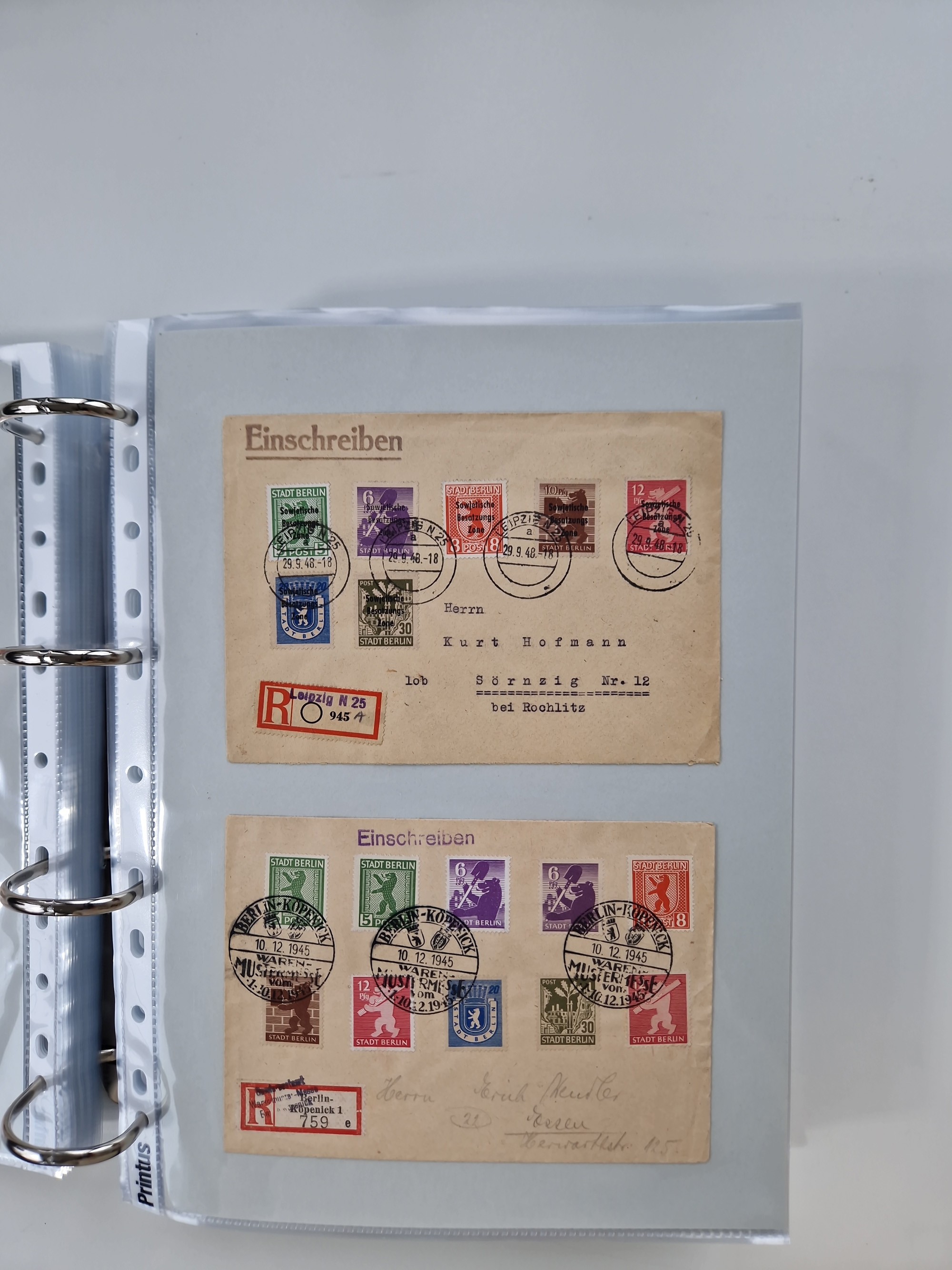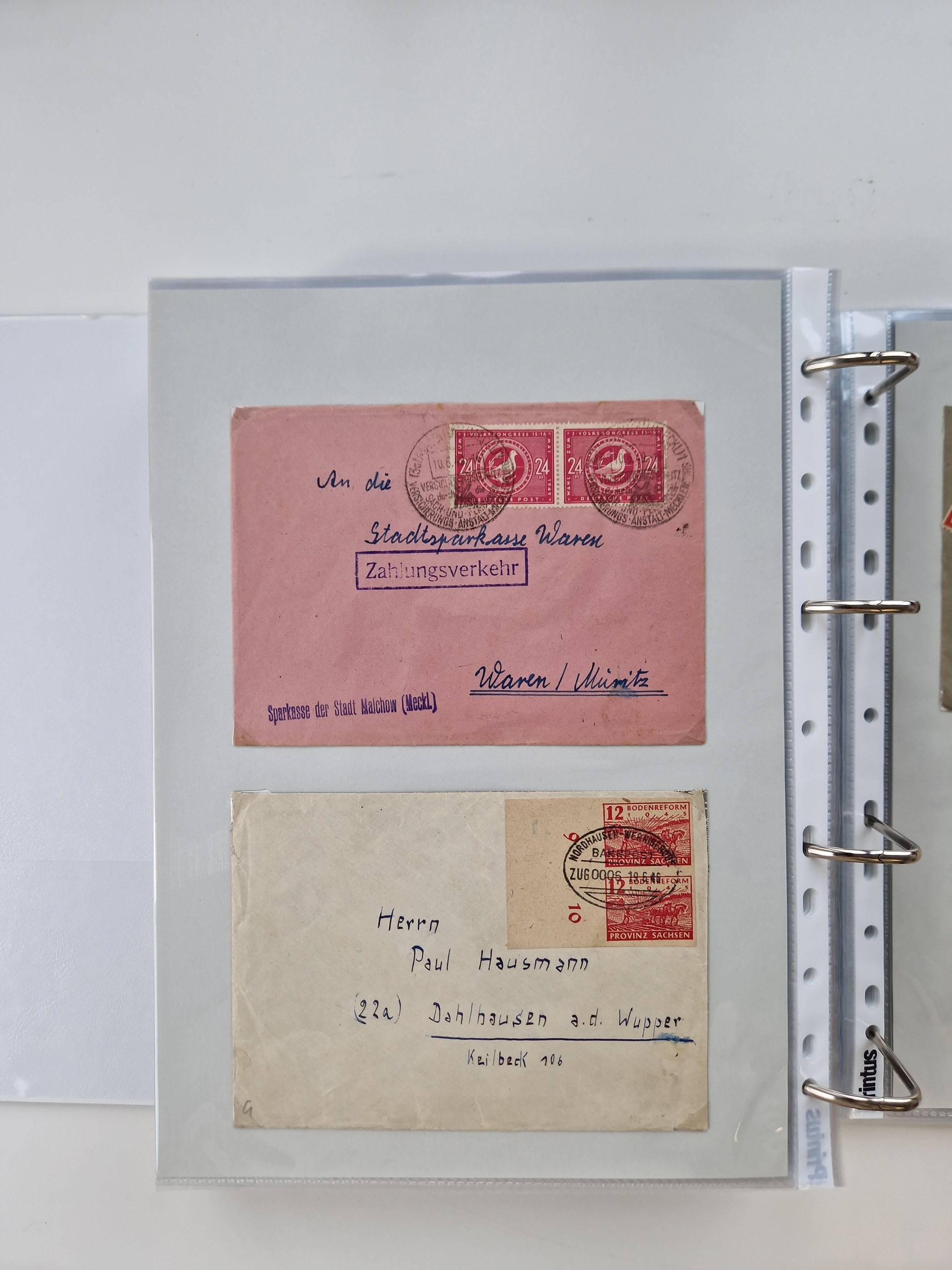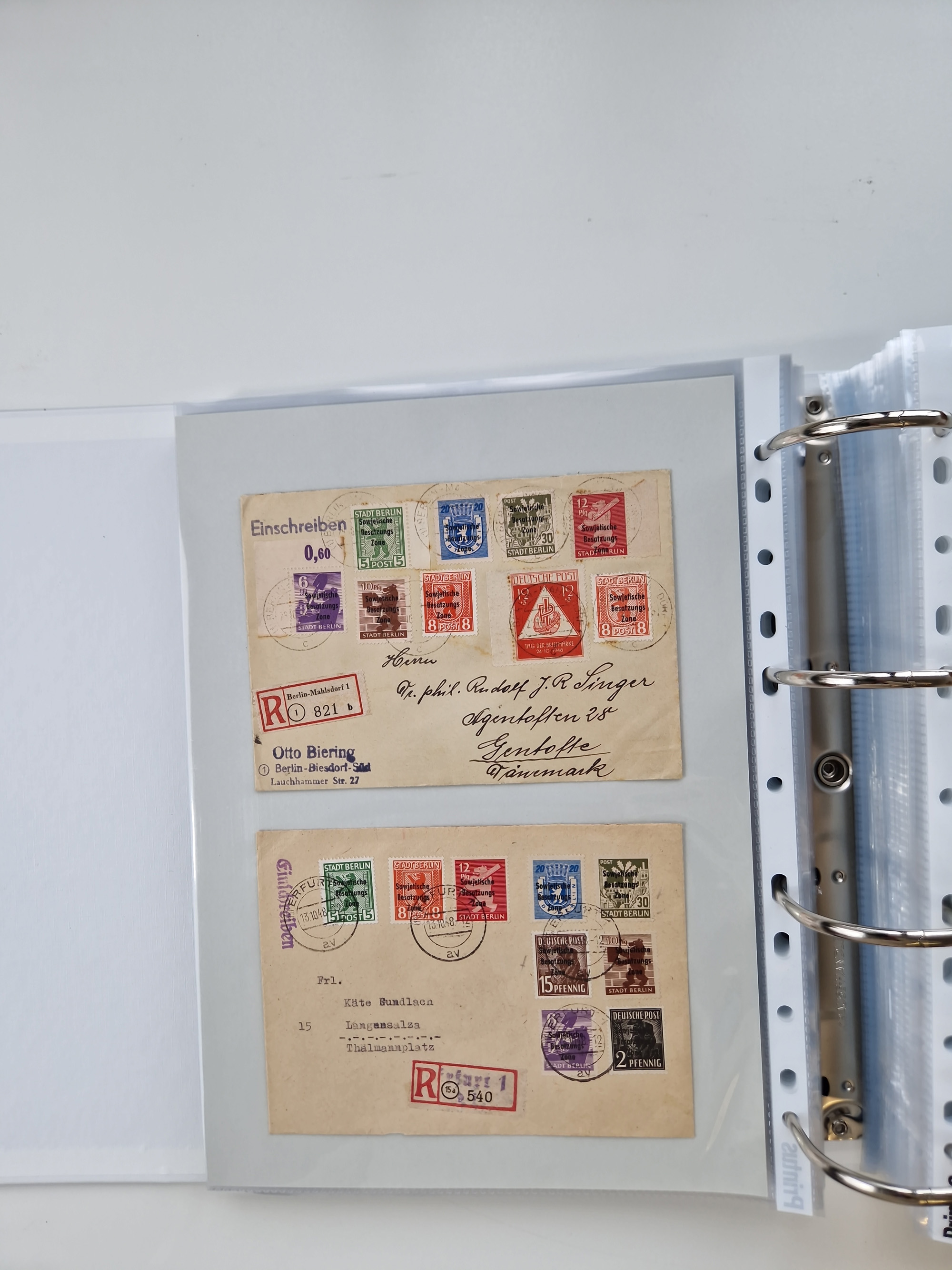1945/49, umfangreiche Sammlung mit geschätzt 800-900 Briefen, Karten und Ganzsachen. Dabei viele R-Briefe und Satzbriefe, Bedarfspost Mecklenburg Vorpommern, Marken mit Rändern und Einheiten, Bezirkshandstempel mit Bedarfspost und weiteren Besonderheiten, sauber auf Albenblättern in drei Ordnern