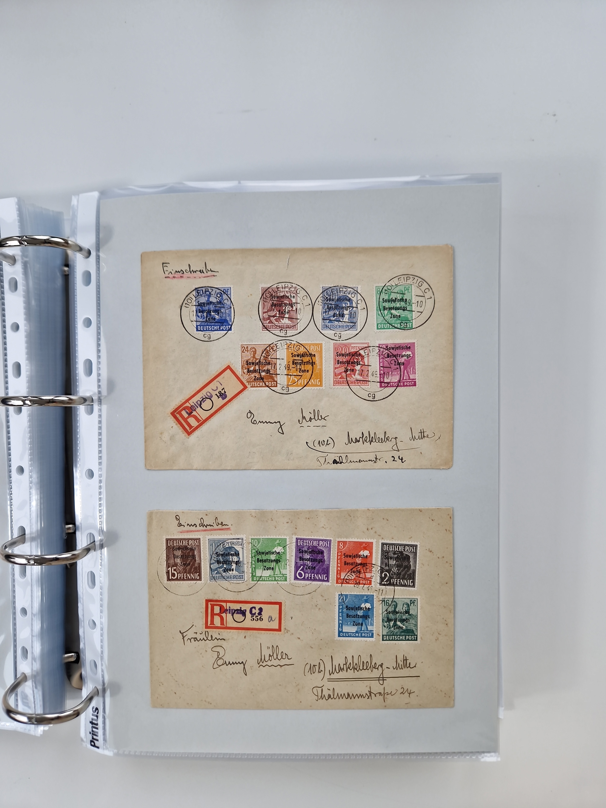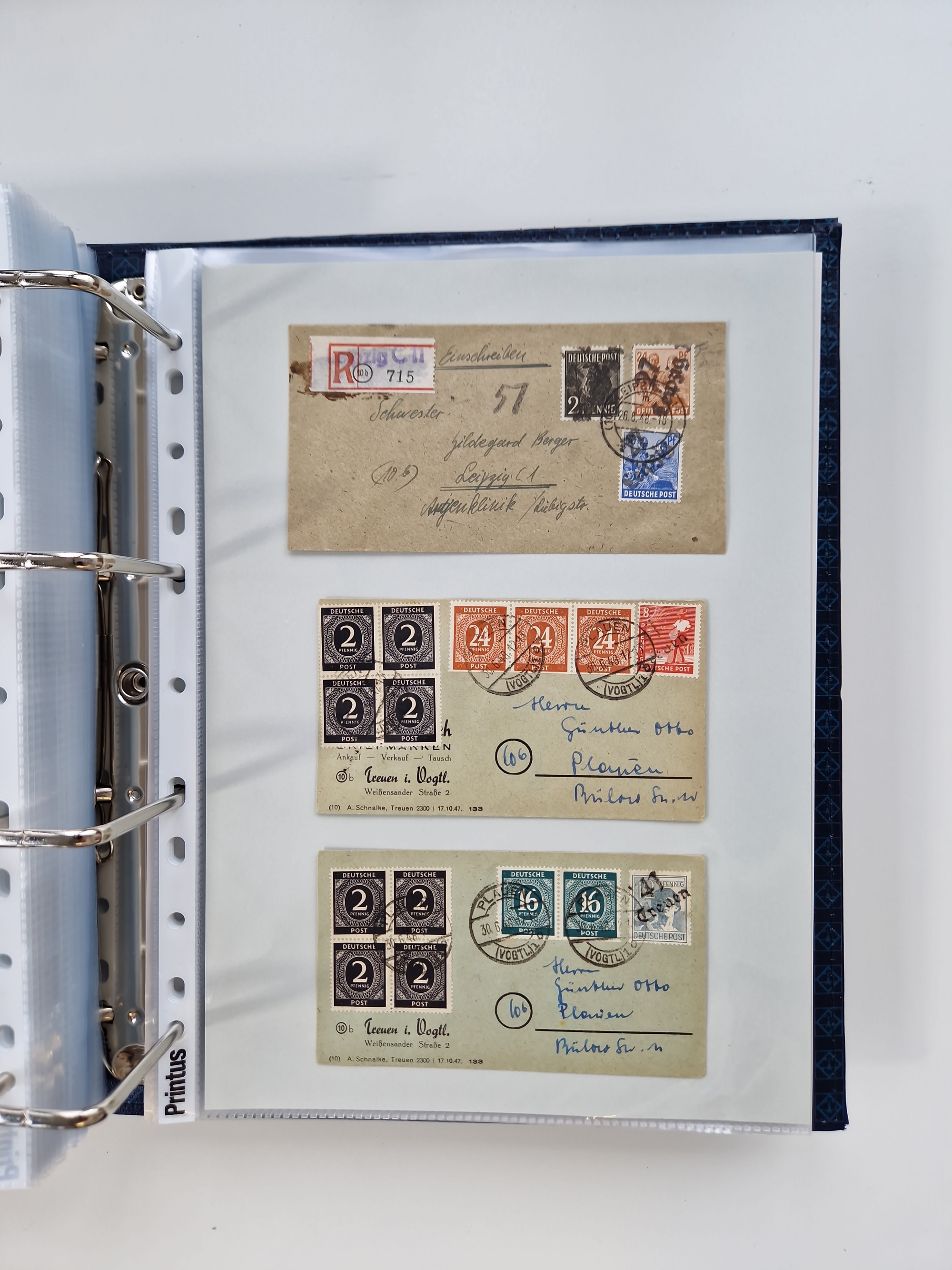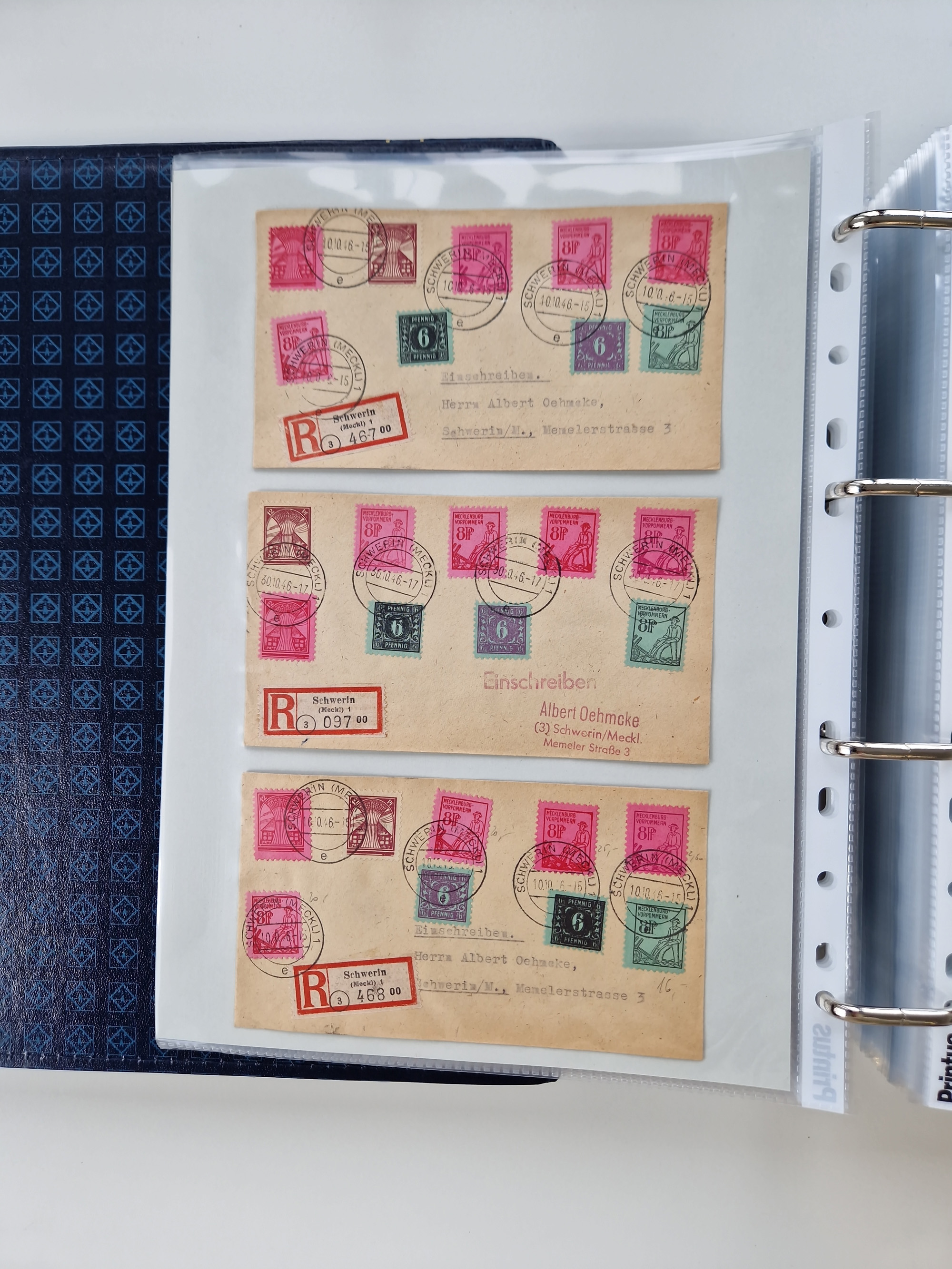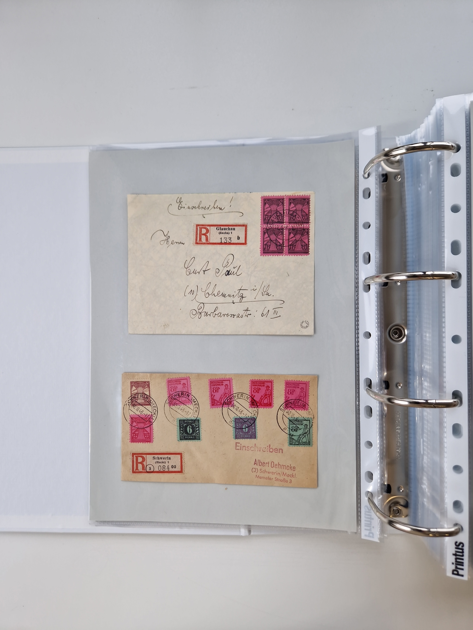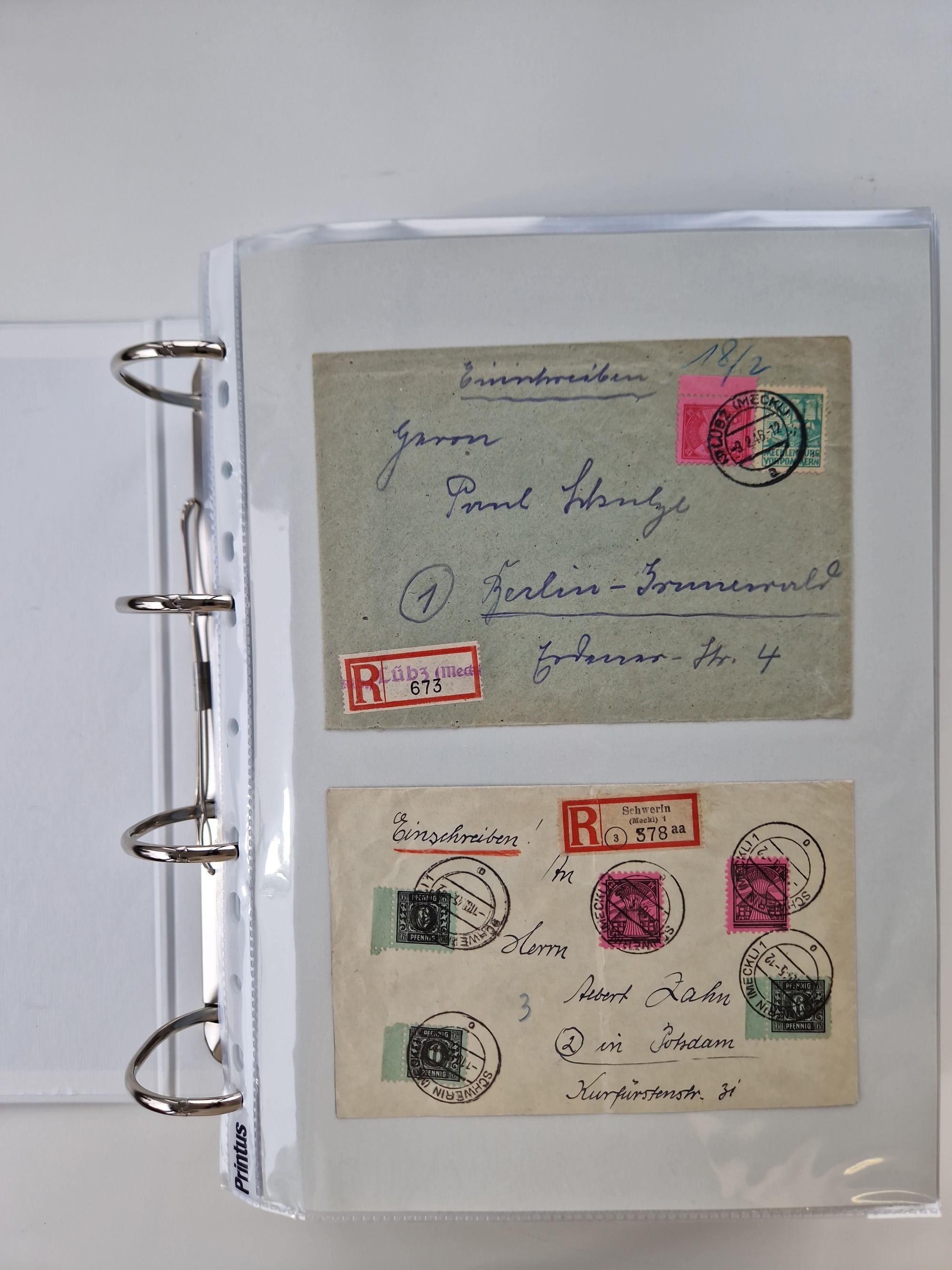 1945/49, umfangreiche Sammlung mit geschätzt 800-900 Briefen, Karten und Ganzsachen. Dabei viele R-Briefe und Satzbriefe, Bedarfspost Mecklenburg Vorpommern, Marken mit Rändern und Einheiten, Bezirkshandstempel mit Bedarfspost und weiteren Besonderheiten, sauber auf Albenblättern in drei Ordnern