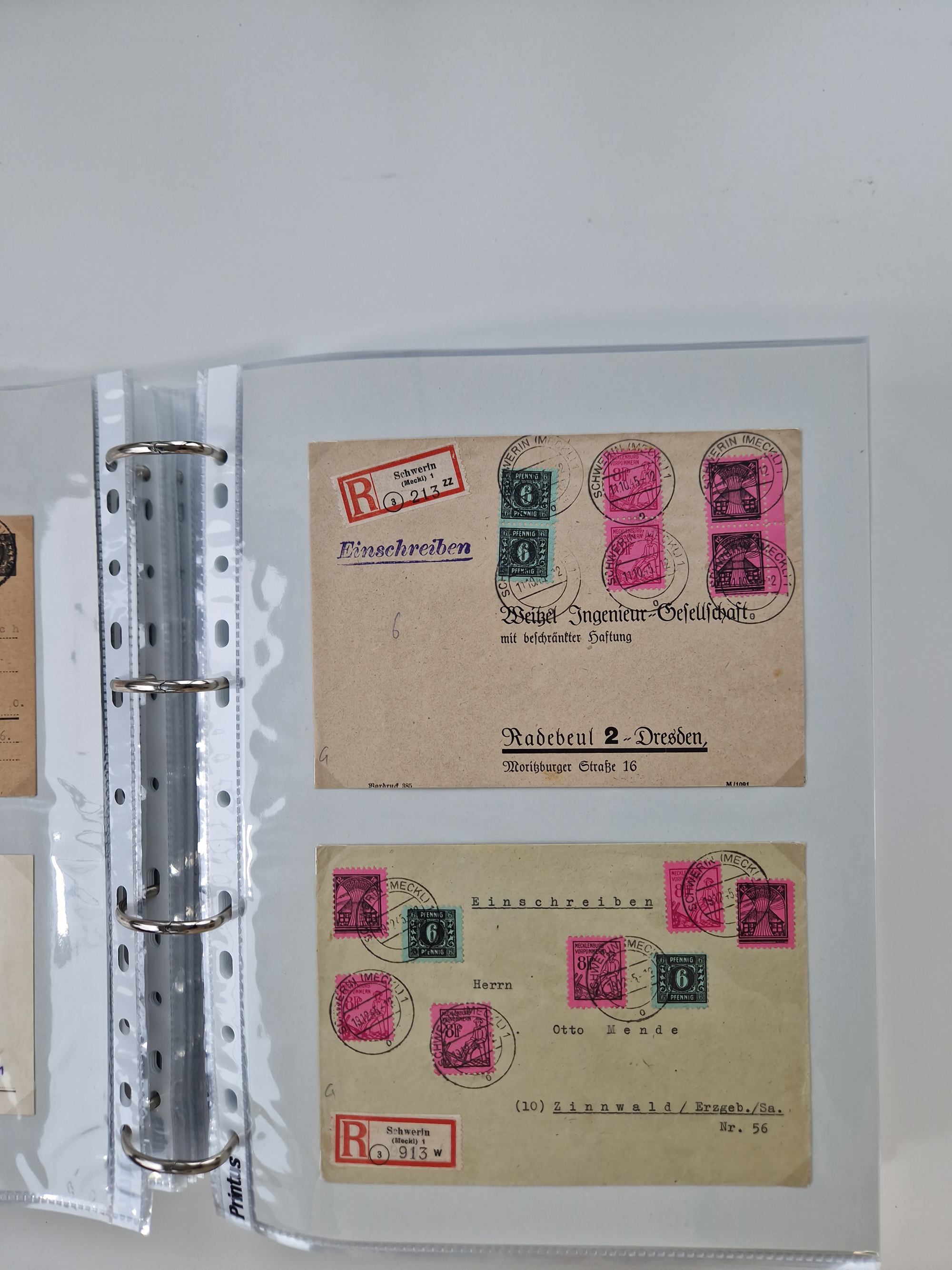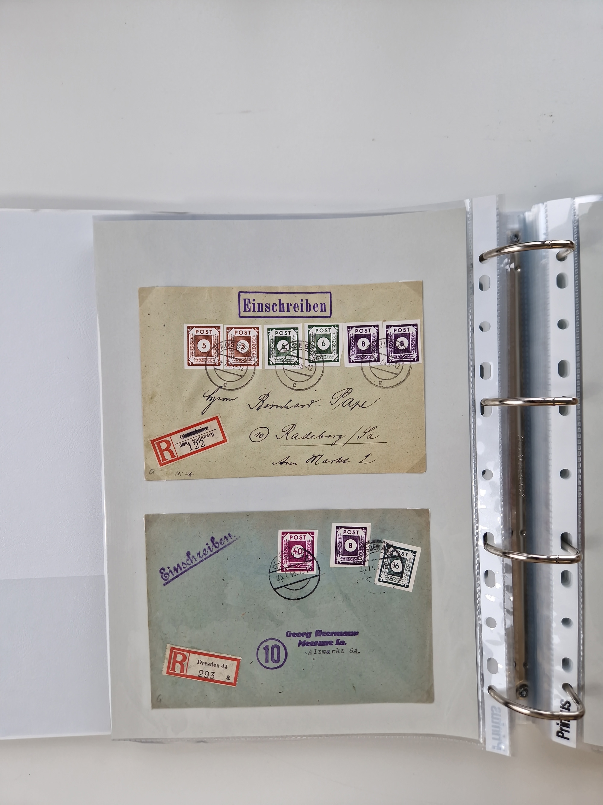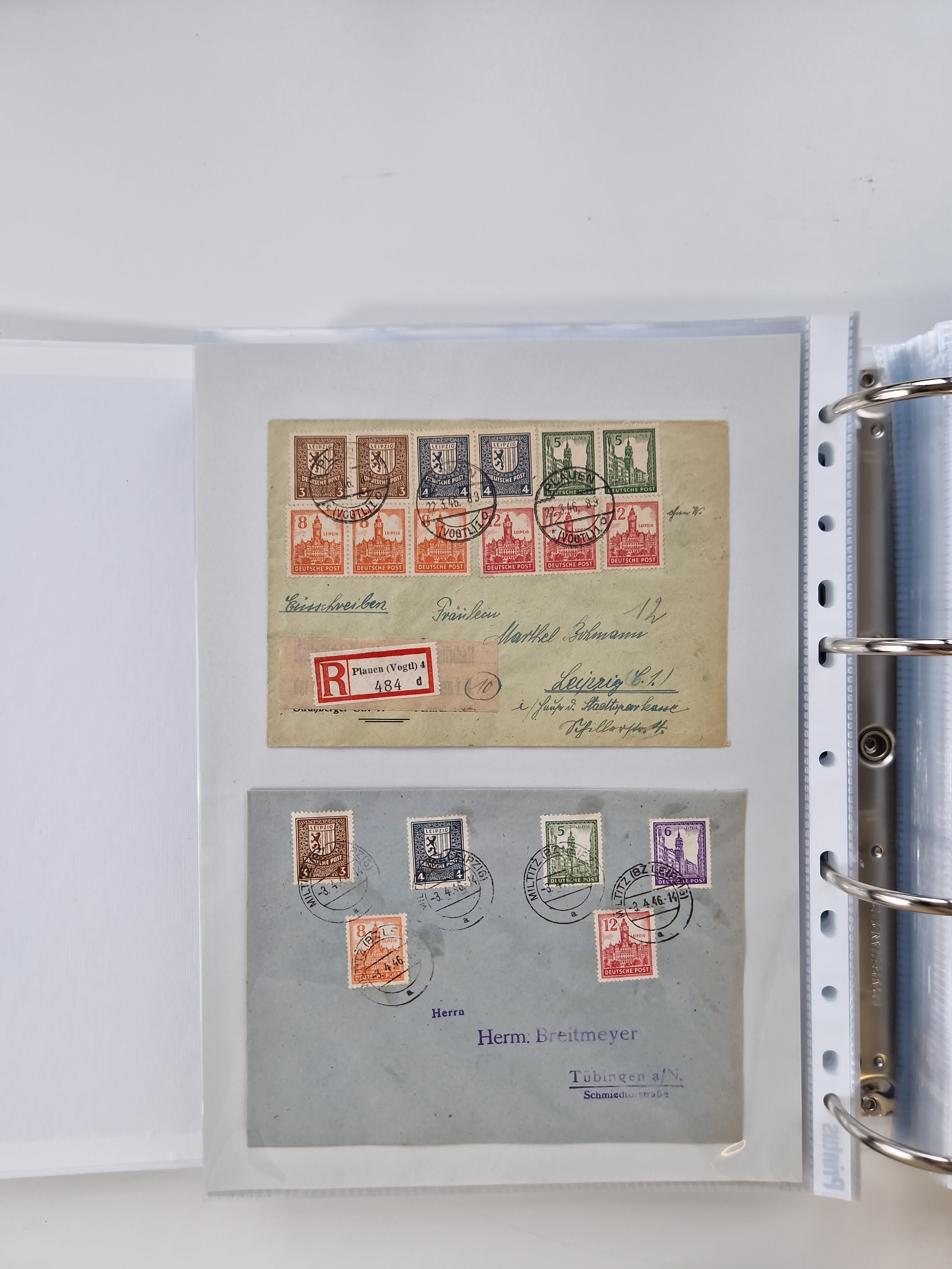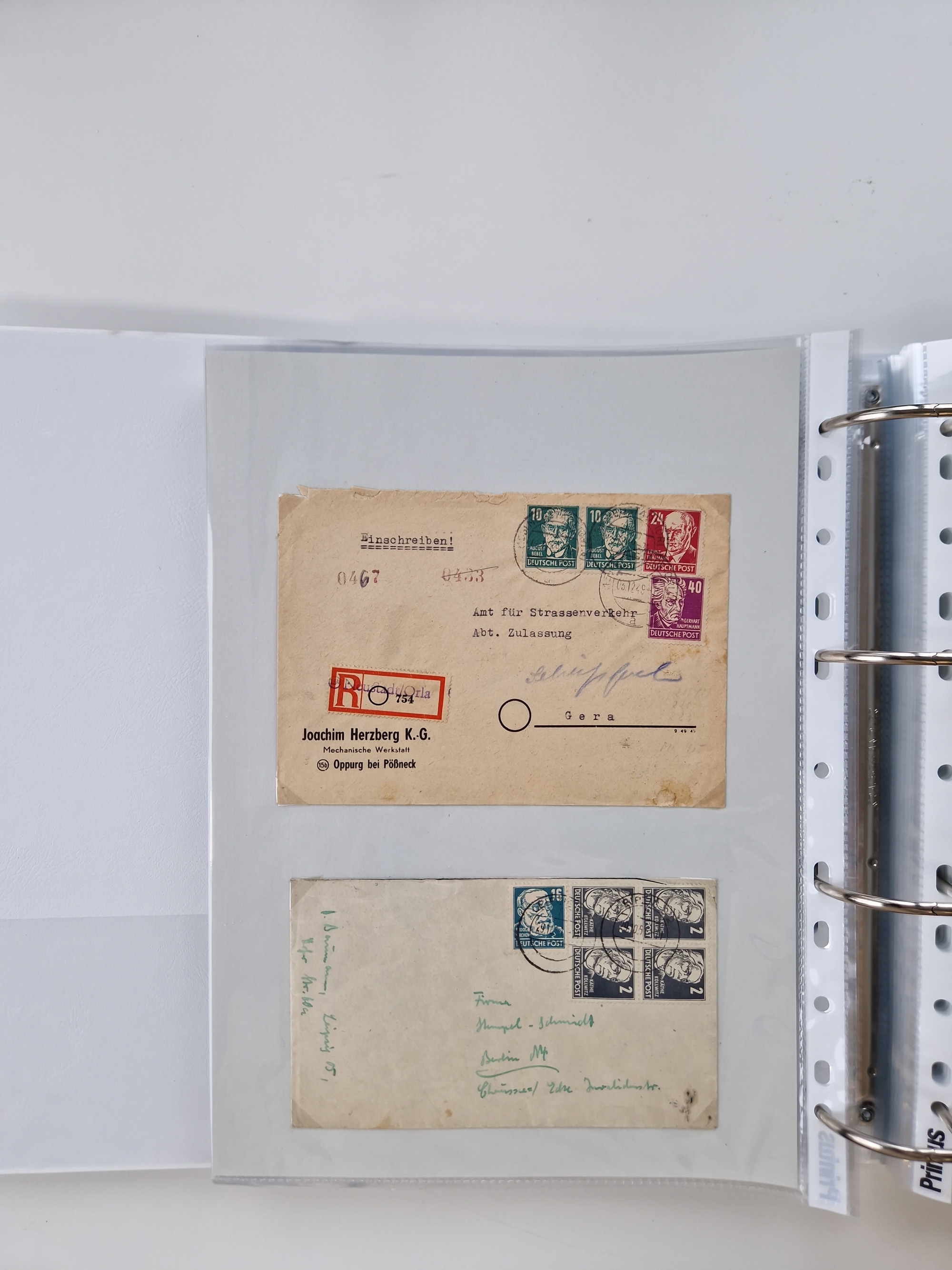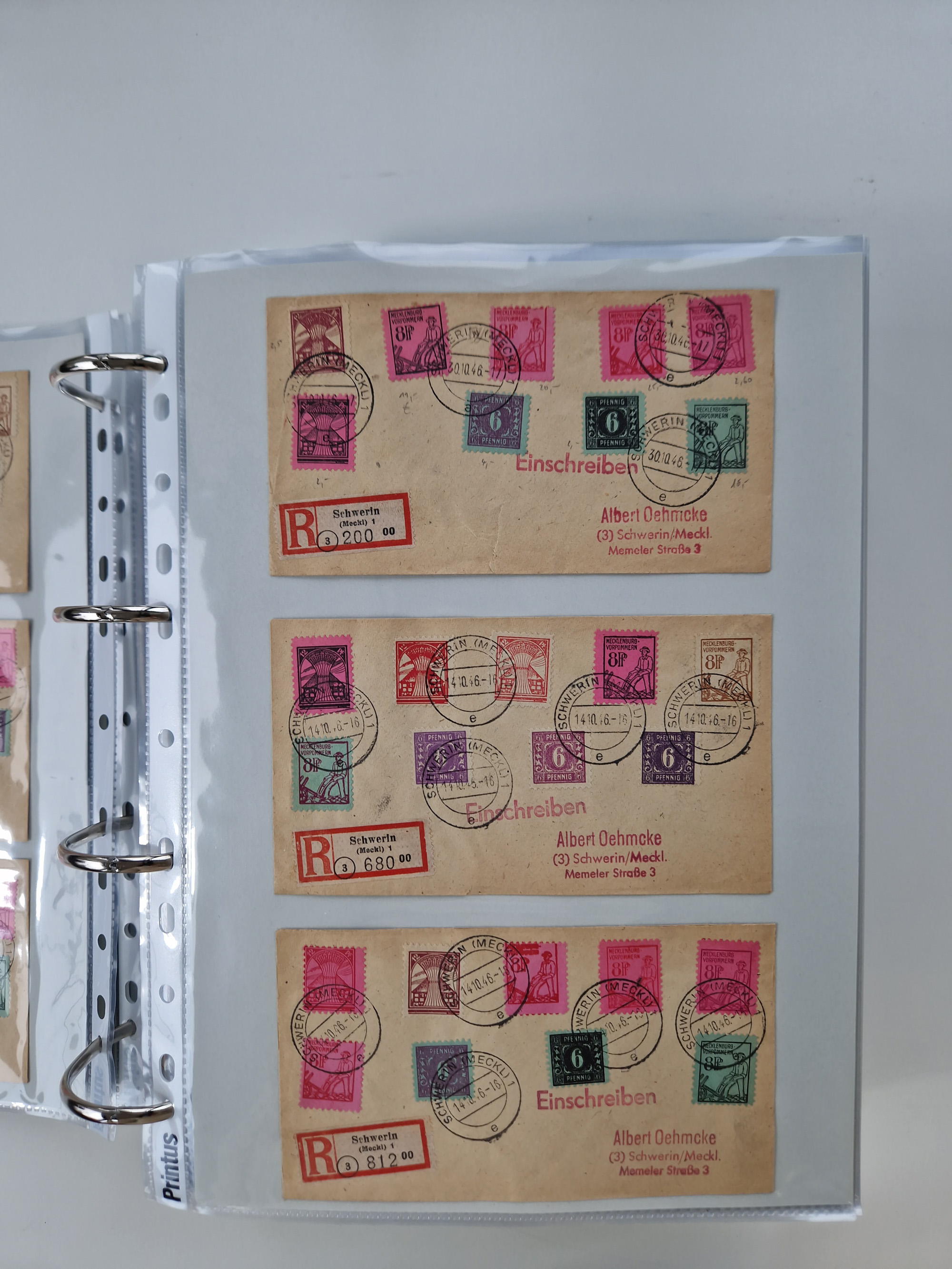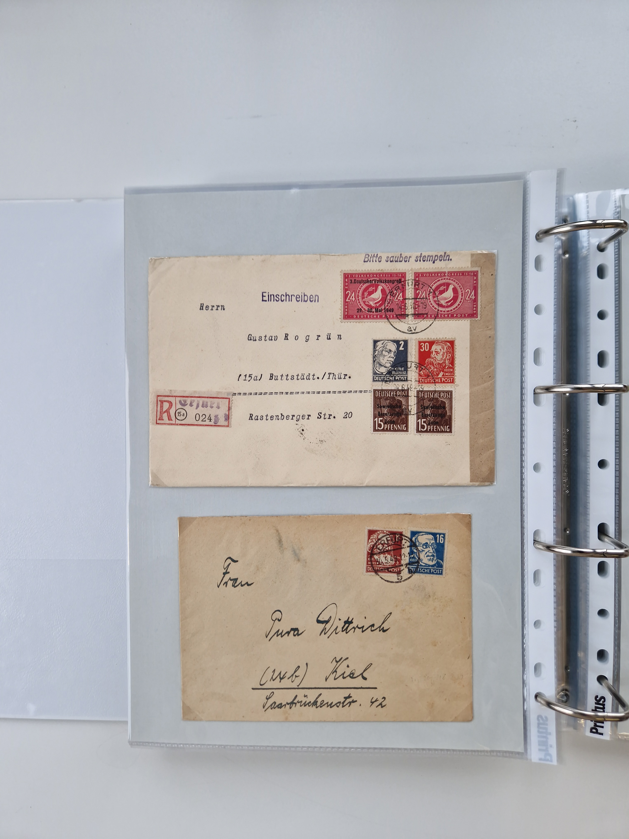 1945/49, umfangreiche Sammlung mit geschätzt 800-900 Briefen, Karten und Ganzsachen. Dabei viele R-Briefe und Satzbriefe, Bedarfspost Mecklenburg Vorpommern, Marken mit Rändern und Einheiten, Bezirkshandstempel mit Bedarfspost und weiteren Besonderheiten, sauber auf Albenblättern in drei Ordnern