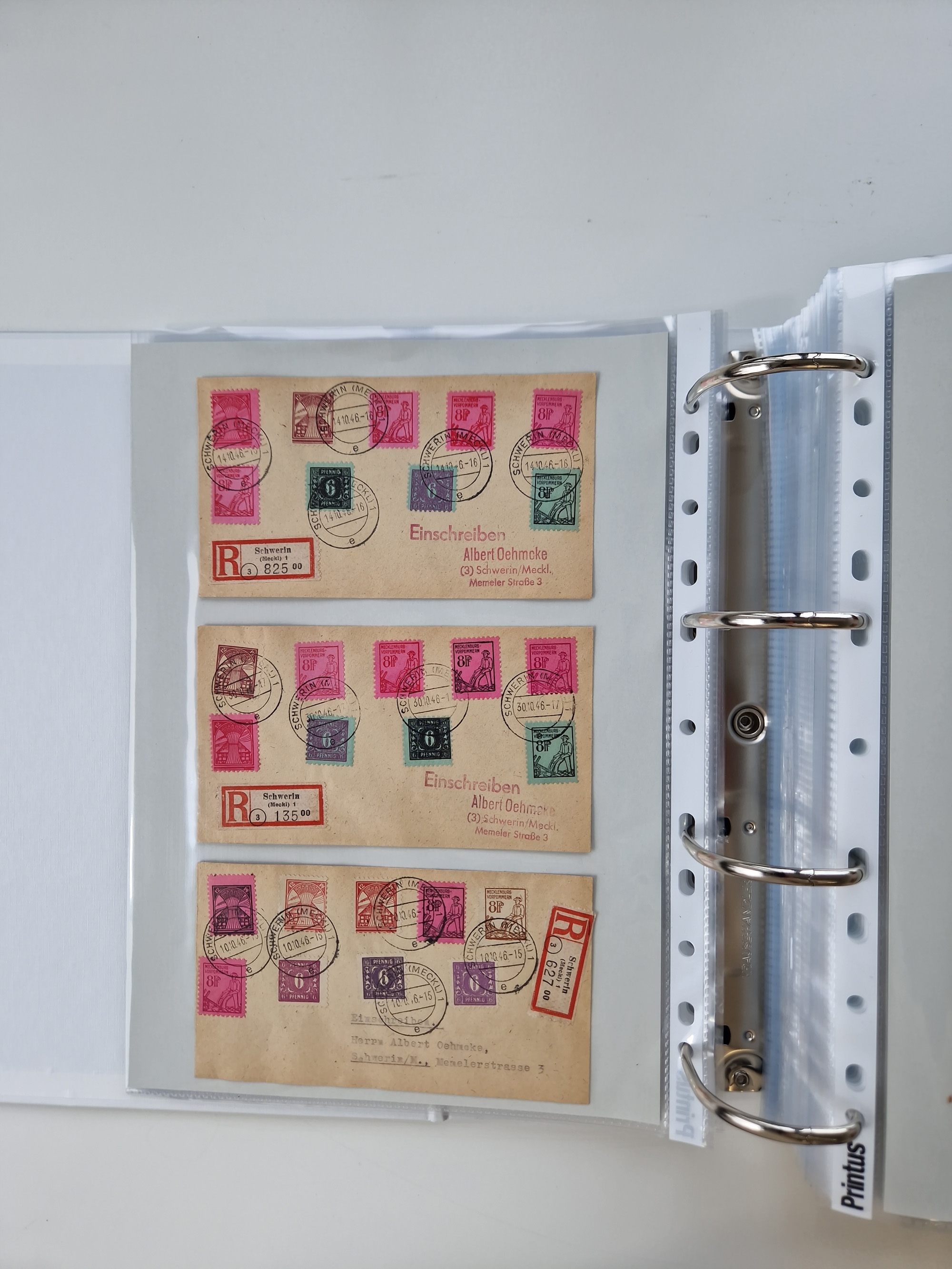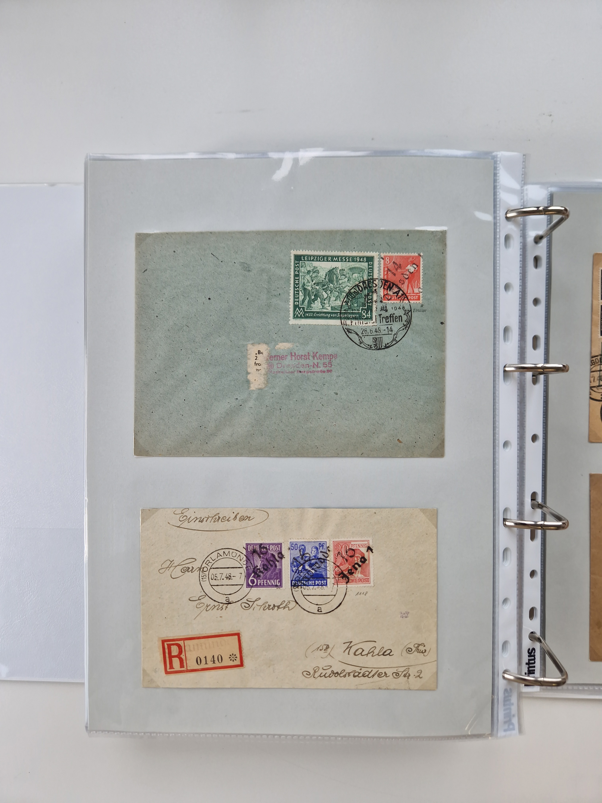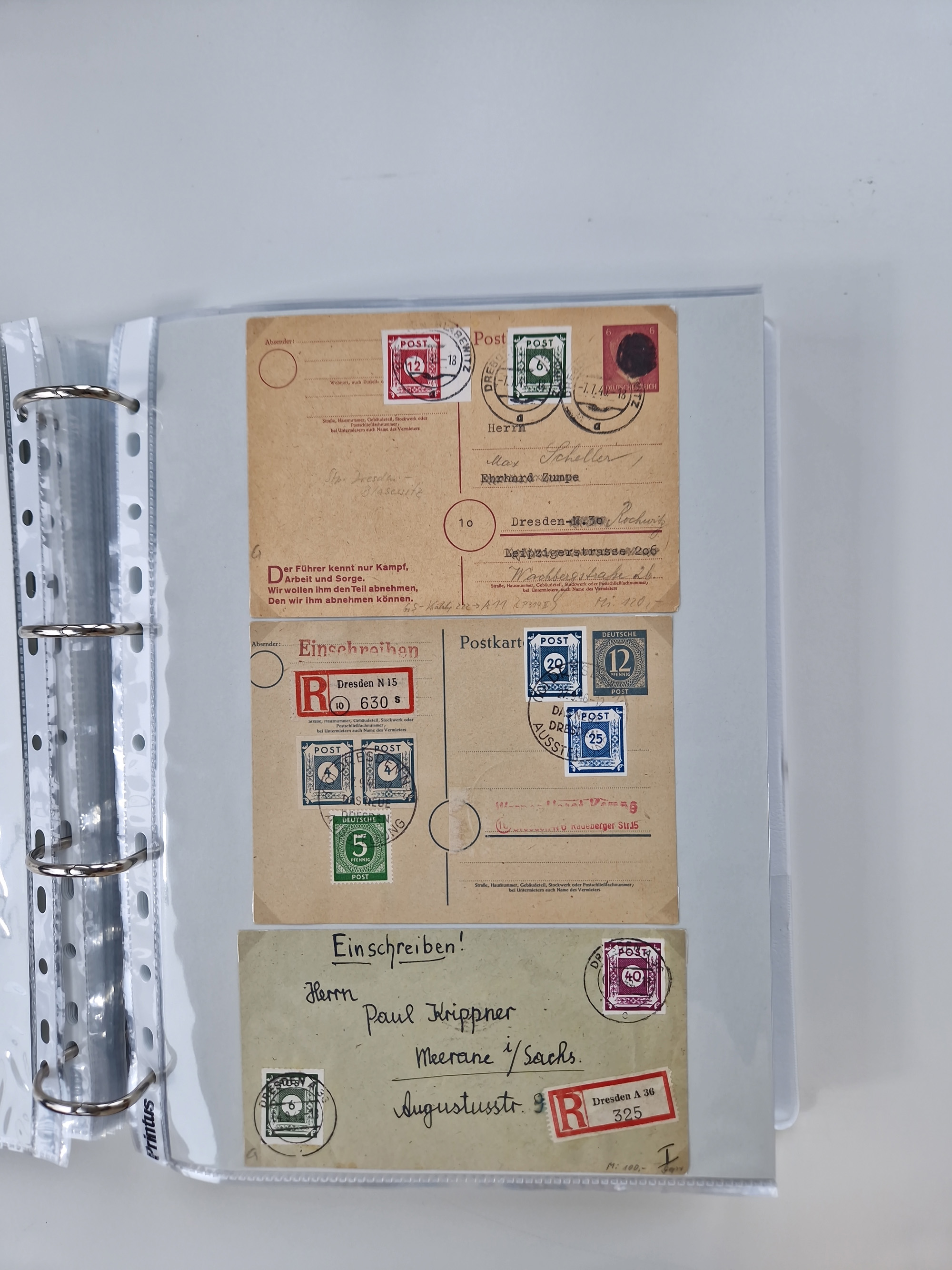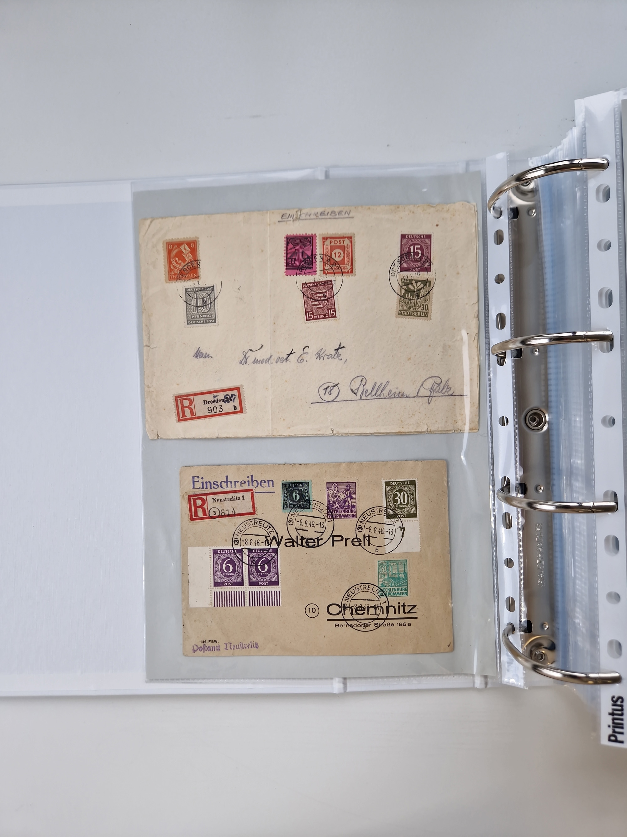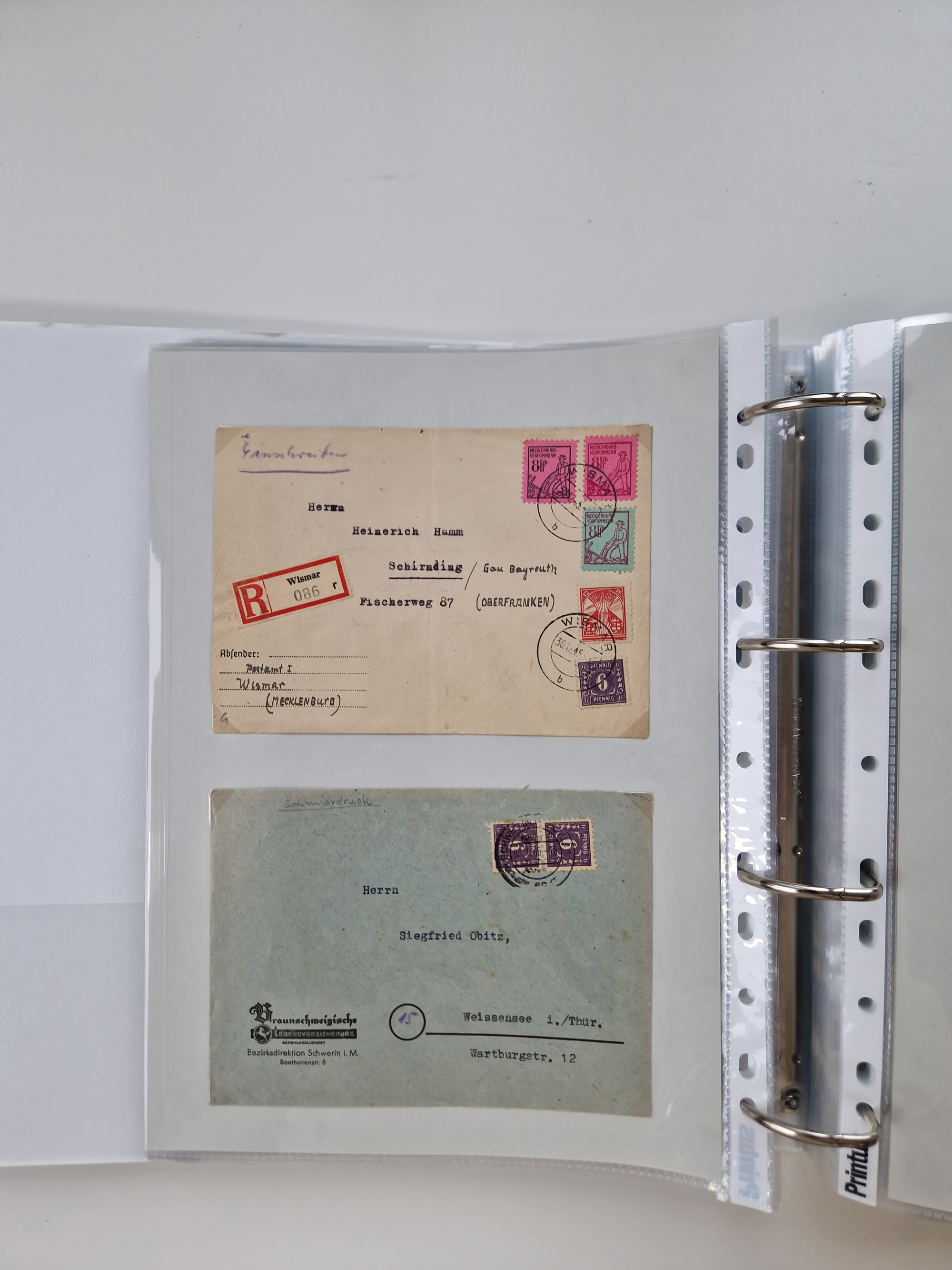 1945/49, umfangreiche Sammlung mit geschätzt 800-900 Briefen, Karten und Ganzsachen. Dabei viele R-Briefe und Satzbriefe, Bedarfspost Mecklenburg Vorpommern, Marken mit Rändern und Einheiten, Bezirkshandstempel mit Bedarfspost und weiteren Besonderheiten, sauber auf Albenblättern in drei Ordnern