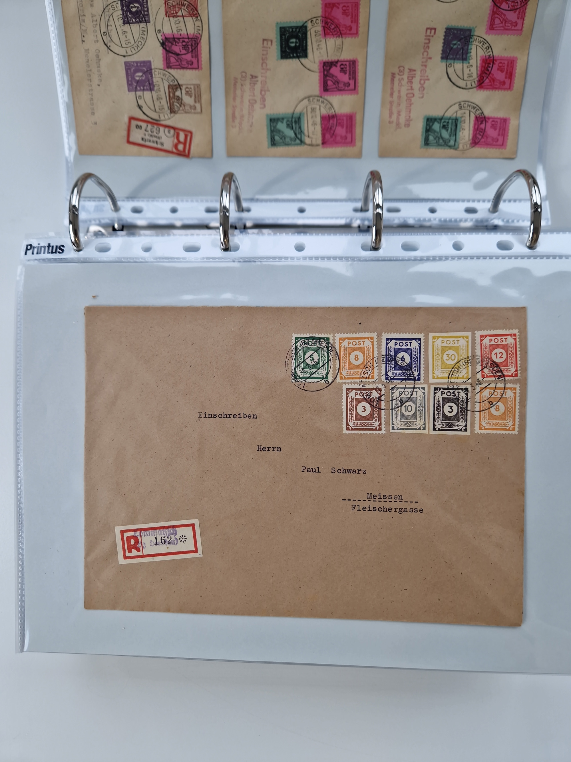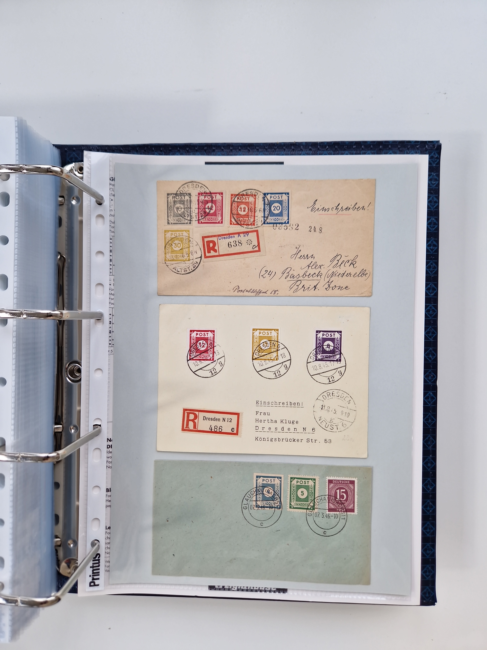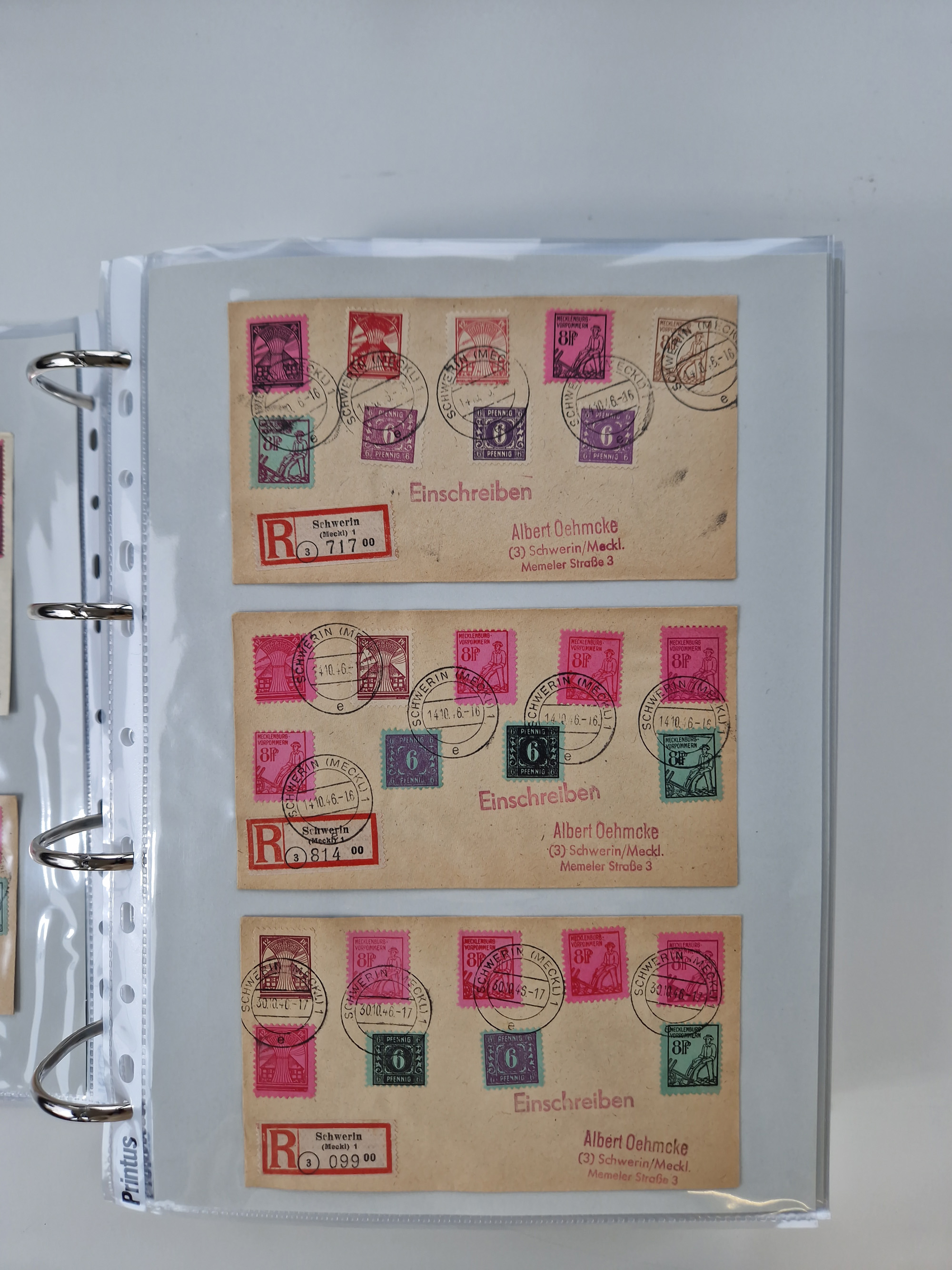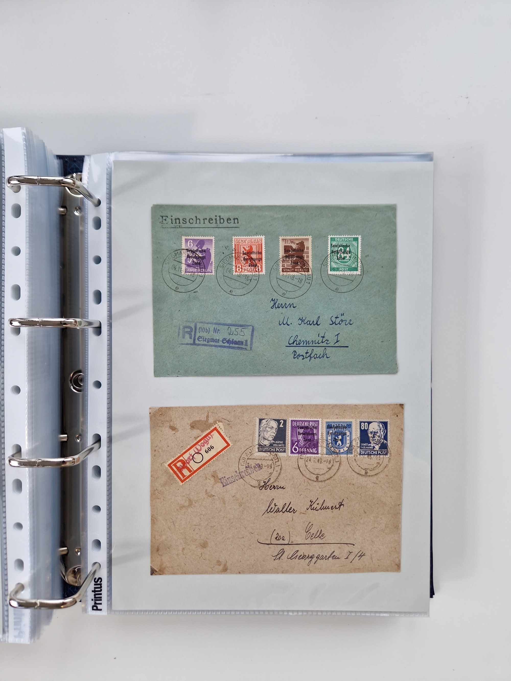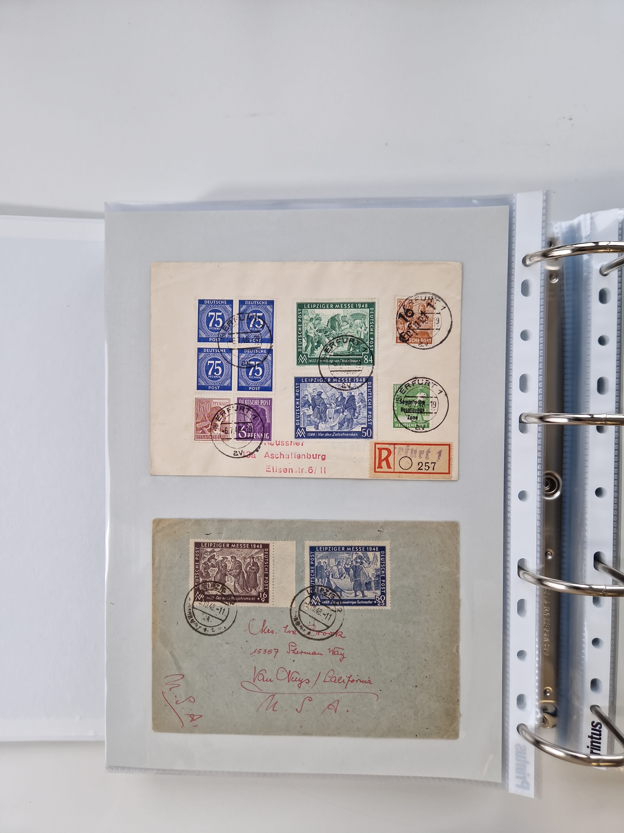 1945/49, umfangreiche Sammlung mit geschätzt 800-900 Briefen, Karten und Ganzsachen. Dabei viele R-Briefe und Satzbriefe, Bedarfspost Mecklenburg Vorpommern, Marken mit Rändern und Einheiten, Bezirkshandstempel mit Bedarfspost und weiteren Besonderheiten, sauber auf Albenblättern in drei Ordnern