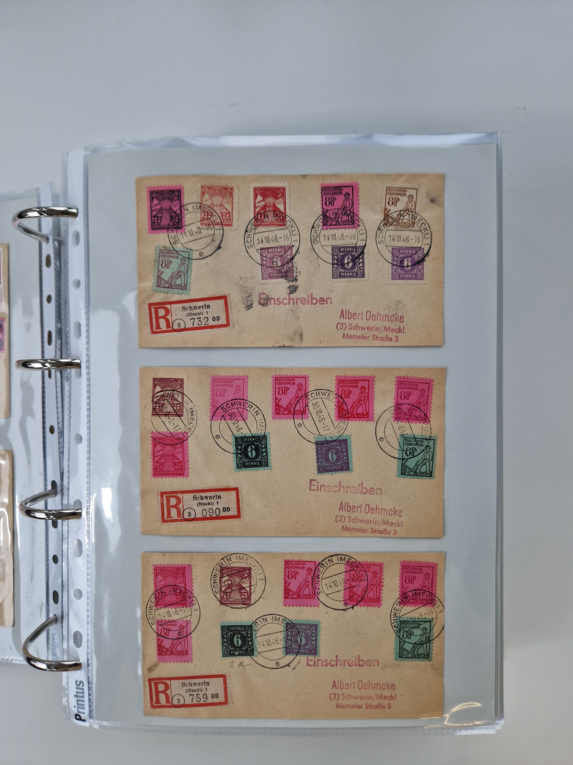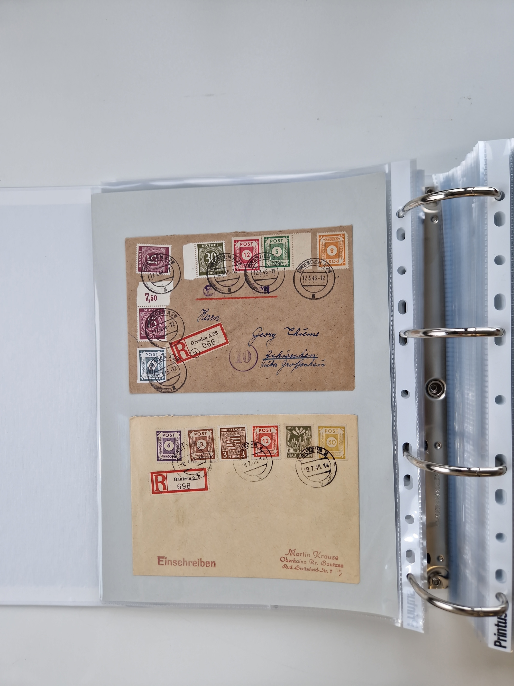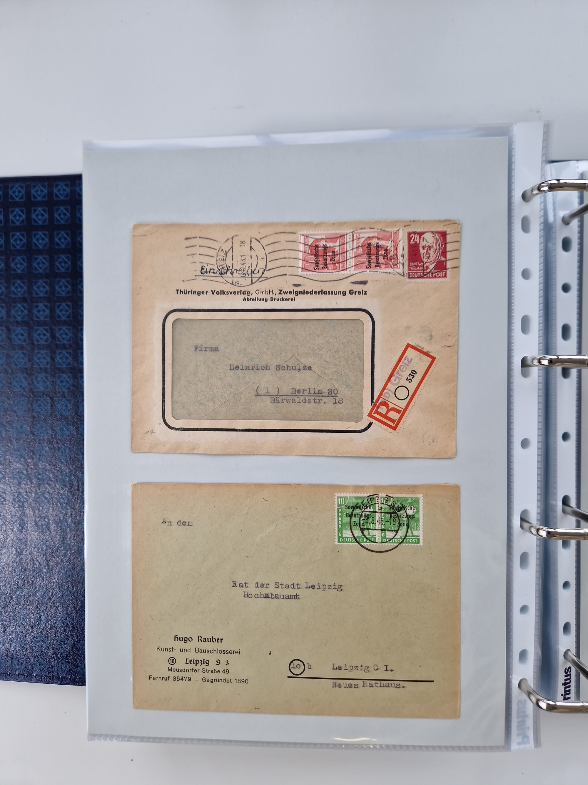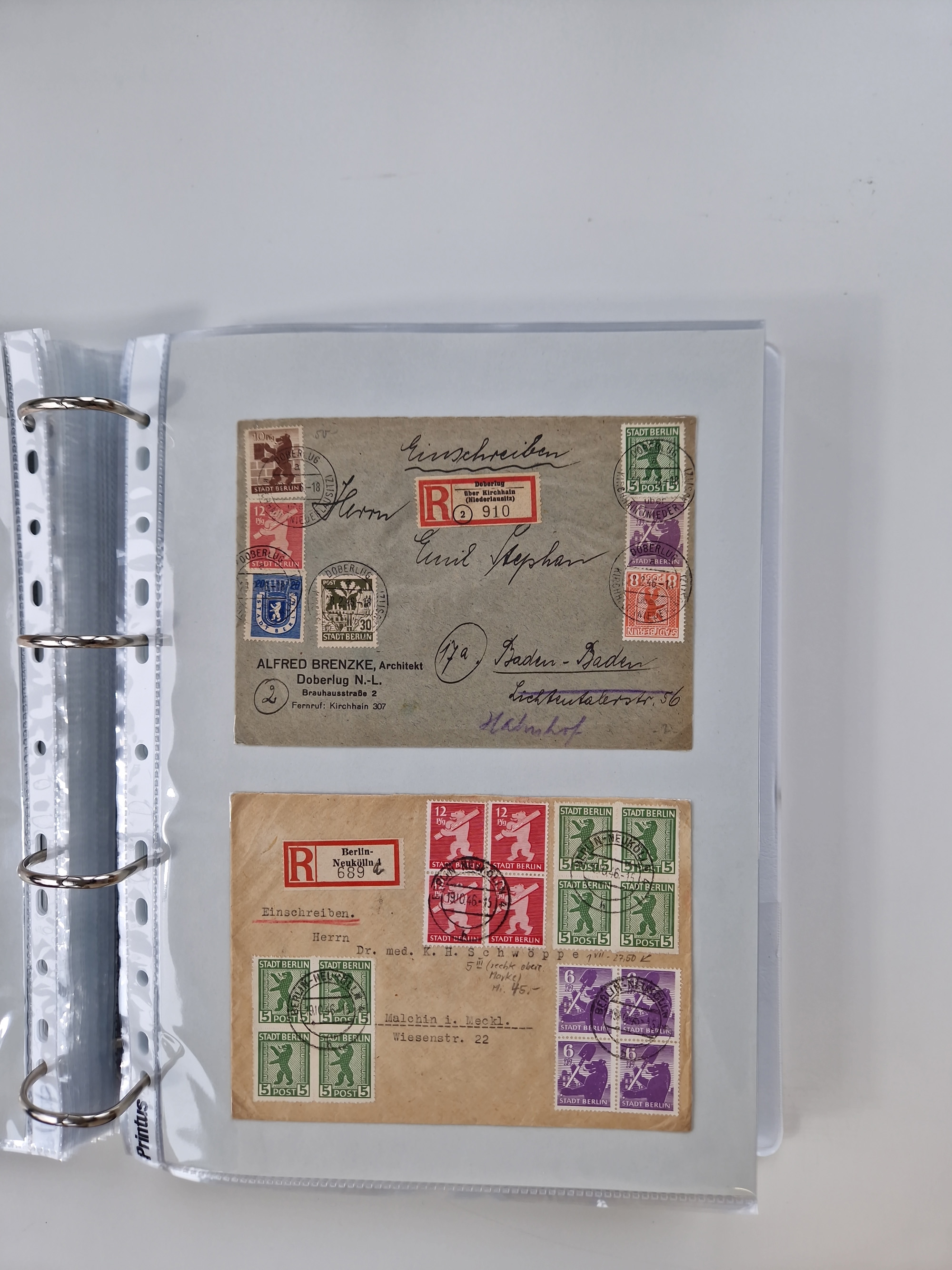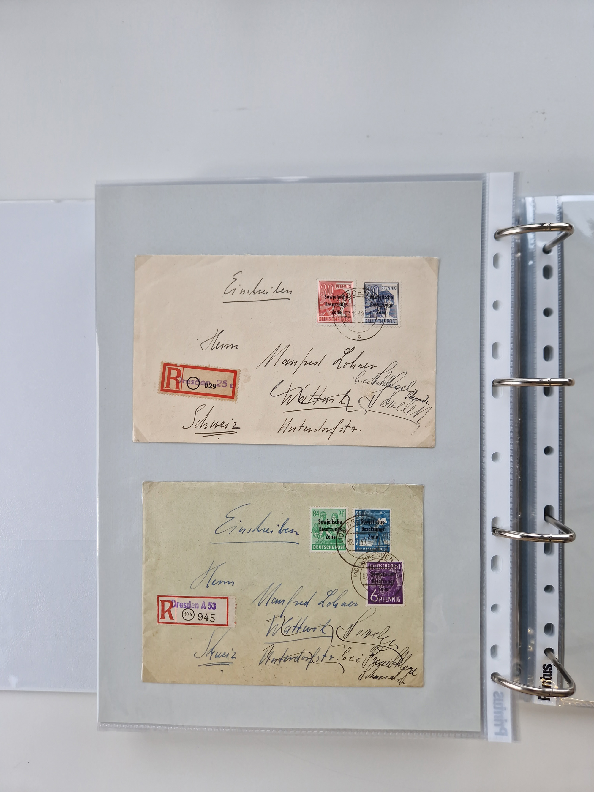 1945/49, umfangreiche Sammlung mit geschätzt 800-900 Briefen, Karten und Ganzsachen. Dabei viele R-Briefe und Satzbriefe, Bedarfspost Mecklenburg Vorpommern, Marken mit Rändern und Einheiten, Bezirkshandstempel mit Bedarfspost und weiteren Besonderheiten, sauber auf Albenblättern in drei Ordnern