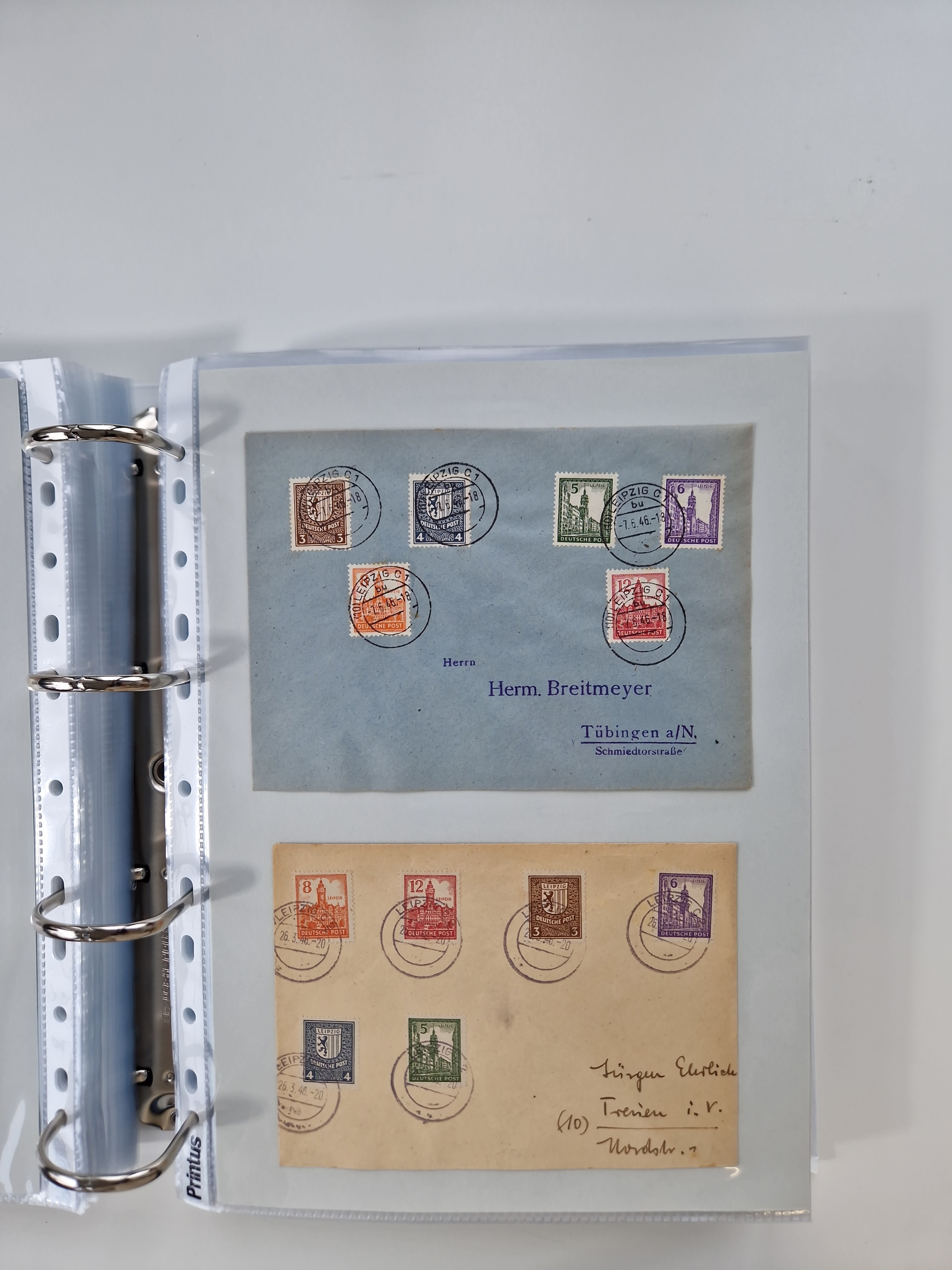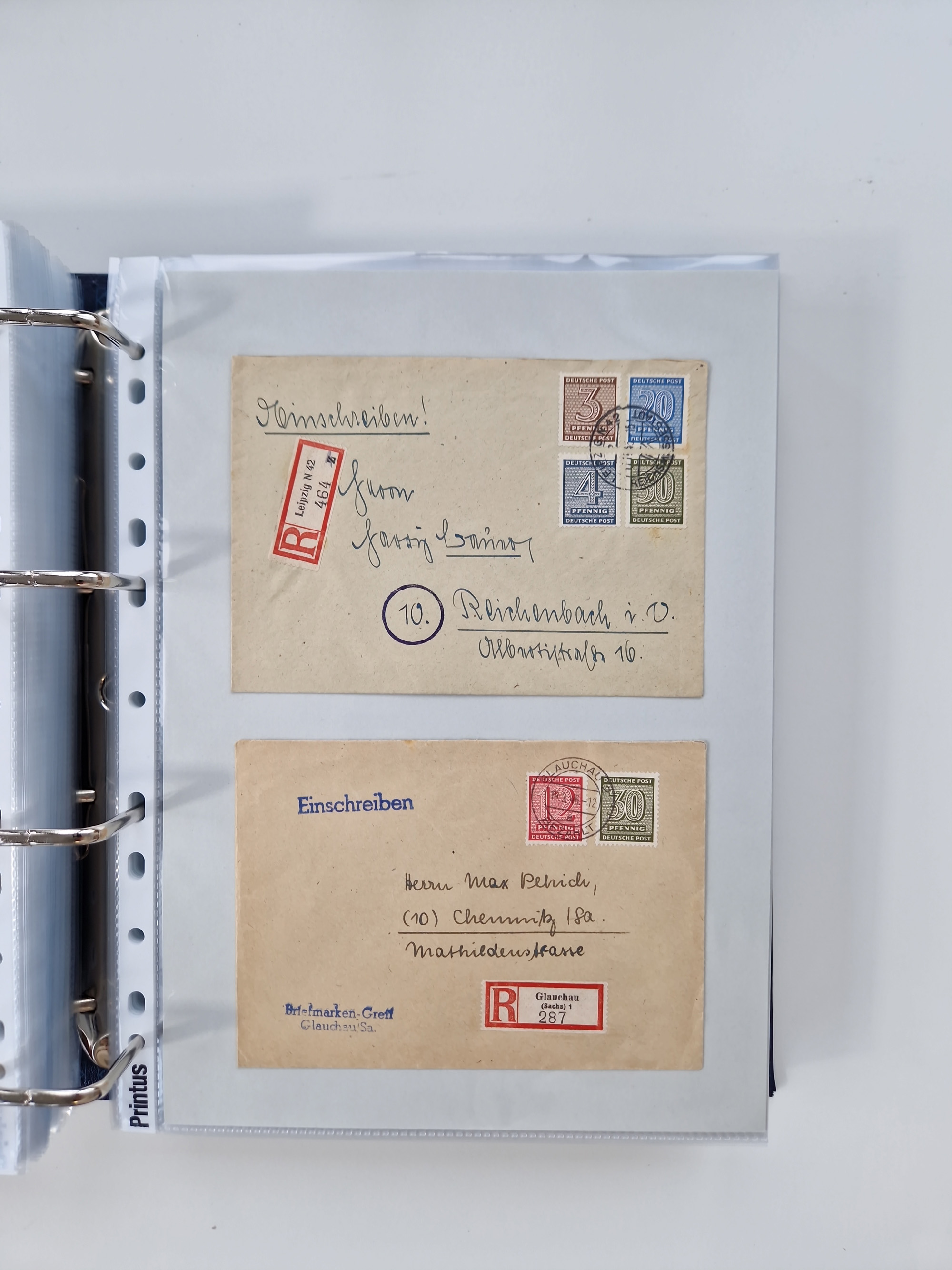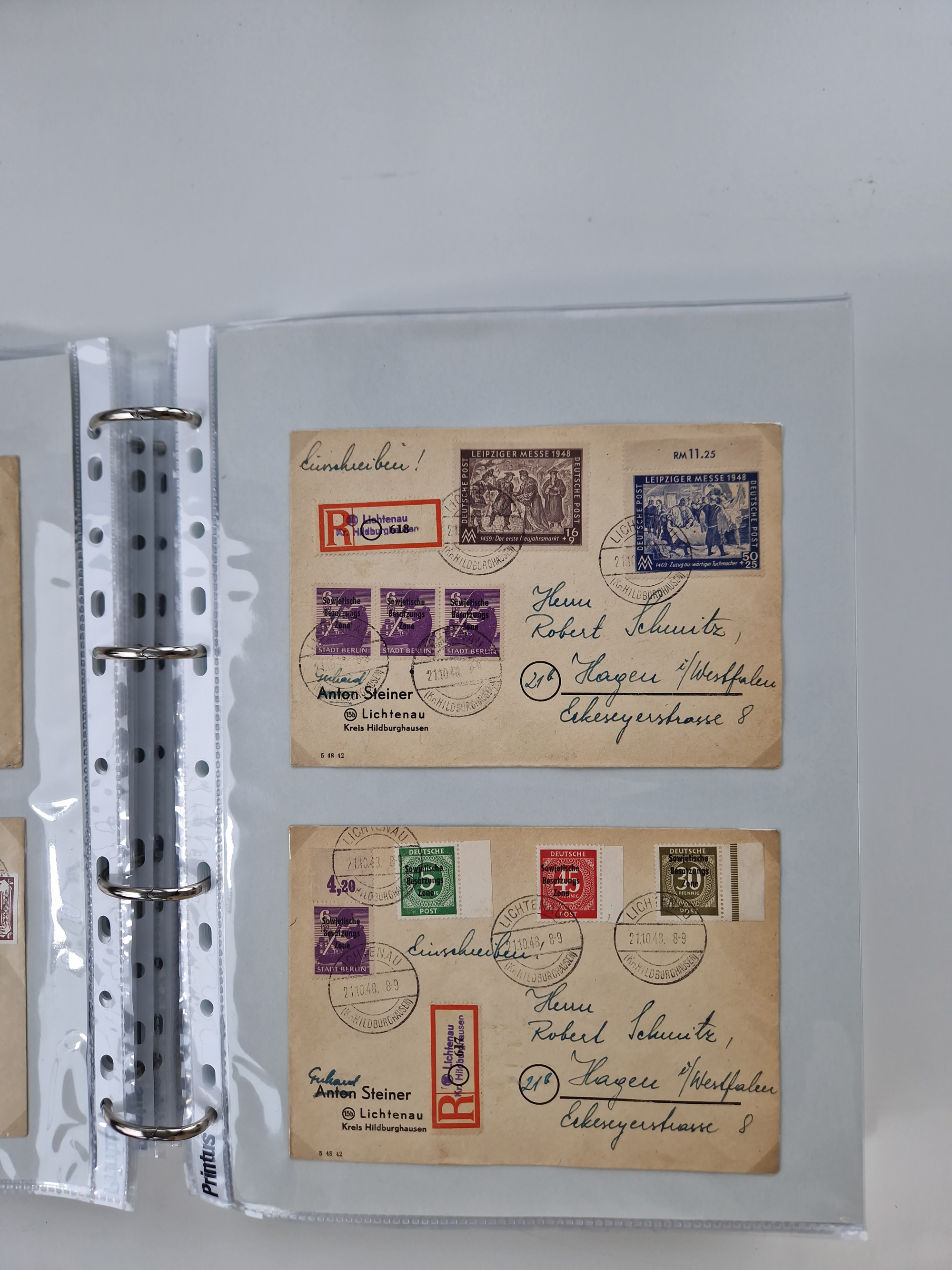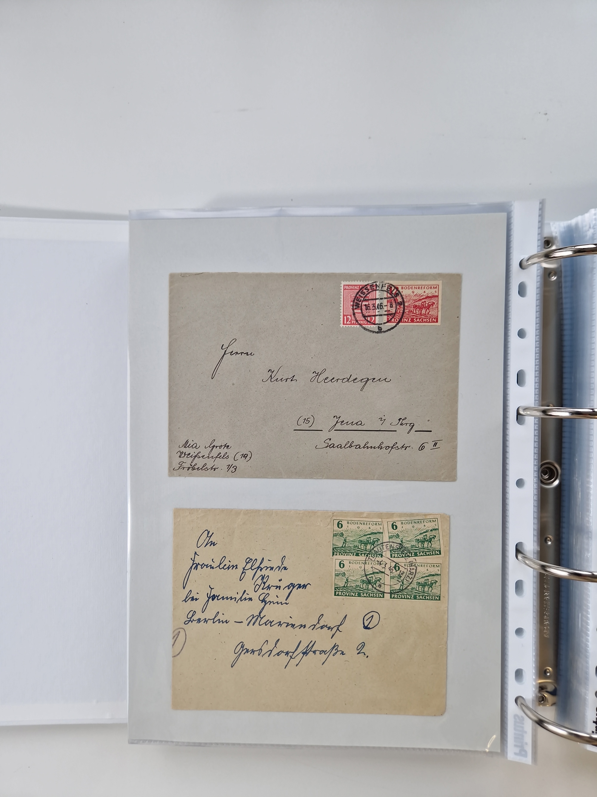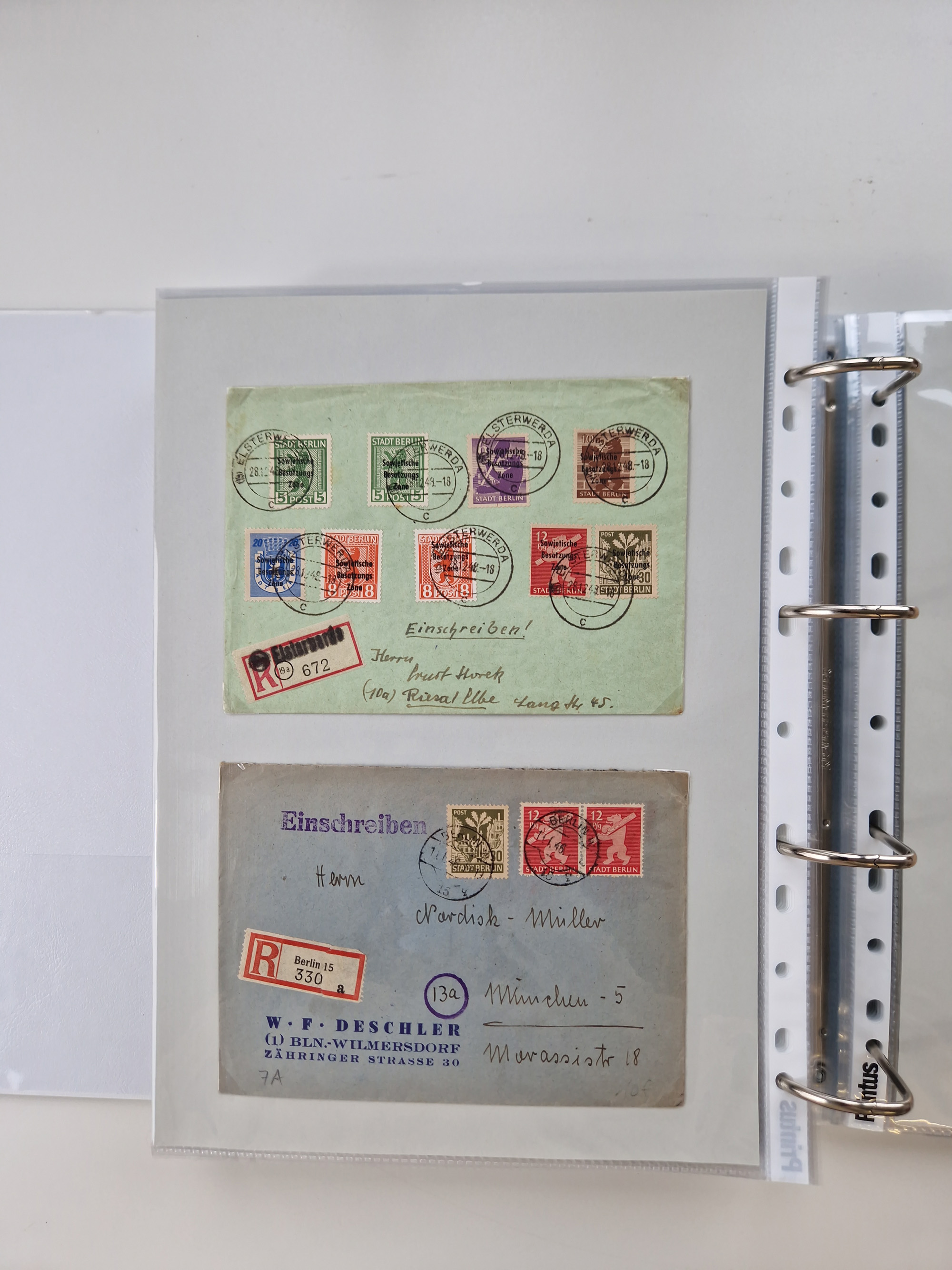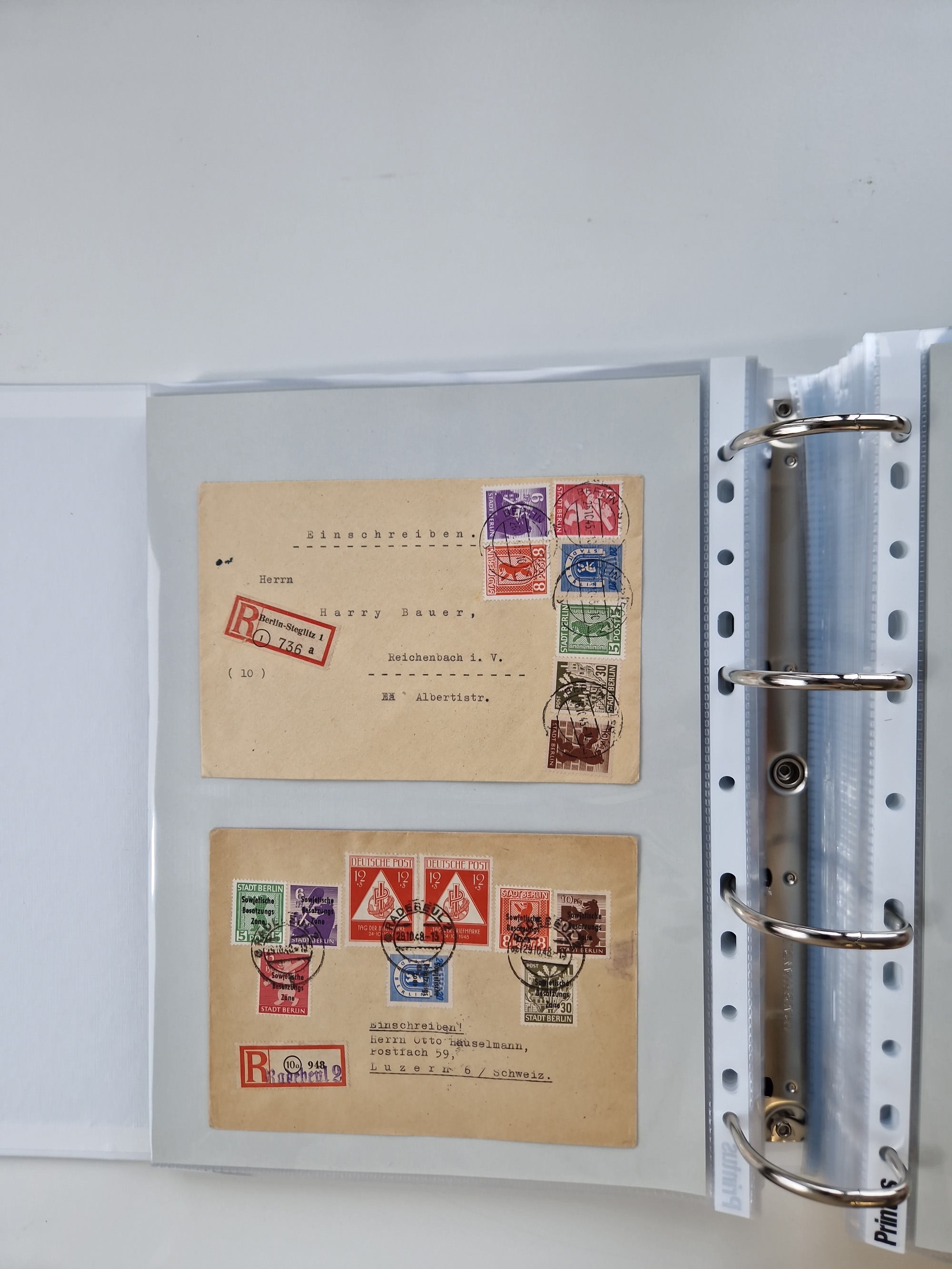 1945/49, umfangreiche Sammlung mit geschätzt 800-900 Briefen, Karten und Ganzsachen. Dabei viele R-Briefe und Satzbriefe, Bedarfspost Mecklenburg Vorpommern, Marken mit Rändern und Einheiten, Bezirkshandstempel mit Bedarfspost und weiteren Besonderheiten, sauber auf Albenblättern in drei Ordnern