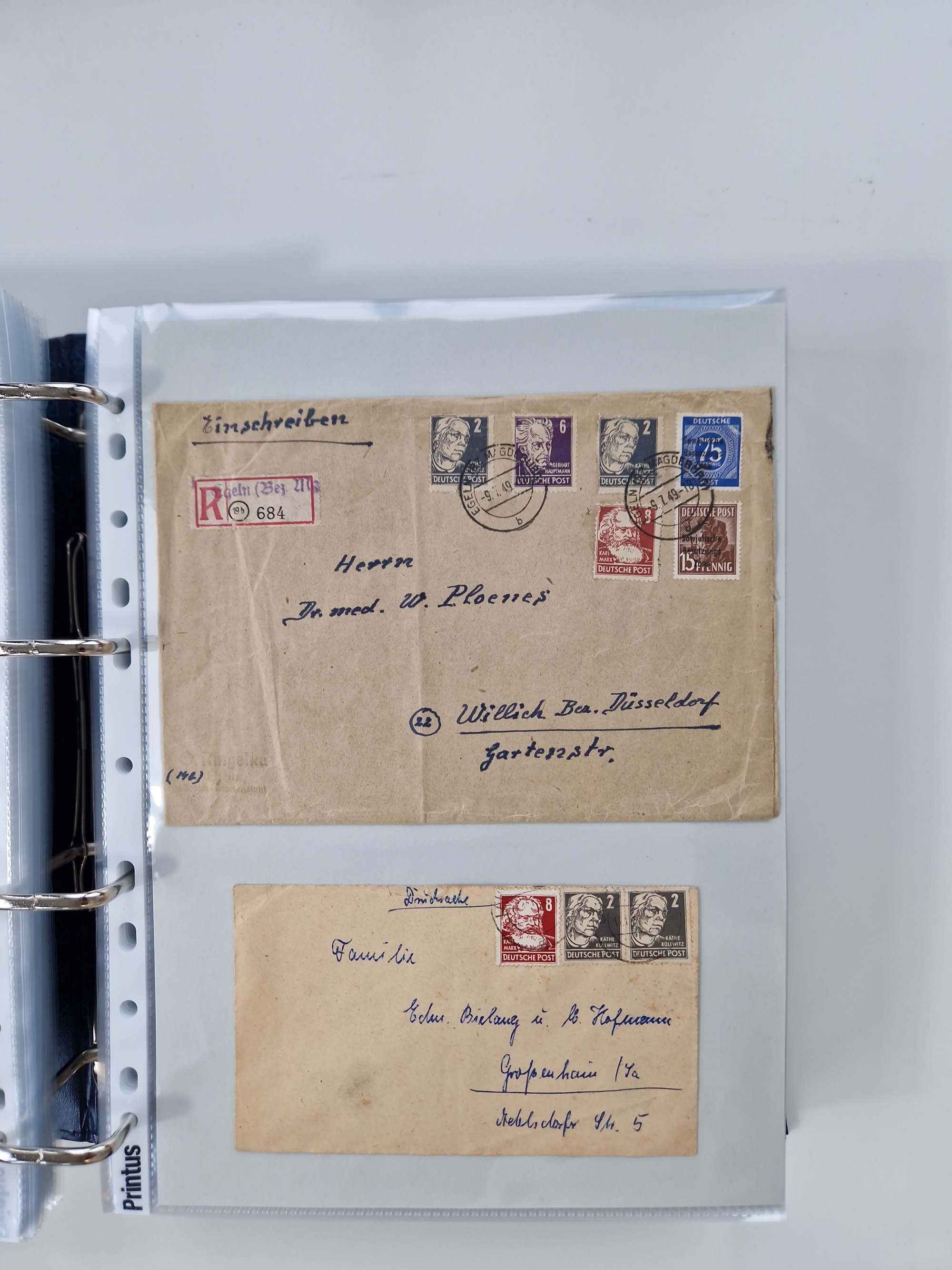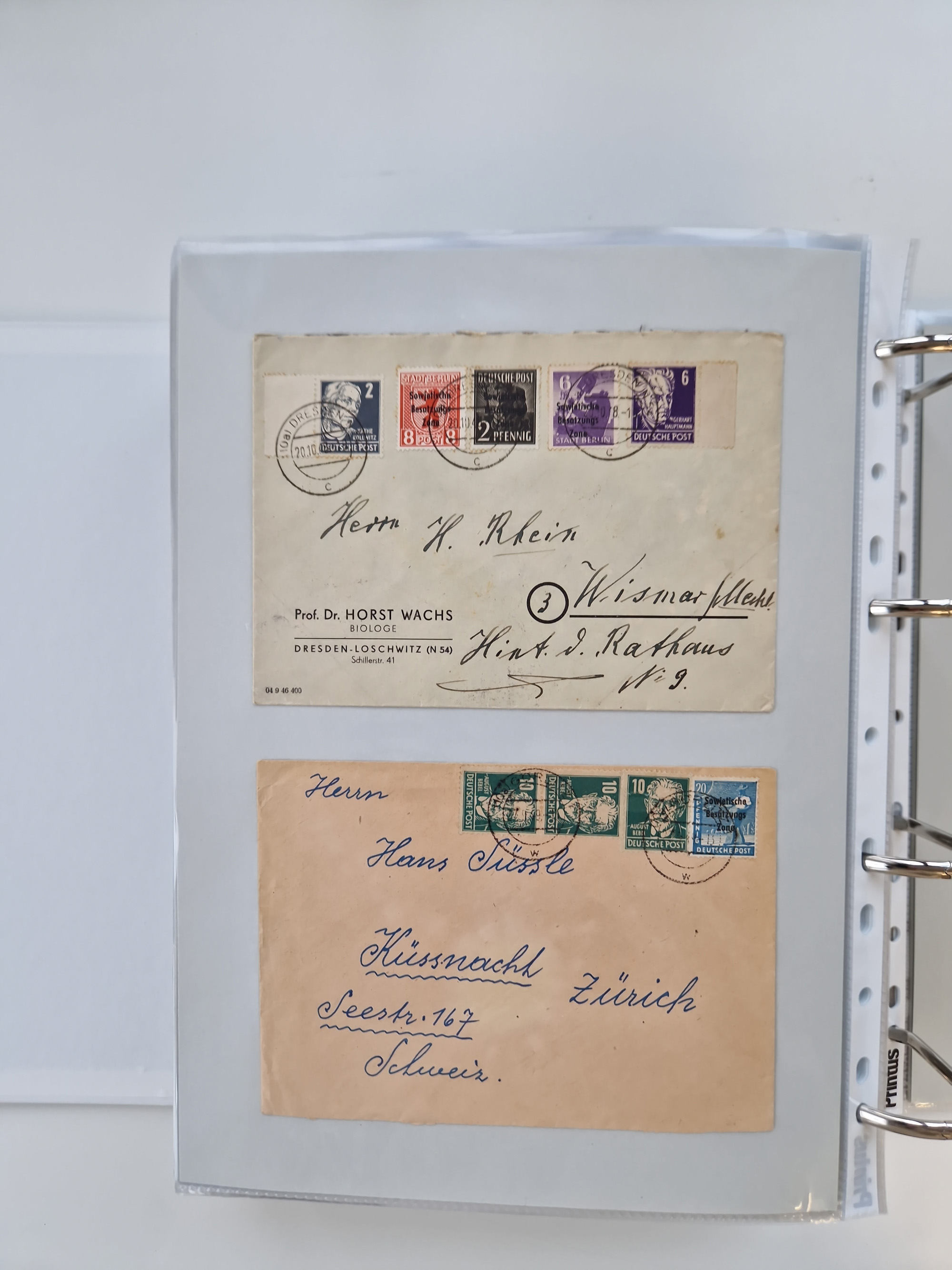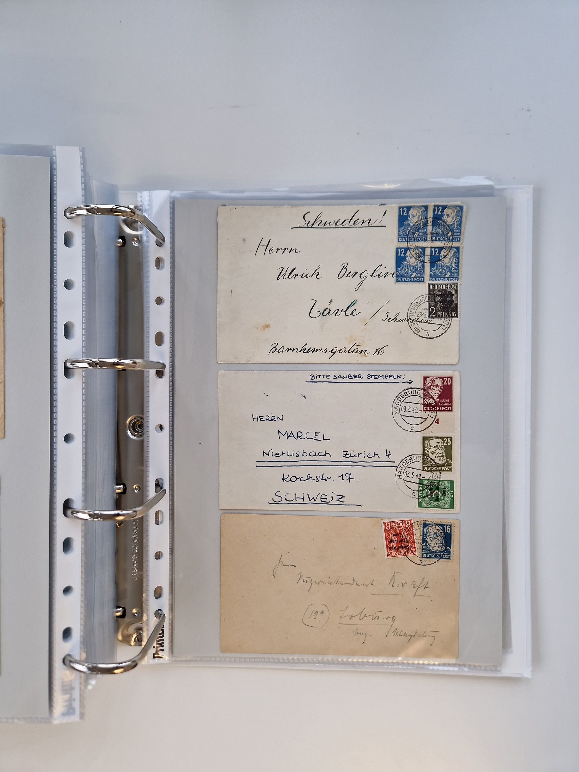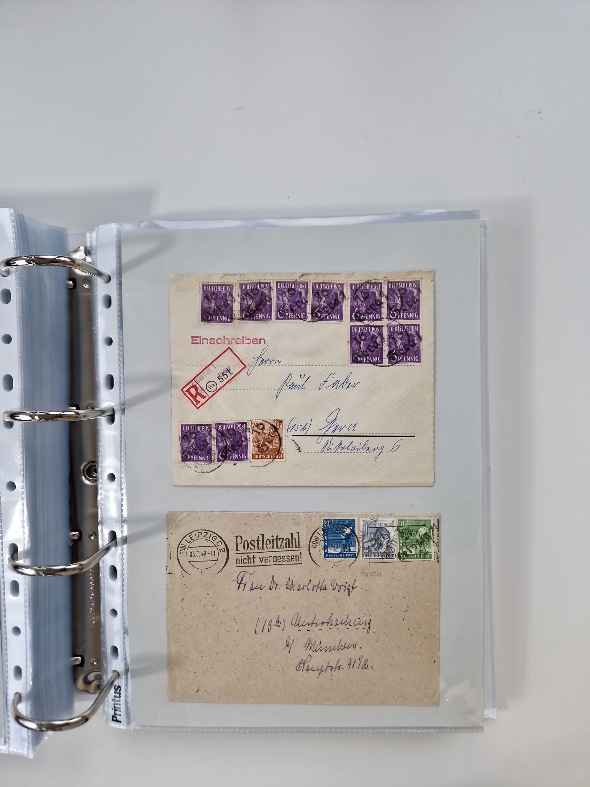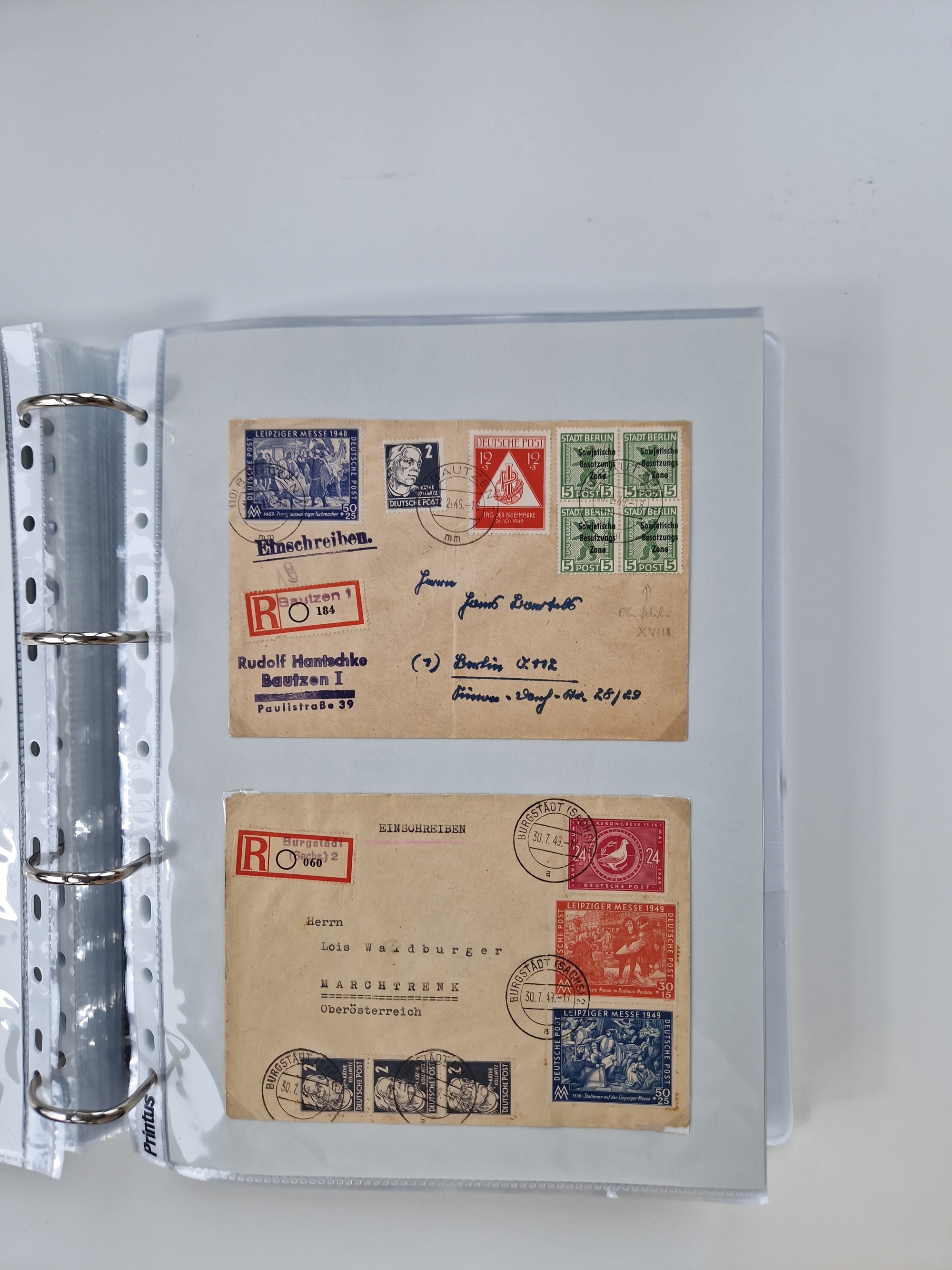 1945/49, umfangreiche Sammlung mit geschätzt 800-900 Briefen, Karten und Ganzsachen. Dabei viele R-Briefe und Satzbriefe, Bedarfspost Mecklenburg Vorpommern, Marken mit Rändern und Einheiten, Bezirkshandstempel mit Bedarfspost und weiteren Besonderheiten, sauber auf Albenblättern in drei Ordnern
