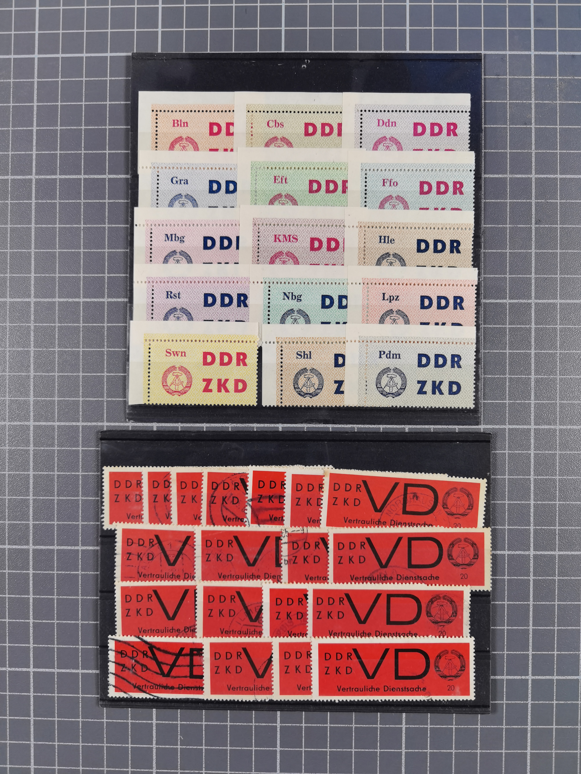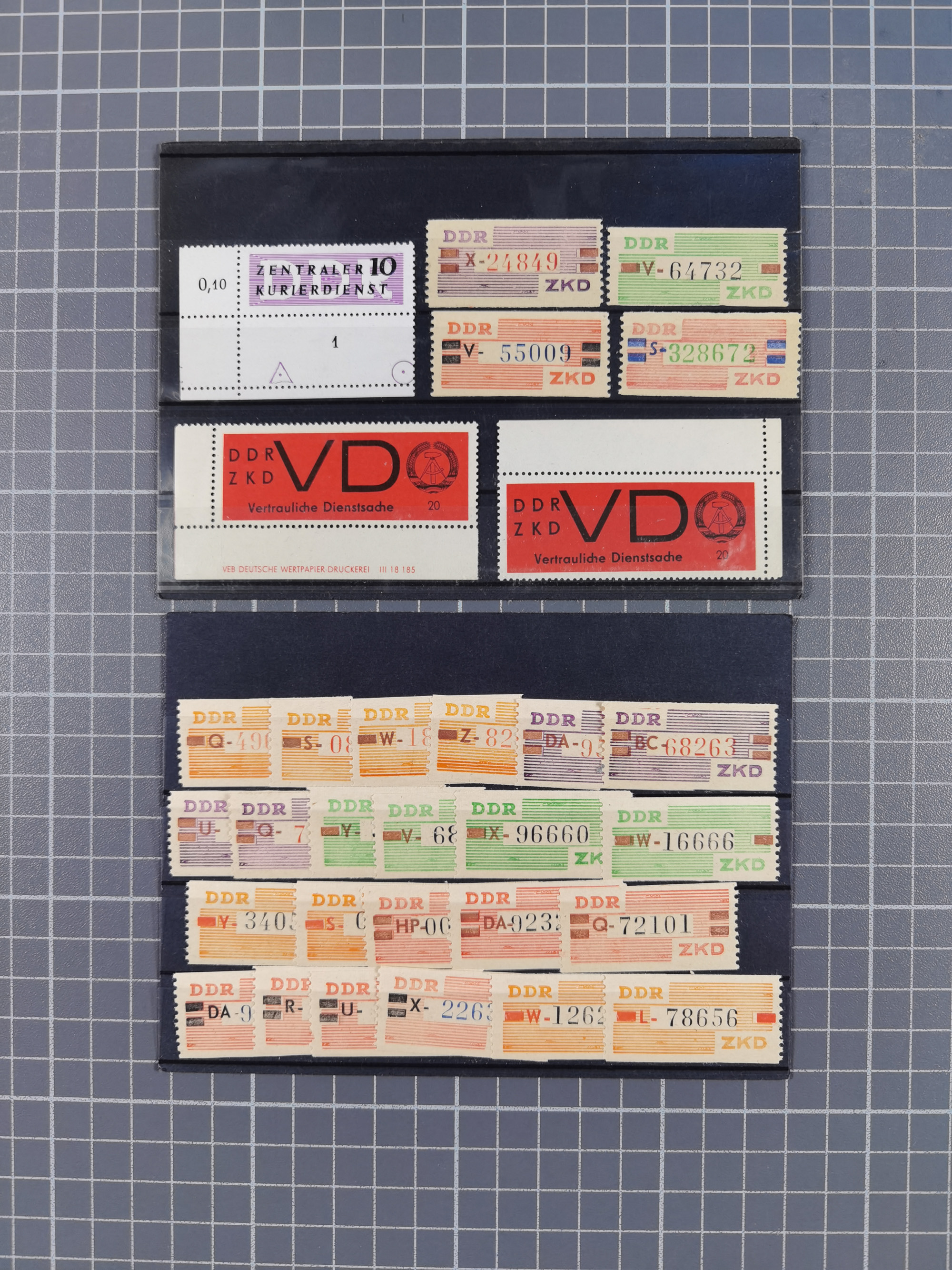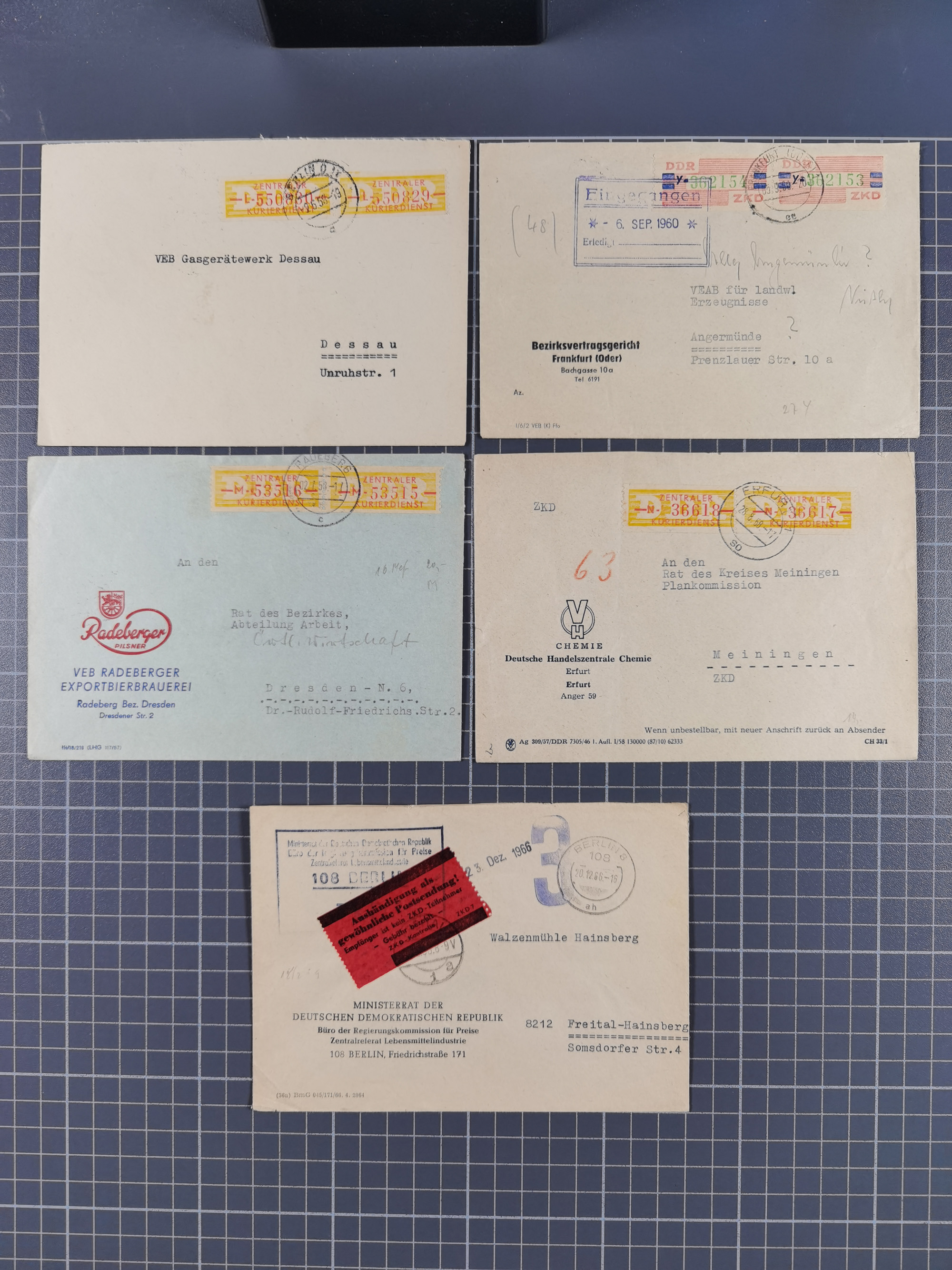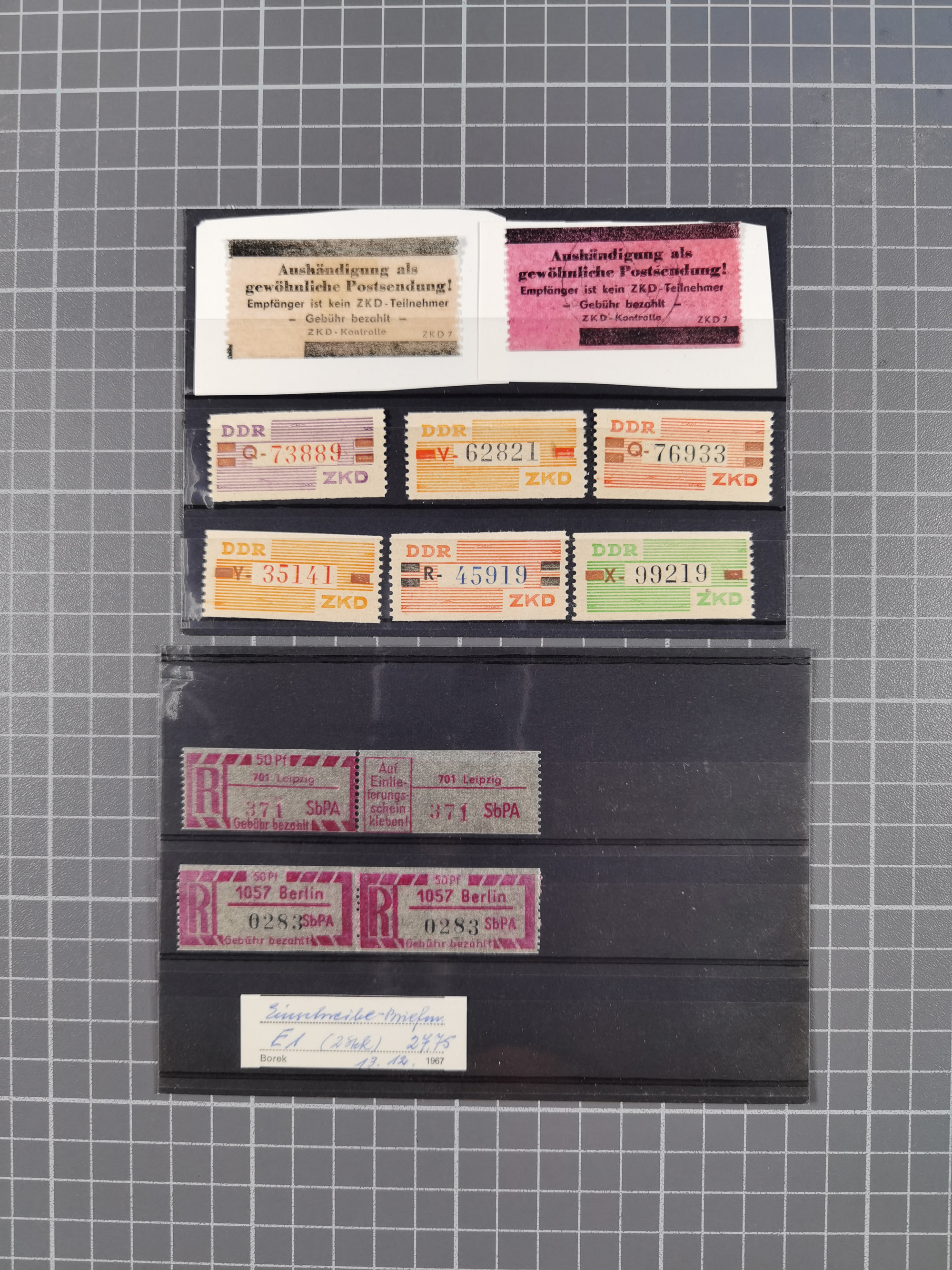 1958/66, 4 Briefe mit ZKD und einer mit "Aushändigung als gewöhnliche Postsendung - Empfänger ist kein ZKD-Teilnehmer - Gebühr bezahlt - Kontrollstelle ZKD 7" Zettel, dazu seltene ZKD-Muster-Vignette "Aushändigung als gewöhnliche Postsendung" und einige Marken.