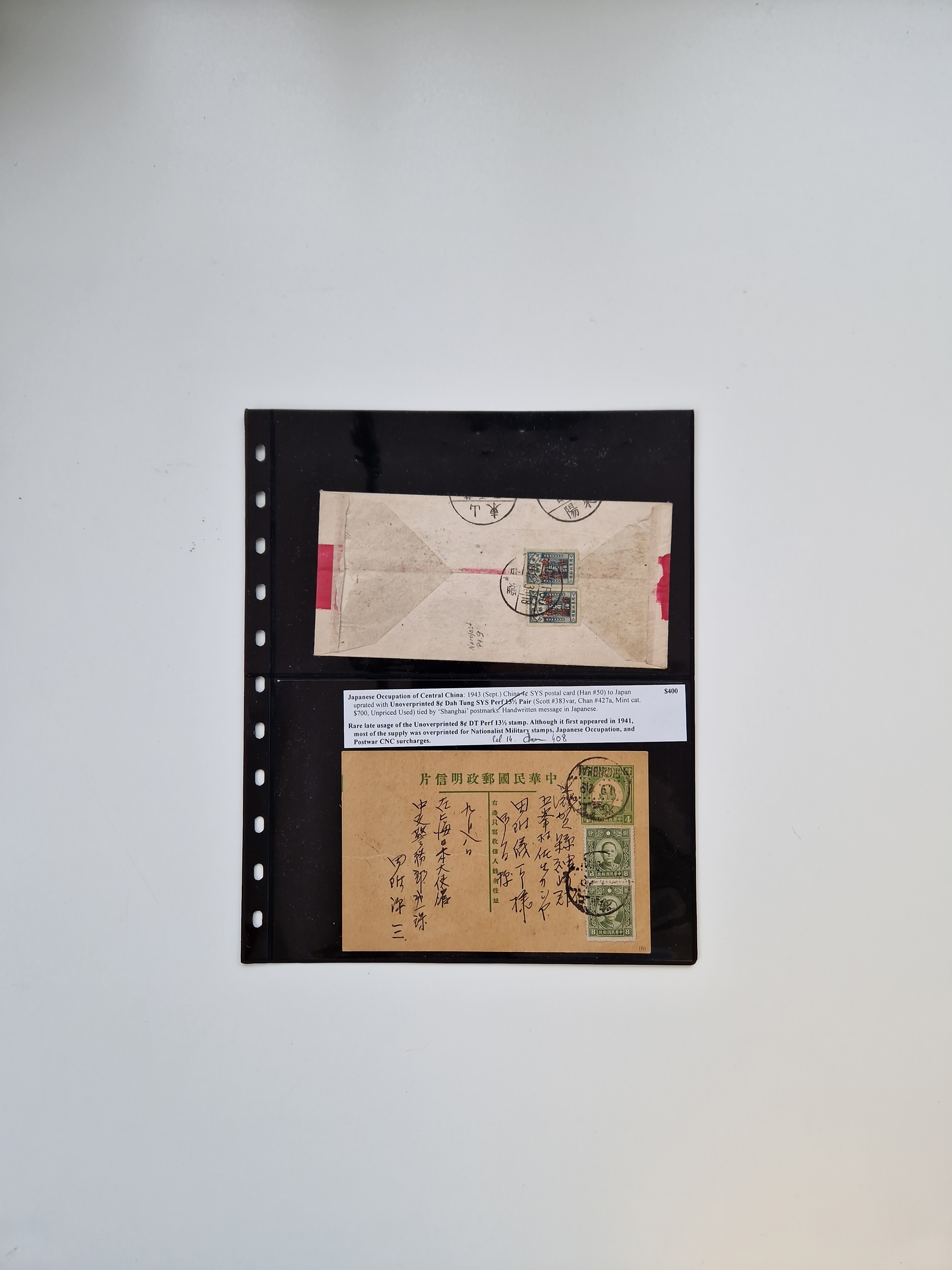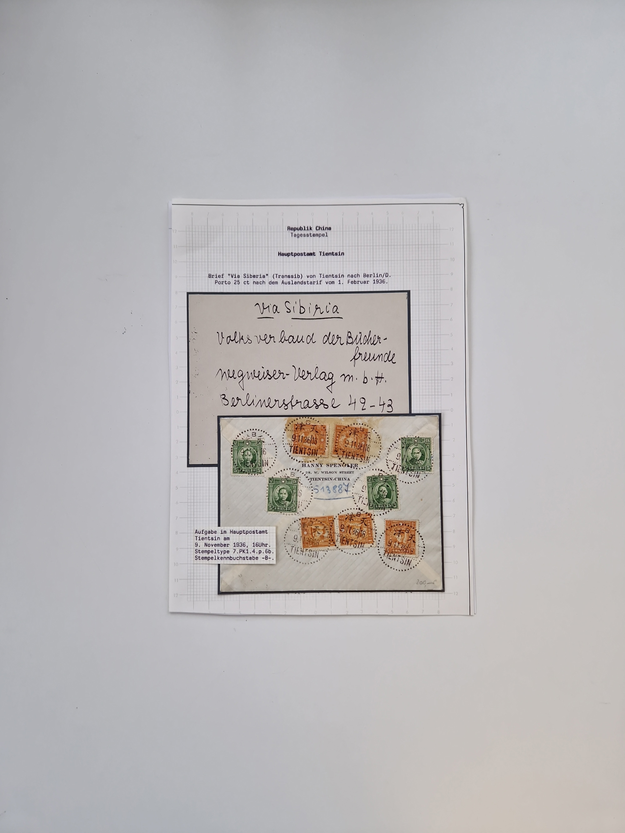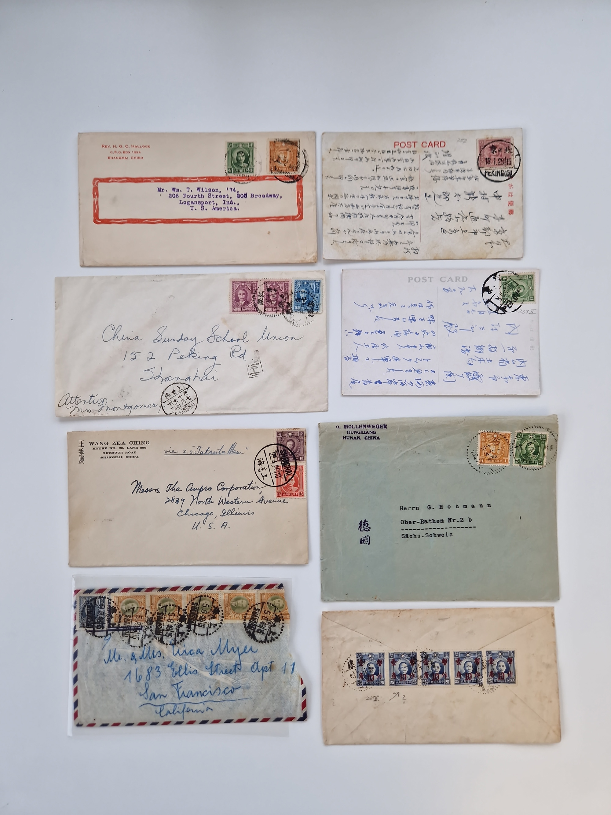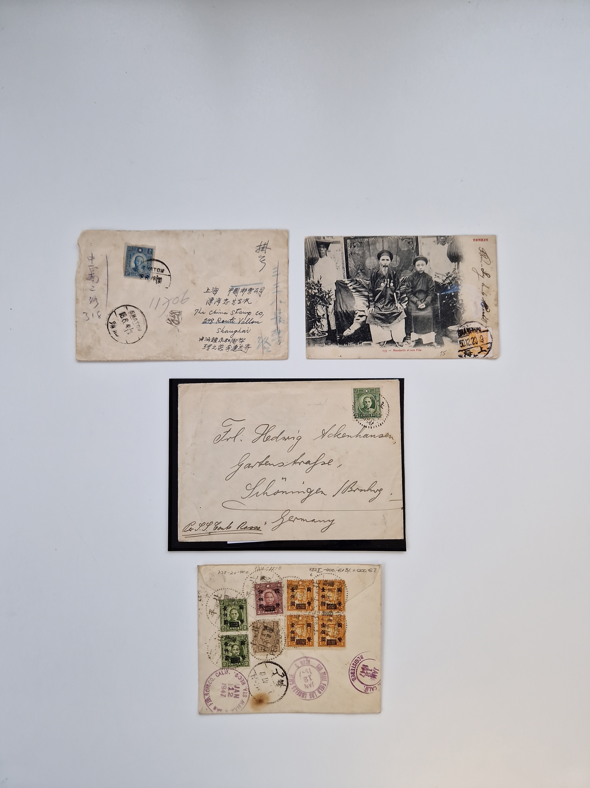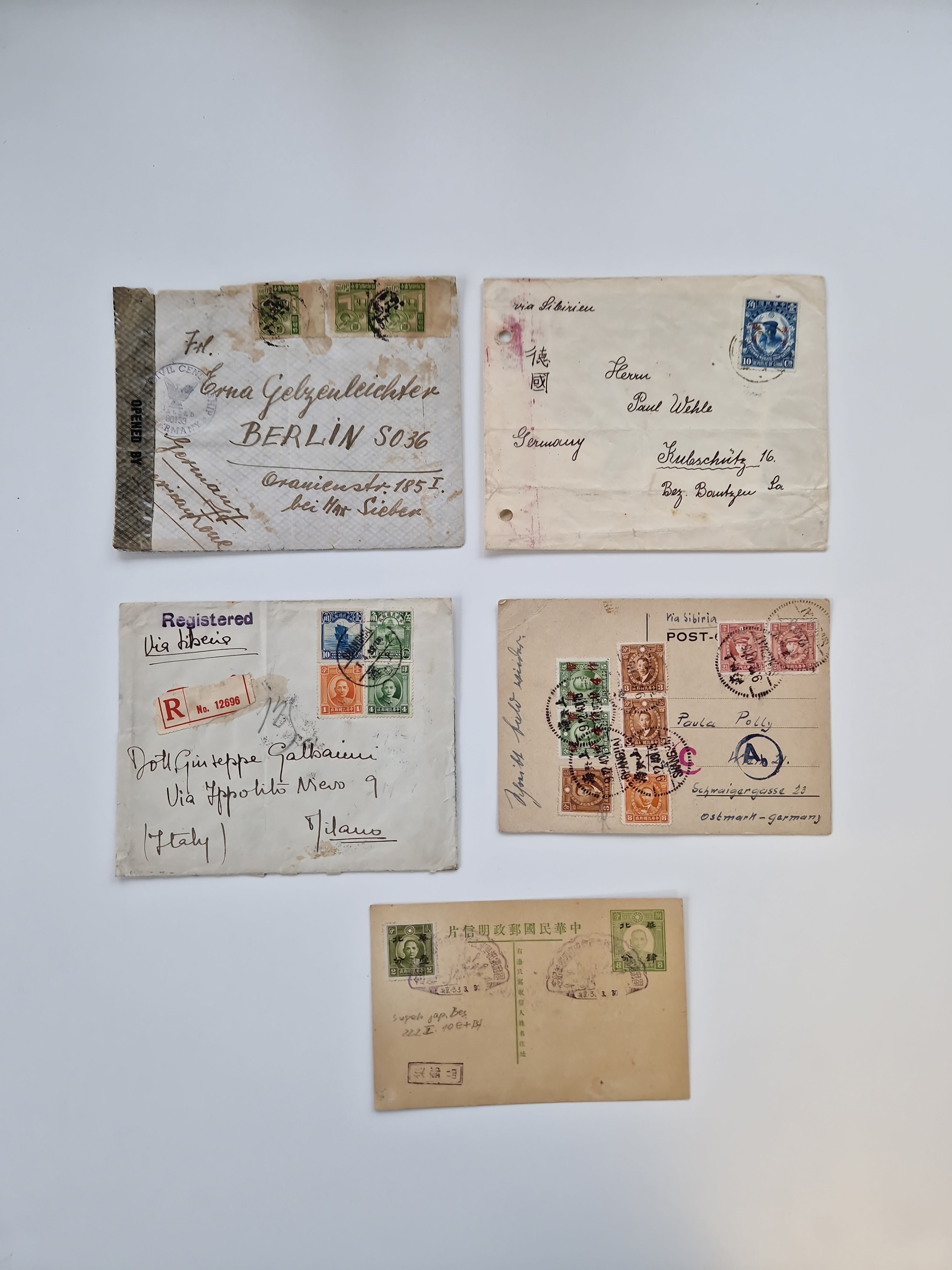 1912/20 (ca.), Chinese Republic early years, group of 13 covers and cards, noted 1 c. overprinted coiled dragon (x4) used with “PEKING” to 1913 postcard to Italy with unusual “ITALY = VIA SIBERIA” straight-line marking, also some stampless mail, printed matter, etc., together with 5 postcards franked with Japanese issues with cds. "TIENTSIN", “DAIREN”, etc., overall in good condition