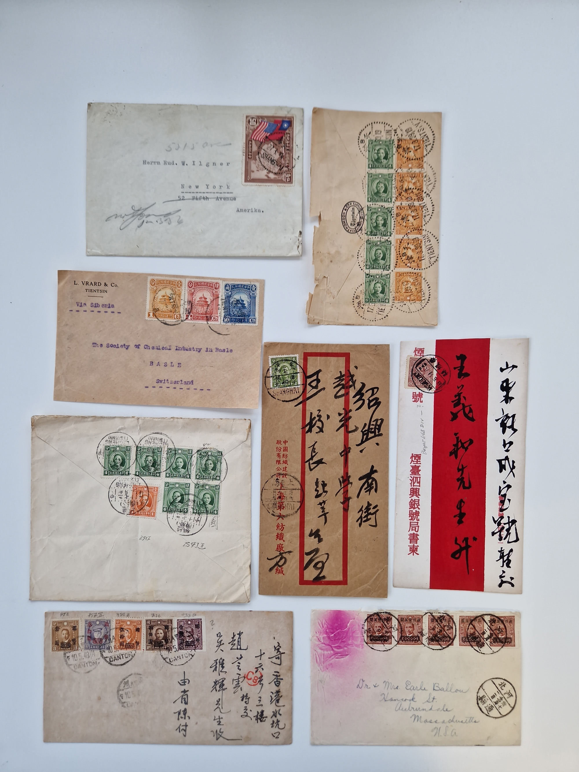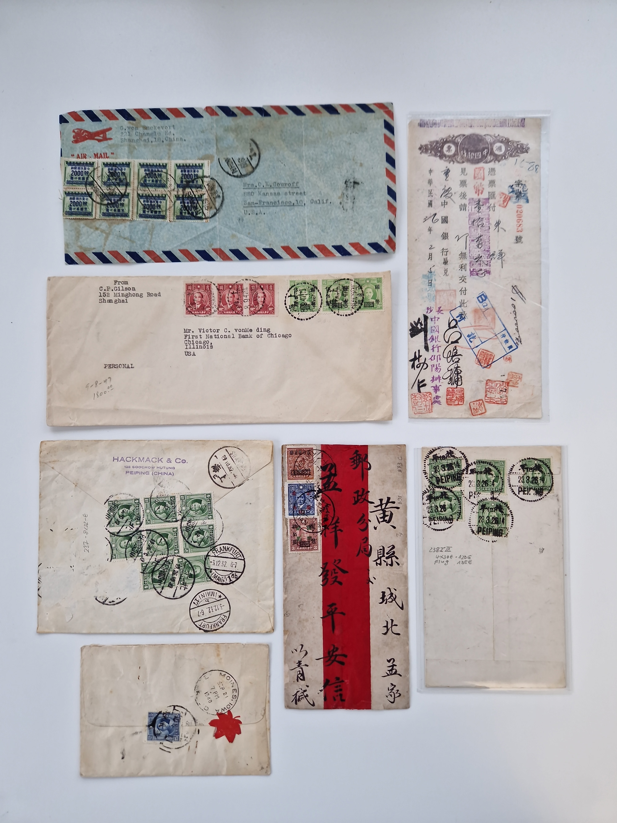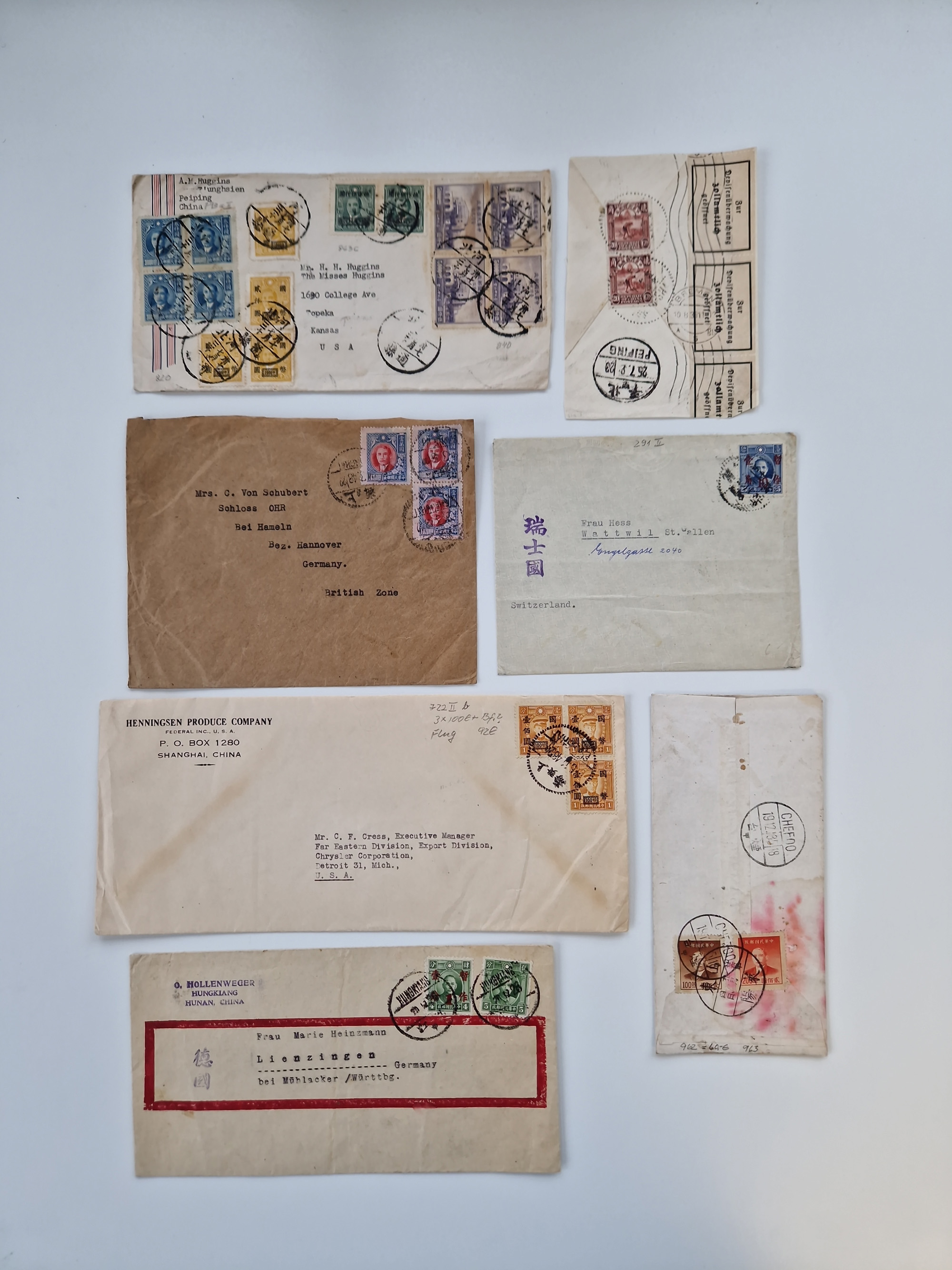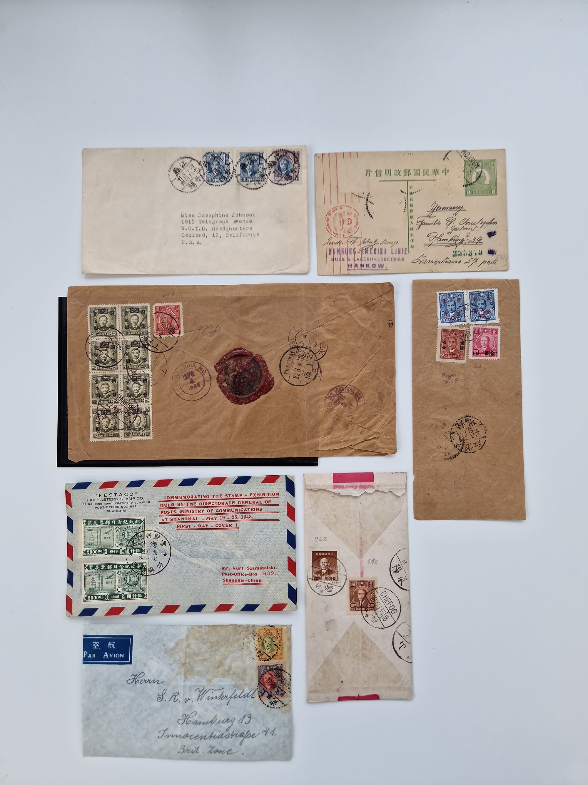 1934/49 (ca.), Chinese Airmail attractive accumulation of over 120 covers with a wealth of interesting usages and postal rates, multiple- and combination frankings, censored airmail, many better with 1937 “HONG KONG - SAN FRANCISCO RECEIVED - FIRST FLIGHT” handstamp on registered cover from “SHANGHAI 26 4 37”, scarce 1948 Martyr of Revolution 50 c. on ½ c. brown bloc of 20 with additional franking used to reverse of envelope to the provincial department of education in Wuchang, inland airmail franked at 63 cents from “PAHSIEN CHUNGKING” to Shanghai, 1947 incoming mail from Tientsin to British Occupation Zone in Germany with censor paper seal and mark, etc., somewhat mixed condition as to be expected. A most useful specialist lot