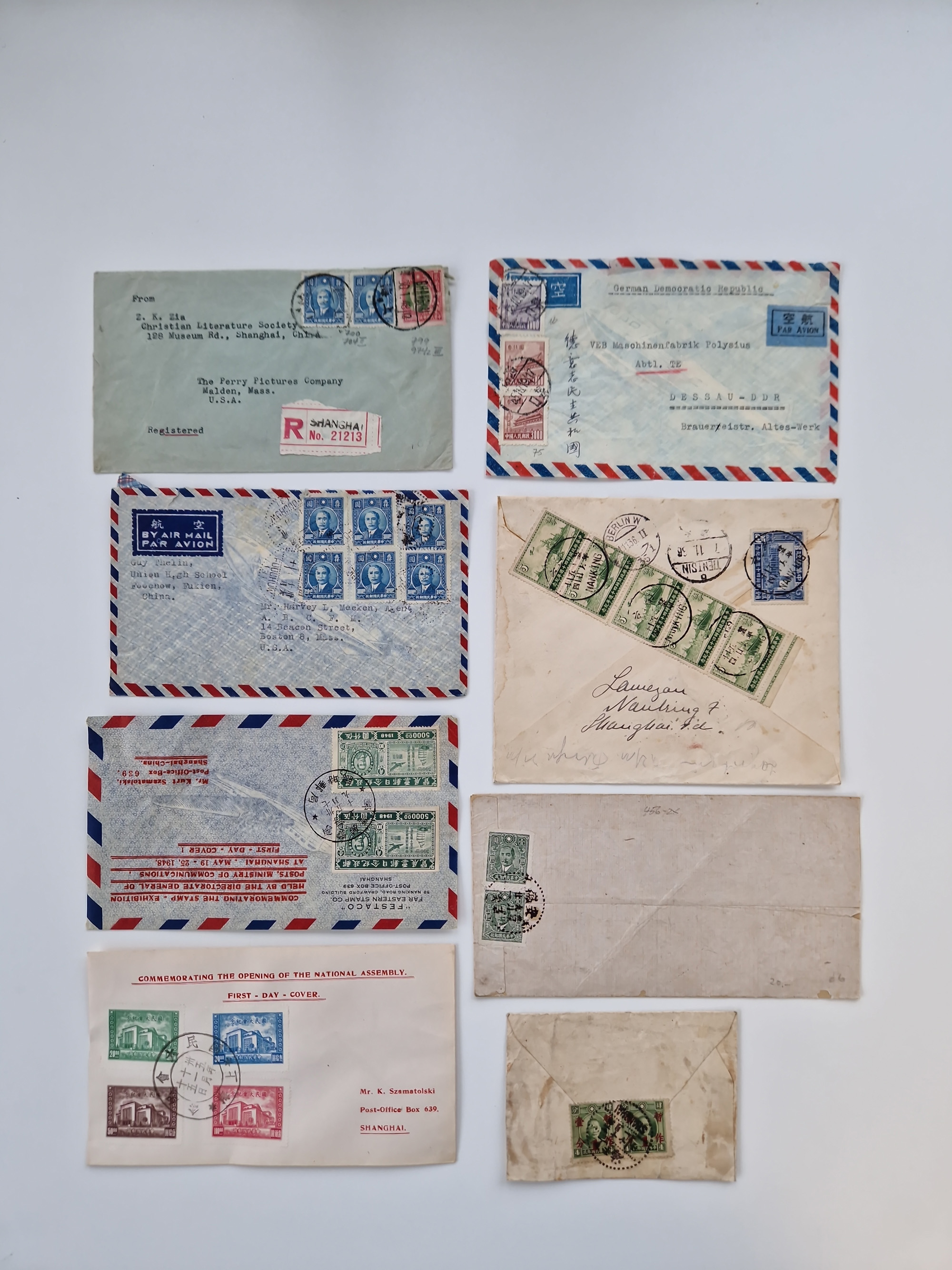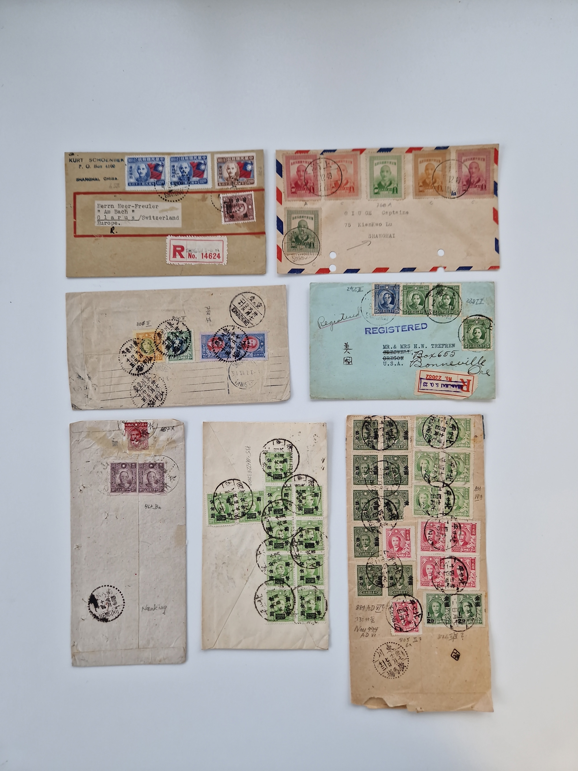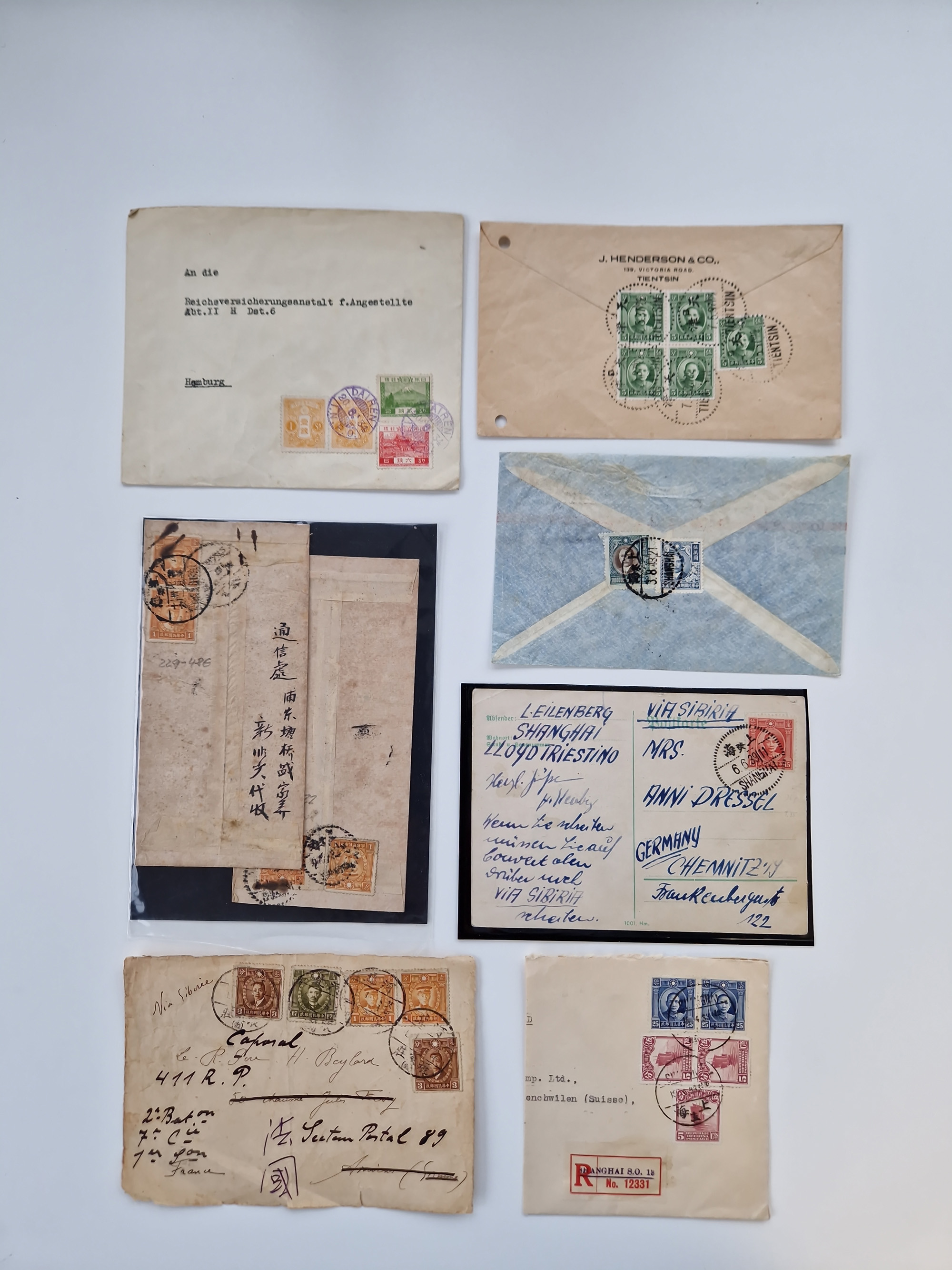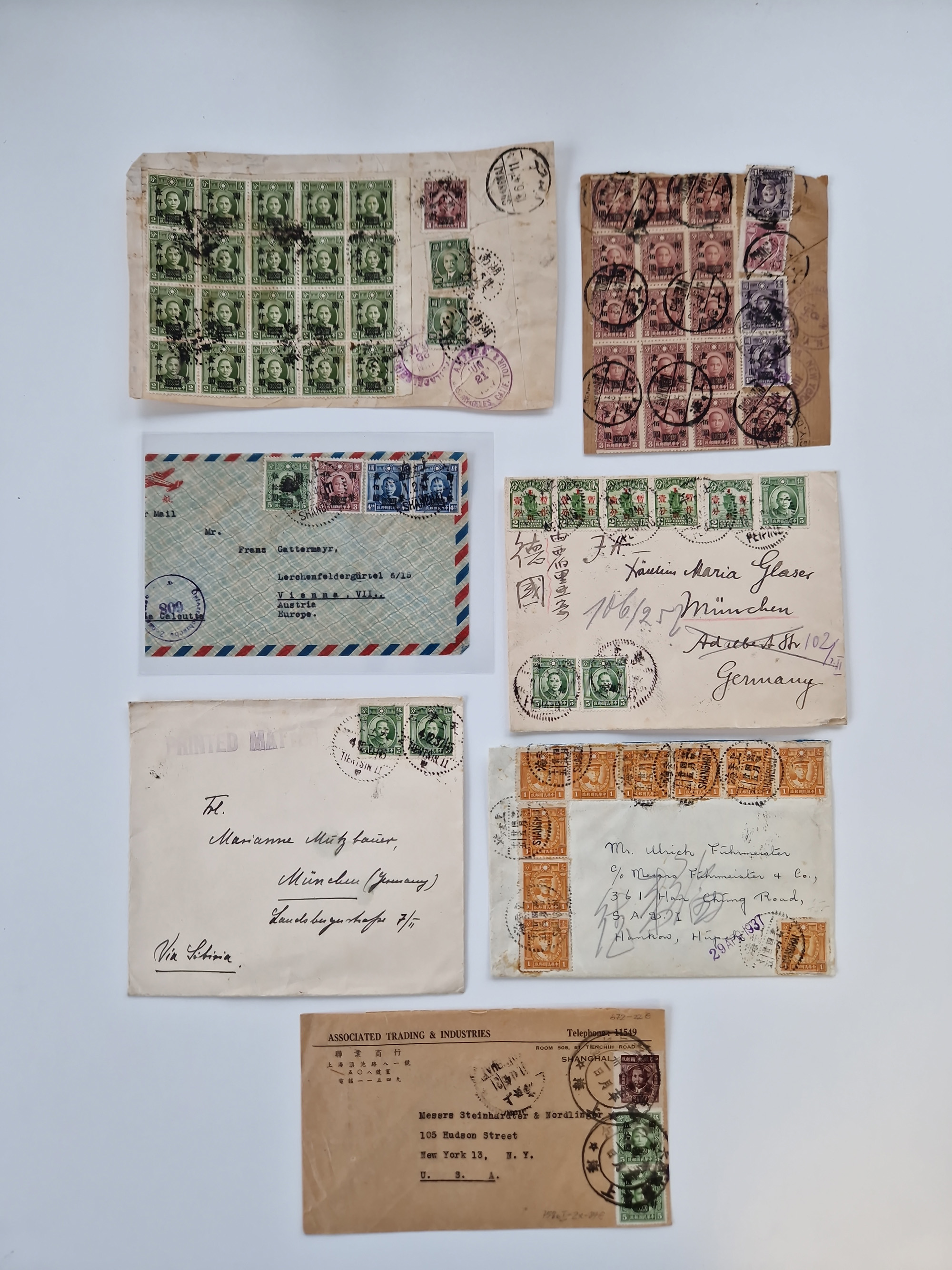 1934/49 (ca.), Chinese Airmail attractive accumulation of over 120 covers with a wealth of interesting usages and postal rates, multiple- and combination frankings, censored airmail, many better with 1937 “HONG KONG - SAN FRANCISCO RECEIVED - FIRST FLIGHT” handstamp on registered cover from “SHANGHAI 26 4 37”, scarce 1948 Martyr of Revolution 50 c. on ½ c. brown bloc of 20 with additional franking used to reverse of envelope to the provincial department of education in Wuchang, inland airmail franked at 63 cents from “PAHSIEN CHUNGKING” to Shanghai, 1947 incoming mail from Tientsin to British Occupation Zone in Germany with censor paper seal and mark, etc., somewhat mixed condition as to be expected. A most useful specialist lot