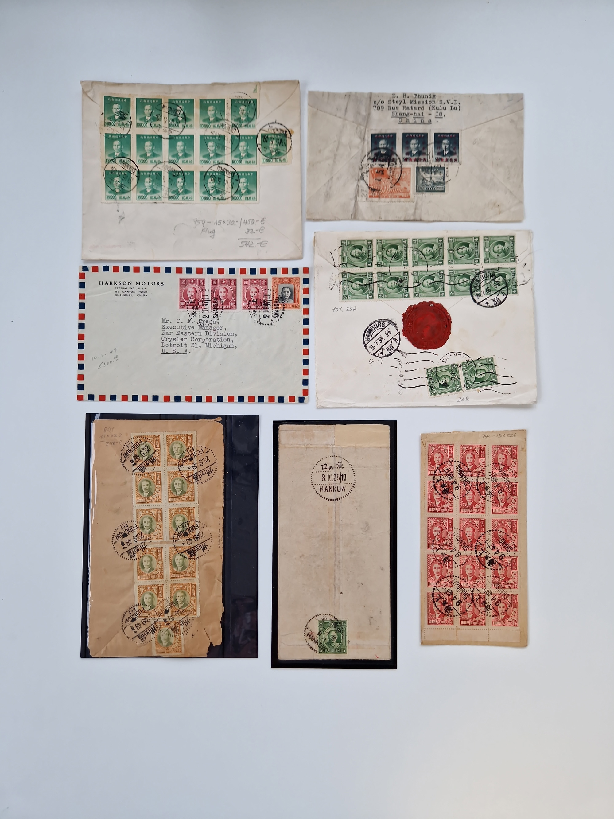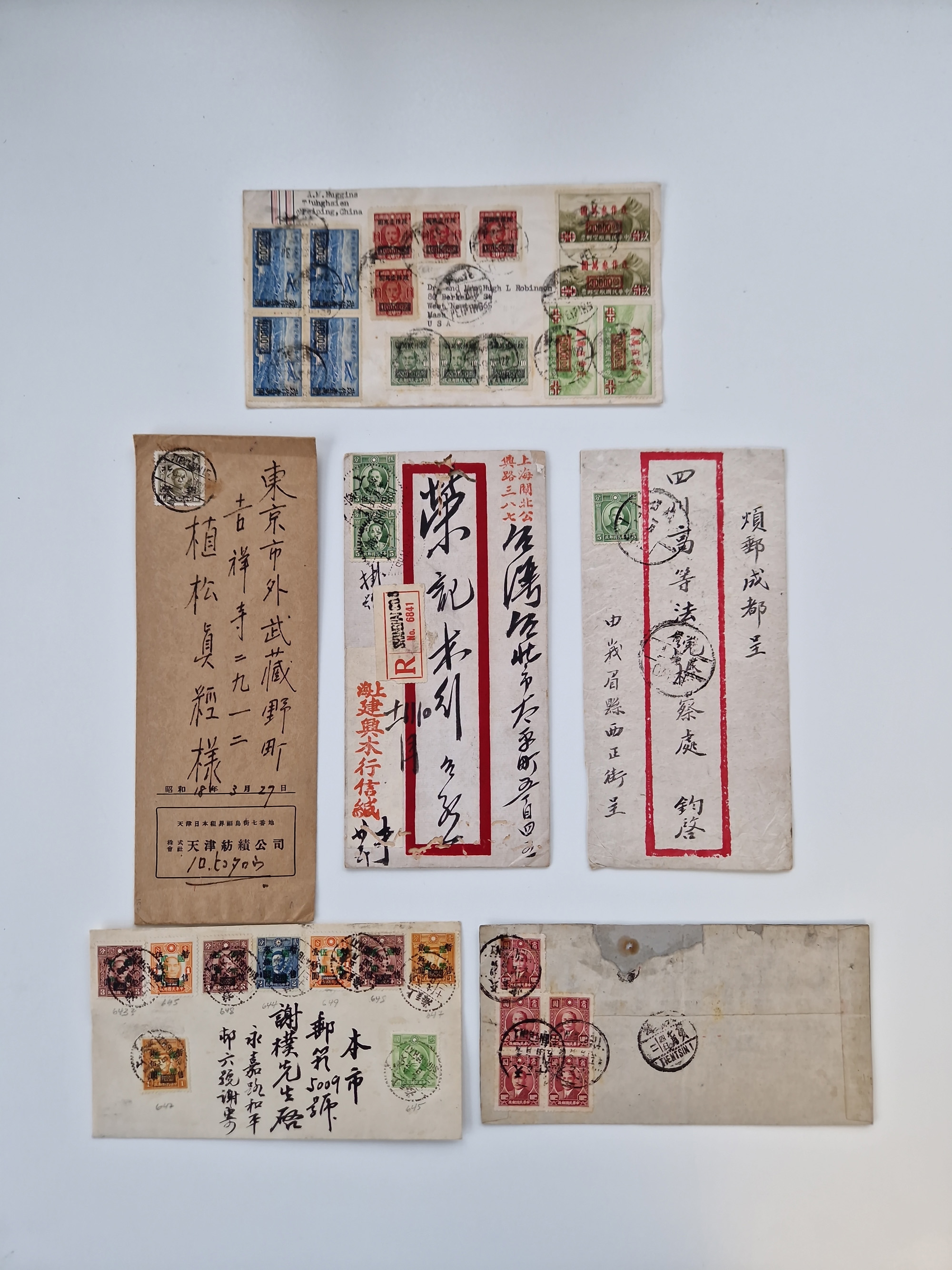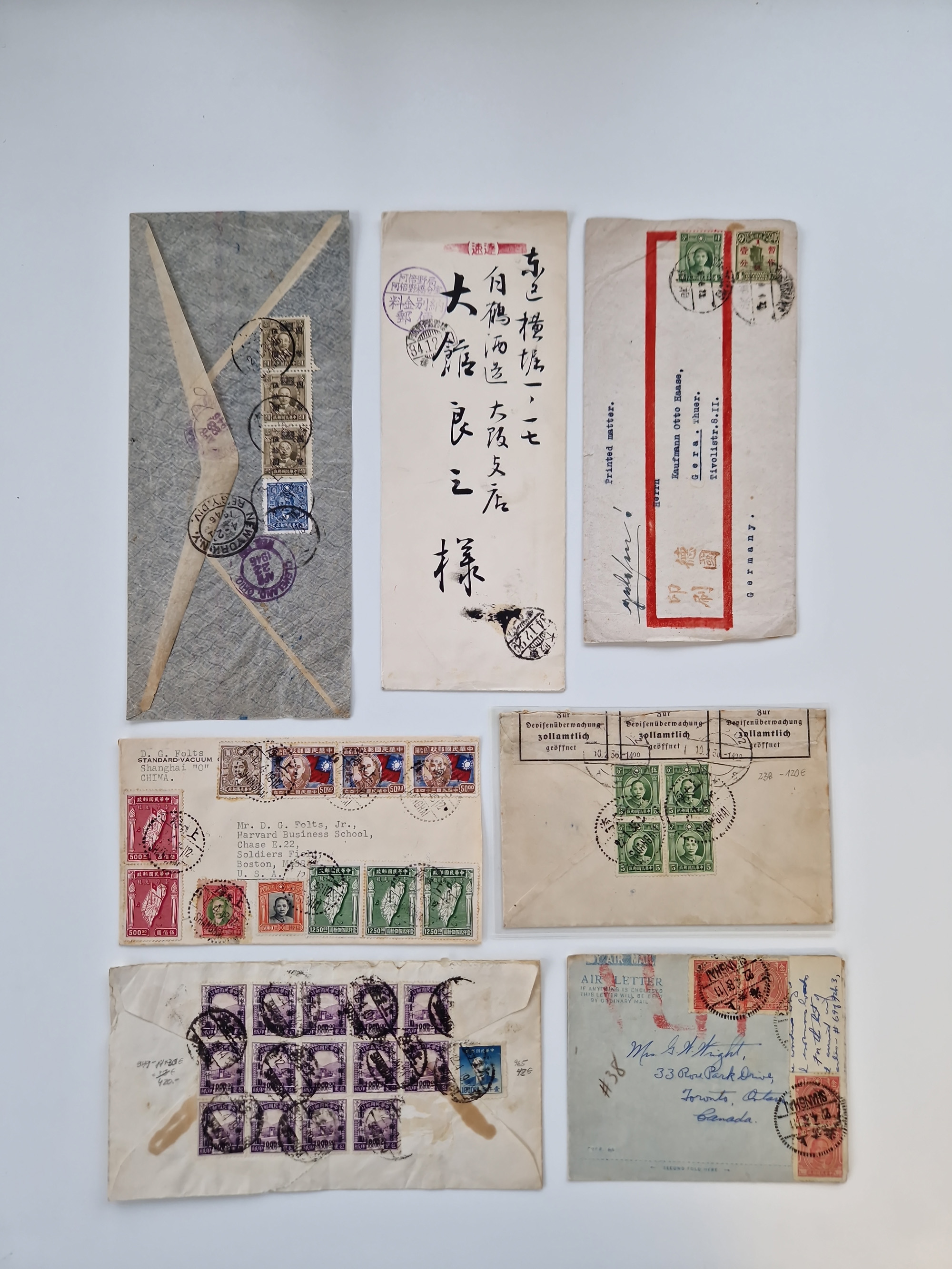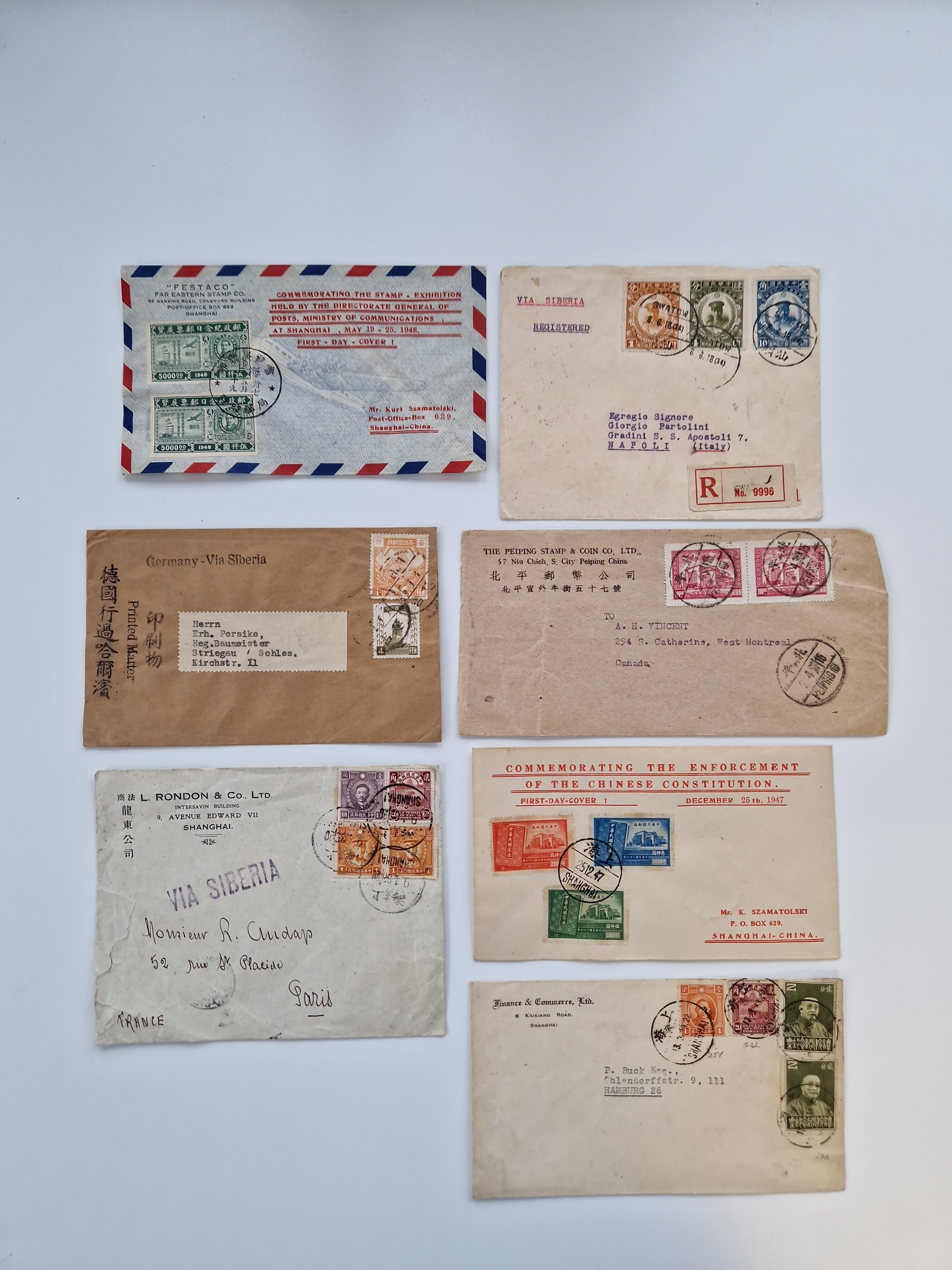 1934/49 (ca.), Chinese Airmail attractive accumulation of over 120 covers with a wealth of interesting usages and postal rates, multiple- and combination frankings, censored airmail, many better with 1937 “HONG KONG - SAN FRANCISCO RECEIVED - FIRST FLIGHT” handstamp on registered cover from “SHANGHAI 26 4 37”, scarce 1948 Martyr of Revolution 50 c. on ½ c. brown bloc of 20 with additional franking used to reverse of envelope to the provincial department of education in Wuchang, inland airmail franked at 63 cents from “PAHSIEN CHUNGKING” to Shanghai, 1947 incoming mail from Tientsin to British Occupation Zone in Germany with censor paper seal and mark, etc., somewhat mixed condition as to be expected. A most useful specialist lot