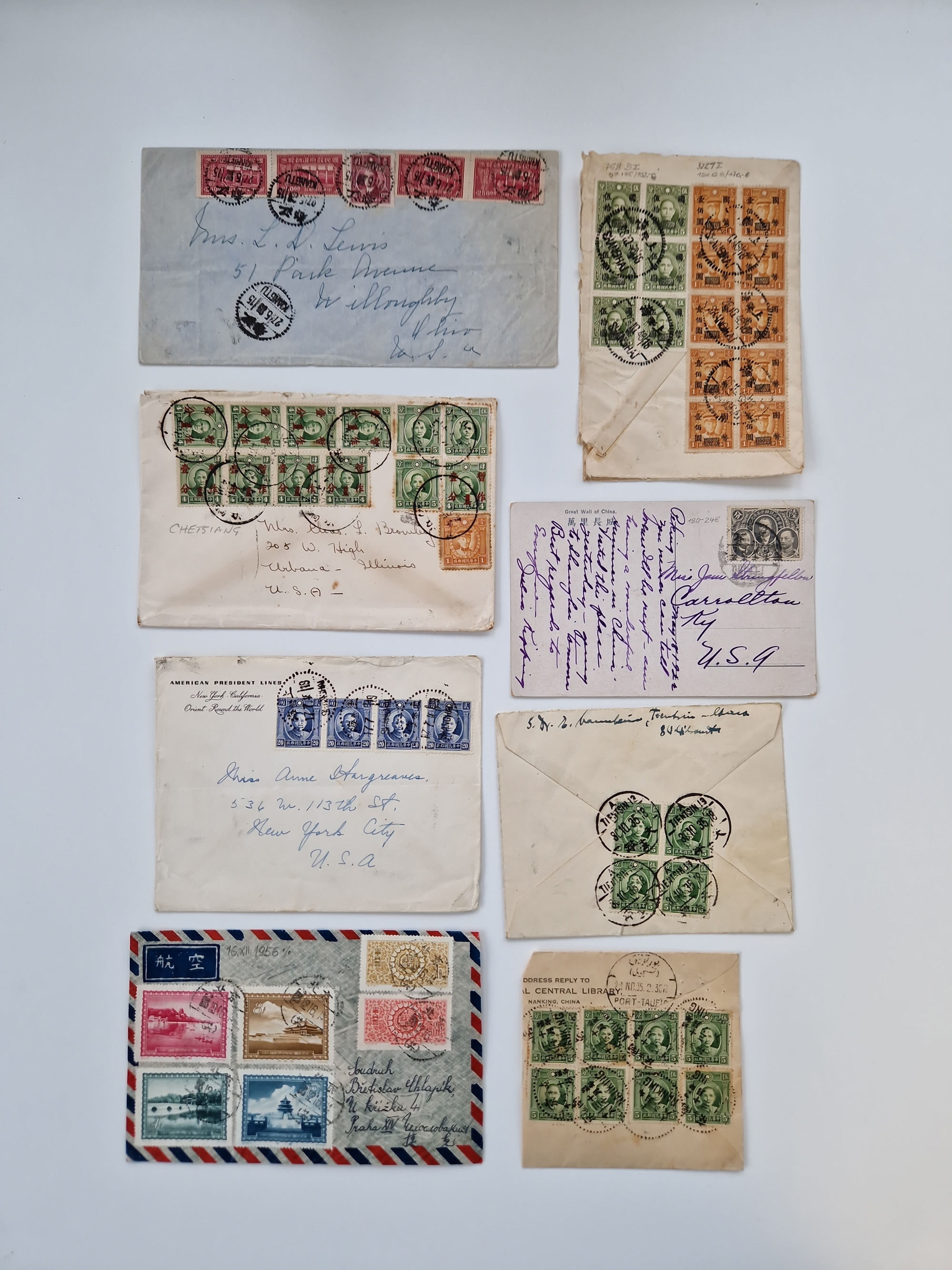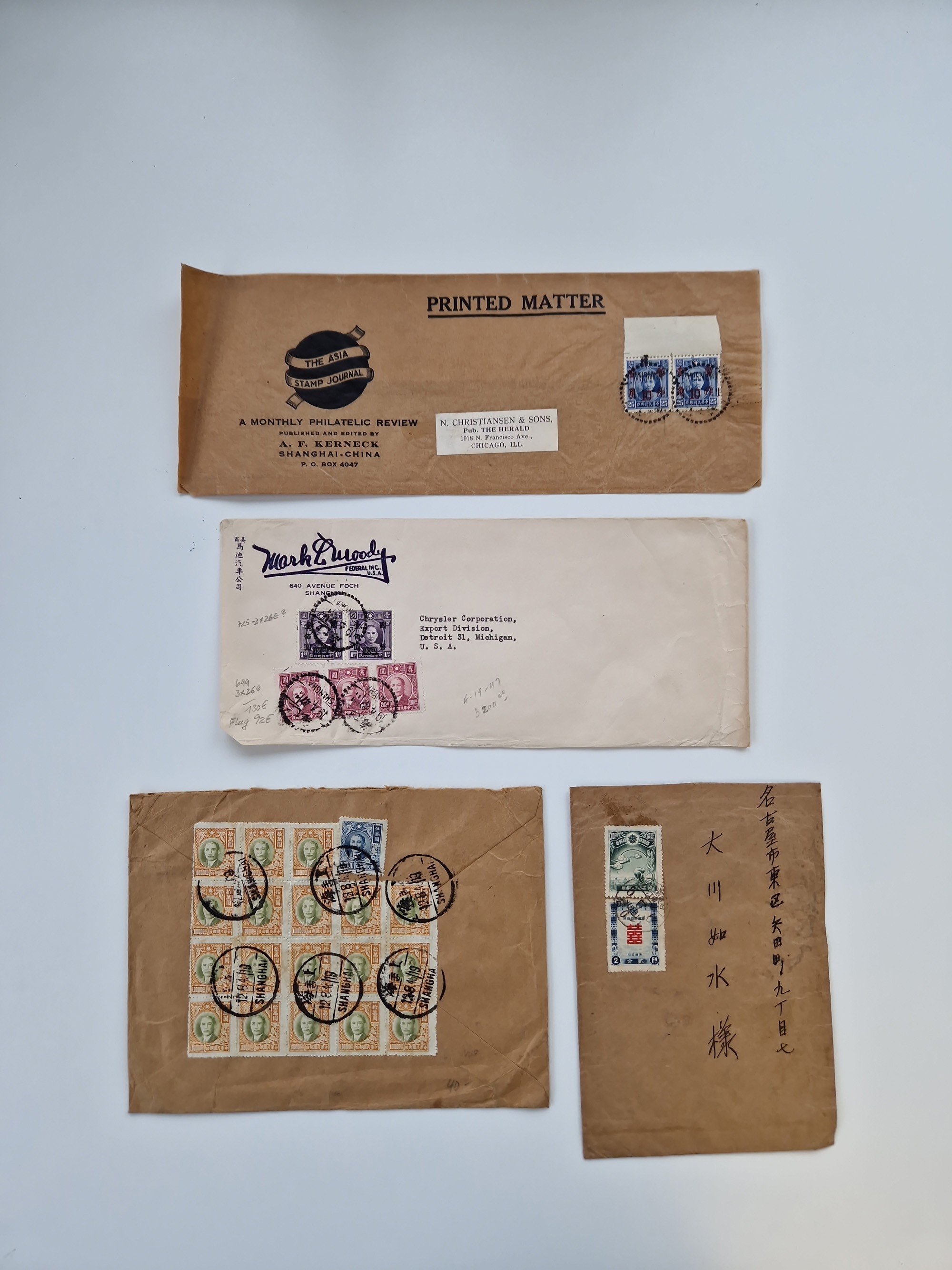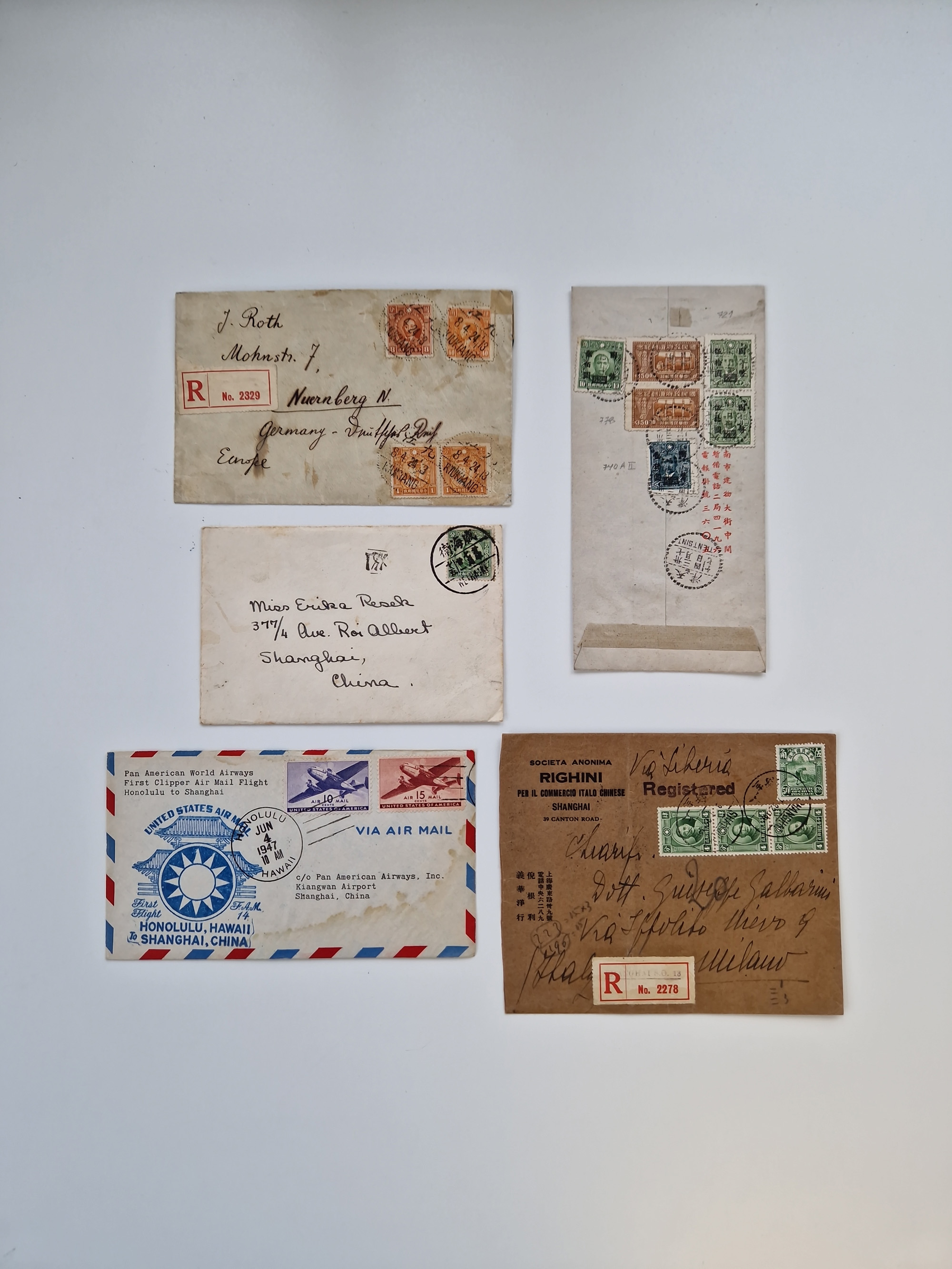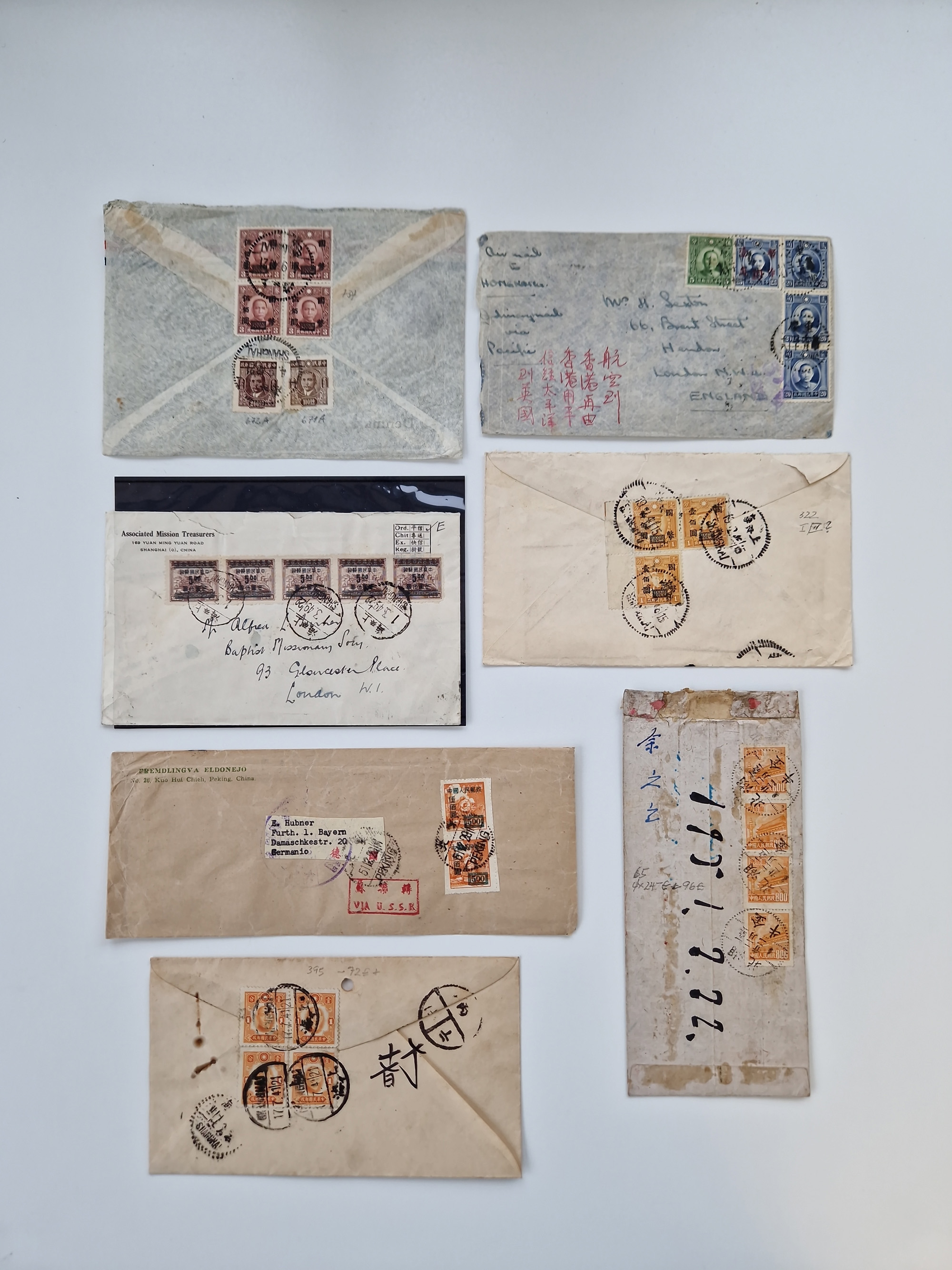 1934/49 (ca.), Chinese Airmail attractive accumulation of over 120 covers with a wealth of interesting usages and postal rates, multiple- and combination frankings, censored airmail, many better with 1937 “HONG KONG - SAN FRANCISCO RECEIVED - FIRST FLIGHT” handstamp on registered cover from “SHANGHAI 26 4 37”, scarce 1948 Martyr of Revolution 50 c. on ½ c. brown bloc of 20 with additional franking used to reverse of envelope to the provincial department of education in Wuchang, inland airmail franked at 63 cents from “PAHSIEN CHUNGKING” to Shanghai, 1947 incoming mail from Tientsin to British Occupation Zone in Germany with censor paper seal and mark, etc., somewhat mixed condition as to be expected. A most useful specialist lot