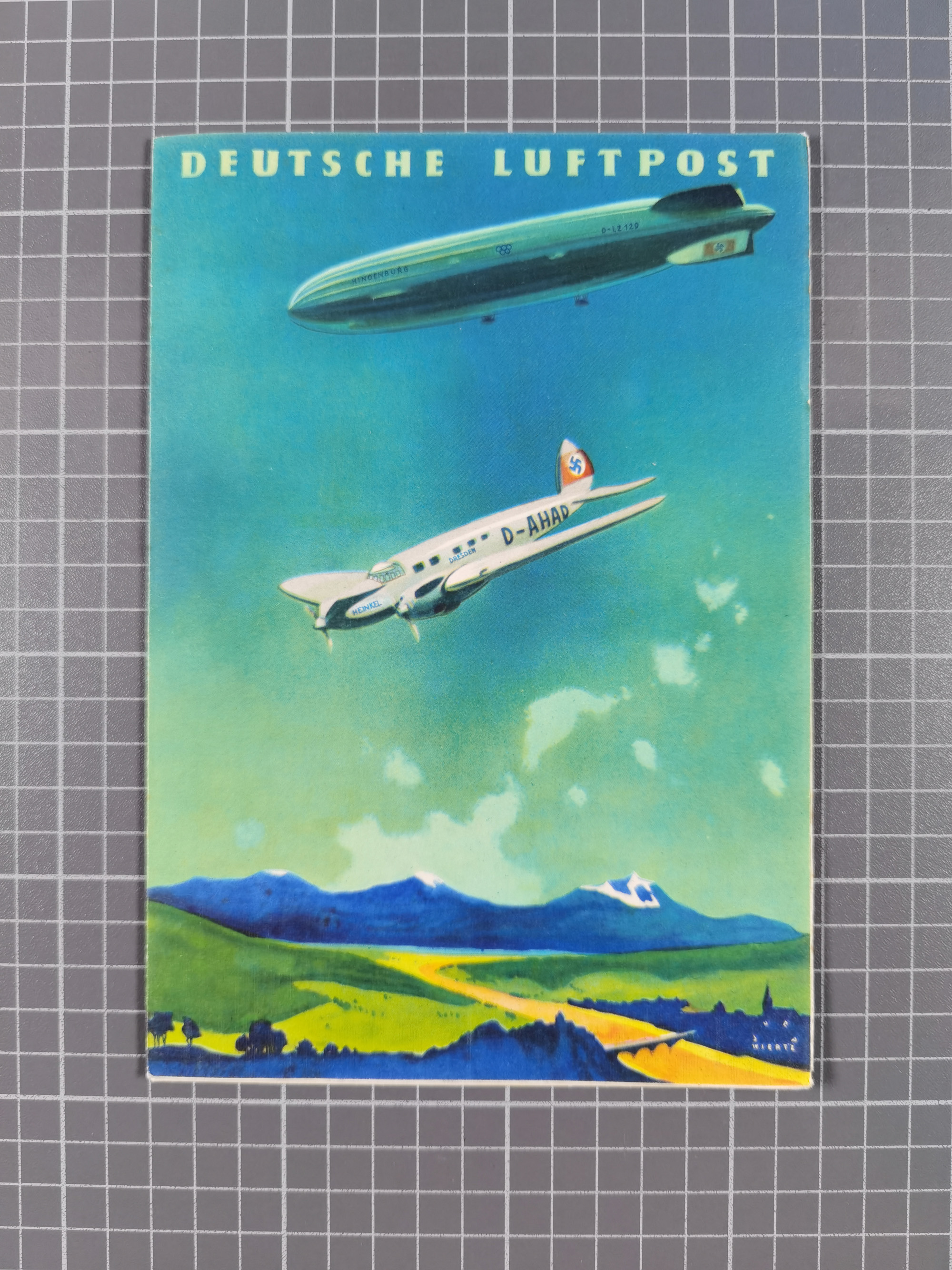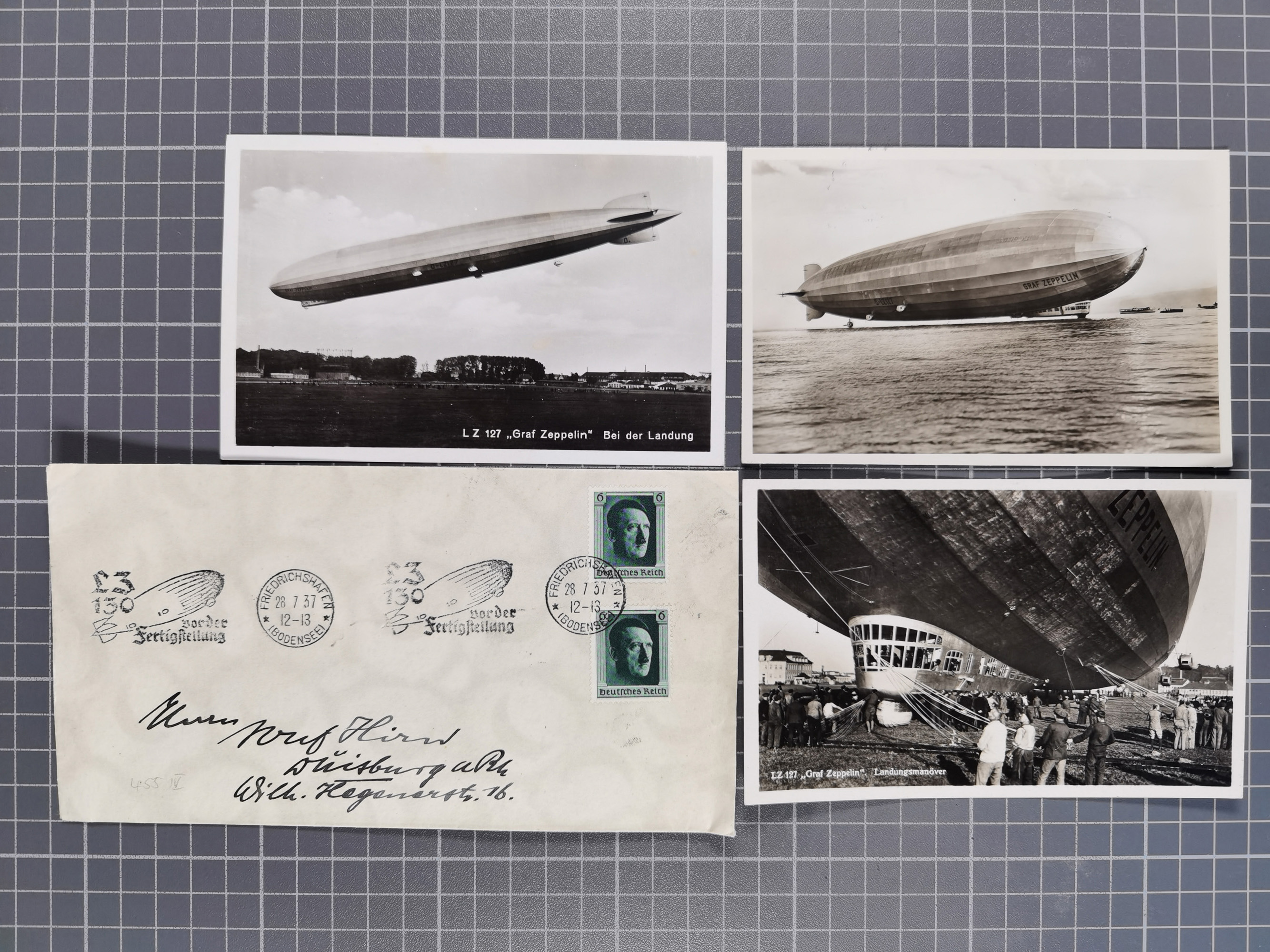 1913/36, Album mit 55 Zeppelinbriefen -Karten, (51 St. DR) dabei viele bessere Belege, u.a. DR großes Telegramm Luftschiff Hindenburg. Zeppelinkarte Viktoria Luise" und Hansa" (Sieger Nr. 4 und 6 II) Zeppelinbrief mit 1 und 2 RM Chicagofahrt!, Zeppelinkarte Nordpolarfahrt Zuleitung Niederlande. 2. SAF 1933, Zuleitung franz. Andorra, Zeppelin-Karte mit 2. SAF 1931 Hin- und Rückfahrt mit brasilianischer und deutscher Frankatur (2 x 1 RM Zeppelin) 10 Zeppelinbriefe/Karten mit 1.2 und 4 RM Zeppelin, meist gute Erhaltung