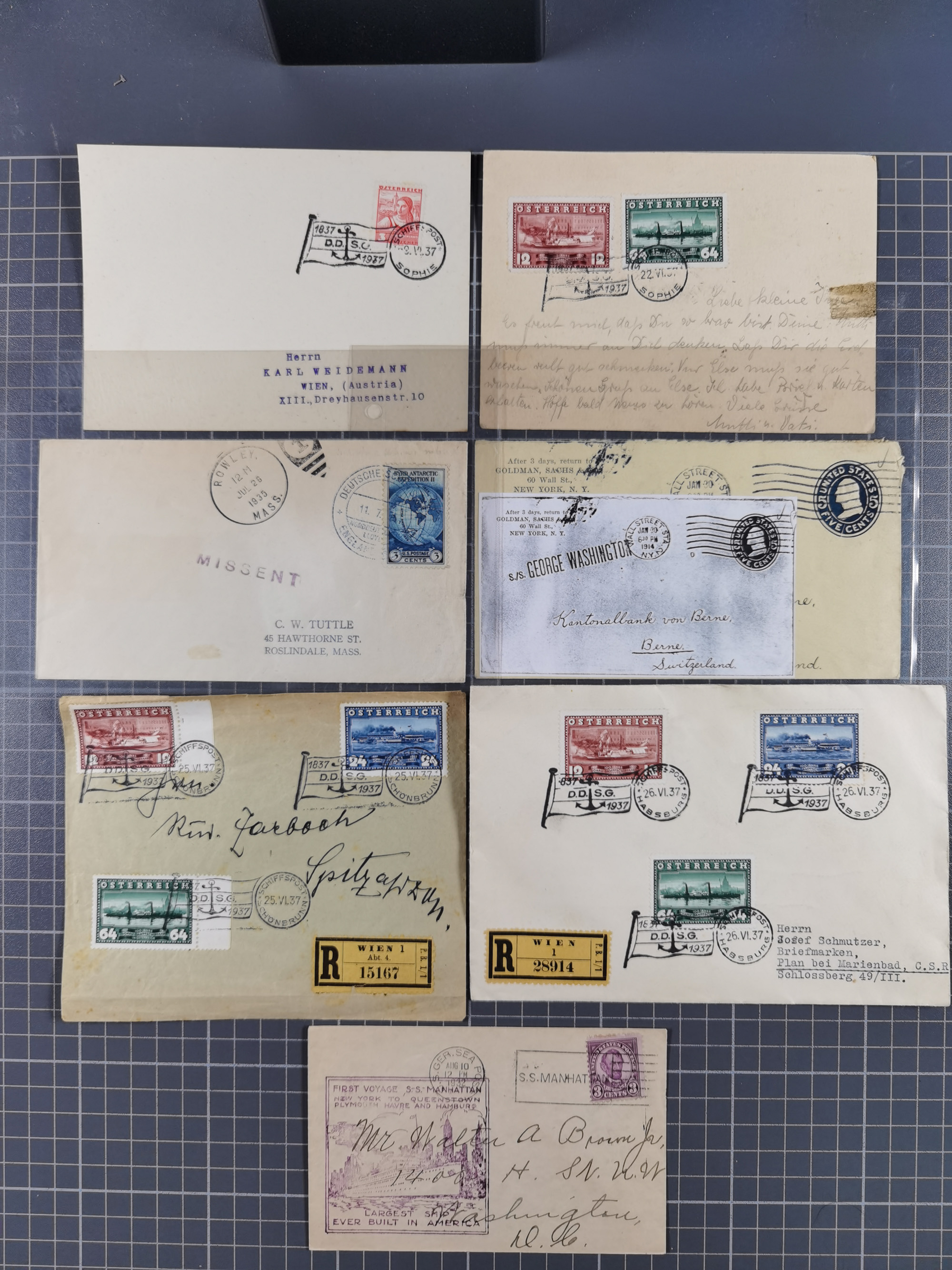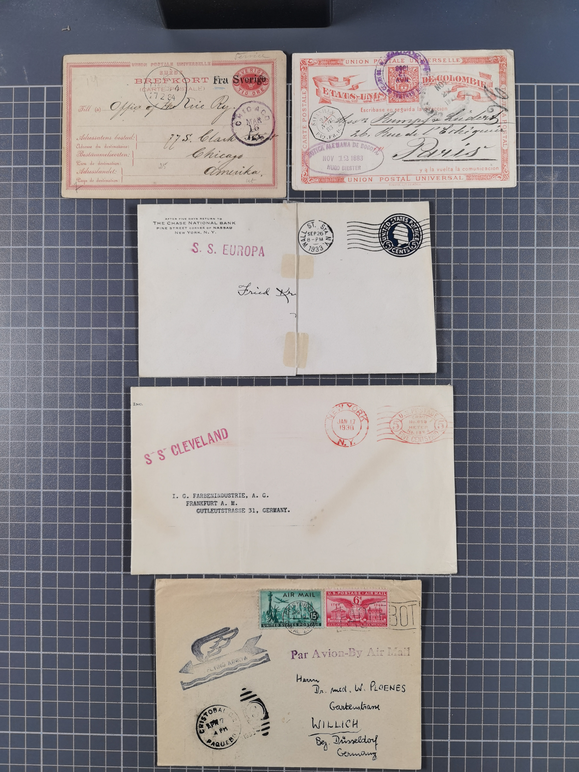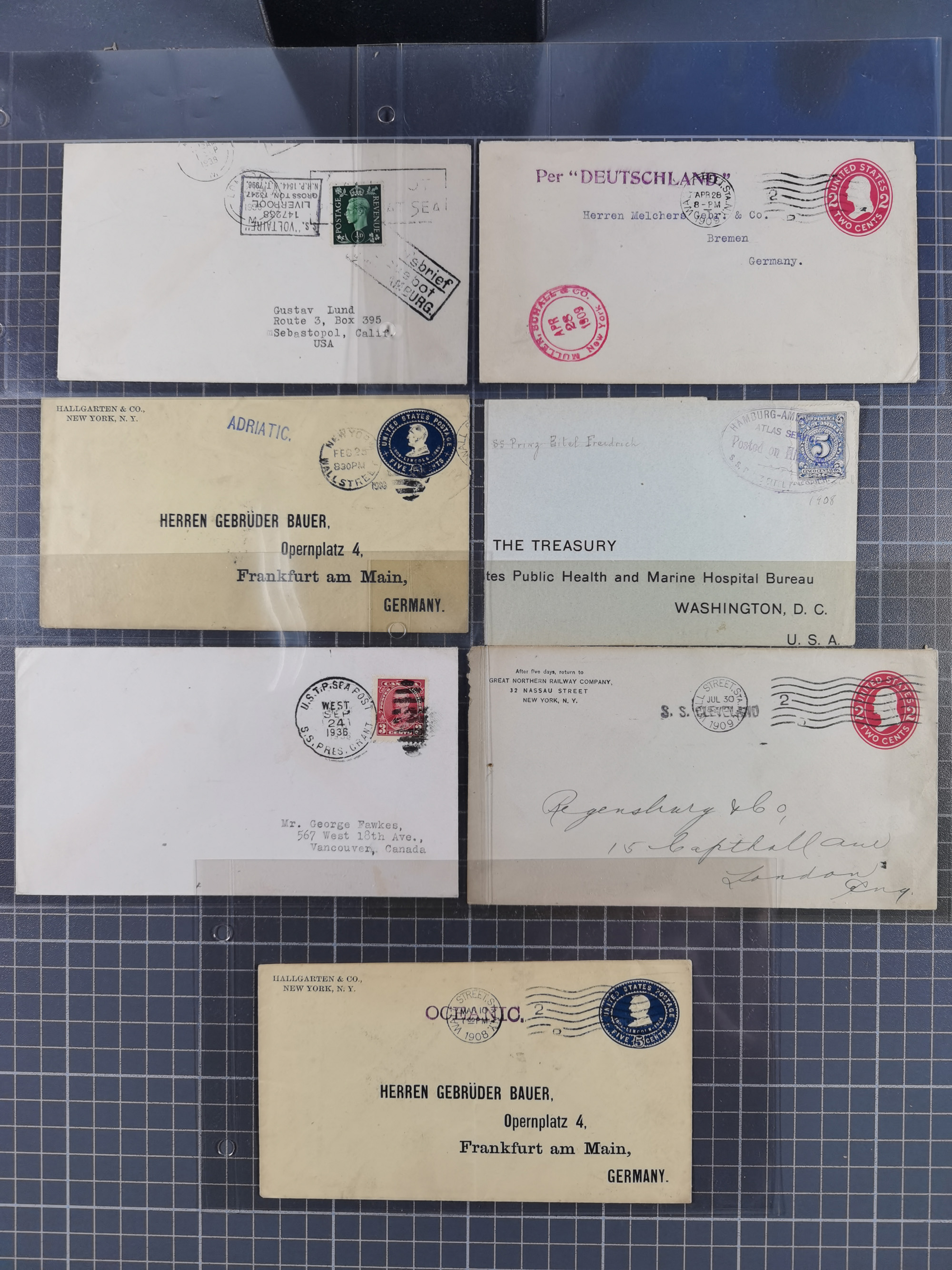 1892/1939, umfangreiche Sammlung “U.S. GERMAN SEA POST” mit ca. 400 Briefen, Karten und Ganzsachen, Schwerpunkt vor 1920 mit den Dublex-Stempeln mit Nr. 1-16, dabei verschiedene Verwendungen mit besseren (u.a. auf Briefen/Karten vom D. Reich), 1 R-GSU und weiteren Besonderheiten. Dazu noch einige Schiffs-Ansichtskarten, bei vielen Belegen mit Vermerken zu den Schiffen usw. und meist in guter Erhaltung. Eine in diesem Umfang seltene Sammlung in sechs Alben, ex Steinmeyer