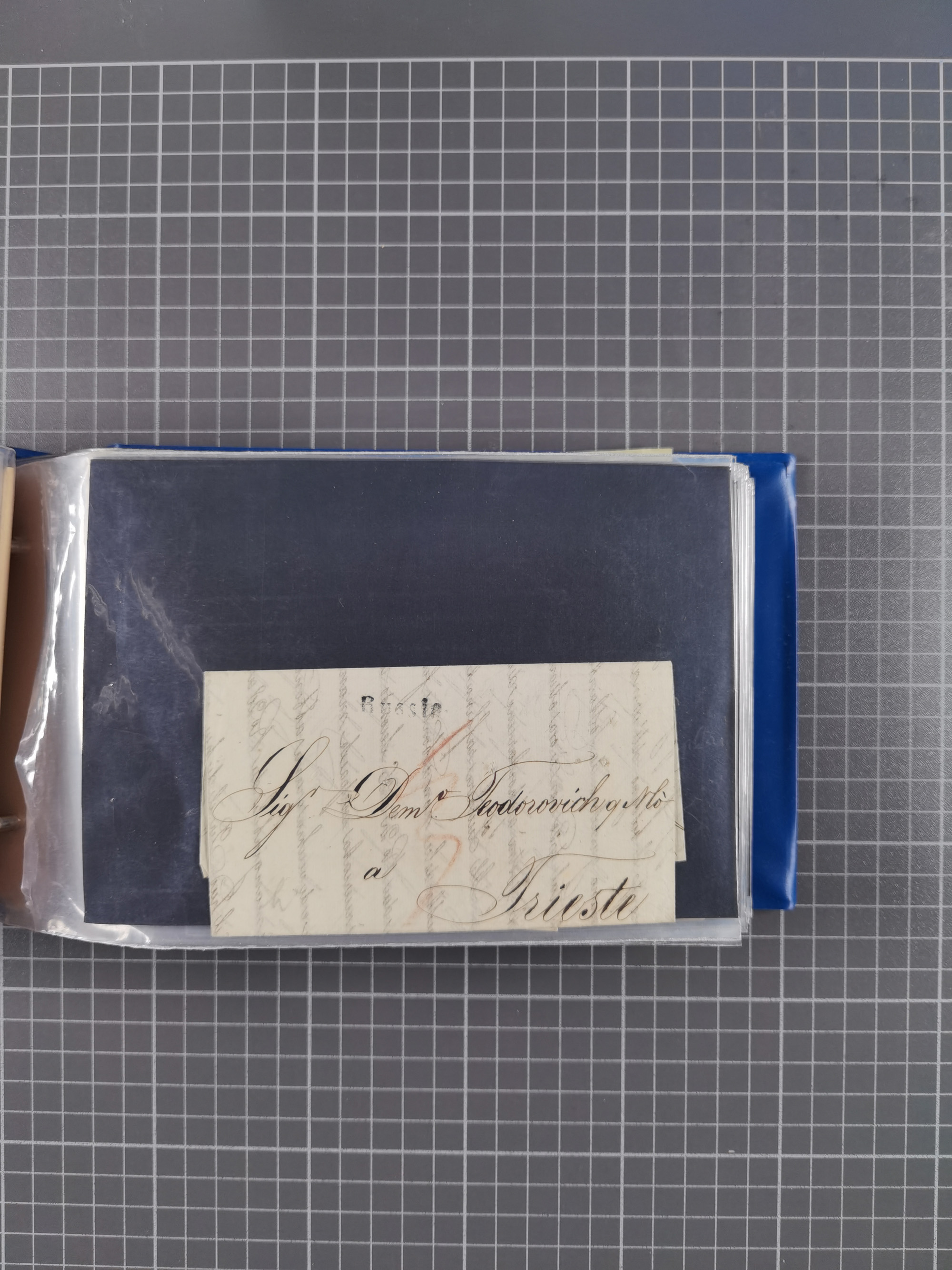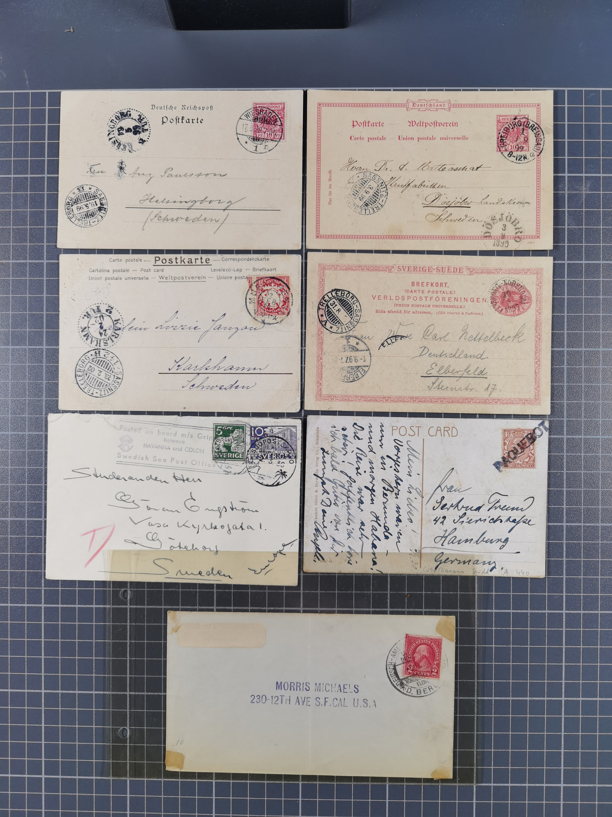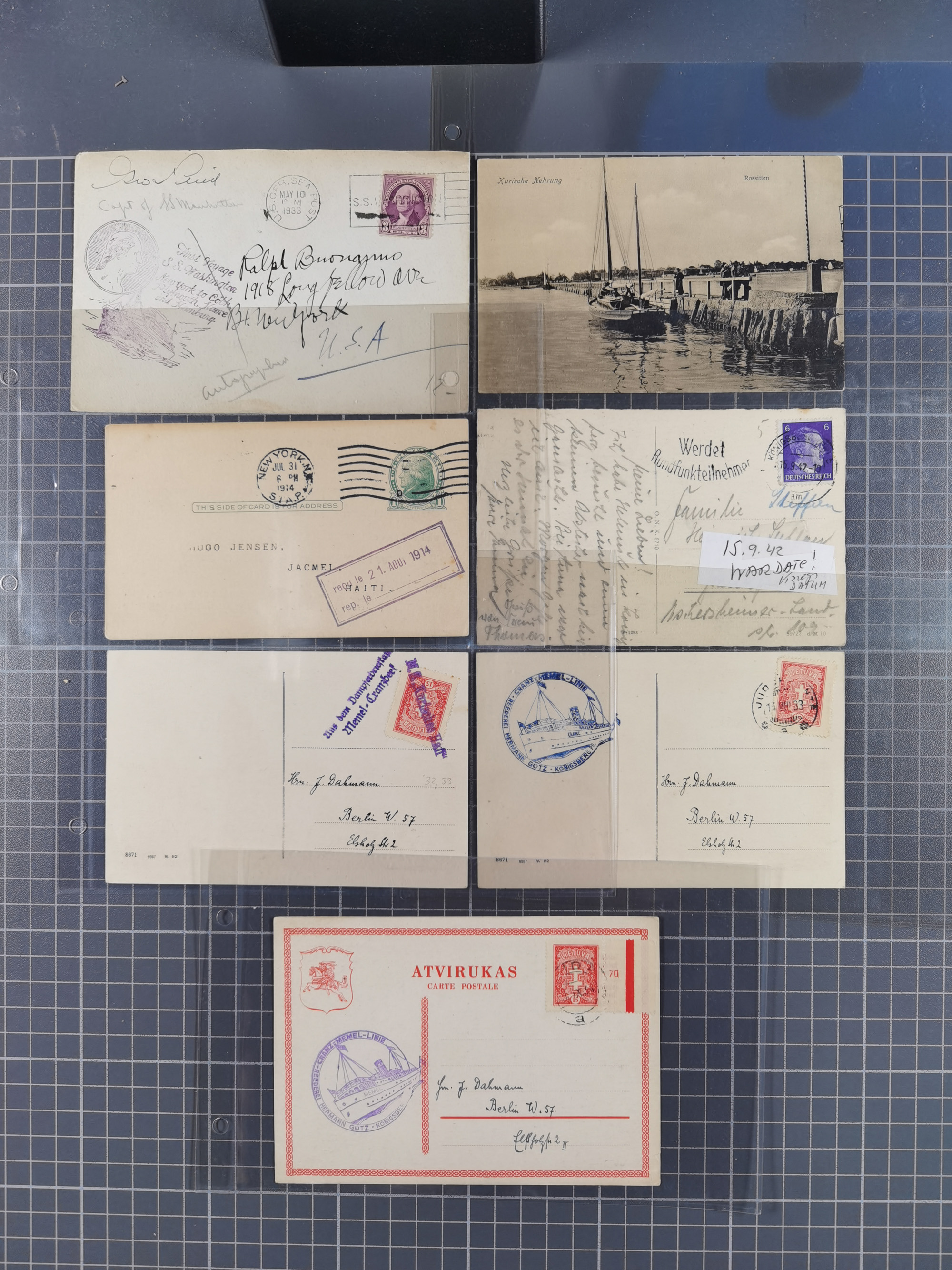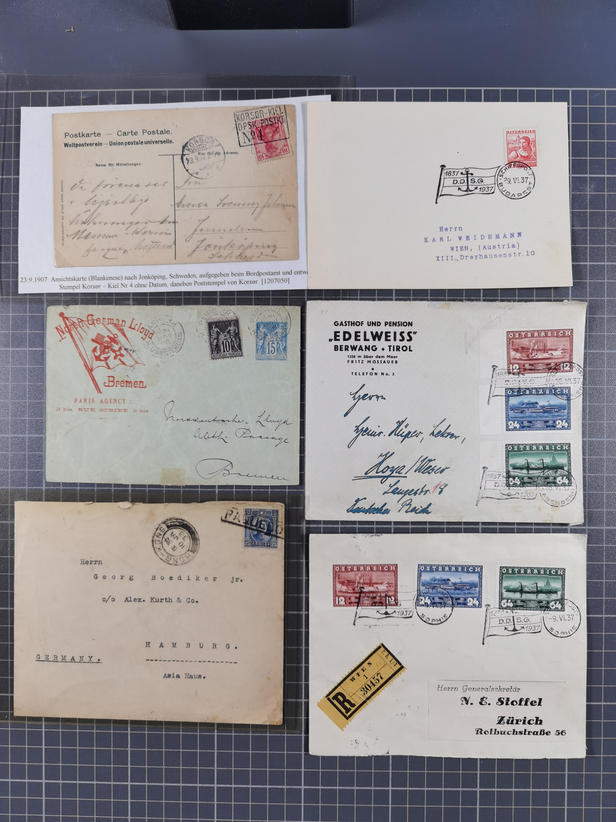 1829/1970 (ca.), interessanter Bestand mit über 100 Briefen, Karten und Ganzsachen inkl. Belege mit handschriftlichen Leitvermerken bzw. Leitstempeln und Transitstempeln. Schwerpunkt vor 1945 mit u.a. komplettem Faltbrief 1829 aus Russland mit L1 “'Russie” nach Triest, frankierte Postkarte Österreich 1905 mit Stempel “CARNIOLIA OE. LLOYD”, dänischer Stempel “KORSOR-KIEÖ…No4” klar auf Postkarte 1907 mit Germania 10 Pfg. sowie viele Pauebot-Stempel. Dazu Frankreich GSU 15 C. mit Zufrankatur und rotem Zudruck mit Flagge “North German Lloyd Bremen…..”, meist in guter Erhaltung, ex Steinmeyer