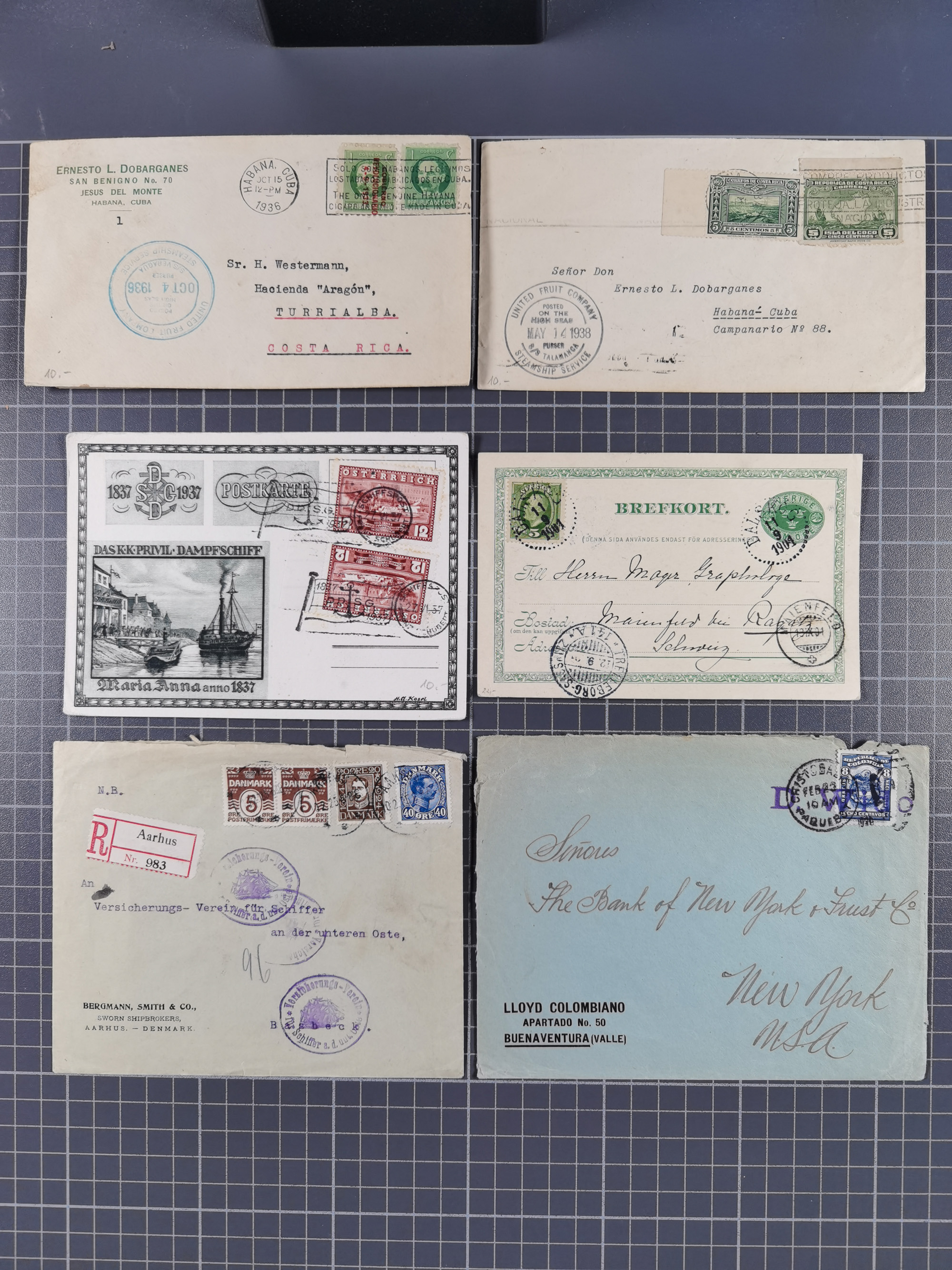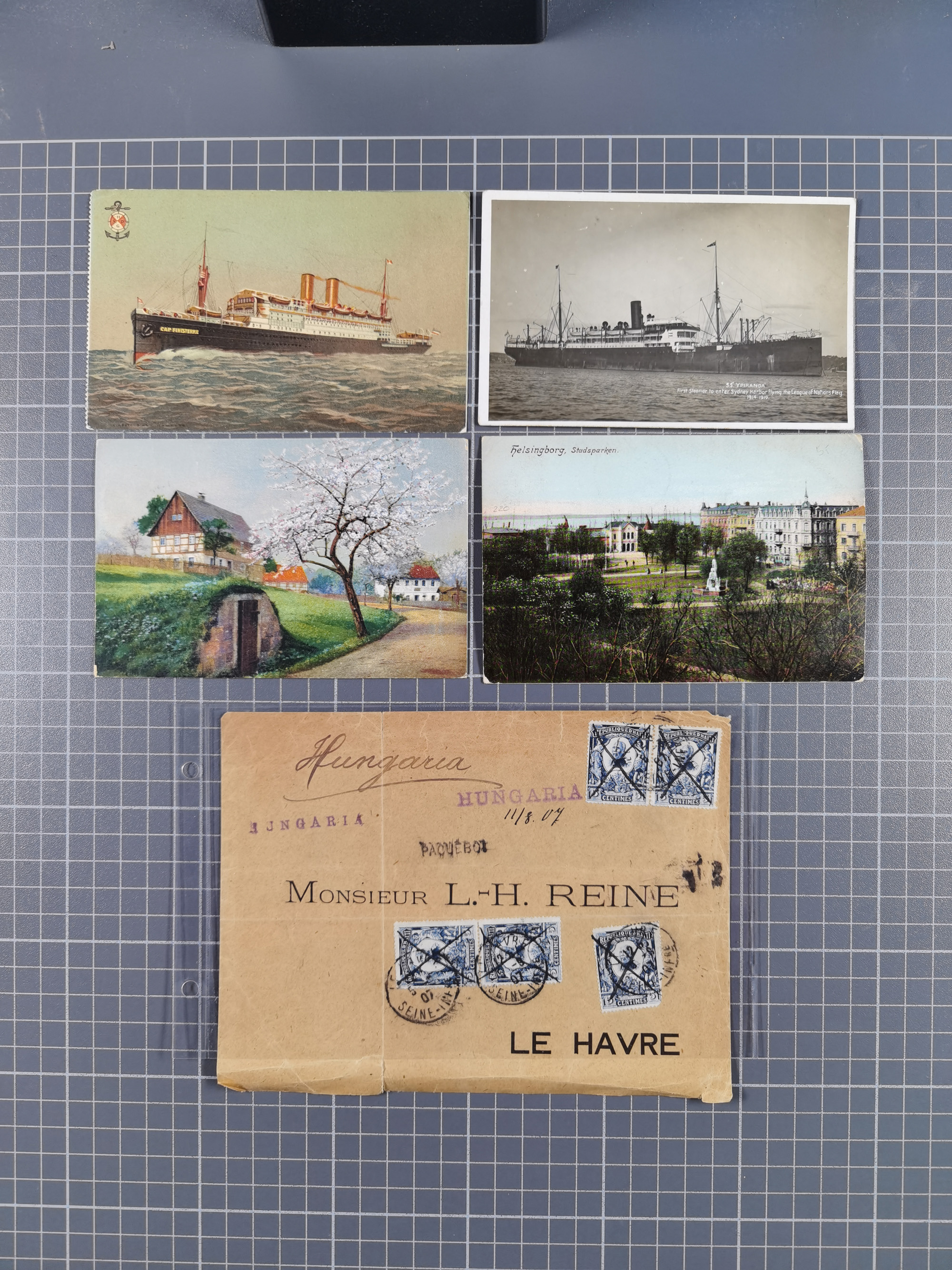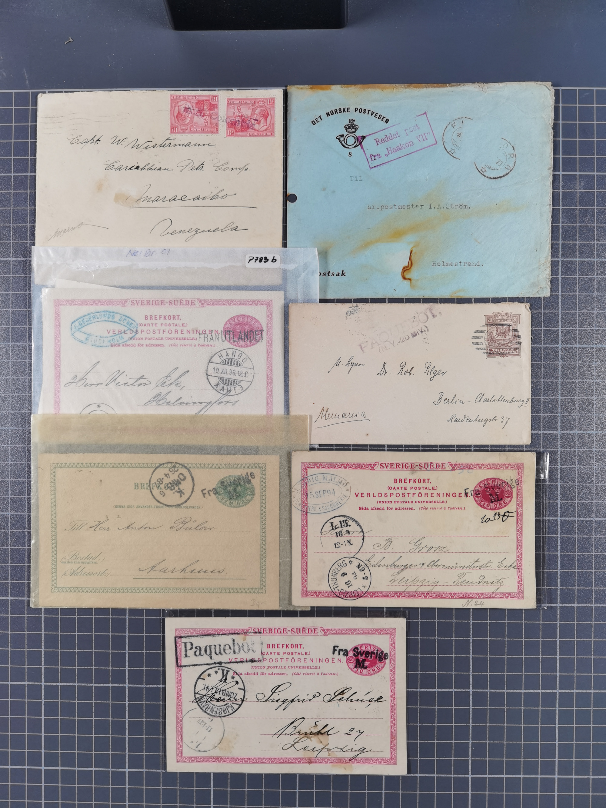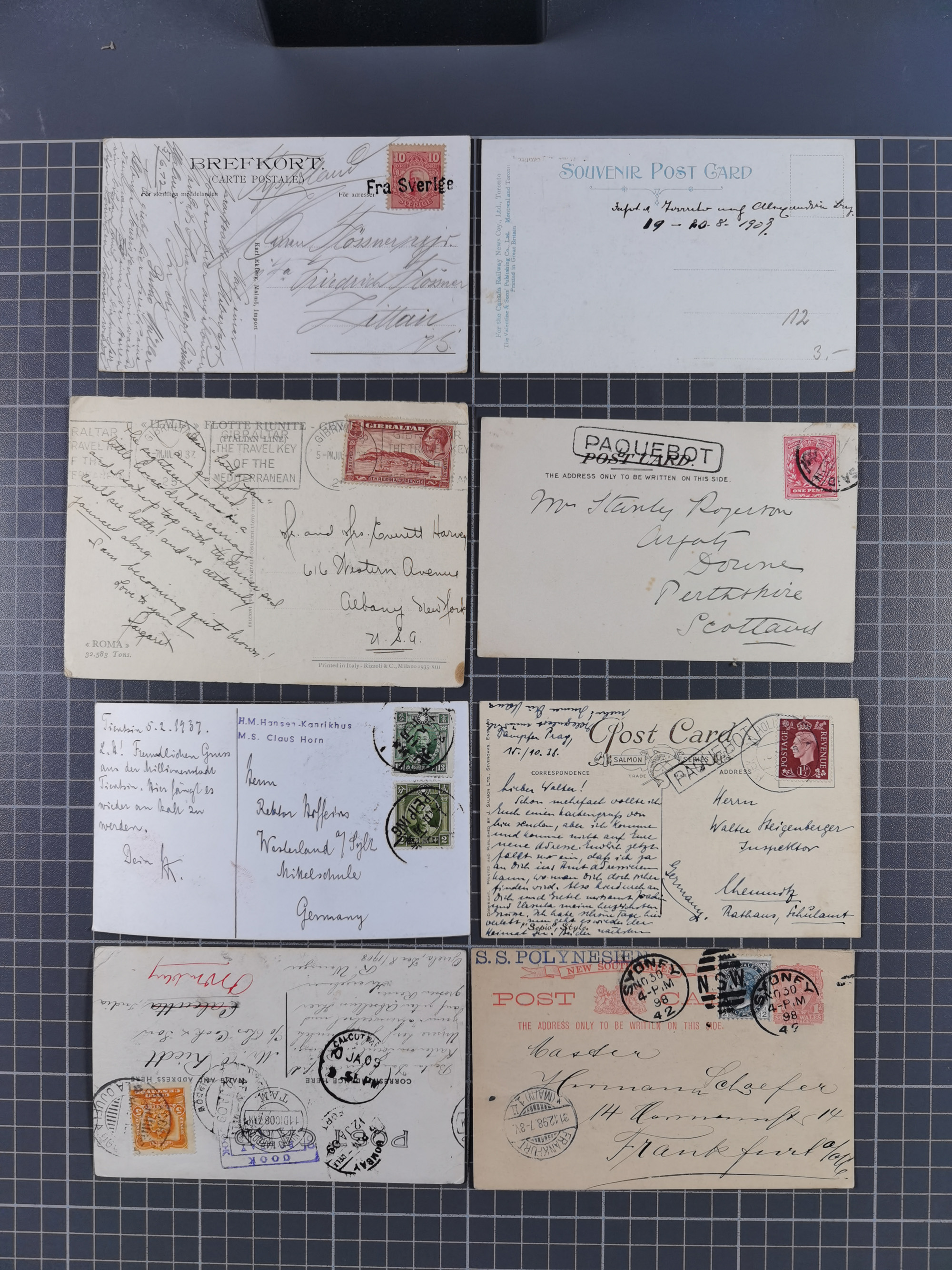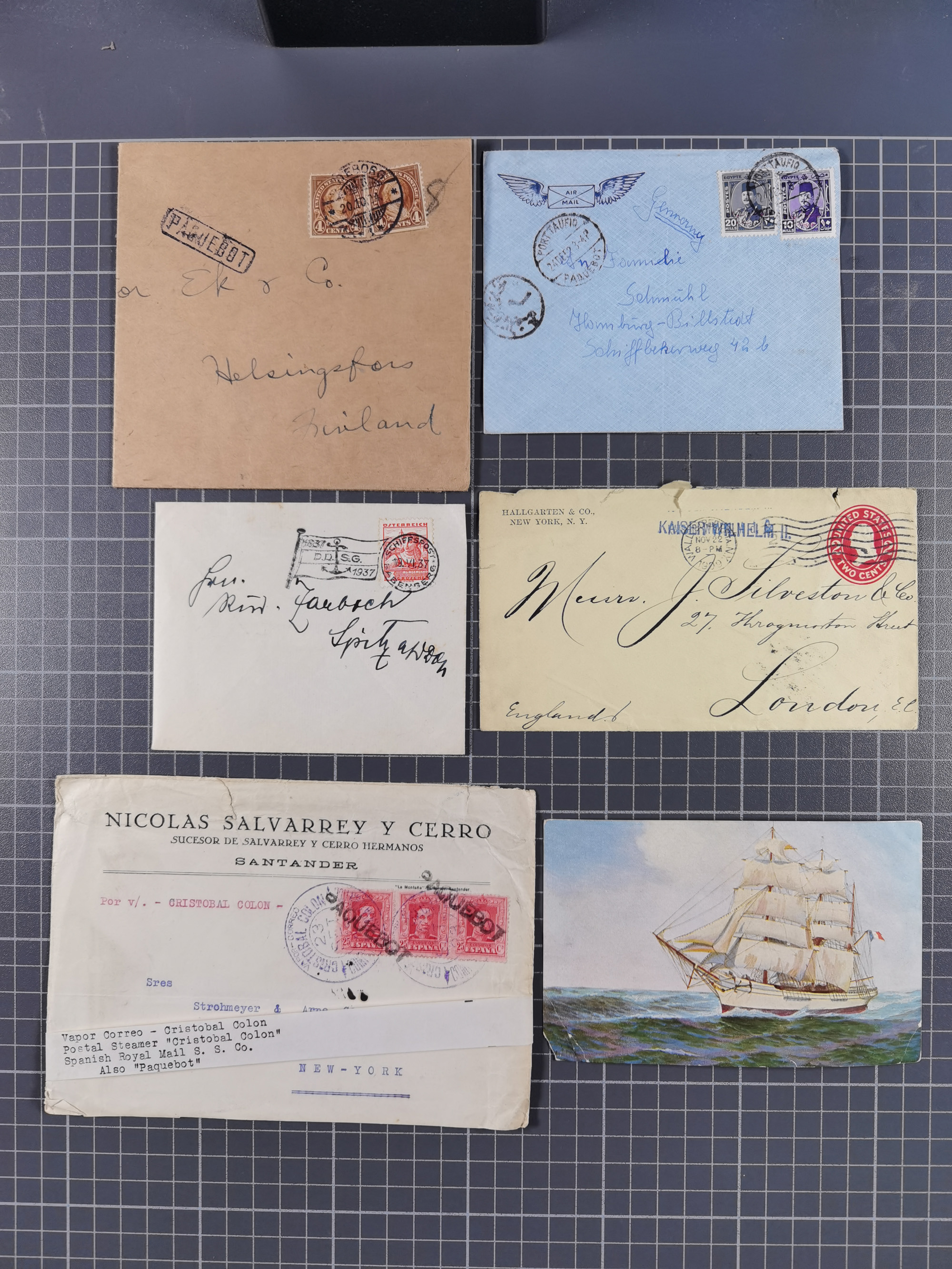 1829/1970 (ca.), interessanter Bestand mit über 100 Briefen, Karten und Ganzsachen inkl. Belege mit handschriftlichen Leitvermerken bzw. Leitstempeln und Transitstempeln. Schwerpunkt vor 1945 mit u.a. komplettem Faltbrief 1829 aus Russland mit L1 “'Russie” nach Triest, frankierte Postkarte Österreich 1905 mit Stempel “CARNIOLIA OE. LLOYD”, dänischer Stempel “KORSOR-KIEÖ…No4” klar auf Postkarte 1907 mit Germania 10 Pfg. sowie viele Pauebot-Stempel. Dazu Frankreich GSU 15 C. mit Zufrankatur und rotem Zudruck mit Flagge “North German Lloyd Bremen…..”, meist in guter Erhaltung, ex Steinmeyer